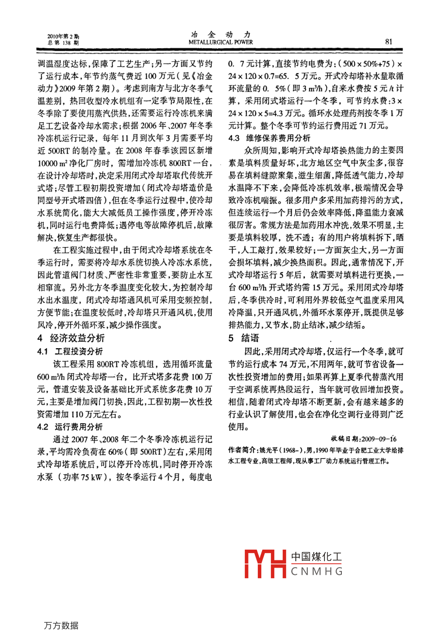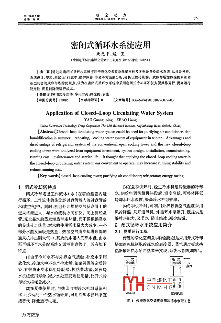 10年第2期冶金動(dòng)力總第138期METALLURGICAL POWER密閉式循環(huán)水系統(tǒng)應(yīng)用姚光平,趙亮國電子科技集團(tuán)公司第十三研究所河北石家莊050051)【摘要】通過對(duì)密閉式循環(huán)水系統(tǒng)應(yīng)用于凈化空調(diào)夏季除濕再熱及冬季設(shè)備冷卻水系統(tǒng)從設(shè)備投資系統(tǒng)設(shè)計(jì)、安裝、調(diào)試、運(yùn)行成本、維護(hù)保養(yǎng)、壽命等方面的分析,分析比較傳統(tǒng)的開式冷卻塔加冷凍機(jī)系統(tǒng)和新型的密閉式冷卻塔的優(yōu)缺點(diǎn),認(rèn)為在密閉式循環(huán)水系統(tǒng)中采用密閉式冷卻塔不僅方便操作運(yùn)行,提高運(yùn)行穩(wěn)定性,而且能降低運(yùn)行成本?!娟P(guān)鍵詞】密閉式冷卻塔;凈化空調(diào);冷凍機(jī);節(jié)能【中圖分類號(hào)】TQ085【文獻(xiàn)標(biāo)識(shí)碼】B【文章編號(hào)】0066764(2010)02-007903Application of Closed-Loop Circulating Water SystemYAO Guang-ping, ZHAO LiangChina electronics Technology Group Corporation The 13th Research Institute, Shijiazhuang Hebei 050051, China)Abstract]Closed-loop circulating water system could be used for purifying air conditioner, dehumidification in summer, reheating, cooling water system of equipment in winter. Advantages anddisadvantage of refrigerator system of the conventional open cooling tower and the new closed-loopcooling tower were analyzed from equipment investment, system design, installation, commissioning,running cost, maintenance and service life. It thought that applying the closed-loop cooling tower inthe closed-loop circulating water system was convenient to operate may increase running stability andreduce running cost.[Key words ]closed-loop cooling tower; purifying air conditioner; refrigerator; energy saving1閉式冷卻塔特點(diǎn)3)在夏季供熱時(shí),經(jīng)過冷水機(jī)組冷凝器的冷卻閉式冷卻塔是工作流體(水)在塔的盤管內(nèi)進(jìn)水,供給空調(diào)機(jī)組再熱段后,溫度降低,可整體降低行循環(huán),工作流體的熱量經(jīng)過盤管散入流過盤管的冷卻水回水溫度,提高冷水機(jī)組效率。水(或空氣)中。同時(shí)機(jī)組外四周的空氣從盤管上的(4)冬季供冷時(shí),可利用外界較低空氣溫度采用進(jìn)風(fēng)格柵進(jìn)入,與水的流動(dòng)方向相反,向上流經(jīng)盤風(fēng)冷降溫,只開通風(fēng)機(jī),外循環(huán)水泵停開,既提供足管。完全靠水的蒸發(fā)潛熱帶走熱量,而不像板換靠水夠排熱能力又節(jié)水,防止結(jié)冰減少結(jié)垢。的顯熱帶走熱量,對(duì)水的使用需求量大大減少。一小2閉式循環(huán)水系統(tǒng)應(yīng)用簡介部分水蒸發(fā)而吸走熱量,熱濕空氣由冷卻塔頂部的21夏季運(yùn)行工況通風(fēng)機(jī)排出到大氣中,其余的水落入底部水盤,由水傳統(tǒng)的凈化空調(diào)夏季降溫除濕是采用開式冷卻泵再循環(huán)至水分配系統(tǒng)又回淋到盤管上。其有如下塔加冷凍機(jī)制取冷凍水給表冷器、蒸汽通過板式換特點(diǎn)熱器輸出熱水給再熱器來實(shí)現(xiàn),系統(tǒng)示意圖如圖1。(1)由于冷卻水不與外界空氣接觸,補(bǔ)充水采用軟化水,冷卻水中不會(huì)產(chǎn)生水垢細(xì)菌污泥等雜質(zhì)污蒸汽染,有效防止冷水機(jī)組冷凝器、換熱器堵塞,延長冷水機(jī)組使用壽命,減少水處理藥劑使用量,比開式冷卻塔水損耗量減少。中國煤化工表(2)在夏季使用時(shí),與熱回收型冷水機(jī)組系統(tǒng)相CNMHG器比,可少運(yùn)行一臺(tái)熱水循環(huán)泵,可用冷卻水循環(huán)泵直空調(diào)機(jī)組接替代,降低運(yùn)行電耗。圖1傳統(tǒng)凈化空調(diào)夏季用冷凍水制取工藝冶金動(dòng)力2010年第2METALLURGICAL POWER總第138空調(diào)機(jī)組再熱段換熱面積按冬季工況設(shè)計(jì)制對(duì)生產(chǎn)及時(shí)恢復(fù)影響很大。因此,很多用戶在冬季造,設(shè)計(jì)熱水供回水溫度8060℃;夏季再熱負(fù)荷比都采用停開冷凍機(jī),由開式冷卻塔冷卻水直接給設(shè)冬季低60%左右,在應(yīng)用于夏季除濕再熱時(shí),無需備冷卻水換熱器,也能滿足工藝?yán)鋮s水對(duì)水溫要按設(shè)計(jì)熱水溫度供應(yīng),而僅用35℃熱水就能滿足求。但這同樣會(huì)帶來一些問題:冬季空氣干燥,灰塵凈化空調(diào)溫濕度要求。在我國南方如長三角地區(qū),大,盡管氣溫低,細(xì)菌不易繁殖,但生物粘泥在開式是半導(dǎo)體集成電路生產(chǎn)密集區(qū)域,因冬季氣溫不是冷卻塔中沉積,帶入冷卻水管路系統(tǒng)中,減小管道太低,在空調(diào)系統(tǒng)設(shè)計(jì)中大多釆用熱回收型冷水機(jī)流通面積,增加管道阻力,降低板式換熱器熱交換組加輔助電加熱器的方式來保證溫濕度。在夏季,能力。如果僅用于工藝設(shè)備冷卻水熱交換系統(tǒng),影通過熱回收冷水機(jī)組輸出熱水(35℃)來達(dá)到降溫響不是太明顯,可通過對(duì)板式換熱器定期拆卸清洗除濕的要求;在冬季,熱回收冷水機(jī)組熱水溫度不來保證換熱能力。但如果用于空調(diào)機(jī)組表冷器,由能滿足使用要求時(shí),再通過輔助電加熱器來提升熱于表冷器銅管管徑細(xì),彎頭多,泥垢很難被清理,如水溫度北方某半導(dǎo)體公司動(dòng)力部門曾于1996年冬季,用鑒于此,華北某地高科技產(chǎn)業(yè)園在2007年新開式冷卻塔直接給空調(diào)表冷器供冷卻水,經(jīng)過一個(gè)增廠房時(shí),改變以往蒸汽換熱供應(yīng)熱