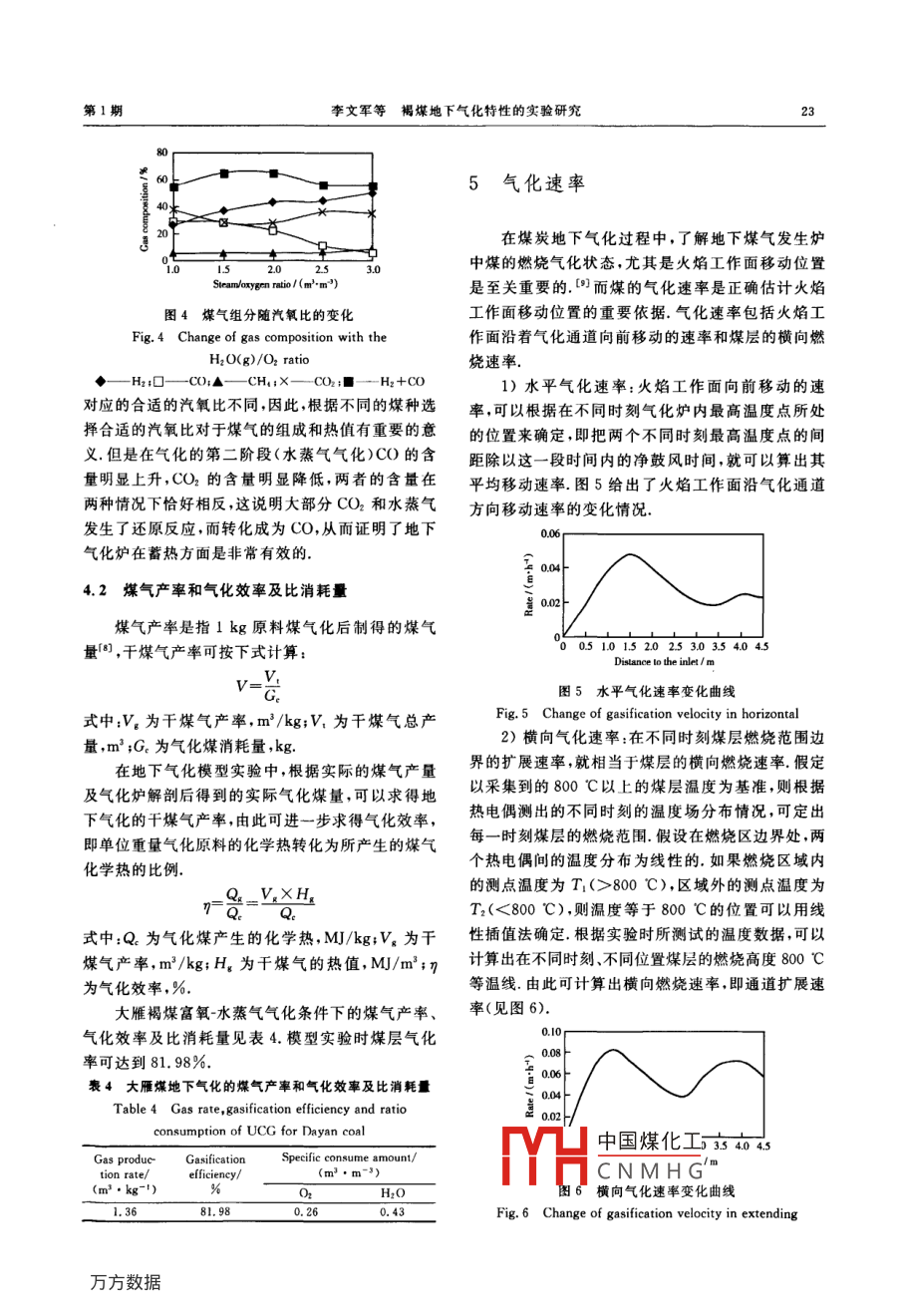 第32卷第1期煤炭轉(zhuǎn)化Vol 32 No. 12009年1月COAL CONVERSIONJan.2009褐煤地下氣化特性的實(shí)驗(yàn)研究李文軍1劉麗麗2)梁新星3)梁杰王偉”摘分別以富氧和富氧水蒸氣為氣化介質(zhì),進(jìn)行了大雁褐煤的地下氣化模型實(shí)驗(yàn).研究了鼓風(fēng)量和汽氧比對煤氣組成、氣化穩(wěn)定性以及煤層氣化速率的影響,并進(jìn)行了富氧-水蒸氣地下氣化過程的物料衡算.實(shí)驗(yàn)結(jié)果表明,通過采取合適的氣化參數(shù),大雁褐煤的地下氣化過程可以穩(wěn)定進(jìn)行關(guān)鍵詞褐煤,地下氣化,汽氧比,氣化速率中圖分類號TD841模型實(shí)驗(yàn),揭示了褐煤地下氣化的基本特征和溫度引言場發(fā)展規(guī)律,獲得了大雁褐煤地下氣化工藝參數(shù)褐煤地下氣化具有較高的可控性和穩(wěn)定性,是最適宜我國褐煤資源儲量豐富僅內(nèi)蒙古東部的褐煤地下氣化開釆的煤種儲量就達(dá)100多億t但由于褐煤灰分和水分高、1大雁褐煤煤質(zhì)特征和理想氣化參數(shù)發(fā)熱量低、易風(fēng)化和自燃、難于洗選和儲存以及同時伴生著軟巖頂板等特點(diǎn),褐煤的開采和利用受到了的計算很大的限制.煤炭地下氣化是從根本上解決傳統(tǒng)煤炭開采和使用方式存在的一系列技術(shù)、安全和環(huán)塘1.1大雁褐煤煤質(zhì)特征問題的重要途徑.將褐煤直接在地下氣化成可以將大雁送來的煤樣送國家煤炭質(zhì)量檢驗(yàn)中心進(jìn)綜合利用的煤氣,煤氣用于民用、發(fā)電、提取純氫或行全面分析化驗(yàn),化驗(yàn)項(xiàng)目有:工業(yè)分析、元素分析、作為合成甲醇、二甲醚、柴油、汽油等原料氣,將會開全水分、發(fā)熱量、全硫及硫形態(tài)分布、灰熔融性、灰成創(chuàng)一個褐煤利用的新前景.前蘇聯(lián)、美國對褐煤地下分分析、結(jié)渣性、CO2反應(yīng)性、黏結(jié)性、抗碎強(qiáng)度和氣化進(jìn)行了大量的實(shí)驗(yàn)研究2我國對褐煤地下氣熱穩(wěn)定性等表1和表2為實(shí)驗(yàn)煤樣煤質(zhì)工業(yè)分析、化研究較少,為此對內(nèi)蒙古大雁褐煤地下氣化進(jìn)行元素分析和灰成分結(jié)果表1大雁褐煤的元素分析和工業(yè)分析Table 1 Proximate and ultimate analysis of dayan ligniteoximage analysis/%Ultimate analysis/%CRC/1-8OdsM27.019.514.27Percent of weight.表2大雁煤灰成分(%)低;焦渣特征指數(shù)顯示煤樣受熱時無黏結(jié)和膨脹,實(shí)Table 2 Residue compositions of Dayan lignite(%.)驗(yàn)結(jié)果也證明了這一點(diǎn);含硫中等,硫形態(tài)主要是有SiOz Al2 O FezOa Cao MgO TiOz SO, K,0機(jī)硫;灰組成中對煤的氣化反應(yīng)有催化作用的68.3716.431.851.790.401.662.253.89K2O,Na2O,CaO含量較高,灰熔融性溫度中等,因Percent of weigh灰分高,故煤樣具有較強(qiáng)的結(jié)渣性;CO2反應(yīng)活性大雁煤基本煤質(zhì)特征是:全水分含量較髙,內(nèi)在較髙.抗碎強(qiáng)度和熱穩(wěn)定性化驗(yàn)結(jié)果均高于褐煤的水分含量中等,揮發(fā)分高,灰分高,燃點(diǎn)低,發(fā)熱量較甲要低于褐煤的中國煤化工·國家自然科學(xué)基金資助項(xiàng)目(50574096)CNMHG1)博士生;2)碩士生,中國礦業(yè)大學(xué),10008北京;3)工程師新奧氣化采煤兩北酈功14汊博士生導(dǎo)師,新汶礦業(yè)集團(tuán)有限賁任公司,271233山東泰安;5)工程師,中石化勝利油田東辛采油廠,257049山東東營收橋日期:2008-09-23;修回日期:2008-10-28第1期李文軍等褐煤地下氣化特性的實(shí)驗(yàn)研究21般指標(biāo)范圍.從分析結(jié)果可知,大雁煤屬高煤化程度氣化爐體:模型氣化爐內(nèi)膛尺寸長4.45m,寬褐煤,是較好的地下氣化用煤17m,高1.57m.外設(shè)耐層、保溫層、鋼板密封層1.2理想氣化參數(shù)計算和鋼筋混凝土承壓層爐體上設(shè)4個進(jìn)(出)氣孔、19氣化過程的物料衡算主要用來預(yù)測出口煤氣個溫度測量孔、4個燃空區(qū)燃燒狀態(tài)觀測孔和6個的組分及熱值從理論上講,應(yīng)對參加反應(yīng)的每個元壓力測點(diǎn)它具有三方面功能:1)可以模擬不同煤素進(jìn)行平衡,而這樣會使計算非常復(fù)雜因此本計質(zhì)、煤層傾角、煤層厚度和煤層深度的地下氣化過算主要對幾個重要的元素進(jìn)行平衡,采用半理論計程:2)可以進(jìn)行不同氣化工藝如正反向鼓風(fēng)輔助算法計算以實(shí)驗(yàn)氣化用煤量及煤質(zhì)分析指標(biāo)為依孔供風(fēng)、壓抽相結(jié)合等氣化工藝的實(shí)驗(yàn);3)可進(jìn)行不同氣化爐結(jié)構(gòu)參數(shù)的實(shí)驗(yàn)?zāi)M煤層和氣化爐結(jié)構(gòu)據(jù),具體步驟如下:1)綜合計算法求得氣化煤量中干餾煤氣的數(shù)量示意圖見圖1,氣化盤區(qū)(煤層)尺寸為4m×1.1mx0.5m,傾角17°,共裝煤2448.76kg2)氣化過程物料平衡方程:碳平衡方程n(CO)+n(CO2)=n(C睡麟氫平衡方程n(H2)+n(H2O)=n(W)●氧平衡方程2n(CO2)+n(CO)=2n(O2)+n(H2)平衡常數(shù)方程K,=2(C0(10式中:n(CO),n(CO2),n(H2),n(H2O)分別為氣化煤氣中一氧化碳、二氧化碳、氫氣和水蒸氣的量,圖1模擬煤層和氣化爐結(jié)構(gòu)Fig. I Simulated coal seam and gasification structurekmol;n(W)為進(jìn)入氣化區(qū)的水蒸氣量,kmol;n(O2)Inlet hole: 2, 3- Assistant hole: 4-Outlet hole為進(jìn)入氣化區(qū)的氧氣量,kmol;n(C)為氣化區(qū)的碳5— Gaging temperature;6— Gasification量,kmol;K,為經(jīng)驗(yàn)常數(shù),對已有煤炭地下氣化組分?jǐn)?shù)據(jù)進(jìn)行統(tǒng)計表明K。為2.