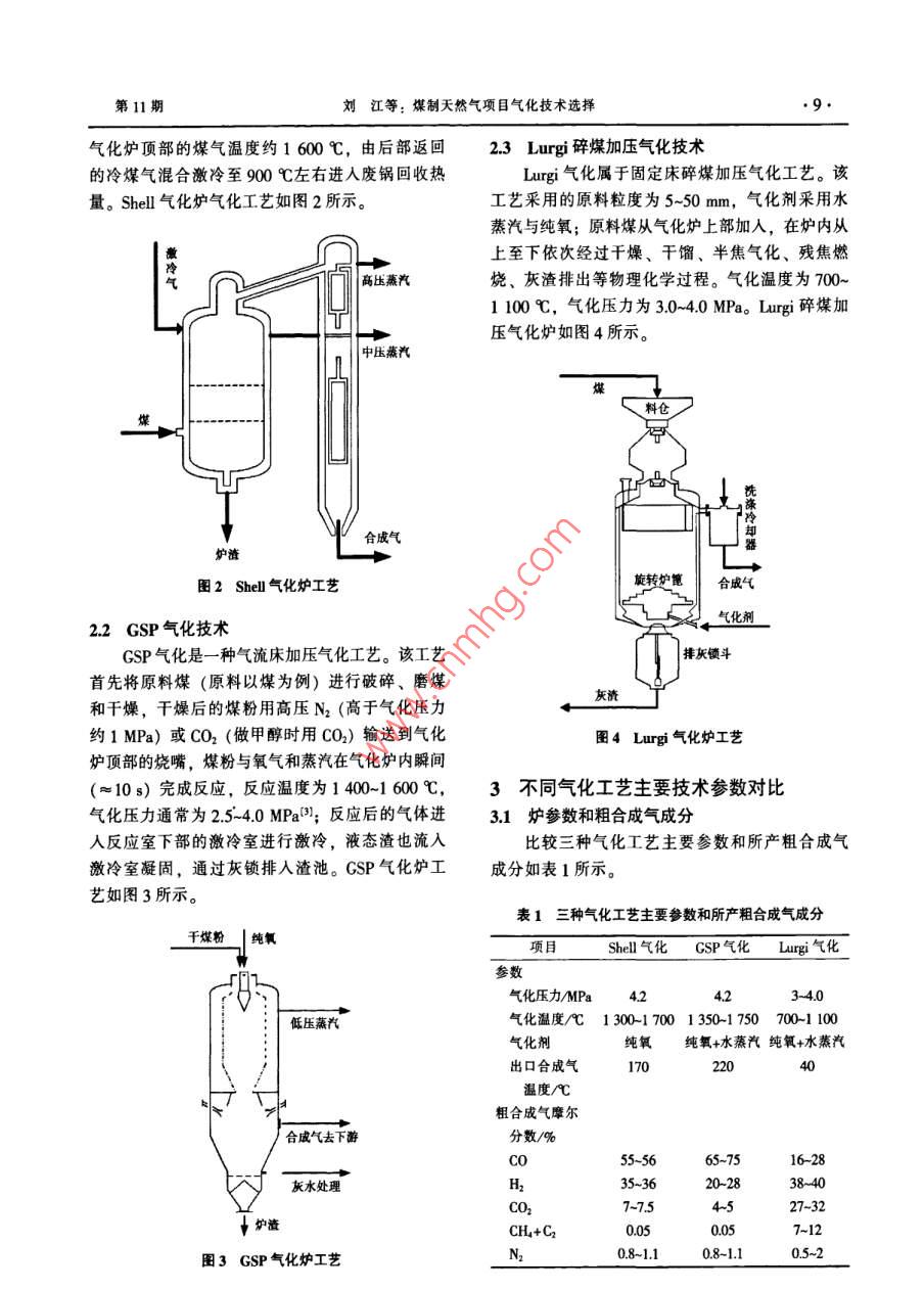 化學(xué)工業(yè)第28卷第11期●8.CHEMICAL INDUSTRY2010年11月煤制天然氣項目氣化技術(shù)選擇劉江,宿鳳明,凌鋒(中國電能成套設(shè)備有限公司,北京10011)摘要: 分析了Shell氣化工藝,GSP氣化工藝與Lurgi氣化工藝在煤制天然氣項目參數(shù)、粗合成氣成分、主要副產(chǎn)品產(chǎn)量、環(huán)保指標(biāo)以及經(jīng)濟性,為煤制天然氣項目中氣化技術(shù)的選擇提供參考和依據(jù)。關(guān)鍵詞:煤氣化廠;煤氣化;技術(shù)經(jīng)濟對比文章編號: 1673- 9647 (2010) 1-0008-04中圖分類號: TQ54文獻標(biāo)識碼: A隨著可持續(xù)發(fā)展戰(zhàn)略和加強環(huán)保等政策的實成分、主要副產(chǎn)品產(chǎn)量、環(huán)保指標(biāo)以及經(jīng)濟性的施,國內(nèi)對天然氣的需求與日俱增。國務(wù)院發(fā)展差異,為煤制天然氣項目中氣化技術(shù)的選擇提供研究中心市場經(jīng)濟研究所研究報告預(yù)計,2015年參考和依據(jù)。我國天然氣消費量將增長至1500億m', 2020年1煤制天然氣工藝簡介增長至3 000億m'。而與此同時,我國天然氣產(chǎn)煤制天然氣流程見圖1。如圖1所示,煤制天量將分別為1 400億m2、1 500億m23左右,因此然氣包括以下幾大部分:空分、煤氣化,凈化(CO我國未來天然氣的供需將出現(xiàn)很大的缺口1。由于變換,酸性氣體脫除、冷凍)、甲烷化(含甲烷化、我國巨大的天然氣消費市場及強勁的增長趨勢,壓縮、干燥)及硫回收等裝置2。氣化爐是源頭設(shè)許多大型能源企業(yè)相繼開展煤制天然氣項目。煤備,一般采用煤加壓氣化技術(shù)生產(chǎn)粗合成氣。由于氣化工藝為煤制天然氣項目的源頭,是需要重點粗合成氣中的CO和H2成分比例不適合直接用考慮的環(huán)節(jié)。針對項目實際情況,正確選擇煤氣于天然氣合成,為滿足甲烷化的需要,需通過部化技術(shù),對于整個項目的成敗至關(guān)重要。本文分析分CO變換,調(diào)整合成氣中H/C比。在變換工藝了Shell 氣化工藝、GSP氣化工藝與Lurgi氣化工后,脫除酸性氣體中H$S及CO2等,然后再通過藝在煤制天然氣工藝中的重要性能參數(shù)及對系統(tǒng)甲烷化及干燥,生產(chǎn)合成天然氣產(chǎn)品,合格產(chǎn)品的影響,對比分析了這三種氣化技術(shù)的粗合成氣送管網(wǎng)?!?空分裝置謀然|粗煤氣l變換適宜的脫硫脫碳.潔凈的甲烷化天熱干燥煤一化|C0/H2比H2S合成氣網(wǎng)碗回收+硫或硫酸圖1煤制天然氣流程2氣化技術(shù)加熱到- -定溫度后,與中壓蒸汽混合,經(jīng)工藝噴2.1 Shell 氣化技術(shù)嘴送人爐內(nèi)。煤粉與氧氣在4.0 MPa表壓下,發(fā)Shell氣化(廢鍋流程)是一種氣流床加壓氣生部分氧化反應(yīng),轉(zhuǎn)化為高有效氣體含量的粗合化工藝。氣化用的原料煤(粒度≤30 mm)由原成氣,夾帶著飛灰,自下而上從氣化爐頂排出。煤貯運系統(tǒng)的皮帶式輸送機送人碎煤倉中,經(jīng)過收稿日期: 2010-10-08破碎、磨煤及干燥過程后,由N2或CO2輸送進入作者簡介:劉江(1962-), 男,北京人,副總經(jīng)理,從事專業(yè)氣化爐噴嘴;而來自空分的氧氣,經(jīng)氧氣預(yù)熱器熱能動力工程工作。第11期劉江等:煤制天然氣項目氣化技術(shù)選擇●9●氣化爐頂部的煤氣溫度約1600 C,由后部返回2.3 Lurgi 碎煤加壓氣化技術(shù)的冷煤氣混合激冷至900C左右進人廢鍋回收熱Lurgi氣化屬于固定床碎煤加壓氣化工藝。該量。Shell 氣化爐氣化工藝如圖2所示。工藝采用的原料粒度為5~50 mm,氣化劑采用水蒸汽與純氧;原料煤從氣化爐上部加入,在爐內(nèi)從上至下依次經(jīng)過干燥、干餾、半焦氣化、殘焦燃十高壓蒸汽燒、灰渣排出等物理化學(xué)過程。氣化溫度為700~1 100 C,氣化壓力為3.0~4.0 MPa。Lurgji碎煤加T壓氣化爐如圖4所示。中壓蒸汽煳料煤、合成氣爐渣圖2 Shell氣化爐工藝旋轉(zhuǎn)爐篦氣化劑2.2 GSP 氣化技術(shù)GSP氣化是一種氣流床加壓氣化工藝。該工藝排灰鎖斗首先將原料煤(原料以煤為例)進行破碎、磨煤灰資和干燥,干燥后的煤粉用高壓N2 (高于氣化壓力約1 MPa)或CO2 (做甲醇時用CO2)輸送到氣化圖4 Lurgi 氣化爐工藝爐頂部的燒嘴,煤粉與氧氣和蒸汽在氣化爐內(nèi)瞬間(≈10s)完成反應(yīng),反應(yīng)溫度為1 400~1 600 C,3不同氣化工藝主要技術(shù)參數(shù)對比氣化壓力通常為2.5~4.0 MPal);反應(yīng)后的氣體進3.1爐參數(shù)和粗合成 氣成分人反應(yīng)室下部的激冷室進行激冷,液態(tài)渣也流人比較三種氣化工藝主要參數(shù)和所產(chǎn)粗合成氣.激冷室凝固,通過灰鎖排入渣池。GSP 氣化爐工成分如表1所示。藝如圖3所示。表1三種氣化工藝主要 參數(shù)和所產(chǎn)粗合成氣成分干煤粉| 純氧項目Shell 氣化GSP氣化Lurgi氣化參數(shù):?氣化壓力MPa4.23-4.0低壓蒸汽氣化溫度/C 1 300-1 7001 350-1 750 700-1 100純氧純氧+水蒸汽純氧+水蒸汽出口合成氣170220溫度/C粗合成氣摩爾合成氣去下游分?jǐn)?shù)/%55-5665-~7516-28灰水處理H235-~3620-2838-40CO27~7.54~-527-32↓爐渣CH4+C2 .7~120.8~1.10.8-1.10.5~2圖3 GSP 氣化爐工藝化學(xué)工業(yè)●10.CHEMICAL INDUSTRY2010年第28卷三種氣化技術(shù)中,由于Lurgi氣化技術(shù)的氣化量、廢水排放量及廢水的處理難度有較大區(qū)別,溫度比較低,溫度范圍控制在700~1 100 C之間,有必要進行對比分析。因此其合成氣中CH,摩爾分?jǐn)?shù)能到7%~12%,遠(yuǎn)由于Shell氣化為干法氣流床氣化,而且選擇高于Shell及GSP氣化技術(shù)的0.05%。粗合成氣