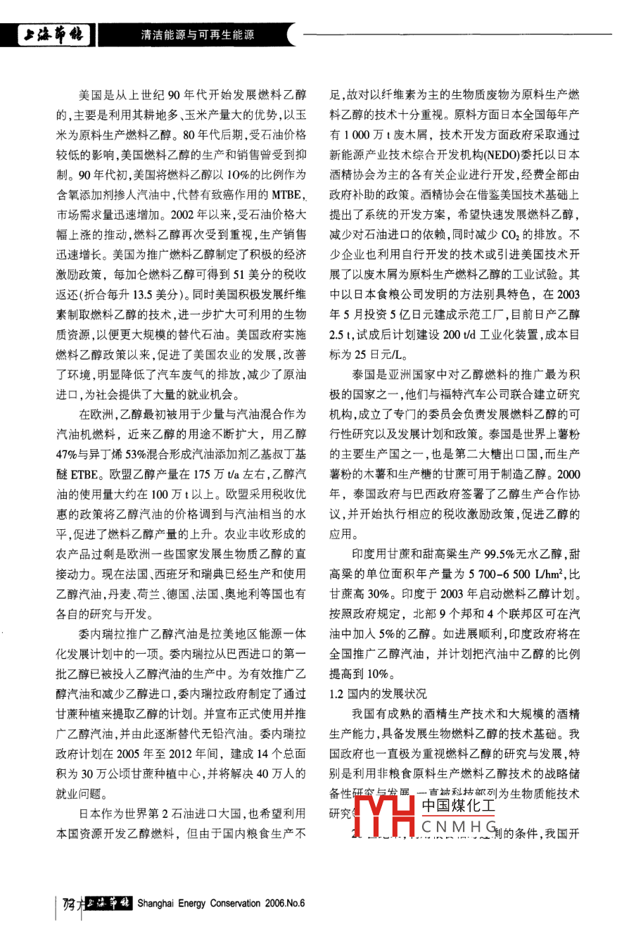 清潔能源與可再生能源生物質(zhì)生產(chǎn)燃料乙醇技術(shù)的研究華東理工大學(xué)柴梅顏涌捷摘要:介紹國內(nèi)外以及上海的生物質(zhì)生產(chǎn)燃料乙醇技術(shù)應(yīng)用和發(fā)展現(xiàn)狀,概述了燃料乙醇生產(chǎn)的生物質(zhì)原料和生產(chǎn)方法,并分析了生產(chǎn)技術(shù)存在的主要問題。最后,提出了上海未來生物質(zhì)燃料乙醇生產(chǎn)的發(fā)展方向。關(guān)鍵詞:生物質(zhì);纖維素;燃料乙醇Research on fuel ethanol from biomassChai Mei Yan YongjieAbstract: The actuality and development in fuel ethanol from biomass was introduced. Thefuel ethanol production material and method was described. The problem of currently technologyvas analyzed. In the end, the future development direction of Shanghai wan put forwardKeywords: biomass; cellulose; fuel ethanol前言最早大規(guī)模使用乙醇作為替代燃料的國家。巴西從隨著化石能源的漸趨枯竭,環(huán)境壓力的日益1975年就開始實施“燃料乙醇計劃”,以甘蔗為原沉重,能源需求和油價持續(xù)上升,人類越來越認(rèn)識料生產(chǎn)燃料乙醇替代車用汽油,經(jīng)過多年的努力,到尋求可再生清潔能源和能源的多元化的迫切達到了預(yù)期目的。1985年以來,雖然燃料乙醇產(chǎn)量性。上世紀(jì)70年代石油危機以來,一些國家開始因油價、糖價和政策影響有所波動,但平均年產(chǎn)量嘗試?yán)蒙镔|(zhì)資源生產(chǎn)液體燃料。其中由生物達1000萬t左右,累計替代石油約2億t目前,巴質(zhì)生產(chǎn)的燃料乙醇以其可再生性、無污染性、不引西所有車用汽油均添加20%-25%的燃料乙醇,并且起溫室效應(yīng)和提高汽車的防爆性能等特點而被公已有大量使用純?nèi)剂弦掖嫉钠?2005年銷售的汽認(rèn)為最有工業(yè)應(yīng)用前景的可再生能源之一,得到車有70%為可以完全燃用純?nèi)剂弦掖嫉钠嚒?005了廣泛的研究。年,巴西燃料乙醇消費量為1200萬t,替代了當(dāng)年汽油消費量的45%,約占車用燃料消費總量的三分1國內(nèi)外的燃料乙醇發(fā)展?fàn)顩r之一,為70多萬人提供了就業(yè)機會。燃料乙醇已成1.1國外的發(fā)展?fàn)顩r為巴YH中仝這發(fā)展、增加就業(yè)的中國煤化工燃料乙醇已有30多年發(fā)展歷史,其中巴西是支柱CNMHG【作者簡介】柴梅,華東理工大學(xué),碩士研究生Shanghai Energy Conservation 2006. No 6*547≯缽靳】清潔能源與可再生能源美國是從上世紀(jì)90年代開始發(fā)展燃料乙醇足,故對以纖維素為主的生物質(zhì)廢物為原料生產(chǎn)燃的,主要是利用其耕地多、玉米產(chǎn)量大的優(yōu)勢,以玉料乙醇的技術(shù)十分重視。原料方面日本全國每年產(chǎn)米為原料生產(chǎn)燃料乙醇。80年代后期,受石油價格有1000萬t廢木屑,技術(shù)開發(fā)方面政府采取通過較低的影響,美國燃料乙醇的生產(chǎn)和銷售曾受到抑新能源產(chǎn)業(yè)技木綜合開發(fā)機構(gòu)NEDO委托以日本制。90年代初,美國將燃料乙醇以10%的比例作為酒精協(xié)會為主的各有關(guān)企業(yè)進行開發(fā),經(jīng)費全部由含氧添加劑摻人汽油中,代替有致癌作用的MIBE,政府補助的政策。酒精協(xié)會在借鑒美國技術(shù)基礎(chǔ)上市場需求量迅速增加。2002年以來,受石油價格大提出了系統(tǒng)的開發(fā)方案,希望快速發(fā)展燃料乙醇,幅上漲的推動,燃料乙醇再次受到重視,生產(chǎn)銷售減少對石油進口的依賴,同時減少CO2的排放。不迅速增長。美國為推廣燃料乙醇制定了積極的經(jīng)濟少企業(yè)也利用自行開發(fā)的技術(shù)或引進美國技術(shù)開激勵政策,每加侖燃料乙醇可得到51美分的稅收展了以廢木屑為原料生產(chǎn)燃料乙醇的工業(yè)試驗。其返還(折合每升135美分)。同時美國積極發(fā)展纖維中以日本食糧公司發(fā)明的方法別具特色,在2003素制取燃料乙醇的技術(shù),進一步擴大可利用的生物年5月投資5億日元建成示范工廠,目前日產(chǎn)乙醇質(zhì)資源,以便更大規(guī)模的替代石油。美國政府實施25t,試成后計劃建設(shè)200td工業(yè)化裝置,成本目燃料乙醇政策以來,促進了美國農(nóng)業(yè)的發(fā)展,改善標(biāo)為25日元/L。了環(huán)境,明顯降低了汽車廢氣的排放,減少了原油泰國是亞洲國家中對乙醇燃料的推廣最為積進口,為社會提供了大量的就業(yè)機會。極的國家之一,他們與福特汽車公司聯(lián)合建立研究在歐洲,乙醇最初被用于少量與汽油混合作為機構(gòu),成立了專門的委員會負(fù)責(zé)發(fā)展燃料乙醇的可汽油杋燃料,近來乙醇的用途不斷擴大,用乙醇行性研究以及發(fā)展計劃和政策。泰國是世界上薯粉47%與異丁烯53%混合形成汽油添加劑乙基叔丁基的主要生產(chǎn)國之一,也是第二大糖出口國,而生產(chǎn)醚ETBE。歐盟乙醇產(chǎn)量在175萬ta左右,乙醇汽薯粉的木薯和生產(chǎn)糖的甘蔗可用于制造乙醇。2000油的使用量大約在100萬t以上。歐盟采用稅收優(yōu)年,泰國政府與巴西政府簽署了乙醇生產(chǎn)合作協(xié)惠的政策將乙醇汽油的價格調(diào)到與汽油相當(dāng)?shù)乃h,并開始執(zhí)行相應(yīng)的稅收激勵政策,促進乙醇的平,促進了燃料乙醇產(chǎn)量的上升。農(nóng)業(yè)豐收形成的應(yīng)用農(nóng)產(chǎn)品過剩是歐洲一些國家發(fā)展生物質(zhì)乙醇的直印度用甘蔗和甜高粱生產(chǎn)995%無水乙醇,甜接動力?,F(xiàn)在法國、西