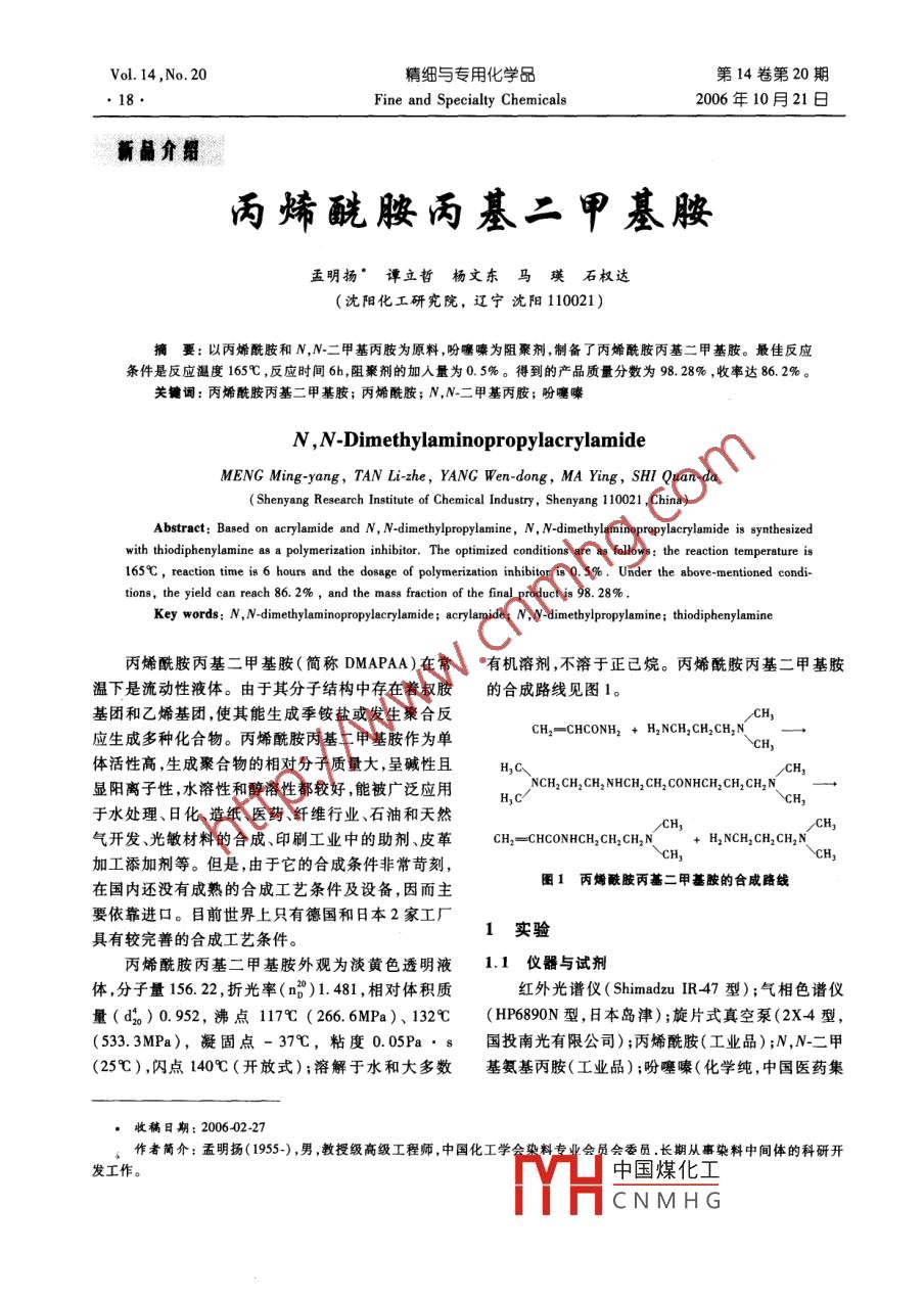 Vol. 14. No. 20精細(xì)與專用化學(xué)品第14卷第20期Fine and Specialty Chemicals2006年10月21日新晶介丙烯酰胺丙基二甲基胺盂明揚(yáng)‘譚立哲楊文東馬瑛石權(quán)達(dá)(沈陽(yáng)化工研究院,遼寧沈陽(yáng)110021)摘要:以丙烯酰胺和N,N二甲基丙胺為原料,吩噻嗪為阻聚劑,制備了丙烯酰胺丙基二甲基胺。最佳反應(yīng)條件是反應(yīng)溫度165℃,反應(yīng)時(shí)間6h,阻聚劑的加入量為0.5%。得到的產(chǎn)品質(zhì)量分?jǐn)?shù)為98.28%,收率達(dá)86.2%。關(guān)鵪詞:丙烯酰胺丙基二甲基胺;丙烯酰胺;N,N二甲基丙胺;吩噻嗪N, N-DimethylaminopropylacrylamideMENG Ming-yang, TAN Li-zhe, YANG Wen-dong, MA Ying, SHI Quan-daShenyang Research Institute of Chemical Industry, Shenyang 110021, China)Abstract: Based on acrylamide and N, N-dimethylpropylamine, N, N-dimethylaminopropylacrylamide is synthesizednylamine as a polymerization inhibitor. The optimized conditions are as follows: the reaction temperature is165C, reaction time is 6 hours and the dosage of polymerization inhibitor is 0. 5%. Under the above-mentioned conditions, the yield can reach 86. 2%, and the mass fraction of the final product is 98. 28%Key words: N, N-dimethylaminopropylacrylamide: acrylamide; N, N-dimethylpropylamine; thiodiphenylamir丙烯酰胺丙基二甲基胺(簡(jiǎn)稱 DMAPAA)在常有機(jī)溶劑,不溶于正己烷。丙烯酰胺丙基二甲基胺溫下是流動(dòng)性液體。由于其分子結(jié)構(gòu)中存在著叔胺的合成路線見圖1。基團(tuán)和乙烯基團(tuán),使其能生成季銨鹽或發(fā)生聚合反應(yīng)生成多種化合物。丙烯酰胺丙基二甲基胺作為單CH, -, H2NCH2 CH2 CH2N體活性高,生成聚合物的相對(duì)分子質(zhì)量大,呈堿性且H3C-cH1CH2CH2NHCH2CH2 CONHCH1 CH,ChGN-CH2顯陽(yáng)離子性,水溶性和醇溶性都較好,能被廣泛應(yīng)用H,于水處理、日化、造紙、醫(yī)藥、纖維行業(yè)、石油和天然氣開發(fā)、光敏材料的合成、印刷工業(yè)中的助劑、皮革CH,-CHCONHCH, CH2 CH, NH, NCH, CH, CH,N加工添加劑等。但是,由于它的合成條件非??量?在國(guó)內(nèi)還沒有成熟的合成工藝條件及設(shè)備,因而主圖1丙烯酰胺丙基二甲基胺的合成路線要依靠進(jìn)口。目前世界上只有德國(guó)和日本2家工廠具有較完善的合成工藝條件。1實(shí)驗(yàn)丙烯酰胺丙基二甲基胺外觀為淡黃色透明液1.1儀器與試劑體,分子量156.22,折光率(n0)1.481,相對(duì)體積質(zhì)紅外光譜儀( Shimadzu ir47型);氣相色譜儀量(d2)0.952,沸點(diǎn)117℃(266.6MPa)、132℃(HP6890N型,日本島津);旋片式真空泵(2X4型,(533.3MPa),凝固點(diǎn)-37℃,粘度0.05Pa·s國(guó)投南光有限公司);丙烯酰胺(工業(yè)品);N,N-二甲(25℃),閃點(diǎn)140℃(開放式);溶解于水和大多數(shù)基氨基丙胺(工業(yè)品);吩噻嗪(化學(xué)純,中國(guó)醫(yī)藥集收稿日期:2006402-27作者簡(jiǎn)介:孟明揚(yáng)(195),男教授級(jí)高級(jí)工程師,中國(guó)化工學(xué)會(huì)染料專業(yè)會(huì)園會(huì)委員.長(zhǎng)期從事染料中間體的科研開發(fā)工作。中國(guó)煤化工CNMHG2006年10月21日明揚(yáng),等:丙烯酰胺丙基二甲基胺團(tuán)上海化學(xué)試劑公司);甘油(化學(xué)純,中國(guó)醫(yī)藥集光譜、核磁共振等方法分析了產(chǎn)品的結(jié)構(gòu)。團(tuán)上海化學(xué)試劑公司)。12實(shí)驗(yàn)方法2結(jié)果與討論在裝有回流冷凝器、電動(dòng)攪拌器、溫度計(jì)的四口2.1產(chǎn)物的純度分析燒瓶中,首先加入276.3g(3.0mol)甘油,加熱到用四氫呋喃作淋洗液,采用氣相色譜法分析了55-65℃,邊攪拌邊加入4g(0.06m)85%的氫氧產(chǎn)物的純度,產(chǎn)品的純度達(dá)到98%以上?;?在此溫度下加入213.2g(30mo)丙烯酰胺。2.2產(chǎn)物的結(jié)構(gòu)分析物料溶解以后,在60℃下攪拌反應(yīng)5h,然后用14.5g丙烯酰胺丙基二甲基胺的紅外光譜中(0.2mo)丙烯酸中和反應(yīng)混合物,慢慢滴加460g3323cm為酰胺的N-H伸縮振動(dòng)峰,2946cm與(4.5mol)N,N二甲基丙二胺。在氮?dú)獾谋Wo(hù)下升2862cm是—CH,的非對(duì)稱伸縮振動(dòng)峰和對(duì)稱伸溫至130~170℃,攪拌下保溫反應(yīng)8-10h。反應(yīng)產(chǎn)縮振動(dòng)峰,1656cm-是酰胺的C=0的伸縮振動(dòng)峰,物送入精餾塔,在4kPa、160~170℃條件下收集餾1617cm是C=C的伸縮振動(dòng)峰,1536cm是C-N分得到645g淺黃色粘稠具有氨味的液體,質(zhì)量分的伸縮振動(dòng)峰,1311cm是叔氨基的特征吸收峰。數(shù)58%,精制后產(chǎn)品質(zhì)量分?jǐn)?shù)≥98%,收率為80%。而且樣品的紅外光譜圖與丙烯酰胺丙基二甲基胺的過量的N,N二甲基丙二胺和甘油回收使用。標(biāo)準(zhǔn)紅外譜圖基本一致13分析測(cè)試丙烯酰胺丙基二甲基胺的核磁共振譜圖數(shù)據(jù)采用氣相色譜測(cè)定了目標(biāo)產(chǎn)物的含量,用紅外(溶劑CDC1)見表1。表1丙烯酰胺丙基二甲基胺的核磁氯譜數(shù)據(jù)結(jié)構(gòu)與標(biāo)識(shí)質(zhì)子位置化學(xué)位移偶合分裂(H2)質(zhì)子數(shù)5.59d(10.2,1.8)6.21dd(168,1.8)dd(16.8,10.8)-NHCH2.41注:d四重峰(兩種偶合常數(shù)),s單峰,m多重峰,t三重峰。上述核磁氫譜數(shù)據(jù)與表中所列的結(jié)構(gòu)完全符合,綜合上述表中的數(shù)據(jù)與 DMAPAM樣品的紅外光譜數(shù)據(jù),證明所得產(chǎn)物即為目標(biāo)產(chǎn)物 DMAPAM。23阻聚劑加入量對(duì)收率的影響阻聚劑質(zhì)量分?jǐn)?shù)對(duì)收率的影響見圖2加人阻聚劑的目的是防止反應(yīng)過程中反應(yīng)物和反應