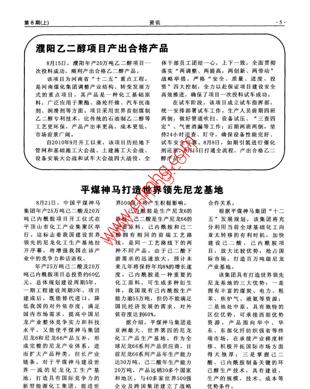 第8期(上)資訊濮陽乙二醇項目產(chǎn)出合格產(chǎn)品8月15日,濮陽年產(chǎn)20萬噸乙二醇項目一體干部員工團結(jié)一心,上下一致,全面貫徹次投料成功,順利產(chǎn)出合格乙二醇產(chǎn)品。落實“兩調(diào)整、兩提高,兩創(chuàng)新、兩帶動”該項目為河南省“十二五”重點工程,戰(zhàn)略舉措,嚴(yán)格“安全、質(zhì)量、進度、投是河南煤化集團調(diào)整產(chǎn)業(yè)結(jié)構(gòu)、轉(zhuǎn)變發(fā)展方資”四大控制,全力以赴保證項目建設(shè)安全式的重點項目,其產(chǎn)品是一種化工基礎(chǔ)原高效推進,確保了項目一次投料試車成功。料,廣泛應(yīng)用于聚酯、滌綸纖維、汽車抗凍在試車階段,該項目成立試車指揮部,劑、潤滑劑等方面。項目采用世界首創(chuàng)煤制統(tǒng)一安排部署試車工作。生產(chǎn)人員前期四班乙二醇專利技術(shù),比傳統(tǒng)的石油制乙二醇等兩倒,做好管道吹掃、設(shè)備試壓、“三查四工藝更環(huán)保,產(chǎn)品產(chǎn)出率更高,成本更低,定”、氣密消漏等工作;后期兩班兩倒,堅市場前景廣闊。持24小時巡查、盯守,確保設(shè)備性能完好、自2010年9月開工以來,該項目歷經(jīng)地下試車安全可靠。8月8日,如期引氫進行催化管網(wǎng)和基礎(chǔ)施工大會戰(zhàn)、土建施工大會戰(zhàn)、劑還原,8月15日打通全流程,產(chǎn)出合格乙二設(shè)備安裝大會戰(zhàn)和試車大會戰(zhàn)四大戰(zhàn)役,全醇產(chǎn)品。平煤神馬打造世界領(lǐng)先尼龍基地8月21日,中國平煤神馬界500強,將產(chǎn)生積極影響。合作關(guān)系集團年產(chǎn)25萬噸己二酸及20萬己內(nèi)酰胺是生產(chǎn)尼龍6的根據(jù)平煤神馬集團“十二噸己內(nèi)酰胺項目開工儀式在原料,己二酸是生產(chǎn)尼龍66的五”發(fā)展規(guī)劃,該集團將充平頂山市化工產(chǎn)業(yè)集聚區(qū)舉主要原料,己內(nèi)酰胺和己二分利用當(dāng)前全球基礎(chǔ)化工向行。這標(biāo)志著我國建設(shè)世界酸擁有相同的前端工藝路亞太轉(zhuǎn)移的有利時機,加快領(lǐng)先的尼龍化工生產(chǎn)基地拉線,是同一工藝路線下的兩建設(shè)己二酸、己內(nèi)酰胺項開序幕,將增強我國在該產(chǎn)種不同產(chǎn)品。由于己二酸下目,放大比較優(yōu)勢,搶占國業(yè)中的競爭力和話語權(quán)。游需求的迅速放大,預(yù)計未際市場,打造百萬噸級尼龍年產(chǎn)25萬噸己二酸及20萬來幾年將保持年均8%的增長速產(chǎn)業(yè)基地。噸己內(nèi)酰胺項目總投資約60億度。己內(nèi)酰胺是一種重要的該集團具有打造世界領(lǐng)先元,總體規(guī)劃建設(shè)周期5年化工原料,可生成多種衍生尼龍基地的三大優(yōu)勢:一是期工程建設(shè)周期3年。項目體,我國現(xiàn)有己內(nèi)酰胺生產(chǎn)擁有豐富的煤炭、電力、粗建成后,既能替代進口,降能力逾55萬噸,但仍不能滿足苯、焦?fàn)t氣、液氨等資源低我國的對外依存度,滿足國民經(jīng)濟發(fā)展的需求,對外是地處中原,具有獨特的因內(nèi)市場需求,提高中國尼依存度達(dá)到60%。區(qū)位優(yōu)勢,可承接西部優(yōu)勢龍產(chǎn)業(yè)整體競爭實力和科技據(jù)介紹,平煤神馬集團是資源,產(chǎn)品面向華中、華水平,又能使平煤神馬集團亞洲最大、世界第四的尼龍東、東部化纖紡織強省等終尼龍6和尼龍66產(chǎn)品互補,形化工產(chǎn)品生產(chǎn)基地。作為全端市場,在承接產(chǎn)業(yè)梯度轉(zhuǎn)成完整的尼龍產(chǎn)業(yè)體系,進球尼龍66系列產(chǎn)品供應(yīng)商,目移、積極開拓國際市場方面而擴大產(chǎn)品種類,拉長產(chǎn)業(yè)前尼龍66系列產(chǎn)品年生產(chǎn)能力得天獨厚;三是掌握己二鏈條。對于平煤神馬建設(shè)世達(dá)30萬噸,己二酸年生產(chǎn)能力酸、己內(nèi)酰胺制備關(guān)鍵的環(huán)界一流的尼龍化工生產(chǎn)基20萬噸,產(chǎn)品遠(yuǎn)銷30多個國家己醇生產(chǎn)技術(shù),具有建設(shè)地,打造具有國際競爭力的和地區(qū),與40多家世界500強生產(chǎn)的規(guī)模、技術(shù)、成本等新型能源化工集團,挺進世企業(yè)及跨國集團建立了戰(zhàn)略優(yōu)勢條件。