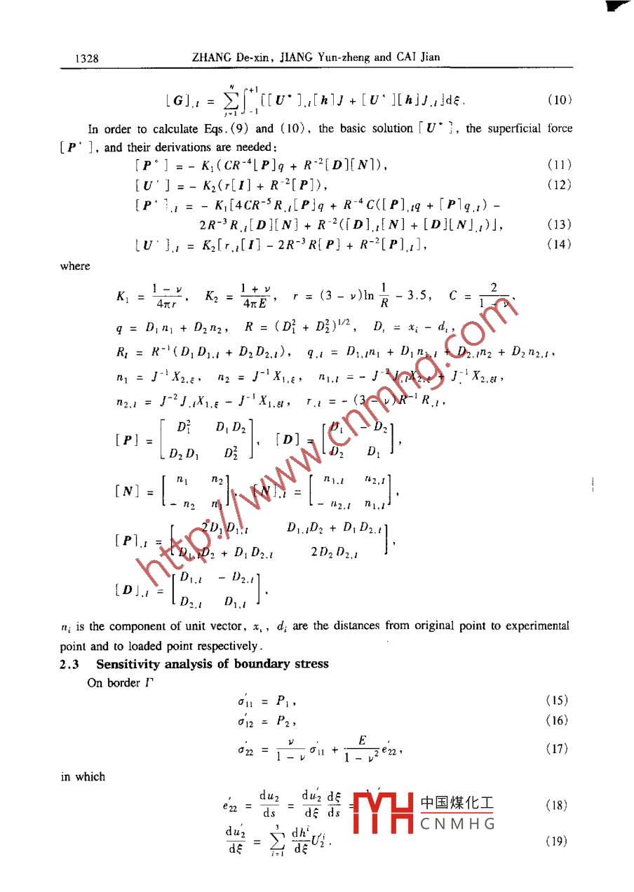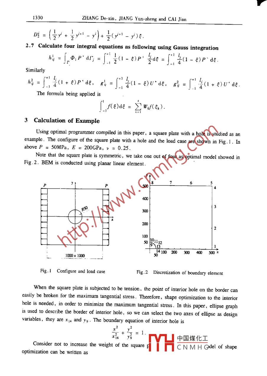 Applied Mathematics and MechanicsPublished by Shanghai University .( English Edition, Vol 22. No 11, Nov 2001) .Shanghai, ChinaArticle ID: 0253-482720001)11-1325-08ANALYTIC SENSITIVITY ANALYSIS FORSHAPE OPTIMIZATION *ZHANG De-xin (張德欣)',JIANG Yun-zheng (江允正),CAI Jian(蔡謇)3(1.703 Research Institute,the Seventh Academy, China State ShipbuildingCorporation, Harbin 10001, P R China;2. Yantai University,Yantai 264005, P R China;3. 468 Factory, Jiangjin, Chongqing 400226,P R China)(Communicated by CHIEN Wei-zang)Abstract: Analytic sensitivity unalysis technology for the boundary element method ( BEM )is presented, combined with a shape optimization system for structural analysis. A shapeoptimization was done for an elastomer under planar stress,based on this new algorithm. Amulti object problem was studied as on ilustrative example for the programmer, using .weighted summing method . The result is feasible .Key words : BEM; dcsign sensitivity analysis; shape optimization: square plate with a holeCLC number: U224Document code: AIntroductionShape optimization for elastomer is an important measure to relieve stress contrition . preventbreaking,improve load-bearing capacity . Structural repetition analysis ,sensitivity analysis andoptimal algorithm are three important links of shape optimization. In the course of theoptimization, sensitivity analysis plays a determinative role to get a higher precision .Most existing sensitivity analysis systems are based on the finite- element method. A detailedexposition of sensitivity analysis in FEM have been writen in Ref.[1] by Wang, et al. InRef.[2] Ramakrshnan and Francavilla give a finite- -element method with sensitivity analysis,using implicit derivation to formulate sensitivity equations. The BEM can reduce one dimensionof the problem compared with the FEM, so it is very important to formulate analytic sensitivityanalysis equation. Those equations are presented in this paper,referring to the equations of FEM .Using the method, we can simplify the problem and improve the efficiency. The process isdetermined by the parameters on the boundary, that make shape optimization simpler and moreprecise .The analyic sensitivity analysis of BEM developed in this paper is applied in an example .Correctness of the algorithm is certified by compavism with existing results .中國(guó)煤化工Received date: 1999-12-18; Revised date: 2001-06JMYHCNMHGBiography: ZHANG De- xin ( 1964 - ), Professor13251326ZHANG De-xin, JIANG Yun-zheng and CAI Jian1 Basic Theory and Formula of BEMConsider a linear isotropic elastic body 0 (Its boundary is noted as r ),the integralequation on the boundary can be writtenCluis +f. Piundr=|, uiP:dr+ | uib;dQ,(1)JrJin whichCu(P) =( 4r(1 -叭- {2(1-a)-專(zhuān)sin2a}一sin'a4r(1一D)- sin2a4r(1-)- {2(1-a)- -sin2a }here,「= Tμ+ Tp, Tu is boundary displacement, and Ip is superficial force on the boundary.Q. P∈r,Ua(P'Q') is basic solution of displacement, Pix(P'Q") is superficial forcecorresponding to Un(P'Q' ).The basic solution of planar stress problem and the superficial force coke:U:(PQ)= [(3-v)nou +(1+v)r.r.],4πEPi(P'Q') =-{[(1-1)8x +2(1+p)r.r.sJ-(1-)r.nma-r.m)}. (2)where E and v are modules of elasticity and Posang' s ratio respectively; r is the distance betweenp and Q. The basic solution of planar stain problem can be got by replacement of E and v.Consider a quadratic clement as example,we discrete border into N elements . Nodal pointsdistribute at two ends of each element and at middle point, so the number of nodal points are 2N .Using the zero dimension method, these deformation, superficial force of the quadratic elementare .x(()= 2中(e)x,U;(t) = 2中.(&)Uj,P;(&) = Q,(&)Pg,(3)φ(ξ=六ξ(ξ-1),φ2(ξ)=(1-E)(1+E),中(&)=六ξ(∈+1).Eq.(1) can also be expressed in matrix form asCi{U}' + [P']{U}dr=|. [U' ]{P}dr+ |。 [U']{b }d2.(4)In which{P}={例},{U}={}, (0)={%},[P°]=Pi P2J[U°] =lU2i UiJExpanding and merging , those expressions give中國(guó)煤化工Zl@]}{(Sa)FYHCNMHGwhereSensitivity Analysis for Shape Optimization1327[φ' =|[φ' 0{}.l。如小{U)i=Similarly we can get{P}=D]'{P}',(5b){X}= 2[φ]{x}'.(5c)Substitution of Eqs. (5a), (5b), and (5c) into Eq.(4), gives[H]{U}= [G]{P},<6)where[H} =之"[p" }[h]d&,[G] =2"1v][h]JdE, .here! h] is a matrix including function φ',Eq. (6) can be dispersed into blocks and rearranged ,we can get[A]{Y}= {F}.(7)in which{F}= [M]}{Y}, {Y}={} {)={"},[A] =[- G1 H2][- Hu G12]l_ G2 H2小.[M」=l_H2,C,小2 Design Sensitivity Analysis of BEMIn calculation of shape optimization, partial derivatives of objective function and constrainfunction are often required.As to many problem, the most of these functions consist of superficial force anddisplacement. Solving equation [ A]{Y} = {F} for displacement and superficial force, thestress can be derived. The stress can be got using the known superficial force and displacement ,that is so-called stress restoration . The sensitivity of these stress to the No. I design variabale maybe obtained by conduction implicit derivation to X[. We can find out that stress sensitivitydepends on sensitivity of superficial force ,displacement and geometric parameters .2.1 Sensitivity of displacement and superficial forceConsider the implicit derivative of Eq . (7) with respect to design variable X, the sensitivityequation of unknown displacement and superficial force can be written as[A]{Y}.u = {r},,(8){r}. = {F},r-[A],{Y}, {F}, = {M],;{Y}+ [M]{W},.2.2 Sensitivity of subsidiary parameter of BEMAccording to Eq . (8), we know that derivation of mat;ired in order中國(guó)煤化工to calculate these matrixes, that isTYHCNMHG[H].r =[P'].I[h]J + lP"][hIJ,IJdE,(9)1328ZHANG De-xin, JIANG Yun- zheng and CAI JianlG]1= I[[U*].I[h]J +[U'][hjJrJdε.(10)In order to calculate Eqs.(9) and (10), the basic solution [ U* ],the superficial force. [P'], and their derivations are needed:[P°] =- K;(CR-4[P]q + R-2[D][Nl),(11)[U'] =- K2(r[1] + R-2[P]),(12)[P'l, = - K[4CR-'R.[P}q +