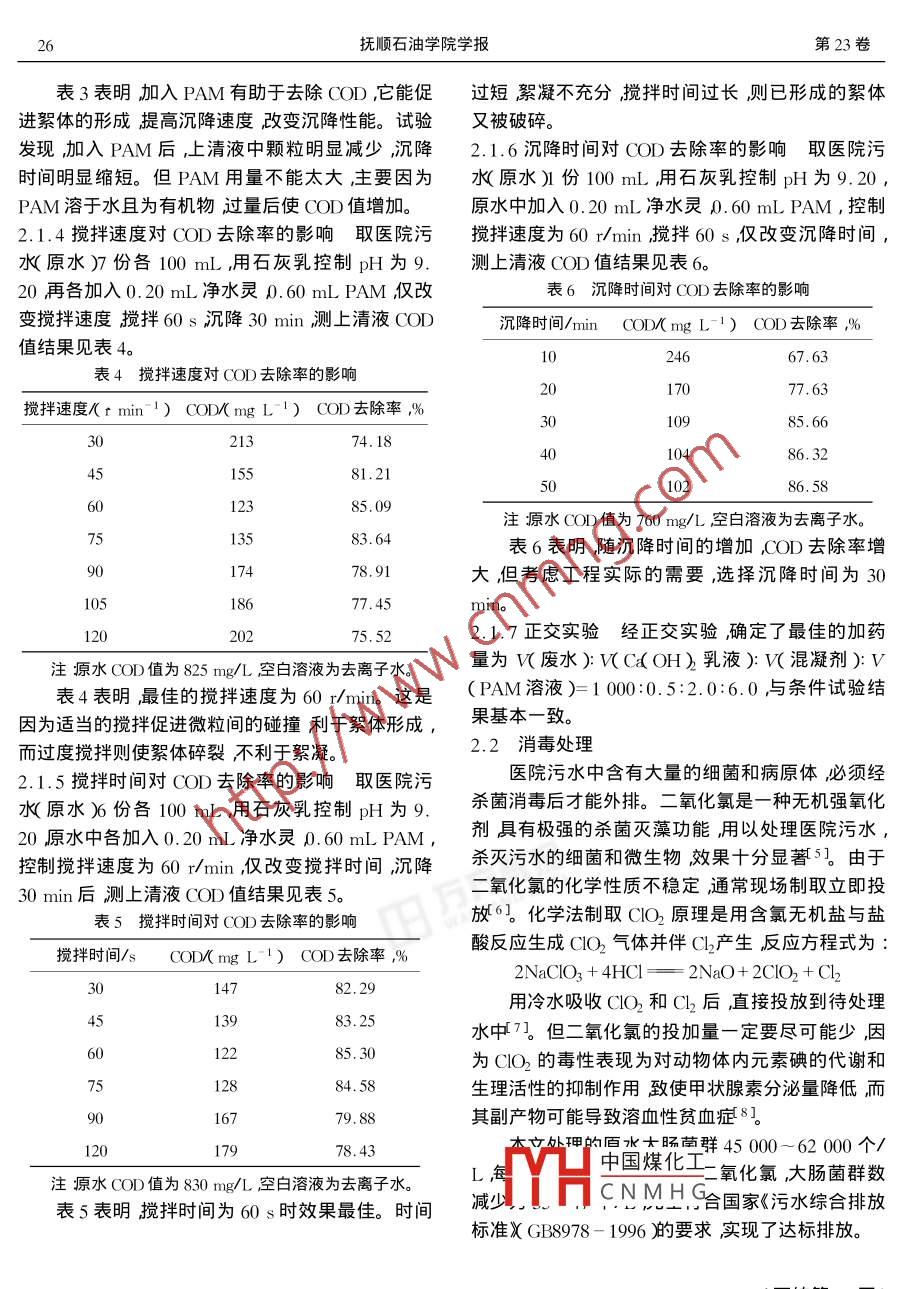 第23卷第2期撫順石油學(xué)院學(xué)報(bào)Vol.23 No. 22003年6月JOURNAL OF FUSHUN PETROLEUM INSTITUTEJun. 2003文章編號:1005 - 3883( 2003 )2 - 0024-03醫(yī)院污水的化學(xué)處理方法研究丁保宏,王曉立,孫彩蘭,程闖(撫順職業(yè)技術(shù)學(xué)院,遼寧撫順113006 )摘要:用化學(xué)絮凝法處理醫(yī)院污水。采用石灰乳控制原水酸度用新型化學(xué)破乳絮凝劑凈水靈做混凝劑,聯(lián)合聚丙烯酰胺絮凝處理該類污水并用二氧化氯殺菌。考查了酸度、混凝劑加入量、聚丙烯酰胺加入量、攪拌速度、攪拌時(shí)間、沉降時(shí)間對COD去除率的影響。結(jié)果表明酸度在pH9.20左右時(shí),每100 mL污水中凈水靈加入量為0. 2 mL聚丙烯酰胺加入量為0.6 mL ,攪拌速度為60 r/min ,攪拌60s沉降30 min后測上清液的化學(xué)耗氧量,COD去除率可達(dá)85%左右明顯優(yōu)于傳統(tǒng)的鐵系混凝劑。并具有工藝簡單、操作管理方便、不受氣候影響、占地面積小等特點(diǎn)且藥劑費(fèi)僅為0. 30元/t ,有實(shí)際應(yīng)用的價(jià)值。關(guān)鍵詞:醫(yī)院污水 ;混凝沉降;凈水靈;聚丙烯酰胺中圖分類號:X131.2文獻(xiàn)標(biāo)識碼:AStudy on Chemical Treatment of Hospital W astewaterDING Bao- hong , WANG Xiao-li ,SUN Cai - lan , CHENG Chuang( Fushun Higher Vocational Technology Institute , Liaoning Fushun 113006 ,China )Abstract : The hospital wastewater was treated by a method of chemical coagulant with calcareous milk to control the acidity of rawwastewater , using the new type water clarificant combined with polyacrylamide as coagulating to treat the wastewater and usingchlorine dioxide to kill bacteria. The effect of adding quantities of coagulant polyacrylamide , the acidity ,speed , stirring time andsettling time on the removal rate of COD were investigated. The result shows that the removal rate of COD can reach to 85% , withpH 9.2 ,adding quantities of coagulant being 0.2 mL per 100 mL of the wastewater , the adding quantities of polyacrylamide being0.6 mL per 100 mL of the wastewater , the string speed being 60 r/min , stiring time being 60 s and the stling time being 30min. The cost of the wastewater treatment is only 0. 3 yuan/t. The process is a simple technology and have powerful functions.Key words : Hospital wastewater ; Coagulating deposit ; Water clarificant ; Polyacrylamide醫(yī)院污水與工業(yè)污水和生活污水相比具有水量菌,克服了化學(xué)藥劑法的不足,有效降低了水質(zhì)小污染力強(qiáng)的特點(diǎn)不同程度地含有多種病毒、細(xì)COD值。處理后的水達(dá)到國家排放標(biāo)準(zhǔn)。菌、寄生蟲卵和有毒有害物質(zhì),如任其排放必然會(huì)污染水源傳播疾病1。目前對醫(yī)院污水的管理力1試驗(yàn)部分度尚不如工業(yè)廢水,這已成為我國環(huán)境管理的一個(gè)1.1儀器與試劑薄弱環(huán)節(jié),有必要引起環(huán)境保護(hù)部門的重視2]。傳試驗(yàn)儀器:TL- 1A型污水CODc速測儀(承德統(tǒng)的液氯、次氯酸鈉、臭氧等化學(xué)藥劑處理法各有其市環(huán)保儀器廠) ;PHS - 3C型酸度計(jì)(蕭山市鑫龍醫(yī)不足之處3。采用東北大學(xué)研制的新混凝劑凈水中國煤化工長度計(jì)(.上海第三分析靈作混凝劑化學(xué)絮凝處理醫(yī)院污水并用二氧化氯殺儀器CNMHG水樣來自我市某醫(yī)院,pH值為8.20左右,收稿日期2002-10- 10COD約為760~ 910 mg/L SS約為95 ~ 130 mg/L,作者簡介:丁保宏( 1970- )女山東日照,講師。.大腸菌群45 000~ 62000個(gè)/I。.采用的化學(xué)藥劑有:re( 聚丙烯酰胺)=0.1% ;第2期丁保宏等.醫(yī)院污水的化學(xué)處理方法研究25re(凈水靈)=5% ;w(石灰乳液) =5% ;w(氯酸量的石灰乳、凈水靈、PAM(聚丙烯酰胺),攪拌- -定鈉)=5% ic( 鹽酸)= 6 mol/Lo .時(shí)間,靜置沉降,取. 上清液測COD值。處理方法的1.2試驗(yàn)方法 .工藝流程見圖1。在一系列100mL水樣中,分別依次投加不同_Ca(OH)2乳液混凝劑 |PAM排放調(diào)節(jié)池上>習(xí)↓>習(xí)↓>>習(xí)[沉淀池一~砂濾]-[aO.管道反應(yīng)器脫水設(shè)備| 污泥池↓泥外運(yùn)圖1化學(xué)絮凝法處理醫(yī)院污水工藝流程2結(jié)果與討論表2混凝劑加入量對COD去除率的影響2.1 影響COD去除率的條件實(shí)驗(yàn)混凝劑加入量/mL COD/(mg L~1) COD 去除率%2.1.1 pH值對COD去除率的影響取7個(gè)1000.10l 5082. 56mL水樣用石灰乳控制為不同pH值再分別加入0.2012885. 12.0.2 mL凈水靈0.6 mL PAM控制攪拌速度為600.3015981.51r/min攪拌60s沉降30 min后測上清液的COD0.40.1 8978. 02值結(jié)果見表1。0.5020476.28表1 pH 值對COD去除率的影響0.6021575.00pHCOD/(mg L- ')COD去除率%0.7021774. 778. 6015183.41注原水COD值為860 mg/L空白溶液為去離子水。9.0014683. 96表2表明,混凝劑加入量在0.2 mL左右時(shí),9.2014184.51COD去除率有-最大值這是因?yàn)榛炷齽┘尤肓可?.7617181.21時(shí)混凝不充分,而混凝劑用量大時(shí)廢水中微粒被10. 3018879. 34過多的混凝劑所包圍失去同其它微粒結(jié)合的機(jī)會(huì),11. 1519678.46達(dá)到另-種穩(wěn)定狀態(tài)不易凝聚。11.8721676.262.1.3 PAM加入量對COD去除率的影響用石灰注原水COD值為910 mg/L空白溶液為去離子水。乳控制6個(gè)100 mL水樣的pH值為9.20 ,各加入0.2 mL混凝劑再分別加入不同量的PAM控制攪表1表明隨pH值增大,COD去除率在pH約拌速度為60 r/min攪拌60s沉降30 min測上清為9.20時(shí)出現(xiàn)最大值。用石灰乳調(diào)節(jié)pH值有利液COD值結(jié)果見表3。于混凝劑的充分水解,又可脫硫脫氮,為后續(xù)處理創(chuàng)表3 PAM 加入量對COD去除率的影