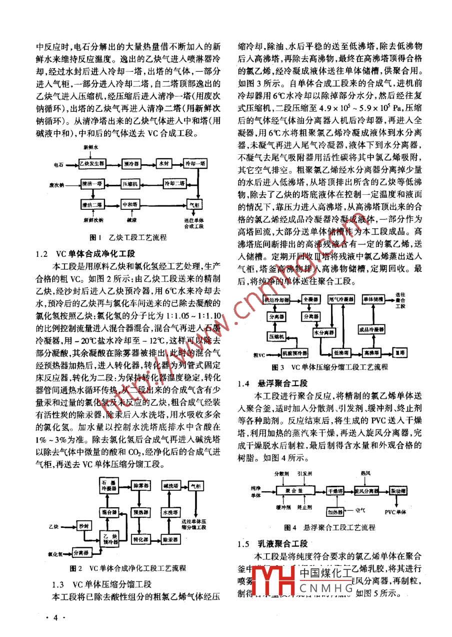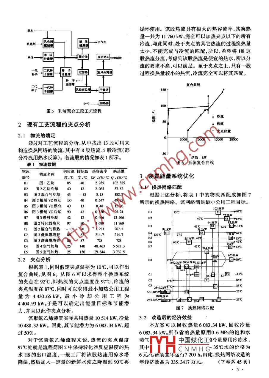 第24卷,總第135期《節(jié)能技術(shù)》Vol.24 , Sum. No. 1352006年1月,第1期ENERGY CONSERVATION TECHNOLOGYJan. 2006,No.1聚氯乙烯裝置熱集成馮霄,趙馳峰,孫 亮(西安交通大學化工系,陜西西安710049)摘要:聚氯乙烯裝置是一個高耗能裝置,對其利用夾點技術(shù)進行節(jié)能改造,有很重要的應(yīng)用.價值。本文利用夾點技術(shù)對某聚氯乙烯流程進行了分析,找出了其能量利用不合理的環(huán)節(jié),針對這些不合理的環(huán)節(jié)提出了節(jié)能改造方案,并對方案進行了技術(shù)經(jīng)濟評價。關(guān)鍵詞:換熱網(wǎng)絡(luò);夾點技術(shù);優(yōu)化;節(jié)能中圖分類號:TQ021.3文獻標識碼:A文章編號:1002 - 6339 (2006) 01-0003-03Heat Integration of Polyvinyl Chloride SystemFENG Xiao,ZHAO Chi - feng, SUN Liang(Departnent of Chemical Engineering, Xi' an Jieaotong University, Xi' an 710049,China)Abstract:' The polyiny chloride (PVC) system is highly energy - consuming, herefore,it is worthy of aplyingthe pinch techology to this systen, so that a better heat - exchanger network can be propased and the energyconsumption can be reduced. This paper applies the pinch technology to analyze the flowsheet of a certain PVCsystem, thereafter, the bottleneck is found and an energy saving retrfit design is proposed and economically e-valuated.Key words: heat - exchanger network; pinch technology ;opization; enery saving在化工生產(chǎn)過程中,能耗直接影響操作費用,因與回收的優(yōu)化配置,提高能量利用率,降低能耗。而是反應(yīng)系統(tǒng)優(yōu)劣的一個重要指標。一個典型的過聚氯乙烯裝置是-一個高耗能裝置,需要對多種程系統(tǒng)包括以下3個組成部分:反應(yīng)分離部分換熱原料、產(chǎn)品流和中間物流進行換熱。本文利用夾點部分和公用工程部分。其中,換熱部分是直接的耗技術(shù)對某聚氯乙烯換熱流程進行了分析,找出了其能部分,其設(shè)計優(yōu)劣直接影響到系統(tǒng)的能量消耗。能量利用不合理的環(huán)節(jié),提出了優(yōu)化后的換熱網(wǎng)絡(luò),要把一個過程工業(yè)的工廠設(shè)計的能耗最小、花并對方案進行了技術(shù)經(jīng)濟評價。費最少和環(huán)境污染最低,就必須把整個系統(tǒng)集成起來作為--個有機結(jié)合的整體來看待,達到整體設(shè)計1現(xiàn)有工藝流程最優(yōu)化。不同的學者提出了不同的集成方法,例如某聚氯乙烯工藝流程分為五個工段:乙炔工段;夾點技術(shù)分析法(~3)、熱力學分析法與熱經(jīng)濟學分VC(氯乙烯)單體合成凈化工段;VC單體壓縮分餾析法(4-5)、數(shù)學規(guī)劃法[6)等。其中,夾點技術(shù)是過程工段;懸浮聚合工段(包括懸浮聚合干燥);乳液聚合集成方法中目前最實用的3。夾點技術(shù)將熱力學原工段(包括乳液聚合干燥)。理與系統(tǒng)工程相結(jié)合,用以取定工程系統(tǒng)能量利用.1 乙快工段收稿日期2005-11-09 修訂稿日期 2005-12-04中國煤化工應(yīng)生成乙炔氣,再基金項目:國家自然科學基金重點項目(20436040)經(jīng)工HCNMH G氣。如圖1所示:作者簡介:馮霄(1953-),女 ,博士.博士生導(dǎo)師,教授。電石進入發(fā)生器遇水產(chǎn)生乙炔氣從發(fā)生器逸出,其3●中反應(yīng)時,電石分解出的大量熱量借不斷加入的新縮冷卻,除油、水后平穩(wěn)的送至低沸塔,除去低沸物鮮水來維持反應(yīng)溫度。逸出的乙炔氣進人噴淋器冷后人高沸塔,再除去高沸物,最終在高沸塔頂?shù)煤细駞s經(jīng)過水封后進入冷卻- -塔,出塔的氣體,一部分的氯乙烯,經(jīng)冷凝成液體送往單體儲槽,供聚合用。進入氣柜,一部分進人冷卻二塔,自二塔頂部逸出的如圖3所示。自單體合成工段來的合成氣,進機前乙炔氣進入壓縮機,經(jīng)壓縮后進人清凈-~塔(用廢次冷卻器用6C水冷卻以除掉部分水分,然后經(jīng)往復(fù)鈉循環(huán)) ,出塔的乙炔氣再進人清凈二塔(用新鮮次式壓縮機,二段壓縮至4.9x I0 ~5.9x 10 Pa,壓縮鈉循環(huán))。從清凈塔出來的乙炔氣體進入中和塔(用后的氣體經(jīng)氣體油分離器人機后冷卻器,再進入全堿液中和),中和后的氣體送去VC合成工段。凝器,用6C水將粗聚氣乙烯冷凝成液體到水分離新鮮水器,未凝氣再進入尾氣冷凝器,液體下到水分離器,跖一它塊發(fā)生教- +器-樹] +冷卻一圖不凝氣去尾氣吸附器用活性碳將其中氯乙烯吸附,其它空氣排空。粗聚氯乙烯經(jīng)水分離器分離掉少量的水后進人低沸塔,從塔頂排出所含的乙炔等低沸物,除去了乙炔的塔底液體在控制一-定溫度和液面遭請二場一→中和帶的情況下,靠壓力進人高沸塔,從高沸塔頂出來的合新鮮次鈉送往平體格的氯乙烯經(jīng)成品冷凝器冷凝成液體, -部分作為高塔回流,大部分送單體儲槽作為本工段成品。高圖1乙炔工段工藝流程沸塔底間斷排出的高沸殘液含有- -定的氯乙烯,送1.2 VC 單體合成凈化工段入儲槽。定期開回收0塔將殘液中氯乙烯蒸出送人本工段是用原料乙炔和氯化氫經(jīng)工藝處理,生產(chǎn)氣柜, 塔簽高佛物排人高沸物儲槽,定期回收。最合格的粗VC。如圖2所示:由乙炔工段送來的精制后,將純凈的單體送往聚合工段。乙炔,經(jīng)沙封后進人乙炔預(yù)冷器,用6C水來冷卻去水,預(yù)冷后的乙炔再與氯化車間送來的已除去凝酸的凱后冷知輸金司醫(yī)冷源國事體使何一氯化氫按照乙炔:氯化氫的分子比為1:1.05~ 1:1.10的比例控制流量進人混合器混合,混合氣再進人石墨成晶冷愛器冷凝器.