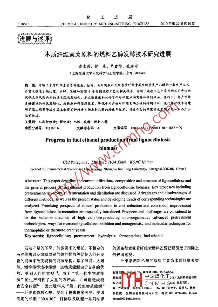 木質(zhì)纖維素為原料的燃料乙醇發(fā)酵技術(shù)研究進(jìn)展