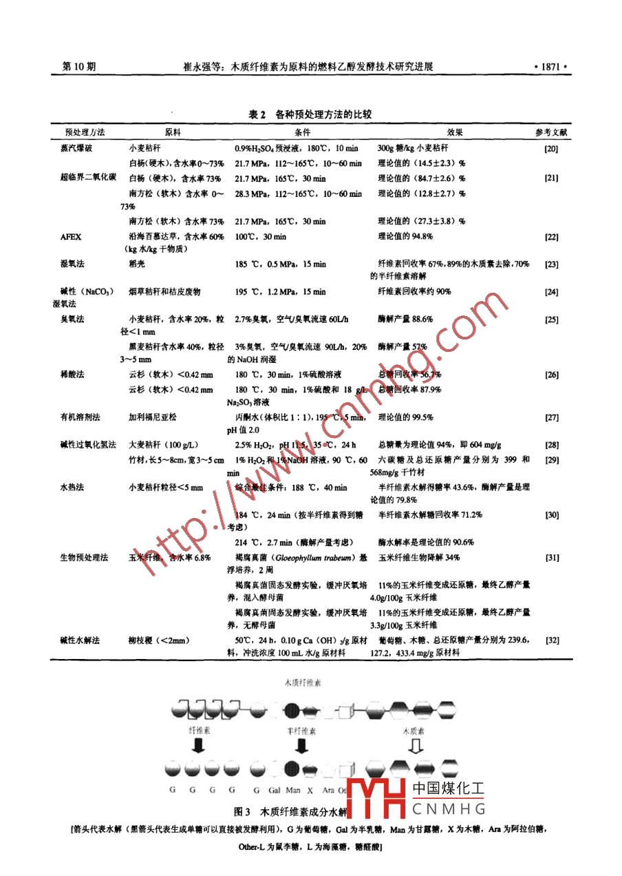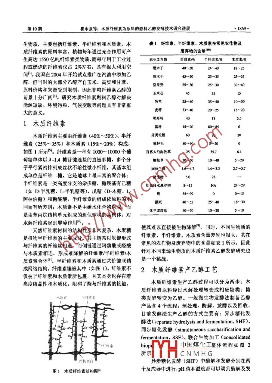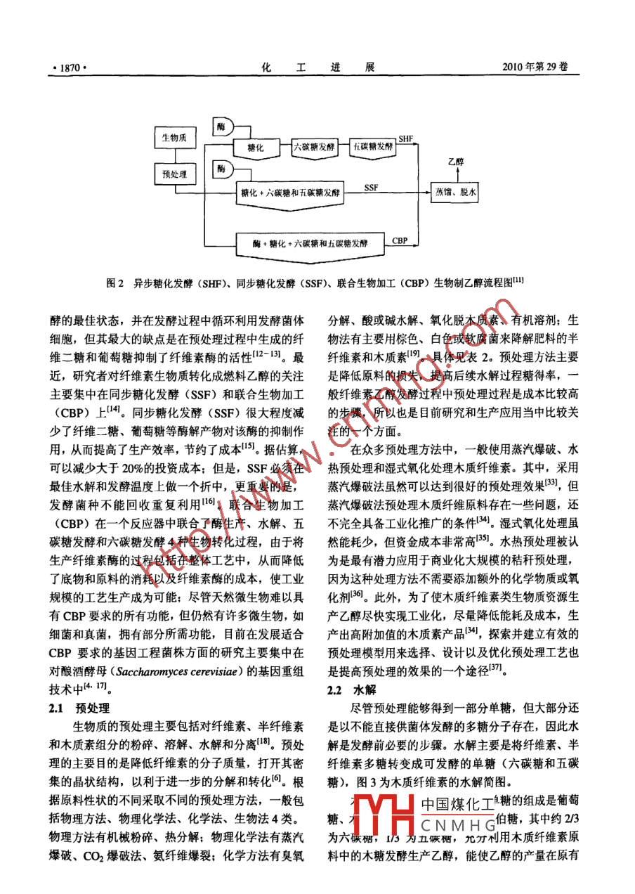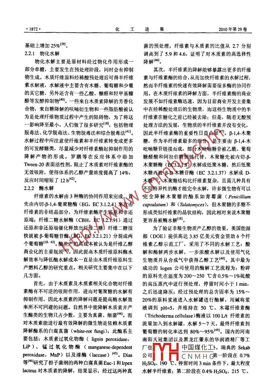 化工進(jìn)展CHEMICAL INDUSTRY AND ENGINEERING PROGRESS2010年第29卷第10期進(jìn)展與述木質(zhì)纖維素為原料的燃料乙醇發(fā)酵技術(shù)研究進(jìn)展崔永強(qiáng),林燕,華鑫怡,孔海南(上海交通大學(xué)環(huán)境科學(xué)與工程學(xué)院,上海200240摘要:介紹了木質(zhì)纖維素的資源組成、結(jié)構(gòu)、利用現(xiàn)狀以及從木質(zhì)纖維素類生物質(zhì)生產(chǎn)乙醇的一般生產(chǎn)工藝,并重點(diǎn)綜逑了預(yù)處理、水解、發(fā)酵和蒸餾4個(gè)關(guān)鍵流程工藝及相關(guān)技術(shù),分析了這些工藝中采用的不同方法的優(yōu)缺點(diǎn)以及國內(nèi)外的技術(shù)現(xiàn)狀及動(dòng)向,本文還提出和討論了今后研究方向需要加強(qiáng)的方面,并指出:高產(chǎn)纖維素酶菌株的篩選及馴化、改進(jìn)原料預(yù)處理技術(shù)、降低中間產(chǎn)物對(duì)纖維素酶活性的抑制作用、現(xiàn)代育種技術(shù)構(gòu)建耐高溫工程菌等減少成本和提高纖維素生物質(zhì)到乙醇的轉(zhuǎn)化率技術(shù),將是今后的研究重點(diǎn)發(fā)展方向和業(yè)界正面臨的挑戰(zhàn)關(guān)鍵詞:木質(zhì)纖維素;預(yù)處理;水解、發(fā)酵;燃料乙醇中圖分類號(hào):TQ9206文獻(xiàn)標(biāo)志碼:A文章編號(hào):1000-6613(2010)10-1868-09Progress in fuel ethanol production from lignocellulosicbiomassCUI Yongqiang, LIN Yan, HUA Xinyi, KONG Hainan(School of Environmental Science and Engineering, Shanghai Jiao Tong University, Shanghai 200240, China)Abstract: This paper describes the current utilization, composition and structure of lignocellulose andthe general process of fuel ethanol production from lignocellulosic biomass. Key processes includingpretreatment, hydrolysis, fermentation and distillation are discussed. Advantages and disadvantages ofdifferent methods, as well as the present status and developing trends of corresponding technologiesanalyzed. Promising prospects of ethanol production in cost reduction and conversion improvementfrom lignocellulose fermentation are especially introduced. Prospects and challenges are considered tobe the isolation methods of high cellulose-producing microorganisms, advanced pretreatmenttechnologies, ways for overcoming cellulase inhibition and mutagenesis, and molecular techniques forthermophilic or thermotolerant yeastsKey words: lignocellulose; pretreatment; hydrolysis; fermentation; fuel ethanol石油產(chǎn)量的下降、能源需求的增長、不穩(wěn)定的的頒布都意味著纖維素燃料乙醇已經(jīng)引起了國際上石油價(jià)格以及縮減溫室氣體的排放等促使人們開發(fā)的普遍重視新的能源來改變現(xiàn)有的能源結(jié)構(gòu)。除了風(fēng)能、太陽纖維素燃料乙醇的原料主要為木質(zhì)纖維素類能、潮汐能等潔凈能源,生物質(zhì)能源由于自身的優(yōu)勢(shì),受到人們的重視。由于“第一代生物質(zhì)能收稿日?、峰為日,n1nn26。源”的生產(chǎn)消耗了大量的農(nóng)產(chǎn)品,并可能造成糧金中國煤化工o5)及污染控制與賽源化研食安全問題,因此近年來“第二代生物質(zhì)能源”CN MHGO2)資助項(xiàng)目r:水強(qiáng)(1987~),男,幀上砑究生。聯(lián)系人:林燕纖維素燃料乙醇,受到了越來越多關(guān)注,美國副教授,生物質(zhì)能源化利用研究,電話021547454;Ema制定的長期“30×30”目標(biāo)以及歐盟一系列法律 linyan00 sjtu.edu.c永強(qiáng)等:木質(zhì)纖維素為原料的燃料乙醇發(fā)酵技術(shù)研究進(jìn)展1869·生物質(zhì),主要包括纖維素、半纖維素和木質(zhì)素。木表1纖維素、半纖維素、木質(zhì)素在常見農(nóng)作物及質(zhì)纖維素的原料豐富,植物每年通過光合作用可產(chǎn)廢棄物的含量1生髙達(dá)1550億噸纖維素類物質(zhì),而每年用于工業(yè)過農(nóng)業(yè)廢棄物纖維素%半纖維素%木質(zhì)素%程或燃燒的纖維素僅占2%左右,具有很大利用空硬木于間。我國在2004年開始試點(diǎn)推廣在汽油中添加乙軟木干醇,但當(dāng)時(shí)的大部分乙醇產(chǎn)自玉米、高粱和甘蔗,堅(jiān)果殼原料價(jià)格和來源受到限制,因此非糧纖維素乙醇的玉米芯前景十分廣闊。研究木質(zhì)纖維素燃料乙醇對(duì)解決能源短缺、環(huán)境污染、氣候變暖等問題具有非常重牧草35~5010~30大的意義。麥稈20~2515~20稻草桿1木質(zhì)纖維素15~20木質(zhì)纖維素主要由纖維素(40%~50%)、半纖分類垃圾維素(25%~35%)和木質(zhì)素(15%~20%)構(gòu)成,5~20如圖1所示5。纖維素是一種有1000~10000個(gè)葡百慕大沿海牧草萄糖單體以β-1,4糖苷鍵連接的直鏈多糖,多個(gè)分柳枝草30~50子平行緊密排列成絲狀不溶性微小纖維,其基本組固體牛糞16~4.7I4~3.32.7~57成單位是纖維二糖,它是地球上最豐富的聚合體;半纖維素是一類高度分支的雜多糖,糖殘基有己糖初始廢水懸浮物8~1524~29(如D半乳糖、L半乳糖等)、戊糖(D-木糖、L阿拉伯糖)和糖醛酸,半纖維素的組成依原料的不5518~30同而有所差別;木質(zhì)素不是由碳水化合物組成,而化學(xué)漿廢紙60~7010~20是由苯內(nèi)烷結(jié)構(gòu)單元組成的近似球狀的高聚體,對(duì)水解纖維素起到屏障作用向天然纖維素材料的結(jié)構(gòu)性質(zhì)非常復(fù)雜,木聚糖使其難以直接被生物降解。同時(shí),不同生物質(zhì)的是植物半纖維素的主要成分,其主鏈常以氫鍵形式纖維素、半纖維素、木質(zhì)素含量差別也很大,其在與纖維素的纖維絲相連,而側(cè)鏈通過阿魏酸或醛酸常見的農(nóng)作物及廢棄物