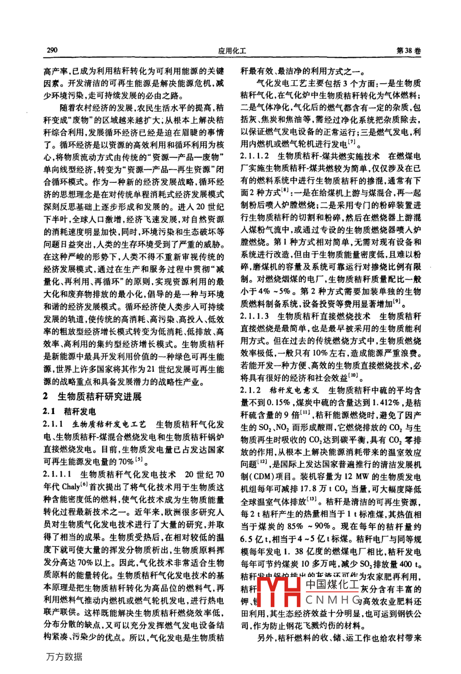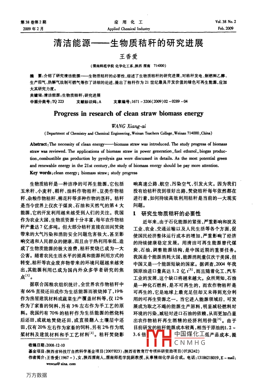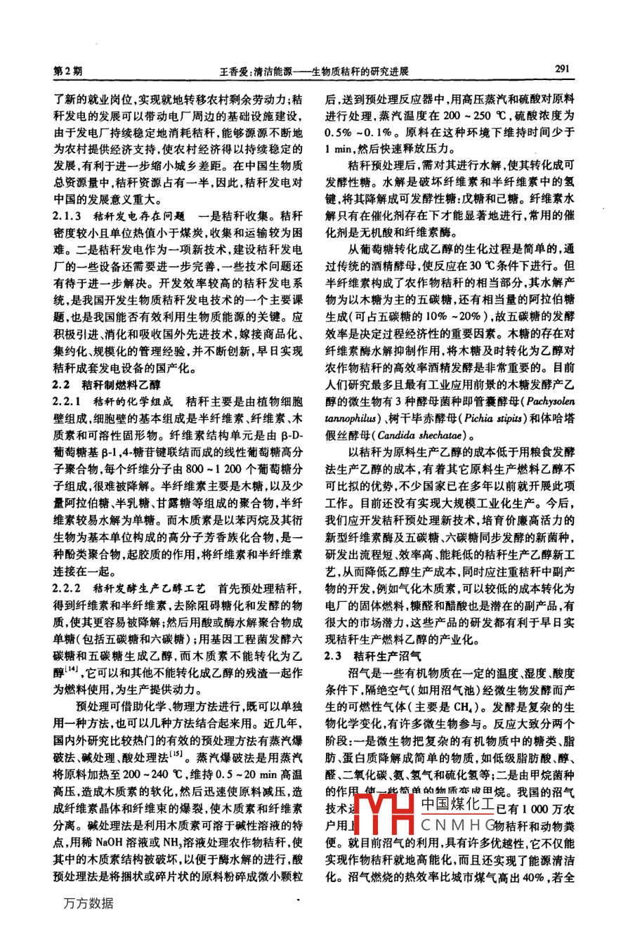 第38卷第2期vol 38 No. 22009年2月Applied Chemical IndustryFeb.2009清潔能源——生物質秸稈的研究進展王香愛(渭南師范學院化學化工系陜西渭南714000)摘要:介紹了研究清潔能源一生物質秸稈的必要性綜述了生物質秸稈的研究進展對秸稈發(fā)電制燃料乙醇生產沼氣、熱解氣法制可燃氣等作了詳細的論述,提出了秸桿作為21世紀最具開發(fā)價值的綠色可再生能源應加大其研究力度。關鍵詞:清潔能源;生物質秸稈;研究進展中圖分類號:TQ223文獻標識碼:A文章編號:1671-3206(2009)02-0289-04Progress in research of clean straw biomass energyWANG Xiang-aDepartment of Chemistry and Chemical Engineering, Weinan Teachers College, Weinan 714000, China)Abstract: The necessity of clean energy--biomass straw was introduced. The study progress of biomassstraw was reviewed. The applications of biomass straw in power generation, fuel ethanol, biogas production, combustible gas production by pyrolysis gas were discussed in details. As the most potential greenand renewable energy in the 2lst century, the study of biomass energy should be pay more attention.Key words: clean energy; biomass straw; study progress生物質秸稈是一種潔凈的可再生能源,它包括響高速公路、航空、污染空氣、引發(fā)火災。因為我們玉米稈、小麥稈、稻稈、油料作物秸稈、豆類作物秸沒有給秸稈找到很好出路焚燒秸稈每年依然都在稈雜糧作物秸稈、棉花稈等多種作物的莖稈。秸稈進行著如何持續(xù)高效利用秸稈是當前的一大現實是當今世界上僅次于煤炭、石油和天然氣的第4大問題。能源它的開發(fā)利用越來越受到人們的關注。我國1研究生物質秸稈的必要性作為農業(yè)大國,生物質資源十分豐富,每年農作物秸近年來,由于石化能源的緊張,嚴重影響和波及稈產量達7億多噸。但大部分秸稈直接在田間焚燒工業(yè)農業(yè)交通運輸以及人民生活等各個方面促帶來的大氣污染和消防安全問題危害極大甚至影使國民經濟整體運行成本的增加嚴重影響了經濟響交通和人民群眾的健康而且由于熱利用率低造的持續(xù)健康穩(wěn)定發(fā)展。用清潔可再生能源替代煤成了生物質能源的極大浪費秸稈焚燒已成為一大炭、石油調整能源結構,是中國近期的重要任務。公害。隨著農民生活水平的提高和能源利用方式的我國是個能源消耗大國能源消耗量僅次于美國但轉變秸稈等農業(yè)廢棄物帶來的環(huán)境問題越來越突中國又是一個能源短缺的國家。據調查2004年我出其能源利用已成為國內外眾多學者研究的焦國原油進口量高達12億t,而且隨著化工汽車點工業(yè)的發(fā)展,這個缺口將越來越大。眾所周知,石油據聯合國糧農組織統計全世界農作物秸稈中是一種化石燃料,是不可再生的,而農作物秸稈是有66%直接還田或作為生活能源而被燒掉了,19%可再生的,它是地球上最充足但卻又未得到充分利作為房屋建筑材料或蔬菜生產覆蓋材料等僅12%用的可再生資源之一,當它進入能源領域后,可發(fā)作為了家畜的飼料,另有3%左右作為手工藝的原展成為取之不竭的能源生產原料,明顯減輕燃料對料。我國約有70%的秸稈作為生活能源的燃燒料環(huán)境的污染減輕對進口石油的依賴,從而更加凸顯后還田,或就地焚燒還田,或直接翻入土壤層中還出農作物秸稈再生酒精的經濟利用價值。由于田僅有20%左右作為家畜的飼料另有2%作為紙目前研發(fā)的秸稈能源成本較高相當于原油的12槳材料及建筑材料和手工藝材料。秸稈焚燒影3.6倍中國煤化工低產品成本,提收稿日期:2008210CNMHG基金項目陜西省科技廳自然科學基金項目(2007B23);陜西省教育廳專項科研資助項目(07JK242)作者簡介:王香愛(1967-),女陜西渭南人渭南師范學院副教授從事精細化學品合成。電話:13186218019,E-milwnwxa@sina.com290應用化工第38卷高產率已成為利用秸稈轉化為可利用能源的關鍵稈最有效最潔凈的利用方式之一因素。開發(fā)清潔的可再生能源是解決能源危機減氣化發(fā)電工藝主要包括3個方面:一是生物質少環(huán)境污染,走可持續(xù)發(fā)展的必由之路。秸稈氣化在氣化爐中生物質秸稈轉化為氣體燃料;隨著農村經濟的發(fā)展,農民生活水平的提高秸二是氣體凈化氣化后的燃氣都含有一定的雜質包稈變成“廢物”的區(qū)域越來越擴大;從根本上解決秸括灰焦炭和焦油等需經過凈化系統把雜質除去稈綜合利用發(fā)展循環(huán)經濟已經是迫在眉睫的事情以保證燃氣發(fā)電設備的正常運行;三是燃氣發(fā)電利了。循環(huán)經濟是以資源的高效利用和循環(huán)利用為核用內燃機或燃氣輪機進行發(fā)電印。心,將物質流動方式由傳統的“資源一產品一廢物”2.1.1.2生物質秸稈煤共燃實施技術在燃煤電單向線型經濟轉變?yōu)椤百Y源一產品一再生資源”閉廠實施生物質秸稈煤共燃較為簡單僅僅涉及在已合循環(huán)模式。作為一種新的經濟發(fā)展戰(zhàn)略循環(huán)經有的燃料系統中進行生物質秸稈的摻混通常有下濟的思想理念是在對傳統單程消耗式經濟發(fā)展模式面2種方式:一是在給煤機上游與煤混合再一起深刻反思基礎上逐步形成和發(fā)展的。進入20世紀制粉后噴入爐膛燃燒;二是采用專門的粉碎裝置進下半葉,全球人口激增,經濟飛速發(fā)展對自然資源行生物質秸稈的切割和粉碎然后在燃燒器上游混的消耗速度明顯加快,同時,環(huán)境污染和生態(tài)破壞等煤粉氣流中,或通過專