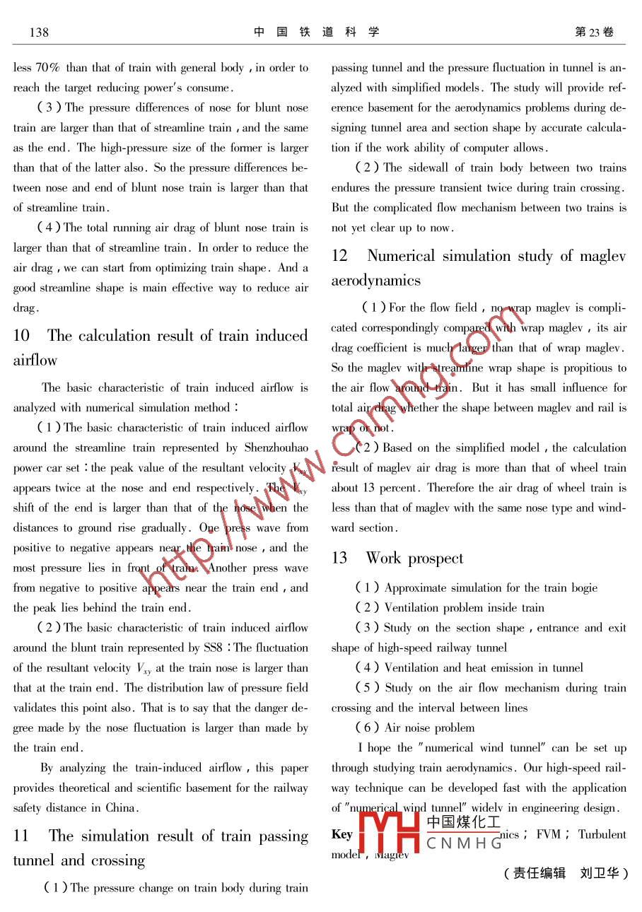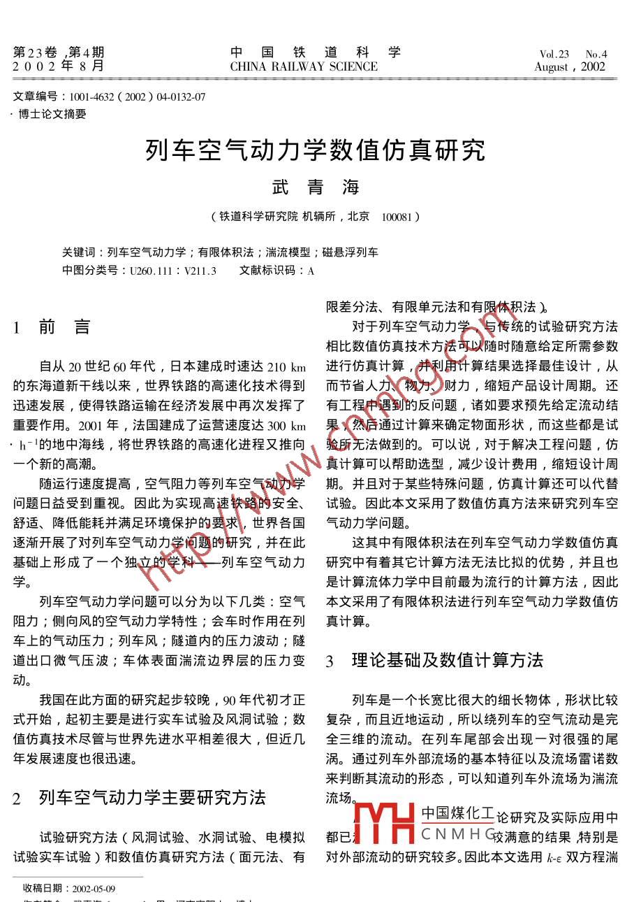 第23卷,第4期中國(guó)鐵道科學(xué)2002年8月CHINA RAILWAY SCIENCEAugust, 2002文章編號(hào):1001-4632(2002)04013207博士論文摘要列車(chē)空氣動(dòng)力學(xué)數(shù)值仿真研究武青海鐵道科學(xué)研究院機(jī)輛所,北京100081)關(guān)鍵詞:列車(chē)空氣動(dòng)力學(xué);有限體積法;湍流模型;磁懸浮列車(chē)中圖分類(lèi)號(hào):U260.111:V211.3文獻(xiàn)標(biāo)識(shí)碼:A限差分法、有限單元法和有限體積法)1前言對(duì)于列車(chē)空氣動(dòng)力學(xué),與傳統(tǒng)的試驗(yàn)研究方法相比數(shù)值仿真技術(shù)方法可以隨時(shí)隨意給定所需參數(shù)自從20世紀(jì)60年代,日本建成時(shí)速達(dá)210km進(jìn)行仿真計(jì)算,并利用計(jì)算結(jié)果選擇最佳設(shè)計(jì),從的東海道新干線以來(lái),世界鐵路的高速化技術(shù)得到而節(jié)省人力、物力、財(cái)力,縮短產(chǎn)品設(shè)計(jì)周期。還迅速發(fā)展,使得鐵路運(yùn)輸在經(jīng)濟(jì)發(fā)展中再次發(fā)揮了有工程中遇到的反問(wèn)題,諸如要求預(yù)先給定流動(dòng)結(jié)重要作用。2001年,法國(guó)建成了運(yùn)營(yíng)速度達(dá)300km果,然后通過(guò)計(jì)算來(lái)確定物面形狀,而這些都是試h-的地中海線,將世界鐵路的高速化進(jìn)程又推向驗(yàn)所無(wú)法做到的。可以說(shuō),對(duì)于解決工程問(wèn)題,仿個(gè)新的高潮。真計(jì)算可以幫助選型,減少設(shè)計(jì)費(fèi)用,縮短設(shè)計(jì)周隨運(yùn)行速度提高,空氣阻力等列車(chē)空氣動(dòng)力學(xué)期。并且對(duì)于某些特殊問(wèn)題,仿真計(jì)算還可以代替問(wèn)題日益受到重視。因此為實(shí)現(xiàn)高速鐵路的安全、試驗(yàn)。因此本文采用了數(shù)值仿真方法來(lái)研究列車(chē)空舒適、降低能耗并滿足環(huán)境保護(hù)的要求,世界各國(guó)氣動(dòng)力學(xué)問(wèn)題。逐漸開(kāi)展了對(duì)列車(chē)空氣動(dòng)力學(xué)問(wèn)題的研究,并在此這其中有限體積法在列車(chē)空氣動(dòng)力學(xué)數(shù)值仿真基礎(chǔ)上形成了一個(gè)獨(dú)立的學(xué)科——列車(chē)空氣動(dòng)力研究中有著其它計(jì)算方法無(wú)法比擬的優(yōu)勢(shì),并且也學(xué)是計(jì)算流體力學(xué)中目前最為流行的計(jì)算方法,因此列車(chē)空氣動(dòng)力學(xué)問(wèn)題可以分為以下幾類(lèi):空氣本文采用了有限體積法進(jìn)行列車(chē)空氣動(dòng)力學(xué)數(shù)值仿阻力;側(cè)向風(fēng)的空氣動(dòng)力學(xué)特性;會(huì)車(chē)時(shí)作用在列真計(jì)算。車(chē)上的氣動(dòng)壓力;列車(chē)風(fēng);隧道內(nèi)的壓力波動(dòng);隧道出口微氣壓波;車(chē)體表面湍流邊界層的壓力變3理論基礎(chǔ)及數(shù)值計(jì)算方法動(dòng)我國(guó)在此方面的研究起步較晚,90年代初才正列車(chē)是一個(gè)長(zhǎng)寬比很大的細(xì)長(zhǎng)物體,形狀比較式開(kāi)始,起初主要是進(jìn)行實(shí)車(chē)試驗(yàn)及風(fēng)洞試驗(yàn);數(shù)復(fù)雜,而且近地運(yùn)動(dòng),所以繞列車(chē)的空氣流動(dòng)是完值仿真技術(shù)盡管與世界先進(jìn)水平相差很大,但近幾全三維的流動(dòng)。在列車(chē)尾部會(huì)出現(xiàn)一對(duì)很強(qiáng)的尾年發(fā)展速度也很迅速渦。通過(guò)列車(chē)外部流場(chǎng)的基本特征以及流場(chǎng)雷諾數(shù)來(lái)判斷其流動(dòng)的形態(tài),可以知道列車(chē)外流場(chǎng)為湍流2列車(chē)空氣動(dòng)力學(xué)主要研究方法流場(chǎng)I凵中國(guó)煤化工論研究及實(shí)際應(yīng)用中試驗(yàn)研究方法(風(fēng)洞試驗(yàn)、水洞試驗(yàn)、電模擬都已CNMHG校滿意的結(jié)果特別是試驗(yàn)實(shí)車(chē)試驗(yàn))和數(shù)值仿真研究方法(面元法、有對(duì)外部流動(dòng)的研究較多。因此本文選用kε雙方程湍收稿日期:200205作者簡(jiǎn)介方據(jù)"3-),男,河南安陽(yáng)人,博士第4期博士論文摘要133流模型來(lái)研究列車(chē)空氣動(dòng)力學(xué)問(wèn)題?!鱵23G,△xYH2k-ε雙方程湍流模型的求解方程組由以下基本Re△y2ayRe1△z方程組成連續(xù)方程變換后得到最終形式dU dF dg dHdFdG雷諾方程H△d2+(△xm△ym△zm…)0+pax,=p、少當(dāng)a3,y分別取值小于或遠(yuǎn)小于m時(shí)所采用的網(wǎng)格和差分格式才能比較正確地計(jì)入各方向的粘性貢獻(xiàn)。因此在α3,γ分別取值m時(shí)就可以得到dx: a湍動(dòng)能k方程臨界網(wǎng)格間距值Δx*、Δy*、△z*。Ig hIgErak, duiau'. dg△z=gRe湍流耗散率ε方程5計(jì)算域的選取2u dump在仿真計(jì)算中,一般采取有限計(jì)算域來(lái)代替無(wú)2限計(jì)算域,計(jì)算域的大小直接影響到計(jì)算結(jié)果的可dx dx: d信程度。但是對(duì)于不同類(lèi)型計(jì)算對(duì)象,其計(jì)算域的ut;/u’;du’;du大小不能一概而論,所以需要具體問(wèn)題具體對(duì)待。ax. ax adx: d本論文中的計(jì)算域的選取采取了試算分析的方法確au';o’oua-u'定。在對(duì)于計(jì)算域的選取中,試算方法不失為一種有效的方法數(shù)值計(jì)算方法采用有限體積法中常用的SIPE( Semi-Implicit Method for Pressure-Linked Equa6移動(dòng)網(wǎng)格技術(shù)ions)求解離散方程組。在列車(chē)交會(huì)和過(guò)隧道的瞬態(tài)計(jì)算中,存在計(jì)算4貼體網(wǎng)格間距的確定對(duì)象之間的相對(duì)運(yùn)
