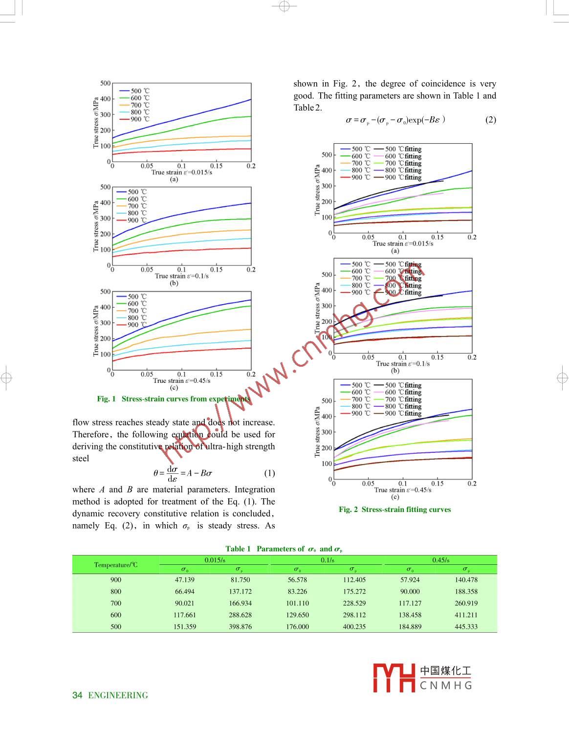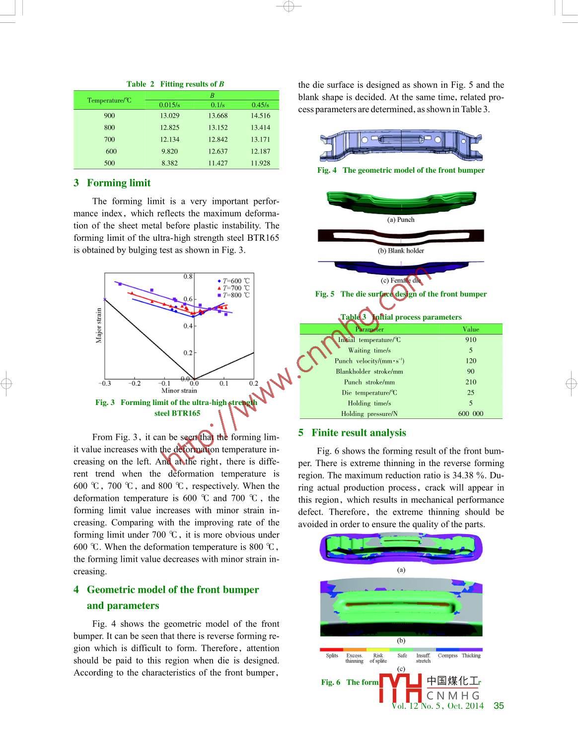 -0-Study of front bumper process on thebasis of hot stampingWang Xiaona,Xiong Fei, Jin Jianwei(Geely Automobile Research Institute, Hangzhou 311228, China)Abstract: The ftting method is used for obtaining the constitutive relation of ultra-high strength steel in this pa-per. At the same time, the forming limit of material is researched under different deformation conditions.Through experiments, the paper obtains stress- strain curve under different deformation temperatures and strainrates. On the basis of experimental data, the constitutive relation model is established which can reflect the de-formation capacity of ultra- high strength steel during process of hot stamping. Combining with finite elementsimulation results of hot stamping by the commercial software AUTOFORM, transfer path of load and match-ing law of strength, the paper determines the design criteria and forming process requirements of parts manufac-tured by hot stamping. Through stting diferent process parameters, such as punch velocity and friction coffi-cient, and blank shape, the paper finds that process parameters and blank shape have an essential effect on thequality of parts.Key words: ultra-high strength steel; hot stamping; constitutive relation; forming limitand decreases with deformation temperature increa-1 Introductionsing.To make light- weighted automobile, it is veryFrom the above analysis, it can be concludednecessary that the ultra-high strength steel parts manu-that there is an enormous influence of deformationfactured by hot stamping are applied, which offers conditions on the behavior of ultra- high strength steel.the possibility to reduce the weight of automobiles For exact analysis of the front bumper process by us-and maintain the safety requirement ". In order toing finite element method, the constitutive relationshould be deduced. During metal thermal deforma-structure of parts reasonably, which is related with tion, there are two kinds of stress- strain curves, i.e.,reasonable matching of strength. The objective of pa-dynamic recovery and dynamic recrystallization. Atper is to guide the design of parts manufactured bythe high temperature deformation stage of the ultra-hot stamping and find forming technical requirements high strength steel, dynamic recovery could be con-while taking the vehicle performance into account 12sidered as the competition between hardening mecha-nism and softening mechanism, namely the competi-2 Constitutive relationtion between dislocation accumulation and dynamicThe ultra- high strength steel BTR165 is applied recovery, which can be shown as working hardeningfor the front bumper. Through experiments, the stress-rate 0. The working hardening rate decreases linearlystrain curves are obtained, which are shown in Fig. 1.with stress increasing. When the value of workingThe flow stress increases with strain rate increasing hardening rate is close to 0,it is concluded that theReceived 10 August 2014; accepted 25 August 2014CThe Author(s) 2014. This article is published with open access at engineering.cae.cndoi: 1.1532/-ENG1-2014020中國(guó)煤化工YHCNMHGVol. 12No.5, Oct.2014 33-φ--0-500一500Cshown in Fig. 2, the degree of ccoincidence is very。400-600 Cgood. The fitting parameters are shown in Table 1 and-700CTable 2.6 300二800號(hào)σ=σ, -(σ, - σ,)exp(-Bε )(2)品200E 10000一500C 二500 Cfting ._ 700C二.700ChttingTrue strainε= 0.015/s*150.400一800C 一800 Citig(a)500 C; 300600 Cg 4006300- - 900 c.0.05_ 0.1 0.150.2占100True srain ε=0.015/s()0.05 Trmest 0.100-- 600C一600 C fting一700 C一700 C fttingt400二900二900ttm-200C起400-二 700 C300-300f-800員2000目1000.05 0.10.15True strainε=0.1/s0.05_ 0o.iTrue strain ε-0.45/s00 C- 500 C ftingig. 1 Stress strain curves from experiments500---700 C- 700 C fttingooL _ - 900C - 900 Cfitting40flow stress reaches steady state and does not increase.Therefore, the following equation could be used forderiving the constitutive relation of ultra- high strengthsteel100 Fθ= C=A- Bσ(1)0.0.5. 0.Tue sraine 0.45/*method is adopted for treatment of the Eq. (1). TheFig. 2 Stress strain ftting curvesdynamic recovery constitutive relation is concluded,namely Eq. (2), in which σp is steady stress. AsTable 1 Parametersof σ。and σp0.015/s0.1/s0.45/sTemperature/Cσ90047.13981.75056.578112.40557.924140.47866.494137.17283.226175.27290.000188.35870090.021166.934101.110228.529117.127260.919117.661288.628129.650298.112138.458411.211151359398.876176.000400.235184.889445.333中國(guó)煤化工MHCNMH G .34 ENGINEERING-φ--0-Table 2 Fitting results of BTemperature/Cblank shape is decided. At the same time, related pro-0.015/s0.1/s0.45/scess parameters are determined, as shown in Table 3.13.02913.66814.5160012.82513.15213.41412. 13412.84213.1716009.82012.63712.1878.38211.427Fig. 4 The geometric model of the front bumper3 Forming limitThe forming limit is a very important perfor-mance index, which reflects the maximum deforma-(a) Punchtion of the sheet metal before plastic instability. Theforming limit of the ultra- high strength steel BTR165is obtained by bulging test as shown in Fig. 3.(b) Blank holder0.(2) Female dieA T-7000■7-800CFig. 5 The die surface design of the front bumper*昏復(fù)Table 3 Initial process parameters0.4-ParameterValueInitial temperature/C9100.2-W aiting time/sPunch velocity(mm.s")120Blankholder stroke/mm0b.1 0.90.00.TPunch stroke/mmMinor strainDie temperaturerCrig. 3 Forming limit of the ultra-high strengthHolding time/ssteel BTR165Holding pressure/N00 000From Fig. 3, it can be seen that the forming lim-5 Finite result analysisit value increases with the deformation temperature in-Fig. 6 shows the forming result of the front bum-creasing on the left. And at the right, there is diffe-per. There is extreme thinning in the reverse formingrent trend when the deformation temperature isregion. The maximum reduction ratio is 34.38 %. Du-600 C, 700 C, and 800 C, respectively. When the ring actual production proce