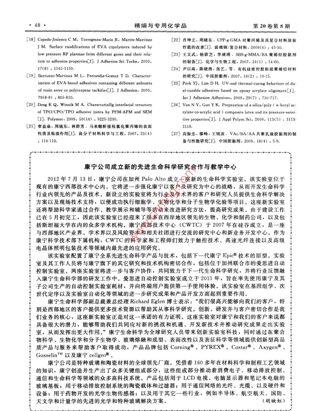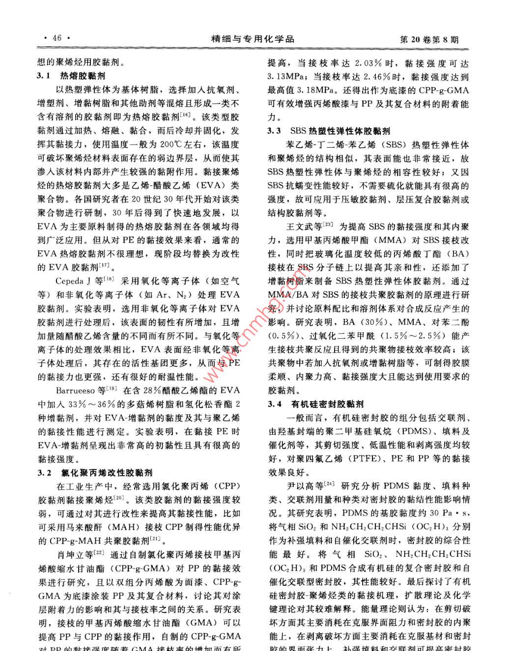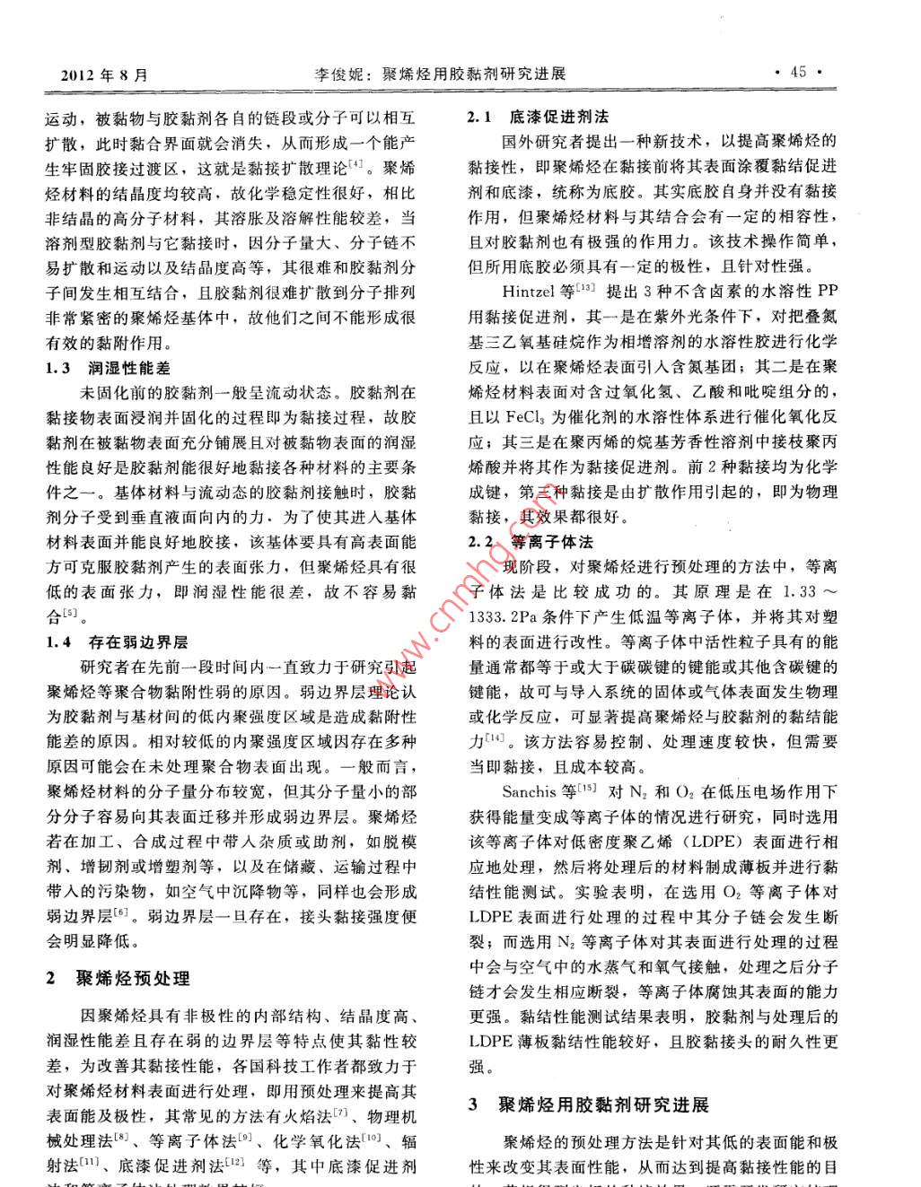 Aug. 2012精細與專用化學品第20卷第8期44●Fine and Specialty Chemicals2012年8月聚烯烴用膠黏劑研究進展李俊妮(中北大學化工與環(huán)境學院,山西太原030051)摘要:聚烯烴在合成材料及通用高分子材料中占有重要地位。本文分析了聚烯烴黏性差的原因,在此基礎(chǔ)上,對聚烯烴材料的預(yù)處理方法以及各種聚烯經(jīng)用膠黏劑的最新研究進展進行綜述,并對它的發(fā)展方向進行r展望。關(guān)鍵詞:聚烯烴;膠黏劑;研究進展The Research progress of adhesive for polyolefinLI Jun-ni(College of Chemical and Environmental, North University of China, Taiyuan 030051. China)Abstract: Polyolefin has been had an important position in synthetic materials and general polymer materi-als. The reasons why polyolefin is difficult to be bonded were introduced, and based on this, the pretreatmentmethods of polyolefin materials and the latest research development of all kinds of adhesive for polyolefin at homeand abroad are summarized. At the same time, the trend and prospect of polyolefin are put forward in this paper.Key words: polyolefin; adhesive; research progress聚烯烴在合成材料及通用高分子材料中占有重物質(zhì)內(nèi)部的分子間作用力可使膠黏劑吸附在被要地位,其材料主要為聚丙烯(PP) 和聚乙烯黏物質(zhì)表面,其作用力包括誘導(dǎo)力、取向力和色散(PE)。因聚烯烴類薄膜具有良好的化學穩(wěn)定性、力。在非極性與極性分子間,因極性分子偶極產(chǎn)生耐熱性、加工性、機械強度高等優(yōu)點,且成本低電場,這會影響非極性分子,從而導(dǎo)致非極性分子廉,可重復(fù)使用,這為現(xiàn)代化農(nóng)業(yè)提供了必要的灌產(chǎn)生偶極,即誘導(dǎo)偶極,分子的固有偶極和誘導(dǎo)偶溉、農(nóng)膜用材料,同時也為建筑業(yè)的發(fā)展提供了高極彼此吸引會產(chǎn)生相互作用力,即為誘導(dǎo)力。在極性能的基礎(chǔ)材料[,聚烯烴類片材及其各種制品在性與極性分子間,當他們彼此相互靠近時,分子固電子工業(yè)、汽車工業(yè)和包裝工業(yè)等領(lǐng)域均有廣泛應(yīng)有偶極之間會異極相吸、同極相斥,分子則在空間用。聚烯烴材料的物化性能良好,但在其應(yīng)用過程內(nèi)按一定取向進行排列,該體系會處于更穩(wěn)定的狀中不容易與其他材料進行熱黏合或連接等,從而導(dǎo)態(tài),固有偶極間的這種作用力就是取向力。因分子致它的應(yīng)用領(lǐng)域受到了一定的限制[2]。因此,各國中原子核和電子會不間斷地運動,非極性分子中的研究者對聚烯烴材料采用預(yù)處理方法以改善其黏接電子云會呈現(xiàn)動態(tài)地分布,使得它與原子核間會出性能,使其應(yīng)用更為廣泛。本文先從聚烯烴黏性差現(xiàn)瞬時的相對位移,從而產(chǎn)生瞬時偶極,這可導(dǎo)致的原因進行分析,再對聚烯烴材料的預(yù)處理方法及其相鄰非極性分子產(chǎn)生瞬時的誘導(dǎo)偶極,這種可以其所用膠黏劑的最新研究進展進行綜述,最后對它隨時產(chǎn)生分子瞬時的誘導(dǎo)偶極間作用力即為色散的發(fā)展方向進行了展望。極性與極性分子間均可形成誘導(dǎo)力和取向力,1聚烯烴黏性差的原因但對于像PP和PE等內(nèi)部結(jié)構(gòu)都是非極性的高分聚烯烴材料黏性差的原因有很多,既有外界條子材料而言,其表面只可形成較弱的色散力,不能件的原因,也有自身結(jié)構(gòu)方面的原因,總而言之,形成誘導(dǎo)力和取向力,故其黏附性能很差[]。1.2結(jié)晶度高可歸納為以下4個方面。高分子材料在黏接時,因鏈段或分子會產(chǎn)生熱1.1非極性的內(nèi)部結(jié)構(gòu)收稿日期: 2012-03-10作者簡介:李俊妮(1987-), 女,主要從事化學工程研究工作。2012年8月李俊妮:聚烯烴用膠黏劑研究進展運動,被黏物與膠黏劑各自的鏈段或分子可以相互2.1底漆促進劑法擴散,此時黏合界面就會消失,從而形成一個能產(chǎn)國外研究者提出一種新技術(shù),以提高聚烯烴的生牢固膠接過渡區(qū),這就是黏接擴散理論[]。聚烯黏接性,即聚烯烴在黏接前將其表面涂覆黏結(jié)促進烴材料的結(jié)晶度均較高,故化學穩(wěn)定性很好,相比劑和底漆,統(tǒng)稱為底膠。其實底膠自身并沒有黏接非結(jié)晶的高分子材料,其溶脹及溶解性能較差,當作用,但聚烯烴材料與其結(jié)合會有一定的相容性,溶劑型膠黏劑與它黏接時,因分子量大、分子鏈不且對膠黏劑也有極強的作用力。該技術(shù)操作簡單,易擴散和運動以及結(jié)晶度高等,其很難和膠黏劑分但所用底膠必須具有一定的極性,且針對性強。子間發(fā)生相互結(jié)合,且膠黏劑很難擴散到分子排列Hintzel等[13]提出3種不含鹵素的水溶性PP非常緊密的聚烯烴基體中,故他們之間不能形成很用黏接促進劑,其一是在紫外光條件下,對把疊氮有效的黏附作用?;已趸柰樽鳛橄嘣鋈軇┑乃苄阅z進行化學1.3 潤濕性能差反應(yīng),以在聚烯烴表面引人含氮基團;其二是在聚未固化前的膠黏劑一般呈流動狀態(tài)。膠黏劑在烯烴材料表面對含過氧化氫、乙酸和吡啶組分的,黏接物表面浸潤并固化的過程即為黏接過程,故膠且以FeCl3為催化劑的水溶性體系進行催化氧化反黏劑在被黏物表面充分鋪展且對被黏物表面的潤濕應(yīng);其三是在聚丙烯的烷基芳香性溶劑中接枝聚丙性能良好是膠黏劑能很好地黏接各種材料的主要條烯酸并將其作為黏接促進劑。前2種黏接均為化學件之一?;w材料與流動態(tà