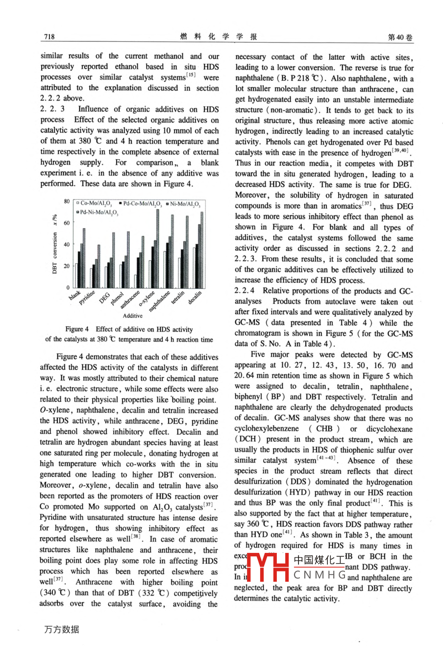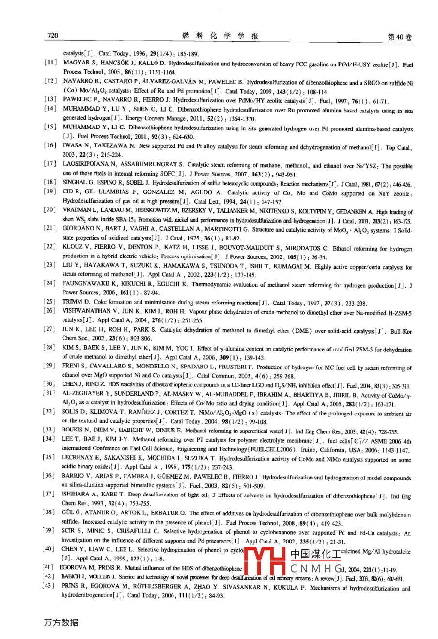 第40卷第6期燃料化學(xué)學(xué)報(bào)Vol. 40 No.62012年6月Journal of Fuel Chemistry and TechnologyJun. 2012文章編號(hào): 0253-2409(2012 )06-071407Simultaneous operation of dibenzothiophene hydrodesulfurization andmethanol reforming reactions over Pd promoted alumina based catalystsMuhammad Yaseen',2 , Muhammad Shakirullah'Imtiaz Ahmad',Ata Ur Rahman',F(xiàn)aiz Ur Rahman' , Muhammad Usman2,Rauf Raxzaq2(1. Institute of Chemical Sciences, Unirersity of Peshanar, Khrbrpukhtunkhua, Pakistan; 2. State Key Laboralory of MuliphaseComplex Systenzs, Institule of Process Enginering, Chinese Academy of Sciences , Bejing 100190, China)Abstract: In the current study simultaneous reactions of hydrdesufurization (HDS) of dibenzothiophene (DBT) and reforming ofmethanol in a micro-autoclave reactor were studied over bi- metlic ( Co-Mo/Al2O, and Ni Mo/Al203) and tri-metallic ( Pd-Co-Mo/AL2O, and Pd-Ni-Mo/Al2O, ) catalyst systems which were prepared by incipient impregnation method. In situ bydrogenuilization and low Pd loadings were the major targets of this study. For comparison purpose, calytic activity was separatelydetermined for both the methanol reforming and HDS of DBT reactions as well. Ni based catalysts were confirmned with betteractivity than Co ones for both the reactions with Pd promoted ones ranking at the top i. e. Pd-Ni-Mo/ Al2O2> Ni-Mo/Al2Oz> Pd-Co-Mo/ Al20,> Co-Mo/ Al2O, where Pd-Ni-Mo/ Al2O, showed 91% DBT conversion at 380 C and 12 h reaction time. Some of theselected organic addtives on cataytic activity were tested for their efect toward HDS reaction which was unique with close relationto their chemical nature. Reaction products were quantitatively and qualitatively analyzed via HPLC and GC-MS techniquesrespectively which helped in elucidating reaction mechanism.Key words: in situ hydrodesulfurization of DBT; methanol reforming; Pd promoted alumina based catalyst; organic additiveCLC number: 0643Document code: AOne of the serious problems associated with theof our previous work with remarkable increase in theuse of fuel oils at an alarming rate is their damage tocatalytic activity (97% DBT conversion )15,Thesethe environment,especially by sulfur (S) and its .successive improvements in HDS activity werederivatives. For the control of these issues ,attributed to the enhanced reforming properties of Pdenvironmental regulations are becoming stringentthan RuC16] indicating the strong dependence of thewhich has led to the creation of new and advancedcurrent in situ hydrogenation process on reformingdesulfurization techniques over the past fewreaction. Based on this assumption, we furtheryears'121. Among these, oxidative desulfurization,investigated the reforming portion of the currentbiodesulfurization and catalytic hydrodesulfurizationprocess by analyzing some other in situ hydrogen(HDS) are few to namel1,3-6]. HDS has been theproduction sources. For example , it is considered thatmost effective one atributed to its flexible naturemethanol reforms more easily than ethanol[7] for theleading to many advancements in catalyst chemistryproduction of pure hydrogen on industrial scale andand process variables'. This process mostly utilizesthus can produce better results in the current in situCo or Ni promoted Mo based Al203 supprtedHDS process. Therefore, in the current phase of thecatalysts while enhancing effect by noble metals likeproject, ethanol reforming was replaced by methanolPt, Pd or Ru has also been repored3.8,9], amongreforming reaction over similar catalyst systemswhich Ru and Pd are considered better promoters ofreported earlier 5. Moreover, some organicthe conventional HDS catalystsi10-131.additives were used in fixed amounts to check theirRecently we for the first time reported the HDSeffect on catalytic activity. Activity in terms of bothof DBT over Ru and Pd promoted Al2O3 basedHDS and methanol reforming reactions was separatelycatalysts through a novel mechanism of in situdetermined. Ni was more active metal than Co in allhydrogen utilization generated via ethanol reformingcases. Reactions products were analyzed by GC-MSreaction' I4.15. . Incorporating Ru in to the conventionaltechnique while fresh and spent catalysts were(Co or Ni)-Mo type catalysts was very interestingcharacterized for BET surface properties. The presentand fruitful results (75% DBT) were reported via ourin situ bhydrogenation mechanism based study can benovel process"s . To further evaluate and analyze theapplied as an altemative approach toward HDS ofprocess, we targeted the in situ hydrogen productionDBT中國(guó)煤化工to its simple andreaction by replacing Ru with Pd in the second phaseCOSTYHCNMHGReceived date: 2011-12 20; Received in revised form: 201204-28.Foundation items: Fundamnental Rescarch Foundation of Sinopee (X505015)。Corresponding author: Muhanmad Yaseen, Tel: +92-91 921652, Fax: +92-91-9216652, E-mail: myousafzi@e gmail. com,本文的英文電子版由Elsevier出版社在SciecDirct上出版(ttp://w. siencedirect. con/siec/jouma/18725813)。第6期.Muharmmad Yaseen et al: Sirultancous operation of dibenzothiophene hydrodesufurization and .....7151 Experimentalis present in bulk amount compared to the negligible1.1 Chemical reagents Chemical reagents usedamount of in situ produced hydrogen (0.35 mol atin the current work were of analytical grade and weremost) via methanol reforming, resulting in anused without further purification. DBT was suppliedundetectable and negligible pressure gradient by theby ACROS Organics, New Jersey, USA. Al,O,,later. Moreover, the in situ type operation withphenol, naphhalene ,tetrahydronaphthalene ( THN )paralel production and consumption of hydrogeni. e. tetralin and anthracene were purchased fromminimizes the factor of fractional hydrogen pressure ,Tian jin Guang-fu fine Chemical Institute, China. nunlike conventional ex situ HDS process whichOctane was purchased from Tianjin Kermel Chemnicaldemands for high hydrogen pressure for i