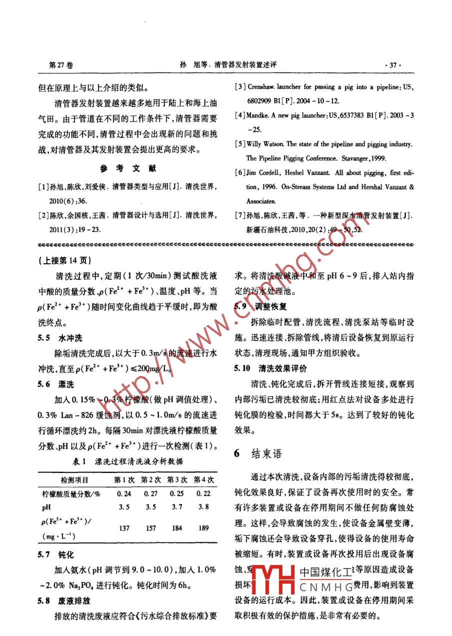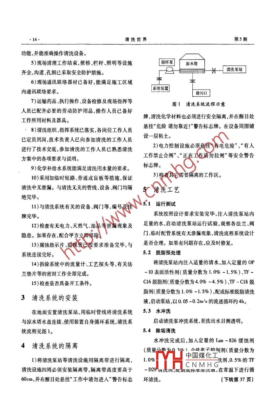 實(shí)用拔術(shù)清洗世界第27卷第5期Cleaning World2011年5月文章編號:1671 - 8909(2011)05 -0013 -03丙烷壓縮裝置循環(huán)水系統(tǒng)清洗王加剛(山東泰豐清洗科技有限公司,山東東營257073)摘要:選擇和設(shè)計(jì)了一種 復(fù)配清洗劑和清洗工藝。將復(fù)配的清洗劑和相應(yīng)的復(fù)合緩蝕劑應(yīng)用于該設(shè)備的清洗,取得了很好的效果。關(guān)鍵詞:丙烷壓縮裝置;清洗;鈍化預(yù)膜中圖分類號:TH45;TB490文獻(xiàn)標(biāo)識碼:BCleaning for circulating water system of propane compression deviceWANG Jiagang( Shandong Taifeng Cleaning Technology Co., Ltd, Dongying, Shandong 257073 ,China)Abstract : The cleaning agent, corrosion inhibitor and technical process were selectived and de-signed. Cood efctiveness was obtained in application to the equipmentKey words: propane compression devices ;cleaning; passivation membrane中石油冀中油田集輸公司老爺廟聯(lián)合站丙烷壓冷卻系統(tǒng)裝置共有輕質(zhì)油冷卻器4臺,丙烷壓縮裝置經(jīng)過長時間的運(yùn)行循環(huán)水系統(tǒng)出現(xiàn)結(jié)垢,并縮機(jī)油冷卻器1 臺,丙烷冷卻器1臺。存在腐蝕的現(xiàn)象。根據(jù)生產(chǎn)要求,裝置需要停用較長時間,為了保障裝置在停用期間不發(fā)生腐蝕破壞,2清洗前的準(zhǔn)備工作保證設(shè)備再次投人使用的安全可靠性,決定對其進(jìn)1)清洗所用化學(xué)藥品已按方案中要求備齊并經(jīng)行清洗、鈍化預(yù)膜。接到甲方任務(wù)后,山東秦豐清洗化驗(yàn)確認(rèn), 施工前對藥液濃度及其他技術(shù)指標(biāo)進(jìn)行科技有限公司派技術(shù)人員到站內(nèi)勘查現(xiàn)場情況,包復(fù)檢,對緩蝕劑的防金屬腐蝕性能進(jìn)行測定,達(dá)到了括:甲方對清洗質(zhì)量要求;清洗用水源、電源位置;清要求。洗廢液處理要求;裝置所涉及的設(shè)備情況、管線情況2)將全部清洗設(shè)備、材料、化驗(yàn)儀器、分析儀器、等。根據(jù)現(xiàn)場了解的情況制定了清洗施工方案。設(shè)施、物品等移入施工現(xiàn)場。3)清洗中分析所需化驗(yàn)儀器、藥品、記錄表格等1循環(huán)水裝置概況準(zhǔn)備就緒,化驗(yàn)員經(jīng)考核合格,現(xiàn)場化驗(yàn)設(shè)施具備使清洗泵到換熱設(shè)備的進(jìn)、回水管線埋于地下,管用條件。徑273mm,長度1km,材質(zhì)為碳鋼。中國煤化i訓(xùn)熟悉清洗系統(tǒng)FYHCNMHG收稿日期:2010-12 -02作者簡介:王加剛(1977-),男,山東廣饒縣人,工程師,主要從事工業(yè)設(shè)備的清洗及新技術(shù)、新工藝的研究?!?4.清洗世界第5期功能,并能準(zhǔn)確操作清洗設(shè)備。5)現(xiàn)場清理工作結(jié)束,便橋、欄桿、照明等設(shè)施| 循環(huán)泵涼水塔.齊全,溝道、孔洞已采取安全防護(hù)措施。當(dāng)W-C清洗泵站6)現(xiàn)場通訊聯(lián)絡(luò)器材已備好,能滿足施工區(qū)域本|系統(tǒng)裝置內(nèi)通訊聯(lián)絡(luò)要求。排污口7)運(yùn)輸藥品、執(zhí)行操作、設(shè)備檢修及現(xiàn)場指揮等圖1清洗系 統(tǒng)流程示意人員已配齊必要的勞動防護(hù)用品,操作人員已備好.牌,清洗化學(xué)材料也必須進(jìn)行安全隔離,并在醒目處工作所用材料及器具。.8)清洗組織 、指揮系統(tǒng)已落實(shí),各崗位工作人員懸掛“危險請勿靠近!”警告標(biāo)志牌。在設(shè)備周圍鋪已定員到崗,技術(shù)負(fù)責(zé)人已向參加清洗的工作人員設(shè)一層粘土。進(jìn)行了技術(shù)交底,參加清洗的工作人員已熟悉清洗2)電力控制設(shè)施必須懸掛“有電危險”、“有人工作禁止合閘”、“正在工作請勿拉閘”等安全警告方案中的各項(xiàng)要求與說明。9)化學(xué)補(bǔ)給水系統(tǒng)能滿足清洗用水量的要求。標(biāo)志牌。10)采用加臨時短路、旁通或盲板等措施,保證3)檢查其它需要隔離的工作區(qū)。清洗中無泄漏。與清洗無關(guān)的管線、設(shè)備、閥門均隔5清洗工藝絕完畢。11)與清洗系統(tǒng)有關(guān)的設(shè)備、閥門等,編號及掛.5.1運(yùn)行測試 .系統(tǒng)按照設(shè)計(jì)要求安裝完畢,注入清洗泵站內(nèi)牌完畢。12)檢查有無電力、天然氣、油品等泄漏現(xiàn)象及足量的水,啟動清洗泵站運(yùn)行試驗(yàn),觀察各法蘭閥隱患。如果存在,配合甲方立即排除。門、臨時配管系統(tǒng)有無滲漏現(xiàn)象,清洗流程系統(tǒng)設(shè)計(jì)13)腐蝕指示片、監(jiān)視管已按要求準(zhǔn)備完畢,與是否合理。如果有問題存在,應(yīng)及時修復(fù)。系統(tǒng)連接完好。5.2脫脂預(yù)處理14)拆除系統(tǒng)中的流量計(jì)、工藝探頭等,有關(guān)法將清洗泵站內(nèi)注人適量的清水,加入定量的OP蘭墊片等的密封工作全部完成。- 10表面活性劑(質(zhì)量分?jǐn)?shù)為1.0% ~1.5%).TF -15)檢查是否具備開工條件。C16脫脂劑(質(zhì)量分?jǐn)?shù)為4.0% ~4.5%)、TF -C18脫脂劑(質(zhì)量分?jǐn)?shù)為1. 0% ~1. 5% ) ,配成標(biāo)準(zhǔn)脫脂清洗3清洗系統(tǒng)的安裝液,啟動泵站,以0.05 ~0. 2m/s的流速循環(huán)約4h。在地面安置清洗泵站,用臨時管線將清洗系統(tǒng)5.3水沖洗與涼水塔水盤連接、使用裝置自身循環(huán)系統(tǒng),清洗系啟動清洗泵沖洗系統(tǒng),至洗出水目測透明。統(tǒng)流程見圖1。5.4除垢清洗水沖洗完成后,加人定量的Lan-826緩蝕劑4清洗系統(tǒng)的隔離(質(zhì)量分為為0 3% ).會斜離子扣制劑(質(zhì)量分?j