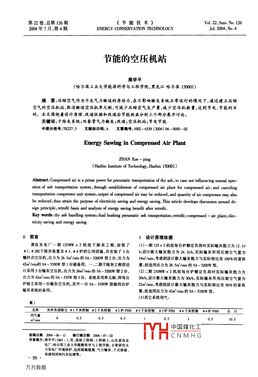 第22卷,總第126期節(jié)能技術(shù)》Vol 22. Sum. No 126004年7月,第4期ENERGY CONSERVATION TECHNOLOGYJu2004,No.4節(jié)能的空壓機(jī)站展學(xué)平(哈爾濱工業(yè)大學(xué)能源科學(xué)與工程學(xué)院,黑龍江哈爾濱150001)摘要:壓縮空氣作為干灰氣力輸送的原動(dòng)力,在不影響輸灰系統(tǒng)正常運(yùn)行的情況下,通過建立壓縮空氣的空壓機(jī)站,取消輸送空壓機(jī)單元制,可減少壓縮空氣生產(chǎn)量,減少空壓機(jī)數(shù)量,達(dá)到節(jié)電、節(jié)能的目的。本文圍繞著設(shè)計(jì)原理、改造依據(jù)和改造后節(jié)能效益分析三個(gè)部分展開討論。關(guān)鍵詞:千除灰系統(tǒng);雙套管氣力輸灰;改造;空壓機(jī)站;節(jié)電節(jié)能中圖分類號(hào):1K2273文獻(xiàn)標(biāo)識(shí)碼:A文章編號(hào):1002-6339(2004)04-00-02Energy Sawing in Compressed Air PlantZHAN Xue- pingHarbin Institute of Technology, Harbin 150001)Abstract: Compressed air is a prime power for pneumatic transportation of dry ash, in case not influencing normal oper-ation of ash transportation system, through establishment of compressed air plant for compressed air, and cancelingon compressor unit system, output of compressed air may be reduced, and quantity of air compressor may alsobe reduced, thus attain the purpose of electricity saving and energy saving. This article develops discussion around de-sign principle, retrofit basis and analysis of energy saving benefit after retrofitKey words: dry ash handling system; dual bushing pneumatic ash transportation; retrofit; compressed-air plant; electricity saving and energy saving0前言設(shè)計(jì)原理依據(jù)黃島發(fā)電廠一期15MW×2機(jī)組干除灰工程,加裝了(1)一期125×2機(jī)組每臺(tái)爐額定負(fù)荷時(shí)實(shí)際輸灰能力為12.lt#1、#2的干除灰裝置及#3、#4爐的公用設(shè)施共安裝了3臺(tái)h,設(shè)計(jì)最大輸灰能力為24.h,實(shí)際輸灰所用壓縮空氣量為螺桿式空壓機(jī),出力為26.5m/mn的SA-5200型2臺(tái),出力為14m}/min,考慮到設(shè)計(jì)最大輸灰能力與實(shí)際相比有100%的富裕42m/msA-530W型1臺(tái)做備用。一、二期干除灰工程原設(shè)量,故選用出力為26.5m/min的sA-50W型。計(jì)采用5臺(tái)輸灰空壓機(jī),出力為25m/mn的sA-50W型2臺(tái),(2)二期210Mwx2機(jī)組每臺(tái)爐額定負(fù)荷時(shí)實(shí)際輸灰能力為出力為42md/mn的sA-535W型3臺(tái)。系統(tǒng)采用單元制即每臺(tái)0h,設(shè)計(jì)最大輸灰能力為30h,實(shí)際輸灰所用壓縮空氣量為爐獨(dú)立采用一臺(tái)輸灰空壓機(jī),其中一臺(tái)SA-5390W型做四臺(tái)爐2m3/min,考慮到設(shè)計(jì)最大輸灰能力與實(shí)際相比有50%的富裕輸灰系統(tǒng)的備用。量故選用出力為42m'/min的SA-5350W型。(3)其它系統(tǒng)用氣:名稱灰?guī)觳即龎m1干灰控制2干灰控制#2爐RS#3干灰控制#3爐RS非4千灰控制“4爐s合計(jì)用氣量0.50.510.5中國(guó)煤化工稿日期2004-06-12修訂稿日期王軍支連燒交THCNMHG作者簡(jiǎn)介:展學(xué)平(1963~)男,高級(jí)工程師電廠,哈爾濱工業(yè)大學(xué)能源科學(xué)與灰渣利用和污水處理等。在進(jìn)行二期干灰工程初設(shè)時(shí),根據(jù)對(duì)雙套管輸送技術(shù)的認(rèn)250kW的SA-5350W型加1臺(tái)16kW的SA-520W型的共同出識(shí)理解及一期干灰系統(tǒng)的實(shí)際運(yùn)行經(jīng)驗(yàn)我們大膽提出改造意力即可滿足整個(gè)系統(tǒng)用氣要求對(duì)比之下效益明顯見,即取消輸灰空壓機(jī)單元制(每臺(tái)爐獨(dú)立采用一臺(tái)輸灰空壓(1)比起原設(shè)計(jì),實(shí)際減少了1臺(tái)250kW的SA-530W型空壓機(jī)),建立整個(gè)壓縮空氣的空壓機(jī)站。在不影響輸灰系統(tǒng)正常運(yùn)機(jī),另一臺(tái)250kW的SA-5350W型改成160kW的SA-5200W型,行的情況下,可減少壓縮空氣生產(chǎn)量,減少空壓機(jī)數(shù)量,達(dá)到節(jié)節(jié)省投資費(fèi)用約50萬元。電、節(jié)能的目的。(2)建立空壓機(jī)站后實(shí)際運(yùn)行的空壓機(jī)比原設(shè)計(jì)減少了1臺(tái)2具體改造依據(jù)250kW的SA-5350W型和1臺(tái)160kW的SA·500W型,每年可節(jié)2.1實(shí)際運(yùn)行經(jīng)驗(yàn)提供的設(shè)想(250+160)×24×365×70%=2514120k·Wh(一期干灰空壓(1)一期干灰系統(tǒng)投運(yùn)后,壓縮空氣系統(tǒng)為單元制,即#1爐輸灰手氣單獨(dú)由#1空壓機(jī)提供,#2爐輸灰用氣單獨(dú)由#2空壓機(jī)機(jī)單元制運(yùn)行時(shí),每臺(tái)空壓機(jī)實(shí)際運(yùn)行70%的時(shí)間)。提供,#3空壓機(jī)分別為#1、#2爐輸灰作備用。實(shí)際運(yùn)行中發(fā)若電價(jià)為05元/k·Wh,則每年可節(jié)省電費(fèi)為2514120×0.5125.7(萬元)?,F(xiàn)每臺(tái)爐輸灰都不是連續(xù)性的而是間斷性的空壓機(jī)出力也是(3)另外空壓機(jī)數(shù)量減少一臺(tái)實(shí)際運(yùn)行數(shù)量減少一臺(tái)相應(yīng)帶來間斷性而非連續(xù)性的,每臺(tái)空壓機(jī)都出現(xiàn)過“空載過久”而停車的的維修維護(hù)量減少每年可節(jié)省一定數(shù)量的備品費(fèi)用現(xiàn)象,由此就會(huì)產(chǎn)生充分利用每臺(tái)空壓機(jī)富裕量,建立空壓機(jī)站統(tǒng)籌配給壓縮空氣的初步設(shè)想通過上述改造依據(jù)、改造后運(yùn)行效果及改造后效益分析可(2)壓縮空氣系統(tǒng)單元制的科學(xué)性和正確性在實(shí)際運(yùn)行中也受到見,改造是成功的,節(jié)電、節(jié)能效益是明顯的。參考