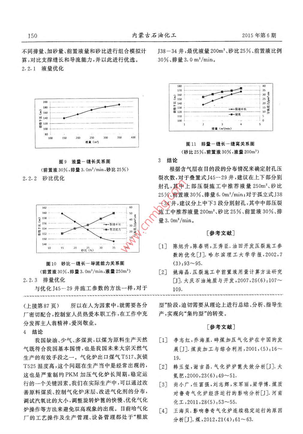 86內(nèi)蒙古石油化工2015年第6期哈爾濱氣化廠PKM氣化爐“雙高”現(xiàn)象原因與分析王猛(遼寧大唐國(guó)際章新煤制天然氣有限責(zé)任公司,遼寧阜新123000)摘要:本文通過(guò)對(duì)影響PKM 氣化爐長(zhǎng)周期穩(wěn)定運(yùn)行的“雙高”現(xiàn)象的分析,提出了針對(duì)性改進(jìn)措施,認(rèn)為通過(guò)改進(jìn)可以延長(zhǎng)氣化爐的使用壽命、提高煤氣質(zhì)量,最終提高PKM氣化爐的連續(xù)運(yùn)轉(zhuǎn)率。關(guān)鍵詞:PKM加壓氣化爐;氣化爐出口溫度;灰鎖溫度;雙高現(xiàn)象中圈分類(lèi)號(hào):TE357文獻(xiàn)標(biāo)識(shí)碼:A文章編號(hào):1006-7981 (2015)06-0086-02煤炭氣化是合理使用煤炭資源的有效途徑之甚至?xí)霈F(xiàn)爆炸現(xiàn)象。一,也是潔凈煤技術(shù)的重要組成部分,其核心設(shè)備為1.3 夾套蒸汽產(chǎn)量和夾套鍋爐給水耗量大且大幅氣化爐。當(dāng)前,綜合效率高、工藝成熟、推廣應(yīng)用廣泛度波動(dòng)且不斷向前發(fā)展的爐型應(yīng)首推碎煤加壓氣化爐,習(xí)氣化爐為雙層夾套式壓力容器,在內(nèi)外層之間慣上稱魯奇爐01。哈爾濱氣化廠使用的魯奇爐也稱要注人中壓鍋爐給水,此時(shí)水量消耗非常大,副產(chǎn)的PKM加壓氣化爐。蒸汽增多,汽包中更多的水被氣化進(jìn)人氣化爐,引起氣化爐在生產(chǎn)運(yùn)行中常見(jiàn)的一個(gè)現(xiàn)象叫“雙氣化爐工況不穩(wěn)。高”。所謂雙高即氣化爐出口煤氣溫度T517,灰鎖溫1.4 灰中含渣塊和未燃燒的煤度T525這兩個(gè)溫度都高。雙高現(xiàn)象對(duì)氣化爐運(yùn)行十評(píng)價(jià)PKM加壓氣化爐很重要的一項(xiàng),從排出分不利,不但會(huì)降低氣化爐的產(chǎn)氣量,嚴(yán)重時(shí)甚至?xí)幕彝庥^來(lái)看,有的時(shí)候渣塊非常大,有時(shí)夾雜著大燒壞氣化爐內(nèi)部結(jié)構(gòu),迫使氣化爐停車(chē)檢修。在生產(chǎn)量殘?zhí)?。再有評(píng)價(jià)PKM的生產(chǎn)能力好壞時(shí),煤氣分中為了獲得更高的能量利用率,我們希望煤經(jīng)高溫析做出的樣,O2、CO2、H2、CH,的含量要在科學(xué)規(guī)高壓氣化產(chǎn)生的熱量在爐內(nèi)更好的被利用,讓出口范的范圍內(nèi)。的煤氣溫度進(jìn)- - 步降下來(lái),如果出口煤氣溫度降低2 PKM加壓氣化爐雙高現(xiàn)象的危害的話,就提高了在后續(xù)工段洗滌冷卻器0050和廢熱2.1雙高現(xiàn)象對(duì)氣化爐 上部的影響鍋爐0060換熱時(shí)介質(zhì)所需要的最低溫度。使高溫煤當(dāng)氣化爐出口煤氣溫度升高時(shí),容易造成氣化氣經(jīng)過(guò)更少的能量消耗,就能變成下游CO變換工爐上部布煤器的燒壞或者發(fā)生爐內(nèi)夾套鼓包現(xiàn)象。段所需要的低溫煤氣。此外減少了酚水的噴人量,也布煤器燒壞偏斜,使煤內(nèi)粒度分布不均,氣化爐同一相應(yīng)減少了后續(xù)工段的水處理。因此,避免雙高現(xiàn)象床層的阻力大小不一,反應(yīng)速度不同,易出現(xiàn)氣化爐的發(fā)生,可以使氣化爐更好的長(zhǎng)周期,穩(wěn)定性的運(yùn)局部過(guò)熱結(jié)渣、結(jié)大塊,直接影響氣化爐的穩(wěn)定運(yùn)行行。夾套鼓包漏水,由于夾套漏水,使氣化爐內(nèi)局部1PKM加壓氣化爐出現(xiàn)雙高的突出表現(xiàn)熄火,致使粗煤氣中氧含量超標(biāo),含氧粗煤氣經(jīng)過(guò)廢1.1氣化爐出口煤氣和灰 鎖溫度高熱鍋爐冷卻后,進(jìn)人氣液分離器形成爆炸性混合物,T517和T525同時(shí)高并且這兩個(gè)溫度存在較大達(dá)到爆炸極限,在液、氣、固體分離過(guò)程中能產(chǎn)生摩幅度的波動(dòng)。控制室可通過(guò)監(jiān)測(cè)相應(yīng)的儀表讀數(shù),此擦火花,或在高溫、高速作用下而形成爆炸。時(shí)溫度居高不下,不能平穩(wěn)指示。2.2雙高現(xiàn)象對(duì)氣化爐 下部的影響1.2粗煤氣流量大幅度波動(dòng)一般灰區(qū)高度要求在500mm,但是當(dāng)灰鎖溫度產(chǎn)氣量可通過(guò)計(jì)量?jī)x表進(jìn)行計(jì)算,此時(shí)CO2的高時(shí),就表明灰床降低,火層下移,這樣就會(huì)造成氣含量升高且不穩(wěn)定,嚴(yán)重時(shí)會(huì)有氧氣含量超標(biāo)狀況化爐下部的危害。對(duì)旋轉(zhuǎn)爐篦、爐柵非常不利,使它發(fā)生,一旦超氧,對(duì)后續(xù)工段非常不利,若處理不好們長(zhǎng)期承受高溫,繼而材質(zhì)變形,最終出現(xiàn)裂紋,嚴(yán)收稿日期:2014-12- 26150內(nèi)蒙古石油化工2015年第6期不同排量、加砂量、前置液量和砂比進(jìn)行組合模擬計(jì)J38-34井,最優(yōu)液量200m'、砂比25%、前置液比例算,對(duì)比支撐縫長(zhǎng)和導(dǎo)流能力,并以此進(jìn)行優(yōu)選。30%、排量3.0 m*/min。2.2.1液量?jī)?yōu)化80廣70 t160 t+3020業(yè)1418宜160家1130↑↓15+ 103業(yè)14000↓排量(m/min)80↓15oo 330 40液量(m”圖11排量一 縫長(zhǎng)-縫高關(guān)系圖(砂比25%,前置液30%,液量200m2)圖9液量一縫長(zhǎng)關(guān)系圖3結(jié)論(前置液30%,排量3.0m3/min,砂比25%)根據(jù)含氣層在目的段的分布情況來(lái)確定射孔壓2.2.2砂比優(yōu)化裂次數(shù),對(duì)于疊置式J45-29井,建議在上下部分別射孔,其中上部壓裂施工中推薦液量250m'、砂比25%、前置液30%、排量6. 0m2/min;對(duì)于孤立式J38- 34井,建議分上中下3段分別射孔,其中中部壓裂16250160施工中推薦液量200m2、砂比25%、前置液30%、排合15840量3.0m3 /min。裂縫半長(zhǎng)302