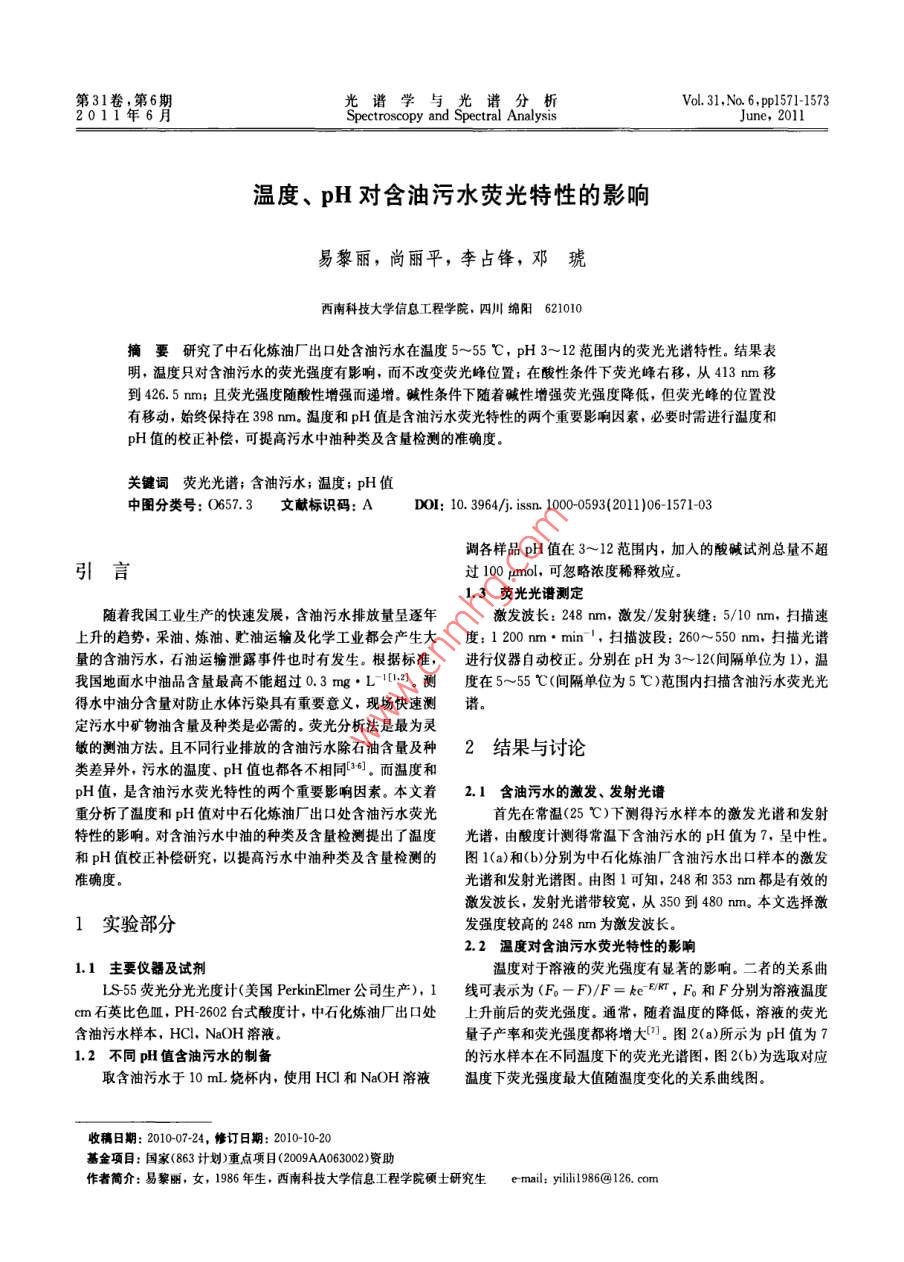第31卷,第6Vol.31…No.6,p571-15732011年6Spectroscopy and Spectral AnalysisJune, 2011溫度、pH對(duì)含油污水熒光特性的影響易黎麗,尚麗平,李占鋒,鄧琥西南科技大學(xué)信息工程學(xué)院,四川綿陽(yáng)621010摘要研究了中石化煉油廠出口處含油污水在溫度5~55℃,pH3~12范圍內(nèi)的熒光光譜特性。結(jié)果表明,溫度只對(duì)含油污水的熒光強(qiáng)度有影響,而不改變熒光峰位置;在酸性條件下熒光峰右移,從413mm移到426.5mm;且熒光強(qiáng)度隨酸性增強(qiáng)而遞增。堿性條件下隨著堿性增強(qiáng)熒光強(qiáng)度降低,但熒光峰的位置沒(méi)有移動(dòng),始終保持在398mm。溫度和pH值是含油污水熒光特性的兩個(gè)重要影響因素,必要時(shí)需進(jìn)行溫度和pH值的校正補(bǔ)償,可提高污水中油種類及含量檢測(cè)的準(zhǔn)確度。關(guān)鍵詞熒光光譜;含油污水;溫度;pH值中圖分類號(hào):0657.3文獻(xiàn)標(biāo)識(shí)碼:ADO1:10.3964/ J. Issn.1000593(2011)06-1571-03調(diào)各樣品pH值在3~12范圍內(nèi),加入的酸堿試劑總量不超引言過(guò)100μmol,可忽略濃度稀釋效應(yīng)。1.3熒光光譜測(cè)定隨著我國(guó)工業(yè)生產(chǎn)的快速發(fā)展,含油污水排放量呈逐年激發(fā)波長(zhǎng):248mm,激發(fā)/發(fā)射狹縫:5/10mm,掃描速上升的趨勢(shì),采油、煉油、貯油運(yùn)輸及化學(xué)工業(yè)都會(huì)產(chǎn)生大度:1200mm·min,掃描波段:260~550mm,掃描光譜量的含油污水,石油運(yùn)輸泄露事件也時(shí)有發(fā)生。根據(jù)標(biāo)準(zhǔn),進(jìn)行儀器自動(dòng)校正。分別在pH為3~12(間隔單位為1),溫我國(guó)地面水中油品含量最高不能超過(guò)03mg·L12.測(cè)度在5~55℃(間隔單位為5℃)范圍內(nèi)掃描含油污水熒光光得水中油分含量對(duì)防止水體污染具有重要意義,現(xiàn)場(chǎng)快速測(cè)譜定污水中礦物油含量及種類是必需的。熒光分析法是最為靈敏的測(cè)油方法.且不同行業(yè)排放的含油污水除石油含量及種2結(jié)果與討論類差異外,污水的溫度、pH值也都各不相同6。而溫度和pH值,是含油污水熒光特性的兩個(gè)重要影響因素。本文著2.1含油污水的激發(fā)、發(fā)射光譜重分析了溫度和pH值對(duì)中石化煉油廠出口處含油污水熒光首先在常溫(25℃)下測(cè)得污水樣本的激發(fā)光譜和發(fā)射特性的影響。對(duì)含油污水中油的種類及含量檢測(cè)提出了溫度光譜,由酸度計(jì)測(cè)得常溫下含油污水的pH值為7,呈中性。和pH值校正補(bǔ)償研究,以提高污水中油種類及含量檢測(cè)的圖1(a)和(b)分別為中石化煉油廠含油污水出口樣本的激發(fā)準(zhǔn)確度光譜和發(fā)射光譜圖。由圖1可知,248和353m都是有效的激發(fā)波長(zhǎng),發(fā)射光譜帶較寬,從350到480mm。本文選擇激1實(shí)驗(yàn)部分發(fā)強(qiáng)度較高的248mm為激發(fā)波長(zhǎng)。2.2溫度對(duì)含油污水熒光特性的影響1.1主要儀器及試劑溫度對(duì)于溶液的熒光強(qiáng)度有顯著的影響。二者的關(guān)系曲LS55熒光分光光度計(jì)(美國(guó) PerkinElmer公司生產(chǎn)),1線可表示為(F-F)/F=keM,F和F分別為溶液溫度cm石英比色皿,PH2602臺(tái)式酸度計(jì),中石化煉油廠出口處上升前后的熒光強(qiáng)度。通常,隨著溫度的降低,溶液的熒光含油污水樣本,HC,NaOH溶液。量子產(chǎn)率和熒光強(qiáng)度都將增大(。圖2(a)所示為pH值為71.2不同pH值含油污水的制備的污水樣本在不同溫度下的熒光光譜圖,圖2(b)為選取對(duì)應(yīng)取含油污水于10mL燒杯內(nèi),使用HCl和NaOH溶液溫度下熒光強(qiáng)度最大值隨溫度變化的關(guān)系曲線圖收稿日期:20100724,修訂日期:2010-10-20基金項(xiàng)目:國(guó)家(863計(jì)劃)重點(diǎn)項(xiàng)目(2009AA063002)資助作者簡(jiǎn)介:易黎麗,女,1986年生,西南科技大學(xué)信息工程學(xué)院碩士研究生e-mail:yilili1986@126.com光譜學(xué)與光譜分析第31卷1001(a)Excitation wavelength/nmFig. I The excitation spectra(a)and emission spectra(b) of oily waste water520e to belowEmission wavelength/nFig 2 Infuence of temperature on fuorescence spectra of oily waste由圖2(a)可知,溫度對(duì)含油污水熒光特性的影響體現(xiàn)在溶液的pH改變將會(huì)影響到基態(tài)分子或激發(fā)態(tài)分子的酸只對(duì)熒光強(qiáng)度產(chǎn)生影響,沒(méi)有使熒光峰的位置發(fā)生移動(dòng)。結(jié)堿性質(zhì),假如激發(fā)時(shí)發(fā)生電荷轉(zhuǎn)移到酸性基團(tuán)或堿性基團(tuán)果表明,含油污水的熒光強(qiáng)度隨著溫度的升高而降低,呈梯激發(fā)態(tài)分子與基態(tài)分子將是更弱的酸或更強(qiáng)的堿,這就使得度走勢(shì),在10℃達(dá)到最大,熒光強(qiáng)度相對(duì)值為516.37,隨后分子的基態(tài)與激發(fā)態(tài)之間的能量間隔發(fā)生變化,從而導(dǎo)致光依次降低,但常溫(25℃)下的熒光強(qiáng)度略有升高,到55℃譜移動(dòng)。圖3(a)所示為常溫下(25℃),不同pH值的含油時(shí)達(dá)到最小。污水熒光光譜圖,圖3(b)為在對(duì)應(yīng)pH值條件下選取熒光強(qiáng)3pH對(duì)含油污水熒光特性的影響度最大值所作的pH值熒光強(qiáng)度關(guān)系曲線圖700(b)89,1550Fig 3 Influence of pH on fuorescence spectra of oilywastewater(a)and on the intensity of each peak(b)第6期光譜學(xué)與光譜分析1573溶液的酸堿性變化將使熒光物質(zhì)的弱酸或弱堿分子及其素。本文研究了中石化煉油廠出口處含油