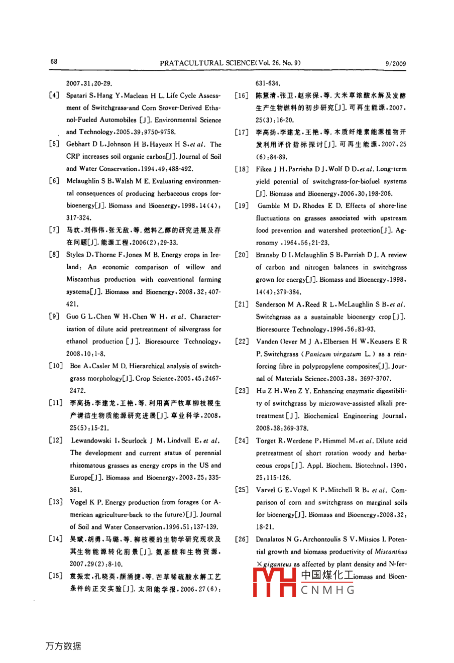 卷9期9/2009PRATACULTURAL SCIENCEVol 26. No 9利用多年生牧草生產(chǎn)燃料乙醇前景余醉,李建龍,李高揚(南京大學生命科學院江蘇南京210093)摘要:多年生牧草具有可再生、產(chǎn)量高、分布廣、價格低康、纖維素含量高等特點,采用其生產(chǎn)燃料乙醇不僅可以解決現(xiàn)階段能源生產(chǎn)與糧食安全之間的矛盾,還可帶來控制土壤侵蝕、減少農藥化肥的污染、降低CO2瓣放量等生態(tài)效益。相比于糧食作物,在生產(chǎn)工藝發(fā)展的基礎上,使用多年生牧草將大幅降低燃料乙醇的生產(chǎn)成本,帶來良姸的經(jīng)濟效益。闡逃了利用多年生牧草生產(chǎn)燃料乙酵的研究現(xiàn)狀,并在此基礎上分析其生態(tài)優(yōu)勢與經(jīng)濟價值·介紹了幾種可作為燃料乙醇原料開發(fā)的多年生牧草,為利用多年生牧草發(fā)展能源草業(yè)提供了科學依據(jù)。關鍵詞:多年生能源牧草;生物質能源;燃料乙醇;能源草業(yè)中圖分類號:TQ517.4·,3文獻標識碼:A文章編號:1001-0629(2009)090062-08近年來石油資源的需耗量不斷增加,設在倫料乙醇的原料進一步發(fā)展能源草業(yè)對解決當今敦的石油枯竭中心(ODAC)認為2006年全球石能源危機與糧食耕地緊張有重要的意義。可作為油產(chǎn)量超過消耗量的歷史已經(jīng)結束,全世界已經(jīng)能源牧草發(fā)展的牧草種類豐富,如柳枝稷Pani探明的石油儲藏量約為1564億t,但以目前的開 cum virgatum、芒草 Miscanthus spp.、草本蘆竹釆速度計算,地球上的石油儲量只夠消費41 Arundo donax,以及一些分布廣泛的雜類草。在年[,因此需要大力開發(fā)非常規(guī)能源如生物柴油、介紹目前使用多年生牧草作為能源植物生產(chǎn)燃料生物乙醇等以彌補需求缺口。同時使用化石燃乙醇現(xiàn)狀的基礎上,分析了多年生牧草作為清潔料造成空氣污染加劇溫室效應而燃料乙醇的氧能源燃料乙醇生產(chǎn)的生態(tài)價值及經(jīng)濟價值,并重及辛烷含量高于汽油,燃燒效率高,可減少CO、點介紹了幾種主要的能源牧草,并對其作為能源NO,芳香族化合物的排放以及傳統(tǒng)的添加劑如植物及生產(chǎn)燃料乙醇原料的前景做出展望甲基叔丁基醚(MTBE〕對水體的污染,因此加快1多年生牧草生產(chǎn)燃料乙醇的生態(tài)效益燃料乙醇等清潔能源的開發(fā)研究是非常重要的。與經(jīng)濟效益分析目前燃料乙醇主要的生產(chǎn)原料有玉米zea1.1多年生牧草生產(chǎn)燃料乙醇的生態(tài)效益mays、甘蔗 Saccharum officinarum、薯類等。1.L.1多年生牧草生產(chǎn)燃料乙醇控制環(huán)境污染糧食安全與能源生產(chǎn)之間的矛盾給燃料乙醇的開總體上能源植物比傳統(tǒng)作物更能適應一些極端的發(fā)帶來了一些爭議,并且一年生作物易造成土壤肥力以及水分條件,因此在一些棄耕地、邊際生態(tài)侵蝕其在生產(chǎn)過程中使用的大量化肥農藥會污系統(tǒng)、濕地上種植多年生牧草可帶來經(jīng)濟與生態(tài)染環(huán)境。因此,近年來越來越多的國家和研究機雙方面的收益2)。種植多年生牧草可以提高土壤構加強了對生產(chǎn)燃料乙醇的非糧食能源作物的篩有機質含量,改善土壤結構,增強土壤蓄水、蓄肥選培育。其中多年生牧草生物量高并可每年收能力多年生草本植物多數(shù)具有較強的抗蟲、抗病獲,價格低廉,分布生境廣泛,尤其是可生長在荒灘、鹽堿地等邊際生境,其具有良好的環(huán)境效應,收稿日期:2008-0729可控制土壤侵蝕提高生物多樣性。因此將草業(yè)中國煤化工引入能源工業(yè)發(fā)展,使用多年生牧草作為生產(chǎn)燃CNMHG9/2009草業(yè)科學(第26卷9期)能力因此可以減少農藥的使用(表1),并且由于 Hohenstein等(2估計,相比于一年生作物,多年較低強度的農耕管理的干擾,可為土壤生物、哺乳生草本能源植物可使土壤侵蝕速度下降95%殺動物以及鳥類等提供棲息地,增加生物多樣性。蟲劑的使用量減少90%。豪1幾種糧食作物與能源作物的農藥化肥使用量及土壤侵蝕狀況侵蝕量磷鉀除草劑作物[Mg/(hm2·a)][kg/(hm2·a)][kg/(hm2·a)][kg/(hm2·a)][kg/(hm2·a)]玉米3.06大豆40.91.830.25SRWC2.000663000高草草原2.09000.15注:HEC表示草本能源植物;SRWC表示短期輪伐木使用多年生牧草作為能源植物,生產(chǎn)燃料乙可見使用柳枝稷生產(chǎn)燃料乙醇比傳統(tǒng)的以玉米為醇可減少CO2排放量。用生命周期評價模型分原料的生產(chǎn)工藝可增加50%~100%的能量收析汽車用燃料乙醇的生產(chǎn)和使用對環(huán)境作用的研。究預測,相比使用低硫汽油(RFG)汽車,使用柳枝1.2多年生牧草生產(chǎn)燃料乙醇的經(jīng)濟效益稷燃料乙醇的E85燃料汽車到2010年內,溫室分析燃料乙醇生產(chǎn)中存在的主要問題之一是氣體排放可降低57%。而通過工程性的提高作如何降低原料成本。據(jù)報道,以玉米為原料生產(chǎn)物和燃料乙醇的產(chǎn)量,到2020年中長期,可減少燃料乙醇,原料成本占綜合成本的7819%,相70%。并且不同于一年生作物,多年生牧草可比于糧食和經(jīng)濟作物,多年生牧草來源廣泛,價格以大大增加土壤有機質的含量,固定CO212。多低廉,一旦大規(guī)模機械化培育和收獲,價格將有大年生牧草可以通過積累殘余植物體枯落物,并可幅降低。多年生牧草生長周期短,可較快產(chǎn)生經(jīng)因其較龐大的地下根系增加地下同化碳與土壤有濟效益,一般2年后可年年收獲。而木本木質纖機質的含量。