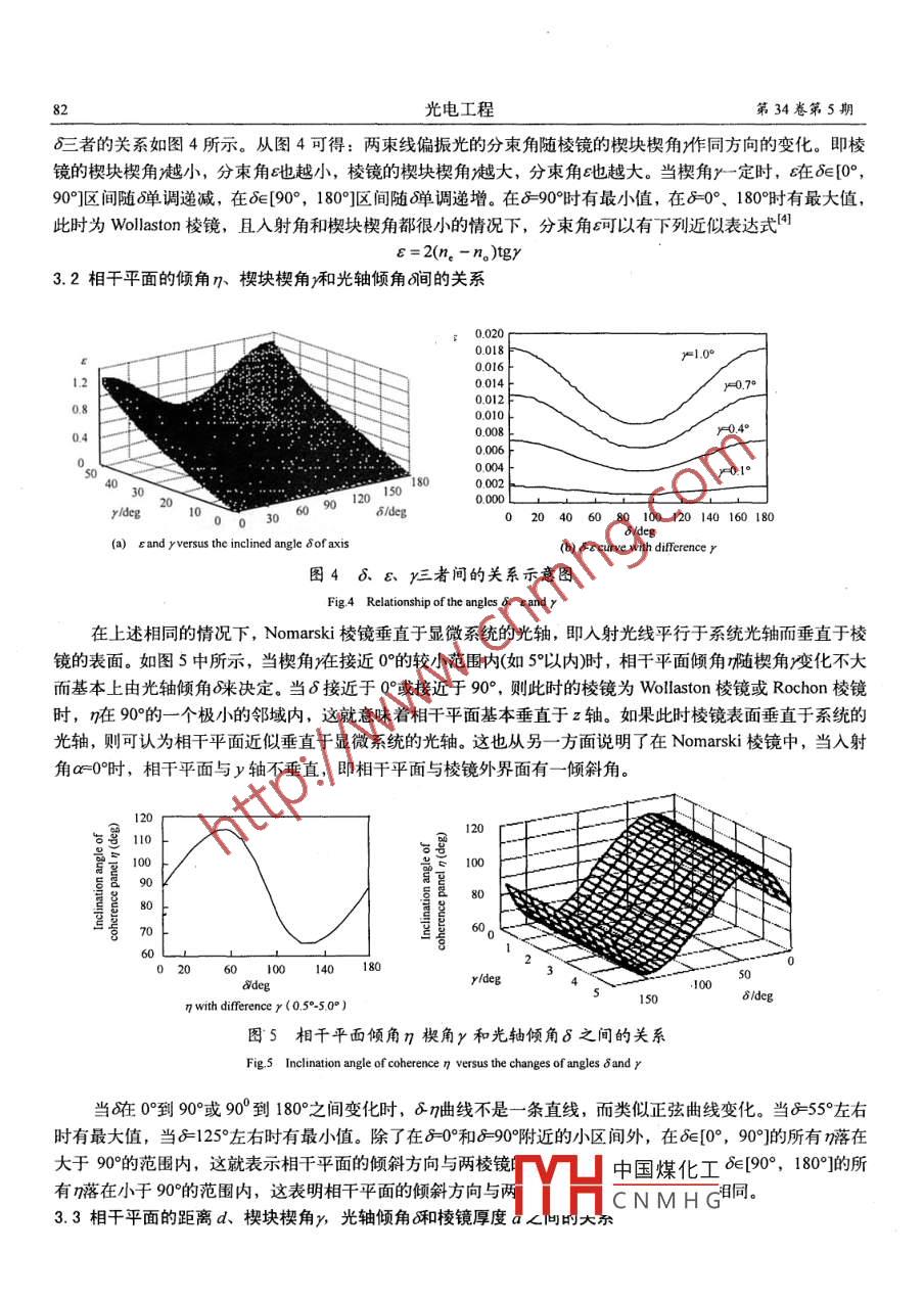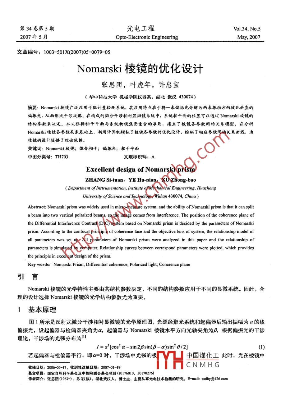 第34卷第5期光電工程Vol.34, No.52007年5月Opto-Electronic EngineeringMay, 2007文章編號(hào): 1003-501X(2007)05-0079- -o5Nomarski棱鏡的優(yōu)化設(shè)計(jì)張思團(tuán),葉虎年,許忠寶(華中科技大學(xué)機(jī)械學(xué)院儀器系,湖北武漢430074)摘要: Nomarski 棱鏡廣泛應(yīng)用于微計(jì)量檢測(cè)系統(tǒng),其應(yīng)用特點(diǎn)在于將一柬偏振光分解為兩束振動(dòng)方向彼此垂直的偏振光,從而形成干涉成像。在構(gòu)成的微分干涉相襯顯微鏡系統(tǒng)中,系統(tǒng)相干面的位置可以通過(guò)Nomarski棱鏡的結(jié)構(gòu)參數(shù)來(lái)決定。本文根據(jù)相干平面與系統(tǒng)物鏡焦面重合的準(zhǔn)則,建立了棱鏡各參數(shù)間的關(guān)系模型。在分析Nomarski棱鏡各參數(shù)關(guān)系基礎(chǔ)上,利用計(jì)算機(jī)模擬了棱鏡各參數(shù)的優(yōu)化設(shè)計(jì),繪制了相應(yīng)參數(shù)間的關(guān)系曲線,為棱鏡的設(shè)計(jì)提供了理論依據(jù)。關(guān)鍵詞: Nomarski棱鏡; 微分相干;偏振光;相干平面中圖分類(lèi)號(hào): TH703文獻(xiàn)標(biāo)識(shí)碼: AExcellent design of Nomarski prismZHANG Si-tuan, YE Hu-nian, XU Zhong-bao( Department of Instrumentation, Instiute of Mechanical Engineering, HuazhongUniversity of Science and Technology, Wuhan 430074, China )Abstract: Nomarski prism was widely used in micro-measure system, and the ability of Nomarski prism is that it can splita beam into two vertical polarized beams, so the image comes from interference. The position of the coherence plane ofthe Differential Interference Contrast (DIC) system based on Nomarski prism is decided by the paramcters of Nomarskiprism. According to the confocal principle of coherence face and the objective lens of system, the relationship model ofall parameters was set up. All parameters of Nomarski prism were analyzed in this paper and the relationship ofparameters is simulated by computer. Relationship curves between correspond parameters were plotted, which providesthe principle in excellent design of the prism.Key words: Nomarski Prism; Diferential coherence; Polarized light; Coherence plane引言Nomarski棱鏡的光學(xué)特性主要由其結(jié)構(gòu)參數(shù)決定,不同的結(jié)構(gòu)參數(shù)應(yīng)用于不同的顯微系統(tǒng)。因此,合理的設(shè)計(jì)選擇Nomarski棱鏡的光學(xué)結(jié)構(gòu)參數(shù)尤為重要。1基本原理圖1所示是反射式微分干涉相襯顯微鏡的光學(xué)原理圖,光源經(jīng)聚光系統(tǒng)和起偏器后輸出振幅為a的線偏振光,設(shè)起偏器與檢偏器夾角為a,起偏器與Nomarski棱鏡水平方向光軸夾角為β,根據(jù)偏振光的干涉理論,干涉場(chǎng)的光強(qiáng)分布為"I = a'[cos2 a - sin2βsin(β- a)sin2 θ12]若起偏器與檢偏器平行,即a=0時(shí),干涉場(chǎng)中光強(qiáng)的極中國(guó)煤化工此時(shí),光在棱鏡中收稿日期: 2006-05-17. 收到修改稿日期: 2007-01-19YHCNMHG基金項(xiàng)目:國(guó)家自然科學(xué)基金及中物院聯(lián)合基金項(xiàng)目(10176010, 30170276)作者簡(jiǎn)介:張思團(tuán)(1967-),男(漢族),湖北武漢人,博士生,主要從事光電技術(shù)檢測(cè)的研究。E- mail: zstlhy@126 .com8(光電工程第34卷第5期不發(fā)生雙折射,不形成微分干涉圖象:在β=45°、 1359、 225°時(shí),雖可形成干涉像,但千涉光強(qiáng)為極小值。若a=90°時(shí)干涉場(chǎng)中光強(qiáng)的表達(dá)式為I = a2 sin2βsin2 θ12 ,當(dāng)β=45°. 1359. 225°時(shí),此時(shí)兩個(gè)折射光具有相同的強(qiáng)度且CCDOcular lens千涉光強(qiáng)也最大。因此,應(yīng)使入射光振動(dòng)方向與Nomarski棱鏡水平方向光軸夾角為4s02]。如圖1所示人射的線偏振光經(jīng)半透、半反鏡入射在.Nomarski棱鏡上,棱鏡將其分成兩束具有微小夾角、振動(dòng)方0SplitterSource向相互垂直且振幅相等的線偏振光;通過(guò)顯微物鏡后,產(chǎn)生Nomarski prism剪切量為( Ox, Oy )略小于顯微鏡的分辨率)的平行光入射到' Obiective lens被測(cè)件表面。從被測(cè)表面反射回的兩束正交偏振光再經(jīng)原路返回,由棱鏡重新復(fù)合共線,經(jīng)h/4波片后再通過(guò)檢偏器發(fā)生干涉,被CCD攝像機(jī)接收或通過(guò)目鏡觀察。因此,確定圖1微分干涉相襯顯微鏡示意圖Nomarski棱鏡的參數(shù)是構(gòu)成本系統(tǒng)的關(guān)鍵。Fig.1 Schematic diagram of DIC microscopy2 Nomarski 棱鏡的設(shè)計(jì)設(shè)計(jì)Nomarski棱鏡的目的就是合理確定其參數(shù),即楔塊楔角x.光軸傾角8、棱鏡的厚度a、及棱鏡的長(zhǎng)度b以滿足使Nomarski棱鏡的相干平面與物鏡的后焦面重合。這就要求Nomarski棱鏡的相千平面距其表面的距離- -般要大于20mm!),同時(shí)產(chǎn)生一個(gè)小于顯微鏡分辨率的剪切量。Pe(Co.yo)、A書(shū)Po(xoyo)H__ ”人射的線偏振光經(jīng)Nomarski棱鏡分解后,匯聚于相千平面,Crl /a'相干平面與棱鏡邊緣AB間的距離d.相千平面的傾角η這兩個(gè)參數(shù)直接影響到棱鏡與顯微物鏡的后焦面及系統(tǒng)光軸的位n置。1)入射線偏振光經(jīng)Nomarski棱鏡后各折射角的關(guān)系1設(shè)一束線偏振光以人射角a入射到棱鏡,經(jīng)出射面到空氣,其夾角為E。對(duì)振動(dòng)方向垂直于光軸的線偏振光在區(qū)中圖2 Nomarski 棱鏡中的各參數(shù)示意圖是尋常光(o光),如圖2所示,經(jīng)膠合面折射后在I區(qū)中為異Fig.2 Schematic diagram of the parameters of常光(e光),但振動(dòng)方向與光軸平行,光線方向與波法線不分the prism of Nomarski離,光