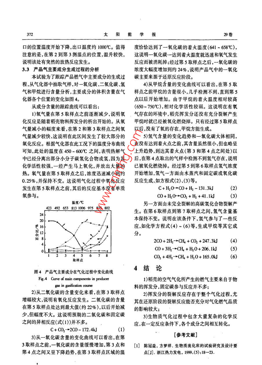 第29卷第3期太陽能學(xué)報(bào)Vvol.29, No.32008年3月ACTA ENERCLAE SOLARIS SINICAMur. ,2008文章編號(hào): 0254006(2008)03-03004稻殼旋風(fēng)空氣氣化的機(jī)理研究孫紹增,宿鳳明,趙義軍,凌峰(哈爾濱工業(yè)大學(xué)燃燒工程研究所,哈爾濱10001)摘要: 在稻殼旋風(fēng)空氣氣化的試驗(yàn)中,通過對(duì)氣化反應(yīng)過程中的各個(gè)階段進(jìn)行取樣分析,跟蹤燃?xì)庵袔追N主要成分的生成過程,了解稻殼空氣氣化的反應(yīng)機(jī)理。通過試驗(yàn)了解到:稻殼旋風(fēng)空氣氣化過程中,化學(xué)反應(yīng)沒有明確分區(qū)氧化反應(yīng)是個(gè)持續(xù)過程,隨著揮發(fā)分的析出便已開始, -直到氧氣完全消耗掉溫度達(dá)到最高;高碳?xì)浠衔?焦油)的裂解反應(yīng)貫穿整個(gè)氣化過程;氣化燃?xì)庵械闹饕煞?C0、H、CH)是在還原反應(yīng)階段產(chǎn)生的。關(guān)鍵詞:旋風(fēng)氣化;氣化燃?xì)?空氣當(dāng)量比;裂解中團(tuán)分類號(hào): TQ038.1文獻(xiàn)標(biāo)識(shí)碼: A其氣化所產(chǎn)燃?xì)饨褂秃肯鄬?duì)較高。0引言本研究采用旋風(fēng)氣化工藝,是為生產(chǎn)低焦油高生物質(zhì)空氣氣化技術(shù)是生物質(zhì)熱化學(xué)轉(zhuǎn)換技術(shù)品質(zhì)的燃?xì)舛O(shè)計(jì),空氣攜帶稻殼物料和半焦顆粒的一種,一般為使生物質(zhì)物料中的有機(jī)物質(zhì)以空氣在氣化器內(nèi)做旋流流動(dòng),同時(shí)完成氣化反應(yīng)14-61。為氣化載體進(jìn)行不完全燃燒而產(chǎn)生低熱值燃?xì)?3.5旋風(fēng)氣化工藝在遵循生物質(zhì)氣化原理的基礎(chǔ)上,具~ 5.5MJ/Nm)"。目前,生物質(zhì)空氣氣化主要利用有氣固兩相混合充分傳熱傳質(zhì)快、反應(yīng)過程可控等固定床(上吸式固定床、下吸式固定床)和流化床(循優(yōu)點(diǎn)78)。同時(shí),由于旋風(fēng)空氣氣化過程中,熱解產(chǎn)環(huán)流化床、鼓泡床)兩種氣化工藝。-般認(rèn)為,無論物要經(jīng)過高溫反應(yīng)區(qū),容易使所產(chǎn)焦油高溫裂解,從哪一種工藝,其氣化過程都要經(jīng)歷干燥、熱解、氧化而達(dá)到消除焦油的目的。和還原幾個(gè)反應(yīng)階段23]。不同的氣化方式有其不同的技術(shù)特點(diǎn)和運(yùn)行方式,也有各自的優(yōu)缺點(diǎn)。固1物料(稻殼 )的基本特性定床氣化強(qiáng)度小,規(guī)模不宜擴(kuò)大;流化床傳熱傳質(zhì)劇本實(shí)驗(yàn)采用的稻殼取自于黑龍江紅興隆農(nóng)場(chǎng),烈、氣化強(qiáng)度大,適合大規(guī)模氣化。但其氣化過程自然風(fēng)干后經(jīng)過粗略打碎處理,其堆積密度為190中,氣化溫度不宜太高,容易造成結(jié)焦搭橋現(xiàn)象,故kg/m' ,其稻殼的元素分析和工業(yè)分析數(shù)據(jù)如表1。表1稻殼的元素分析與工業(yè)分析Tablel Utimate and prorimate analysis of the tested rice husk元素分析/%工業(yè)分析1%熱值/MJ.kg'[C].[H][0][N]。[S]s[V].FC_38.074.9231.290.400.0559.2711.5013.2414.78機(jī)提供的空氣混合并被攜帶切向送入氣化器,其整2試驗(yàn) 系統(tǒng)及過程套實(shí)驗(yàn)系統(tǒng)如圖1。整個(gè)試驗(yàn)系統(tǒng)主要包括主體氣化器、給風(fēng)加料氣樣經(jīng)過濾、冷凝、除焦油和干燥等處理措施系統(tǒng)、預(yù)熱及溫控系統(tǒng)和取樣系統(tǒng)4部分。物料顆后,送到色譜分析儀進(jìn)行成分分析。對(duì)氣化器內(nèi)各粒由調(diào)速螺旋給料機(jī)送入物料引射器,與空氣壓縮.個(gè)反應(yīng)階段分 別取樣時(shí),利用熱電偶安裝孔做為取收稿日期: 200609022基金項(xiàng)目:黑龍江省自然科學(xué)基金(1307396)通訊作者:宿風(fēng)明(190-),男 ,博士研究生,主要研究方向?yàn)樯镔|(zhì)氣化及可再生能源利用。stfengming@eqoc. om3期孫紹增等:稻殼旋風(fēng)空氣氣化的機(jī)理研究371樣孔,拆除相應(yīng)位置的熱電偶,安裝取樣槍。取樣槍真 ,采用等動(dòng)力取樣法,氣樣取出后迅速冷卻。伸人到氣化器簡(jiǎn)體和排氣管中間,為保證氣樣不失41Tr口改101.空氣壓縮機(jī)2.儲(chǔ)氣罐3.螺旋給料機(jī)4.物料引射器5.氣化器6.灰斗 7.點(diǎn)火孔8.液化氣9.取樣孔10.引風(fēng)機(jī) 11.纖維過濾器12.冰水冷卻器 13.水分分離瓶14.焦油分離瓶 15.色譜分析儀圖1稻殼旋風(fēng)氣化系統(tǒng)圖Fig.1 System of air eylone gsificatin of rice husk氣化器的啟動(dòng)需要采用電加熱器預(yù)熱,當(dāng)氣化到650C時(shí)即可啟動(dòng)氣化器運(yùn)行。約20min后氣化器運(yùn)行后加熱器自動(dòng)停止工作。圖2是預(yù)熱及溫控器運(yùn)行穩(wěn)定,進(jìn)行溫度記錄和氣化燃?xì)獾娜臃治觯到y(tǒng)示意圖,在主體氣化器上沿軸向均勻布置8個(gè)每一工況取樣3次,取平均數(shù)作為分析數(shù)據(jù)。鎳鉻-鎳硅熱電偶,用來監(jiān)測(cè)氣化過程中氣化器各部在生物質(zhì)的空氣氣化中,當(dāng)量比ER是一個(gè)很分的溫度,熱電偶由上到下分別編為1~8號(hào)。所有重要的參數(shù)。為了增大中間產(chǎn)物的濃度,減小空氣的熱電偶信號(hào)采用溫度巡檢儀采集記錄。中氮?dú)獾挠绊?,本試?yàn)采用較小的空氣當(dāng)量比ER=0.23,即空氣量為13m'/h,給料量為16.4kg/h。3.2 溫度場(chǎng)的分析接觸器L空氣圖3為試驗(yàn)過程中的氣化器內(nèi)溫度分布曲線,由圖中的溫度場(chǎng)曲線可以看出:常溫下的空氣和物料進(jìn)入氣化器后立即被加熱到300C以上,這部分熱量主要來自
