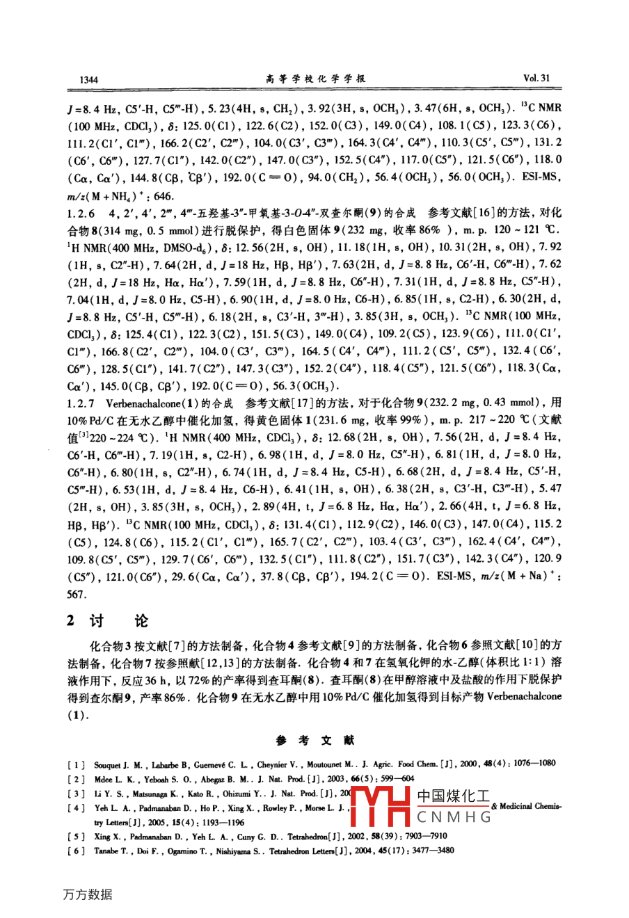 Vol. 31高等學(xué)?;瘜W(xué)學(xué)報(bào)2010年7月CHEMICAL JOURNAL oF CHINESE UNIVERSTTIES1342 - 1345Verbenachalcone的另法全合成張應(yīng)鵬,陳宇濤,楊云裳,關(guān)曉(蘭州理工大學(xué)石油化工學(xué)院,有機(jī)與藥物化學(xué)研究所,蘭州730050)摘要用一種新的簡(jiǎn)便方 法對(duì)Verbenachalcone進(jìn)行全合成,針對(duì)目標(biāo)物的結(jié)構(gòu)特征,將其切為2個(gè)合成片段,即化合物4和6,然后再將2個(gè)片段連接.從對(duì)羥基苯甲醛(2)開始經(jīng)過溴代、乙?;?、Ulmann反應(yīng)、甲氧甲基化、羥醛縮合、脫保護(hù)和催化加氫等7步反應(yīng)完成了標(biāo)題化合物的全合成,總收率為39. 1%,合成的關(guān)鍵步驟是3~澳4.羥基苯甲醛(3)和香蘭素進(jìn)行的Ullmann反應(yīng).關(guān)鍵中間體與最終產(chǎn)物的化學(xué)結(jié)構(gòu)經(jīng)'H NMR, °C NMR和ESI-MS等表征確認(rèn).關(guān)鍵詞Verbenachalcone; Ullmann反應(yīng);全合成;羥醛縮合中圖分類號(hào)0625文獻(xiàn)標(biāo)識(shí)碼A文章編號(hào)0251-0790(2010)07-1342-04查爾酮類化合物廣泛存在于甘草和紅花等藥用植物中,是植物體內(nèi)合成黃酮的前體,也是人工合成黃酮類化合物的中間體,其本身也具有廣泛的生物活性和多種藥理作用".雙查爾酮屬于查爾酮家族中的一員,具有多種生理活性和藥理活性(2.3].因此,此類化合物的研究對(duì)新藥開發(fā)和天然資源的有效利用具有重要意義.Verbenachalcone(1) 是由Ohizumi課題組[']從南美產(chǎn)藥用植物海灘馬鞭草Verbena litralis H. B.K.的地上部分分離得到的,其能提高神經(jīng)生長(zhǎng)因子從PCI2D刺激神經(jīng)突發(fā)展的能力,具有一個(gè)通過二芳基醚鍵連接的兩部分結(jié)構(gòu)[3.4].化合物1的合成已有所報(bào)道,2002年, Cuny研究組[51首次進(jìn)行了化合物1的合成研究,以3-(4-羥基-苯基)丙酸酯為原料,經(jīng)9步反應(yīng)得到目標(biāo)產(chǎn)物,但總產(chǎn)率只有21%,且原料不易得到,合成中還使用了價(jià)格比較昂貴的化學(xué)試劑( CuOTf)PhMe和CsCO3等. 2004年,Nishiyama研究小組'6報(bào)道了- -種新的全合成Verbenachalcone的方法,以對(duì)羥基苯丙醇乙酸酯為原料,經(jīng)19步反應(yīng)得到目標(biāo)產(chǎn)物,但總產(chǎn)率僅為2. 4% ,除用到價(jià)格昂貴的試劑外,操作條件也較為苛刻.本文選用對(duì)羥基苯甲醛為起始原料,經(jīng)過溴代、Ullmann 反應(yīng)、酚羥基保護(hù)、羥醛縮合、脫保護(hù)及催化加氫等7步反應(yīng)完成了Verbenachalcone 的全合成,與文獻(xiàn)[5,6]方法相比,具有原料易得及合成路線短等優(yōu)點(diǎn).1實(shí)驗(yàn)與結(jié)果1.1儀器 與試劑XRC-1型顯微熔點(diǎn)儀(四川大學(xué)科學(xué)儀器廠); Avance 400型核磁共振儀( Bruker公司, TMS為內(nèi)標(biāo),CDCI, 或DMSO-ds作溶劑) ; Esquire 6000型液質(zhì)聯(lián)用儀( Bruker公司);柱層析所用硅膠(青島海洋化工廠,100 ~200目).實(shí)驗(yàn)所用試劑均為分析純或化學(xué)純.1.2實(shí)驗(yàn)過程目標(biāo)化合物的合成路線如Scheme 1所示.1.2.1 3-澳4-羥基苯甲醛(3)的合成 參考文獻(xiàn)[7]方法 合成化合物3,得到白色的一溴醛晶體,收率為85%, m.p.122 ~123 C(文獻(xiàn)值[*123-125 C).1.2.2 4-(5-甲 ?;?2-羥基苯氧基)-3-甲氧基苯甲醛(4)的中國(guó)煤化工在100mL圓MYHCNMHG收稿日期: 209-11-30.基金項(xiàng)目:甘肅省自然科學(xué)基金(批準(zhǔn)號(hào): 32S062-B25-017)資助.聯(lián)系人簡(jiǎn)介:張應(yīng)鵬,男,博士,副教授,主要從事生物有機(jī)化學(xué)研究. E-mail: yinepenghang@ 126. comNo.7張應(yīng)鵬等: Verbenachalcone的另法全合成1343CHOHQ?!監(jiān)MOM)HOHOCHL30CH,yOMOMHO~OHMOMO_d.CH, )5HQ,-OHQCH_g .QCH .H二OHHO 0Scheme 1 Synthetic routes of verbenachalcone(1)Reagents and conditions:a. Br2, CHCl, 40C,6.5 h, yield85%;b. viline, Cul, "Bu,NBr, KgPOs, DMF, nirogenprtection, 150 C, relux, 22 h, yield 75%; c. glacial actice acid, ZnCIl, 140 C, relux, 6h, yield 88%; d. MOMCI,anhydrous K2C0/acetone, 56 C, rllux, 1.5 h, yield 62%; e KOH/EtOH-H2O( volume ratio1:1),0C tor.l, 36 h,yield72%;f. CH,OH, HCI, yield 86%;g. H, EOH, eat. Pd/C, r以,4 h, yield 99%.底燒瓶中加入3-~溴4-羥基苯甲醛200 mg(1 mmol)、香蘭素152 mg(1 mmol)、Cul 19 mg(0. 1 mmol)、"Bu,NBr 32. 2 mg(0. 1 mmol)和K,PO,●3H20 532 mg(2 mmol),加入35 mL DMF,然后在N2氣保護(hù)下于150 C攪拌回流22 h.過濾,濾液用乙酸乙酯萃取,再用飽和NH,Cl及飽和食鹽水依次洗滌,有機(jī)層用無水硫酸鎂干燥,濾除干燥劑,蒸除溶劑,殘余物用硅膠柱分離,得到白色固體4(204 mg,收率75%), m.p. 67 ~70 C. 'H NMR(400 MHz, CDCI,), 8: 9.82(1H, s, 0H), 9. 76(2H, s, CHO),7.74(1H, d,J=8.0 Hz, C4'-H), 7.41(1H, d,J=8.0 Hz, C6-H), 7.12(1H, d, J=8.0 Hz, C5-H), 7.02(1H, d, J=8.0 Hz, C3'-H), 6. 96(1H, s, C6'-H), 6.81(1H, s, C2-H), 3. 86(3H, s, 0CH,).1.2.3 2,4-二羥 基苯乙酮(6)的合成參照文獻(xiàn)[ 10]的方法得到白色的2 ,4-二羥基苯乙酮晶體,收率為88%, m.p.146 ~ 147 C(文獻(xiàn)值"147 ~ 148 C). ' H NMR(400.MHz, DMS0-d6), 8: 12. 57(s, 1H,0H), 9. 64(s, 1H, 0H), 6.23(s, 1H, C3-H), 6. 29(d,J=8.8 Hz, 1H, C5-H), 7. 48(d,J=8.8 Hz,,1H, C6-H), 2. 42(s, 3H, CH,). .1.2.4 2-羥基4-甲氧甲氧基苯乙酮(7)的合成 參考文獻(xiàn)[12,13]方法, 對(duì)2,4二羥基苯乙酮(6)進(jìn).行羥基保護(hù),其中2,4-二羥基苯乙酮、K,CO3和MOMCI的摩爾比為1:2:3.25.反應(yīng)2 h,得到白色晶體7,產(chǎn)率62%,m.p.209~211 C. 'H NMR(400 MHz, CDC1,), 8: 12.61(1H, 8, 0H), 7. 63(1H,d, J=9.2 Hz, C6-H), 6. 56(1H, dd, J=9.2,2.4 Hz, C5-H), 6.54(1H, d,J=2.4 Hz, C3-H),5. 19.(2H, 