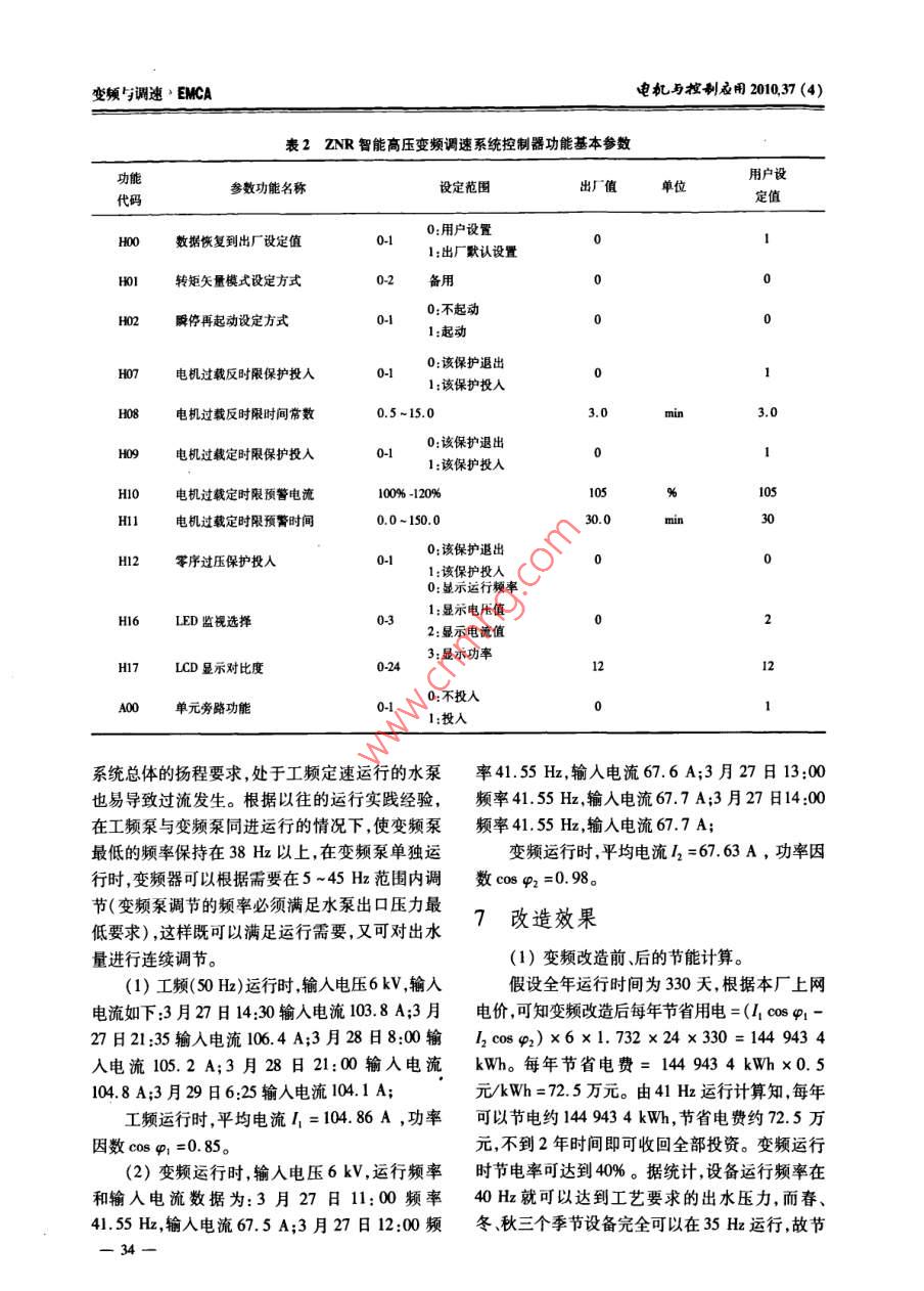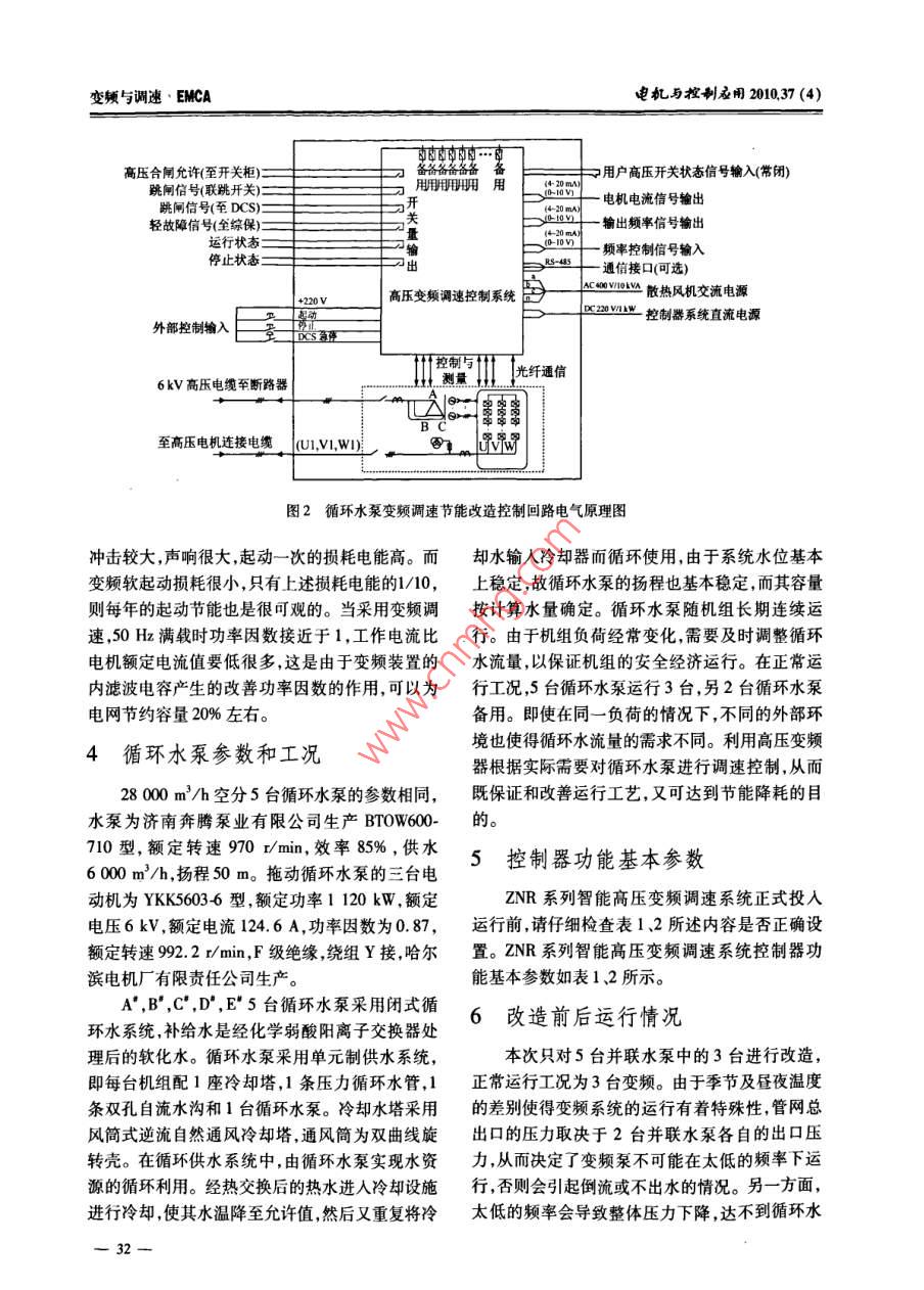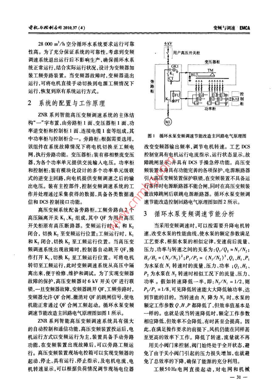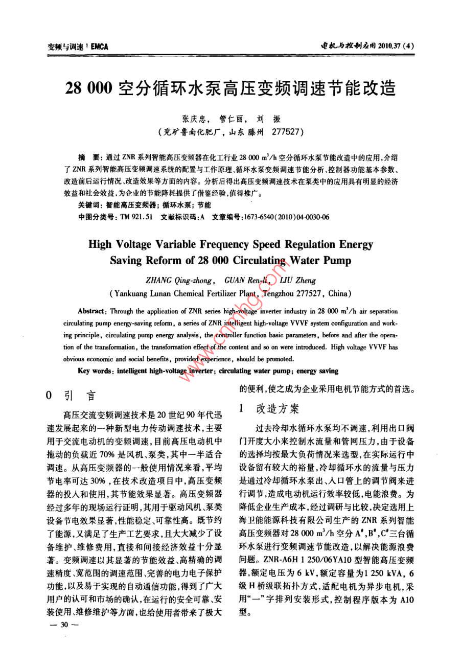 與調(diào)速!EMcA電機(jī)與控制應(yīng)用201037(4)28000空分循環(huán)水泵高壓變頻調(diào)速節(jié)能改造張慶忠,管仁麗,劉振(兗礦魯南化肥廠,山東膝州277527)摘要:通過ZNR系列智能高壓變頻器在化工行業(yè)28000m3/h空分循環(huán)水泵節(jié)能改造中的應(yīng)用介紹了ZNR系列智能高壓變頻調(diào)速系統(tǒng)的配置與工作原理循環(huán)水泵變頻調(diào)速節(jié)能分析控制器功能基本參數(shù)改造前后運(yùn)行情況、改造效果等方面的內(nèi)容。分析后得出高壓變頻調(diào)速技術(shù)在泵類中的應(yīng)用具有明顯的經(jīng)濟(jì)效益和社會效益,為企業(yè)的節(jié)能降耗提供了借鑒經(jīng)驗(yàn),值得推廣。關(guān)鍵詞:智能高壓變頻器;循環(huán)水泵;節(jié)能中圖分類號:TM921.51文獻(xiàn)標(biāo)識碼:A文章編號:16736540(2010)0400006High Voltage Variable Frequency Speed Regulation EnergySaving Reform of 28 000 Circulating WZHANG Qing-zhong, GUAN Ren-li, LIU Zheng(Yankuang Lunan Chemical Fertilizer Plant, Tengzhou 277527, China)Through the application of ZNR series higcirculating pump energy-saving reform, a series of ZNR intelligent high-voltage VVVF system configuration and work-on of the transformation, the transformation effect of the content and so on were introduced. High voltage VVVF hasobvious economic and social benefits, provided experience, should be promoted.Key words intelligent high-voltage inverter: circulating water pump: energy saving0引言的便利,使之成為企業(yè)采用電機(jī)節(jié)能方式的首選。高壓交流變頻調(diào)速技術(shù)是20世紀(jì)9年代迅1改造方案速發(fā)展起來的一種新型電力傳動調(diào)速技術(shù),主要過去冷卻水循環(huán)水泵均不調(diào)速,利用出口閥用于交流電動機(jī)的變頻調(diào)速,目前高壓電動機(jī)中門開度大小來控制水流量和管網(wǎng)壓力,由于設(shè)備拖動的負(fù)載近70%是風(fēng)機(jī)、泵類,其中一半適合的選擇均按最大負(fù)荷情況來選型,在實(shí)際運(yùn)行中調(diào)速。從高壓變頻器的一般使用情況來看,平均設(shè)備留有較大的裕量,冷卻循環(huán)水的流量與壓力節(jié)電率可達(dá)30%,在技術(shù)改造項(xiàng)目中,高壓變頻是通過冷卻循環(huán)水泵出、入口管上的調(diào)節(jié)閥來進(jìn)器的投入和使用,其節(jié)能效果顯著。高壓變頻器行調(diào)節(jié),造成電動機(jī)運(yùn)行效率較低,電能浪費(fèi)。為經(jīng)過多年的現(xiàn)場運(yùn)行證明,其用于驅(qū)動風(fēng)機(jī)、泵類降低企業(yè)生產(chǎn)成本,經(jīng)過調(diào)研與比較決定選用上設(shè)備節(jié)電效果顯著,性能穩(wěn)定、可靠性高。既節(jié)約海衛(wèi)能能源科技有限公司生產(chǎn)的ZNR系列智能了能源,又滿足了生產(chǎn)工藝要求,且大大減少了設(shè)高壓變頻器對28000m3/h空分A,B’,C三臺循備維護(hù)、維修費(fèi)用,直接和間接經(jīng)濟(jì)效益十分顯環(huán)水泵進(jìn)行變頻調(diào)速節(jié)能改造,以解決能源浪費(fèi)著。變頻調(diào)速以其顯著的節(jié)能效益、高精確的調(diào)問題。ZNRA6H1250/06YA10型智能高壓變頻速精度、寬范圍的調(diào)速范圍、完善的電力電子保護(hù)器額定電壓為6kV,額定容量為1250kVA,6功能以及易于實(shí)現(xiàn)的自動通信功能得到了廣大級H橋級聯(lián)拓?fù)浞绞竭m配電機(jī)為異步電機(jī),采用戶的認(rèn)可和市場的確認(rèn),在運(yùn)行的安全可靠、安用“一”字排列安裝形式,控制程序版本為A0裝使用維修維護(hù)等方面也給使用者帶來了極大型。電機(jī)巧控剝用2010.37(4)變頻與調(diào)速EMcA28000m3/h空分循環(huán)水系統(tǒng)要求運(yùn)行可靠性高。為了充分保證系統(tǒng)的可靠性,考慮到變頻用戶高壓開關(guān)柜調(diào)速系統(tǒng)退出運(yùn)行后不影響生產(chǎn),確保循環(huán)水系變壓器柜統(tǒng)正常運(yùn)行,結(jié)合實(shí)際運(yùn)行狀況,設(shè)計(jì)為變頻器加裝工頻旁路裝置。當(dāng)變頻器故障時(shí),變頻器退出運(yùn)行,可將電機(jī)直接手動切換到電源工頻情況下運(yùn)行,恢復(fù)到原有系統(tǒng)運(yùn)行方式???系統(tǒng)的配置與工作原理本制功率柜ZNR系列智能高壓變頻調(diào)速系統(tǒng)的主體結(jié)構(gòu)“一”字布置,由旁路柜1面、變壓器柜1面、功率逆變柜和控制柜1面、連接電纜1套等組成,其中功率柜與控制柜合一。旁路柜:根據(jù)需要選用,圖1循環(huán)水泵變頻調(diào)速節(jié)能改造主回路電氣原理圖該組件在系統(tǒng)故障情況下將電機(jī)切換至工頻電改變變頻器輸出頻率,調(diào)節(jié)電機(jī)轉(zhuǎn)速。工藝DCS網(wǎng),執(zhí)行旁路功能。變壓器柜:裝有移相整流變壓控制室具有電機(jī)運(yùn)行電流指示,運(yùn)行狀態(tài)顯示,故器,為各個(gè)功率單元提供交流輸入電壓。功率柜障跳閘顯示,并具有DCS手操急停功能。高壓變和控制柜:裝有模塊化設(shè)計(jì)的多個(gè)功率單元級聯(lián)頻裝置本身具有功能完善的各項(xiàng)保護(hù)電源斷路器式的逆變主回路,向電機(jī)提供變頻調(diào)速之后的輸引人高壓變頻裝置保護(hù)聯(lián)鎖,在變頻裝置不具備運(yùn)出電壓。裝有主控部件,控制變頻調(diào)速系統(tǒng)的工行條件時(shí)電源斷路器不能合閘,同時(shí)在高壓變頻裝作并處理通過釆集獲得的數(shù)據(jù),具備各類數(shù)據(jù)通置故障跳