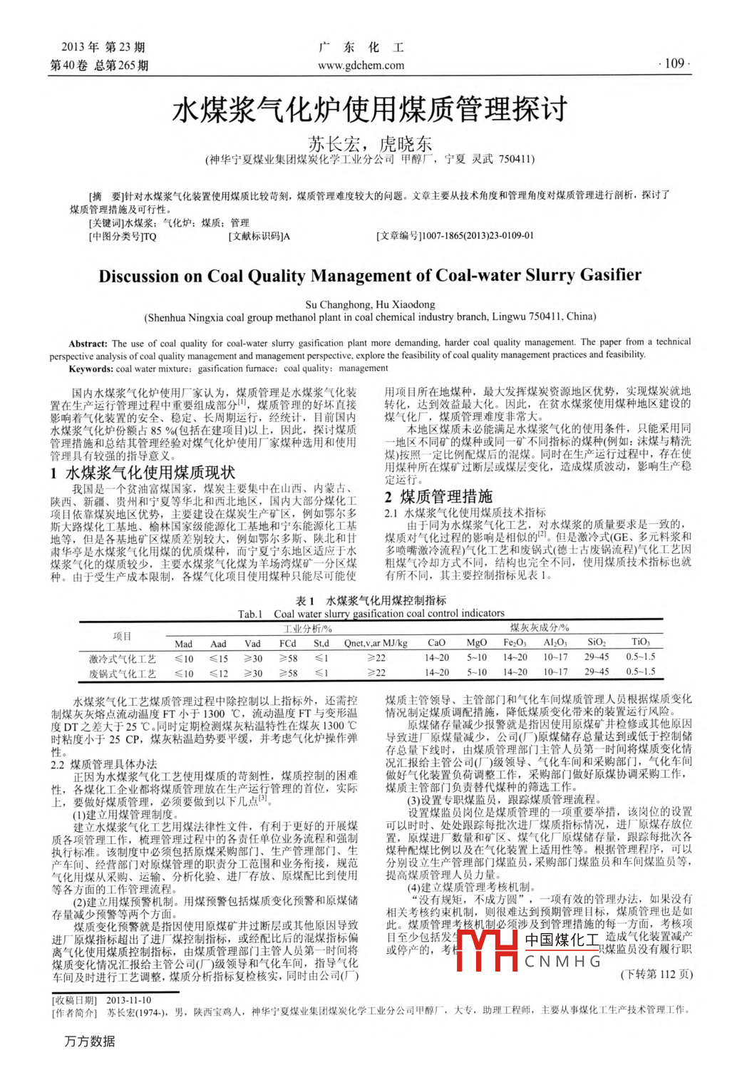 2013年第23期廣東化工第40卷總第265期www.gdchem.com109水煤漿氣化爐使用煤質(zhì)管理探討蘇長(zhǎng)宏,虎曉東(神華寧夏煤業(yè)集團(tuán)煤炭化學(xué)工業(yè)分公司甲醇廠,寧夏靈武750411)「摘要]針對(duì)水煤漿氣化裝置使用煤質(zhì)比較苛刻,煤質(zhì)管理難度較大的問題。文章主要從技術(shù)角度和管理角度對(duì)煤質(zhì)管理進(jìn)行剖析,探討了煤質(zhì)管理措施及可行性[關(guān)鍵詞]水煤漿:氣化爐;煤質(zhì);管理圖分類號(hào)TQ[文獻(xiàn)標(biāo)識(shí)碼]A[文章編號(hào)]1007-1865(2013)23010901Discussion on Coal Quality Management of Coal-water Slurry GasifierSu Changhong, Hu Xiaodong(Shenhua Ningxia coal group methanol plant in coal chemical industry branch, Lingwu 750411, China)Abstract: The use of coal quality for coal-water slurry gasification plant more demanding, harder coal quality management. The paper from a technicalrspective analysis of coal quality management and management perspective, explore the feasibility of coal quality management practices and feasibilityKeywords: coal water mixture: gasification furnace: coal quality: management國內(nèi)水煤漿氣化爐使用廠家認(rèn)為,煤質(zhì)管理是水煤漿氣化裝種,最大發(fā)揮煤炭資源地區(qū)優(yōu)勢(shì),實(shí)現(xiàn)煤炭就地置在生產(chǎn)運(yùn)行管理過程中重要組成部分,煤質(zhì)管理的好壞直接轉(zhuǎn)化,達(dá)到效益最大化。因此,在貧水煤漿使用煤種地區(qū)建設(shè)的影響著氣化裝置的安全、穩(wěn)定、長(zhǎng)周期運(yùn)行,經(jīng)統(tǒng)計(jì),目前國內(nèi)煤氣化廠,煤質(zhì)管理難度非常大。水煤漿氣化爐份額占85%(包括在建項(xiàng)目)以上,因此,探討煤質(zhì)管理措施和總結(jié)其管理經(jīng)驗(yàn)對(duì)煤氣化爐使用廠家煤種選用和使用地區(qū)不同礦的煤種或同一礦不同指標(biāo)的煤種(例如:沫煤與精洗管理具有較強(qiáng)的指導(dǎo)意義煤)按照一定比例配煤后的混煤。同時(shí)在生產(chǎn)運(yùn)行過程中,存在使1水煤漿氣化使用煤質(zhì)現(xiàn)狀用煤種所在煤礦過斷層或煤層變化,造成煤質(zhì)波動(dòng),影響生產(chǎn)穩(wěn)定運(yùn)行陜西、疆、賈州和寧復(fù)等華北和西北地區(qū),國內(nèi)大部分煤化工2煤質(zhì)管理措施2.1水煤漿氣化使用煤質(zhì)技術(shù)指標(biāo)斯大路煤化工基地、榆林國家級(jí)能源化工基地和寧東能源化工基由于同為水煤漿氣化工藝,對(duì)水煤漿的質(zhì)量要求是一致的地等,但是各基地礦區(qū)煤質(zhì)差別較大,例如鄂爾多斯、陜北和甘煤質(zhì)對(duì)氣化過程的影響是相似的2。但是激冷式(GE、多元料漿和肅華亭是水煤漿氣化用煤的優(yōu)質(zhì)煤種,而寧夏寧東地區(qū)適應(yīng)于水多噴嘴激冷流程)氣化工藝和廢鍋式(德士古廢鍋流程)氣化工藝因煤漿氣化的煤質(zhì)較少,主要水煤漿氣化煤為羊場(chǎng)灣煤礦一分區(qū)煤粗煤氣冷卻方式不同,結(jié)構(gòu)也完全不同,使用煤質(zhì)技術(shù)指標(biāo)也就種。由于受生產(chǎn)成本限制,各煤氣化項(xiàng)目使用煤種只能盡可能使有所不同,其主要控制指標(biāo)見表1。表1水煤漿氣化用煤控制指標(biāo)Tab 1 Coal water slurry gasification coal control indicators工業(yè)分析煤灰灰成分%Mad Aad Vad FCd St, d Qnet, v, ar MJ/kg Cao Mgo Fe O, Al2O3 SiO: TiO激冷式氣化工藝≤10≤15≥30≥58≤114-205-1014-2010-1729-450.5-1.5廢鍋式氣化工藝≤10≤12≥30≥58114-205-10142010-1729450.5-1.5水煤漿氣化工藝煤質(zhì)管理過程中除控制以上指標(biāo)外,還需控煤質(zhì)主管領(lǐng)導(dǎo)、主管部門和氣化車間煤質(zhì)管理人員根據(jù)煤質(zhì)變化制煤灰灰熔點(diǎn)流動(dòng)溫度FT小于1300℃,流動(dòng)溫度FT與變形溫情況制定煤質(zhì)調(diào)配措施,降低煤質(zhì)變化帶來的裝置運(yùn)行風(fēng)險(xiǎn)度DT之差大于25℃。同時(shí)定期檢測(cè)煤灰粘溫特性在煤灰1300℃原煤儲(chǔ)存量減少報(bào)警就是指因使用原煤礦井檢修或其他原因時(shí)粘度小于25CP,煤灰粘溫趨勢(shì)要平緩,并考慮氣化爐操作彈導(dǎo)致進(jìn)廠原煤量減少,公司(廠)原煤儲(chǔ)存總量達(dá)到或低于控制儲(chǔ)存總量下線時(shí),由煤質(zhì)管理部門主管人員第一時(shí)間將煤質(zhì)變化情2.2煤質(zhì)管理具體辦法況匯報(bào)給主管公司(廠)級(jí)領(lǐng)導(dǎo)、氣化車間和采購部門,氣化車間性,各煤化工企業(yè)都將煤質(zhì)管理放在生產(chǎn)運(yùn)行管理的首位,實(shí)際煤質(zhì)主管部門負(fù)責(zé)替代煤種的篩選工作。上,要做好煤質(zhì)管理,必須要做到以下幾點(diǎn)。(3)設(shè)置專職煤監(jiān)員,跟蹤煤質(zhì)管理流程1)建立用煤管理制度。設(shè)置煤監(jiān)員崗位是煤質(zhì)管理的一項(xiàng)重要舉措,該崗位的設(shè)置建立水煤漿氣化工藝用煤法律性文件,有利于更好的開展煤可以時(shí)時(shí)、處處跟蹤每批次進(jìn)廠煤質(zhì)指標(biāo)情況,進(jìn)廠原煤存放位質(zhì)各項(xiàng)管理工作,梳理管理過程中的各責(zé)任單位業(yè)務(wù)流程和強(qiáng)制置,原煤進(jìn)廠數(shù)量和礦區(qū)、煤氣化廠原煤儲(chǔ)存量,跟蹤每批次各執(zhí)行標(biāo)準(zhǔn)。該制度中必須包括原煤采購部門、生產(chǎn)管理部門、生煤種配煤比例以及在氣化裝置上適用性等。根據(jù)管理程序,可以產(chǎn)車間、經(jīng)營部門對(duì)原煤管理