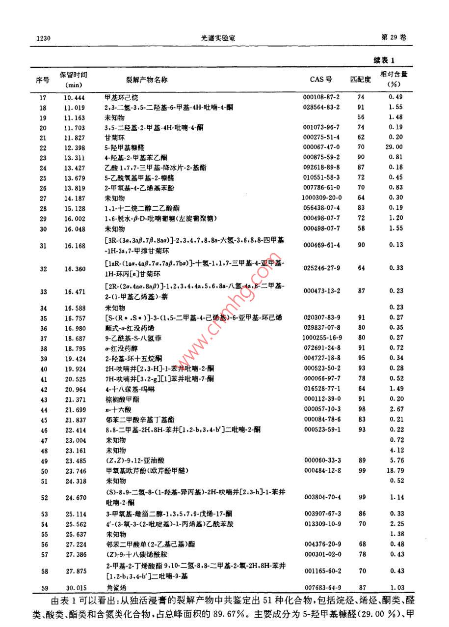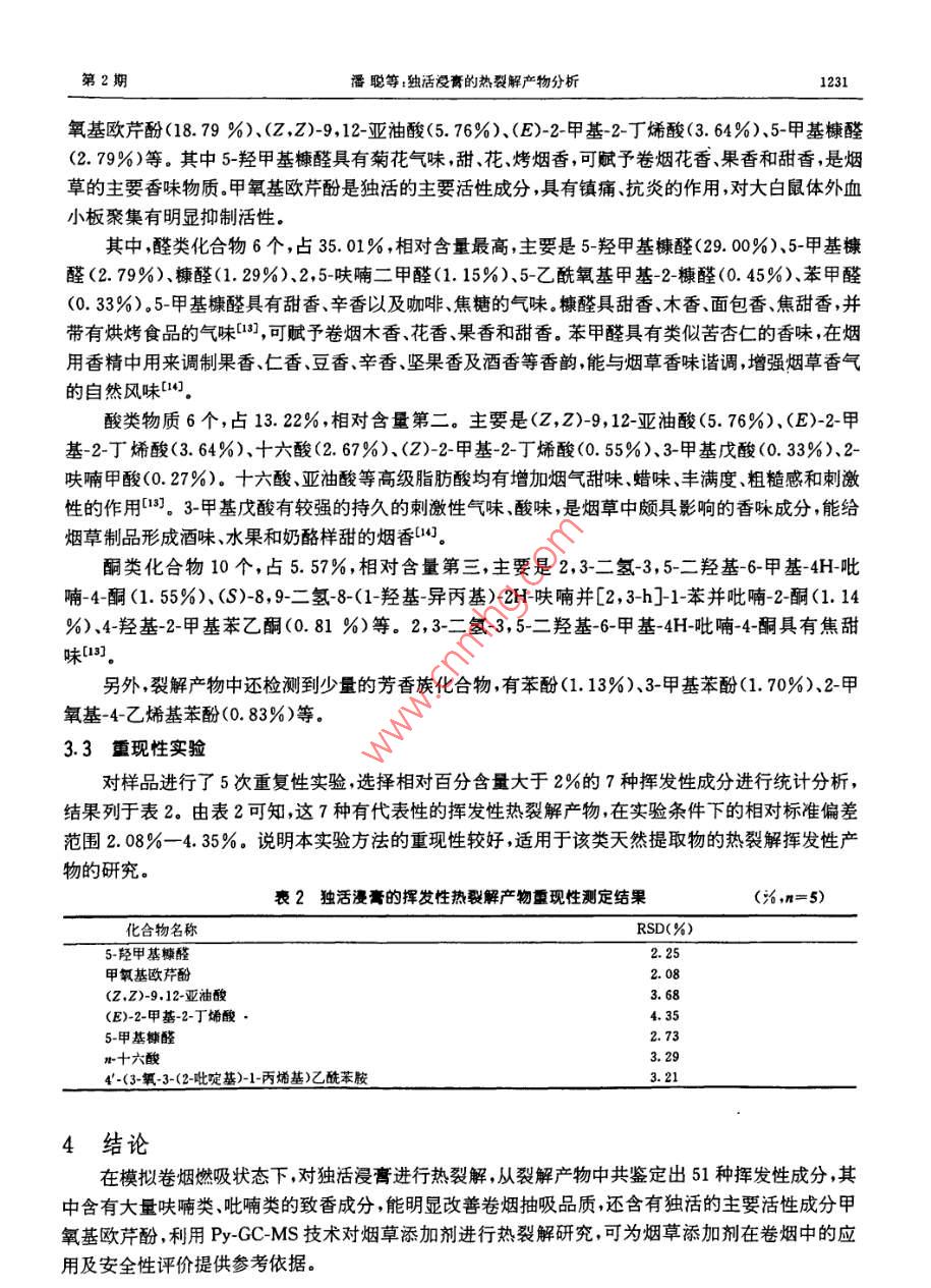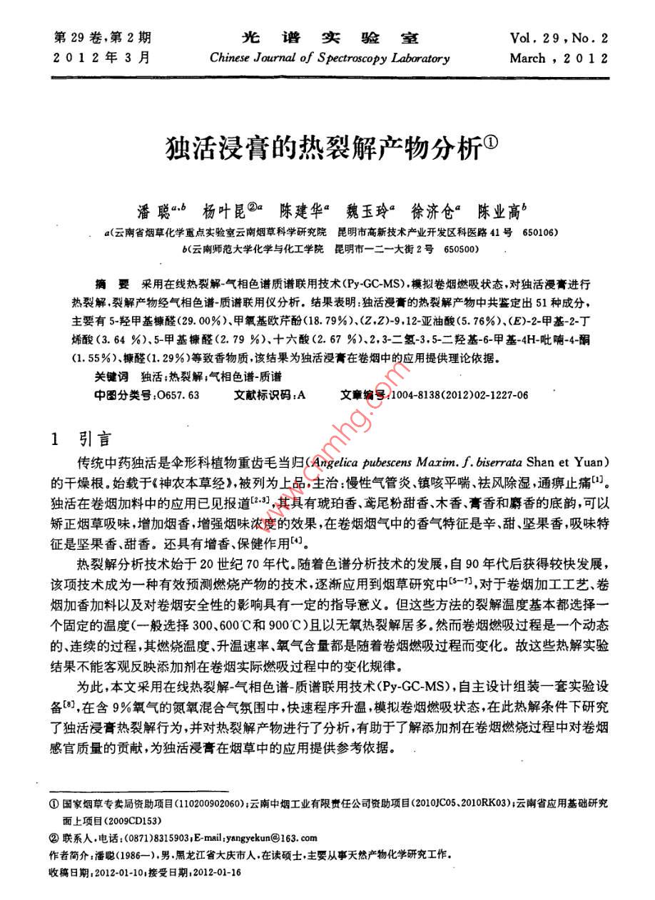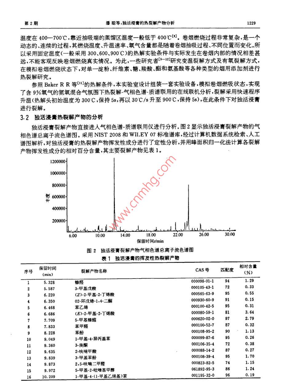 第29卷第2期光譜實(shí)驗(yàn)室Vol, 29, No. 22012年3月Chinese Journal of Spectroscopy LaboratoryMarch,201 2獨(dú)活浸膏的熱裂解產(chǎn)物分析①潘聰“b楊葉昆③陳建華“魏玉玲徐濟(jì)倉(cāng)“陳業(yè)高ba(云南省煙草化學(xué)重點(diǎn)實(shí)驗(yàn)室云南煙草科學(xué)研究院昆明市高新技木產(chǎn)業(yè)開發(fā)區(qū)科醫(yī)路41號(hào)650106)b(云南師范大學(xué)化學(xué)與化工學(xué)院昆明市一二一大街2號(hào)650500)摘要采用在線熱裂解氣相色譜質(zhì)譜聯(lián)用技術(shù)( Py-GC-MS)模擬卷煙燃吸狀態(tài),對(duì)獨(dú)活漫膏進(jìn)行熱裂解裂解產(chǎn)物經(jīng)氣相色譜質(zhì)譜聯(lián)用儀分析,結(jié)果表明:獨(dú)活浸膏的熱裂解產(chǎn)物中共鑒定出51種成分,主要有5-羥甲基糠醛(29.00%)甲氧基歐芹酚(18.79%)、(zZ)-9,12亞油酸(5.76%)、(E)-2-甲基-2-丁烯酸(3.64%)、5-甲基糠醛(2.79%)十六酸(2.67%)、2,3-二氫-3,5二羥基6-甲基4H-吡喃-4-酮(1.55%)糠醛(1.29%)等致香物質(zhì),該結(jié)果為獨(dú)活浸膏在卷煙中的應(yīng)用提供理論依據(jù)關(guān)鍵詞獨(dú)活;熱裂解;氣相色譜-質(zhì)譜中圖分類號(hào):0657.63文獻(xiàn)標(biāo)識(shí)碼:A文章編號(hào):1004-8138(2012)02-1227-061引言傳統(tǒng)中藥獨(dú)活是傘形科植物重齒毛當(dāng)歸( Angelica pubescens Marin,f. biserrata shan et yuan)的干燥根。始載于《神農(nóng)本草經(jīng)》,被列為上品,主治:慢性氣管炎、鎮(zhèn)咳平喘祛風(fēng)除濕通痹止痛口。獨(dú)活在卷煙加料中的應(yīng)用已見報(bào)道13,其具有琥珀香鳶尾粉甜香木香膏香和麝香的底韻,可以矯正煙草吸味,增加煙香,增強(qiáng)煙味濃度的效果,在卷煙煙氣中的香氣特征是辛、甜、堅(jiān)果香,吸味特征是堅(jiān)果香、甜香。還具有增香、保健作用熱裂解分析技術(shù)始于20世紀(jì)70年代。隨著色譜分析技術(shù)的發(fā)展,自90年代后獲得較快發(fā)展該項(xiàng)技術(shù)成為一種有效預(yù)測(cè)燃燒產(chǎn)物的技術(shù)逐漸應(yīng)用到煙草研究中們,對(duì)于卷煙加工工藝卷煙加香加料以及對(duì)卷煙安全性的影響具有一定的指導(dǎo)意義。但這些方法的裂解溫度基本都選擇個(gè)固定的溫度(一般選擇300、600℃C和900C)且以無(wú)氧熱裂解居多然而卷煙燃吸過程是一個(gè)動(dòng)態(tài)的、連續(xù)的過程,其燃燒溫度、升溫速率、氧氣含量都是隨著卷煙燃吸過程而變化。故這些熱解實(shí)驗(yàn)結(jié)果不能客觀反映添加劑在卷煙實(shí)際燃吸過程中的變化規(guī)律為此,本文采用在線熱裂解氣相色譜-質(zhì)譜聯(lián)用技術(shù)( Py-GC-MS),自主設(shè)計(jì)組裝一套實(shí)驗(yàn)設(shè)備③,在含9%氧氣的氮氧混合氣氛圍中,快速程序升溫模擬卷煙燃吸狀態(tài)在此熱解條件下研究了獨(dú)活浸膏熱裂解行為,并對(duì)熱裂解產(chǎn)物進(jìn)行了分析,有助于了解添加劑在卷煙燃燒過程中對(duì)卷煙感官質(zhì)量的貢獻(xiàn),為獨(dú)活浸膏在煙草中的應(yīng)用提供參考依據(jù)。①國(guó)家煙草專賣局資助項(xiàng)目(110200902060);云南中煙工業(yè)有限貴任公司資助項(xiàng)目(2010C05、2010RK03);云南省應(yīng)用基礎(chǔ)研究面上項(xiàng)目(2009cD153)②聯(lián)系人,電話:(0871)8315903E-mail:yangyekun@163.com作者簡(jiǎn)介:潘聰(1986),男黑龍江省大慶市人在讀碩士主要從事天然產(chǎn)物化學(xué)研究工作,收稿日期:2012-01-101接受日期:2012-01-161228光譜實(shí)驗(yàn)室第29卷2實(shí)驗(yàn)部分2.1材料、儀器與試劑獨(dú)活(云南鴻翔藥業(yè)有限公司)。7890A/5975C型氣相色譜質(zhì)譜聯(lián)用儀(美國(guó)安捷倫公司)配CIs4型大體積冷進(jìn)樣口(德國(guó)Gerstel公司); Pyroprobe5200型熱裂解儀(美國(guó)CDS公司);AG204型電子天平(感量0.001g,瑞士 Mettler Toledo公司);R-215型旋轉(zhuǎn)蒸發(fā)儀(瑞士 Buchi公司)無(wú)水乙醇(分析純,9.7%西隴化工股份有限公司)。2.2實(shí)驗(yàn)方法2.2.1獨(dú)活浸青的制備干燥的獨(dú)活500g粉碎,過40目篩,用體積分?jǐn)?shù)95%乙醇加熱回流3次合并提取液,用旋轉(zhuǎn)蒸發(fā)儀回收溶劑,得浸膏100g備用。2.2.2熱裂解條件熱裂解氛圍:含9%氧氣的氮氧混合氣;總裂解氣流速:4.6mL/s;熱裂解探頭(熱解頭)初始溫度300C,保持5s再以30C·s升至900C,保持5s2.23GC-MS分析條件CS冷進(jìn)樣口條件:-60C保持0.5min,以12℃/s升至260℃保持1min,再以10c/s升至350C保持5min氣相色譜條件:色譜柱為HP5Ms型毛細(xì)管柱(30m×0.25mm×0.25m,美國(guó)安捷倫公司);載氣為氦氣(純度為99.999%),載氣壓力(恒壓):1.03×10Pa;升溫程序:起始溫度40C,保持3min,以10C/min升至240C,再以20℃/min升至280C保持5min進(jìn)樣口溫度280c;分流比為100:1質(zhì)譜條件:電子轟擊離子源電子能量70eV;離子源溫度:230C;接口溫度280C;四極桿溫度:150c;質(zhì)量掃描范圍:35-450amu;溶劑延遲時(shí)間:5min2.24 Py-GC-MS分析取裂解儀專用石英裂解管一根,在中央位置裝填農(nóng)殘級(jí)石英棉,用液體進(jìn)樣器吸取獨(dú)活浸膏樣品約1mg,注射到石英棉上,然后將裂解管放入裂解儀中按設(shè)定的裂解條件進(jìn)行裂解。熱裂解產(chǎn)物直按進(jìn)入氣相色譜-質(zhì)譜聯(lián)用儀中進(jìn)行分析。圖1為實(shí)驗(yàn)裝置示意圖丘控制進(jìn)樣口熱裂解儀GC-MS圖1實(shí)驗(yàn)裝置示意圖3結(jié)果與討論3.1獨(dú)活浸膏熱裂解條件選擇卷煙熱解蒸餾區(qū)的溫度