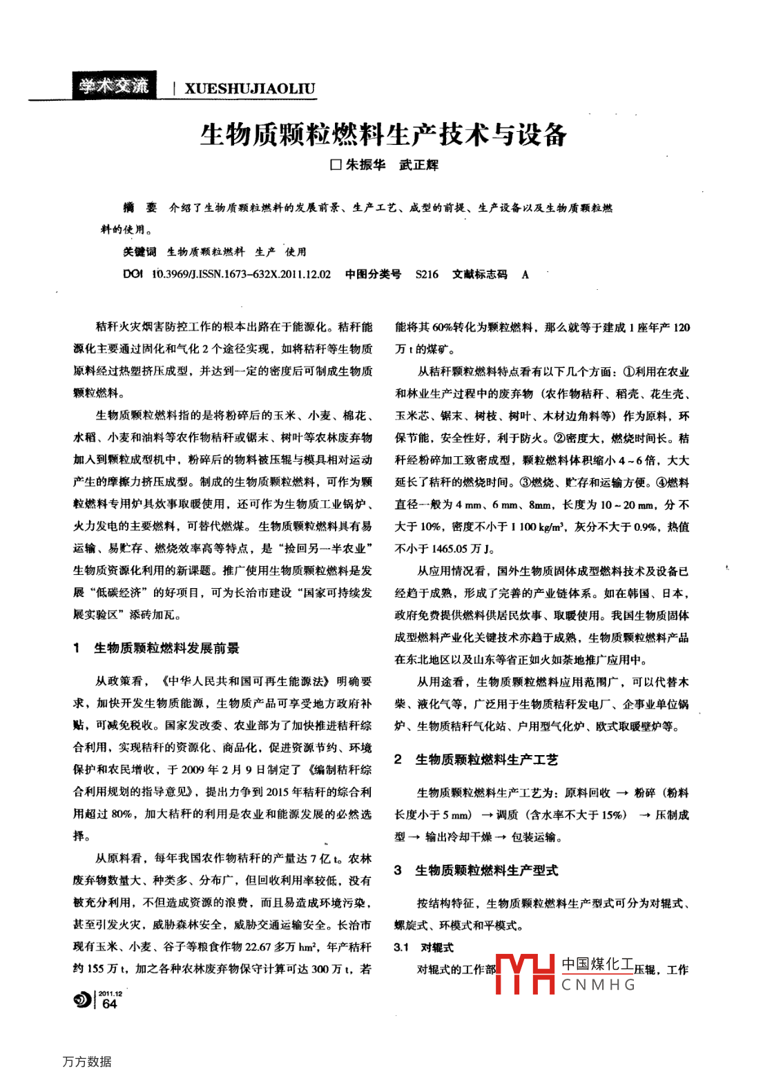 學(xué)術(shù)交流|| XUESHUIAOLIU生物質(zhì)顆粒燃料生產(chǎn)技術(shù)與設(shè)備口朱振華武正輝耥要介紹了生物質(zhì)顆粒燃料的發(fā)展前景、生產(chǎn)工藝、成型的前提、生產(chǎn)設(shè)備以及生物質(zhì)顆粒燃料的使用失鍵詞生物質(zhì)顆粒燃料生產(chǎn)使用Do10.3969 J. ISSN1673-632X2011120中圖分類號(hào)S216文獻(xiàn)標(biāo)志碼A秸稈火災(zāi)煙害防控工作的根本出路在于能源化。秸稈能能將其60%轉(zhuǎn)化為顆粒燃料,那么就等于建成1座年產(chǎn)120源化主要通過固化和氣化2個(gè)途徑實(shí)現(xiàn),如將秸稈等生物質(zhì)萬t的煤礦原料經(jīng)過熱塑擠壓成型,并達(dá)到一定的密度后可制成生物質(zhì)從秸稈顆粒燃料特點(diǎn)看有以下幾個(gè)方面:①利用在農(nóng)業(yè)顆粒燃料。和林業(yè)生產(chǎn)過程中的廢棄物(農(nóng)作物秸稈、稻殼、花生殼、生物質(zhì)顆粒燃料指的是將粉碎后的玉米、小麥、棉花、玉米芯、鋸末、樹枝、樹葉、木材邊角料等)作為原料,環(huán)水稻、小麥和油料等農(nóng)作物秸稈或鋸末、樹葉等農(nóng)林廢棄物保節(jié)能,安全性好,利于防火。②密度大,燃燒時(shí)間長(zhǎng)。秸加入到顆粒成型機(jī)中,粉碎后的物料被壓輥與模具相對(duì)運(yùn)動(dòng)稈經(jīng)粉碎加工致密成型,顆粒燃料體積縮小4-6倍,大大產(chǎn)生的摩擦力擠壓成型。制成的生物質(zhì)顆粒燃料,可作為顆延長(zhǎng)了秸稈的燃燒時(shí)間。③燃燒、貯存和運(yùn)輸方便。④燃料粒燃料專用爐具炊事取暖使用,還可作為生物質(zhì)工業(yè)鍋爐、直徑一般為4mm、6mm、8mm,長(zhǎng)度為10~20mm,分不火力發(fā)電的主要燃料,可替代燃煤。生物質(zhì)顆粒燃料具有易大于10%,密度不小于1100kgm3,灰分不大于0%,熱值運(yùn)輸、易貯存、燃燒效率高等特點(diǎn),是“撿回另一半農(nóng)業(yè)”不小于1465.05萬J。生物質(zhì)資源化利用的新課題。推廣使用生物質(zhì)顆粒燃料是發(fā)從應(yīng)用情況看,國(guó)外生物質(zhì)固體成型燃料技術(shù)及設(shè)備已展“低碳經(jīng)濟(jì)”的好項(xiàng)目,可為長(zhǎng)治市建設(shè)“國(guó)家可持續(xù)發(fā)經(jīng)趨于成熟,形成了完善的產(chǎn)業(yè)鏈體系。如在韓國(guó)、日本,展實(shí)驗(yàn)區(qū)”添磚加瓦。政府免費(fèi)提供燃料供居民炊事、取暖使用。我國(guó)生物質(zhì)固體成型燃料產(chǎn)業(yè)化關(guān)鍵技術(shù)亦趨于成熟,生物質(zhì)顆粒燃料產(chǎn)品1生物質(zhì)顆粒燃料發(fā)展前景在東北地區(qū)以及山東等省正如火如茶地推廣應(yīng)用中。從政策看,(中華人民共和國(guó)可再生能源法》明確要從用途看,生物質(zhì)顆粒燃料應(yīng)用范圍廣,可以代替木求,加快開發(fā)生物質(zhì)能源,生物質(zhì)產(chǎn)品可享受地方政府補(bǔ)柴、液化氣等,廣泛用于生物質(zhì)秸稈發(fā)電廠、企事業(yè)單位鍋貼,可減免稅收。國(guó)家發(fā)改委、農(nóng)業(yè)部為了加快推進(jìn)秸稈綜爐、生物質(zhì)秸稈氣化站、戶用型氣化爐、歐式取暖壁爐等。合利用,實(shí)現(xiàn)秸稈的資源化、商品化,促進(jìn)資源節(jié)約、環(huán)境保護(hù)和農(nóng)民增收,于2009年2月9日制定了《編制秸稈綜2生物質(zhì)顆粒燃料生產(chǎn)工藝合利用規(guī)劃的指導(dǎo)意見》,提出力爭(zhēng)到2015年秸稈的綜合利生物質(zhì)顆粒燃料生產(chǎn)工藝為:原料回收→粉碎(粉料用超過8%,加大秸稈的利用是農(nóng)業(yè)和能源發(fā)展的必然選長(zhǎng)度小于5mm)→調(diào)質(zhì)(含水率不大于15%)→壓制成擇型→輸出冷卻干燥→包裝運(yùn)輸。從原料看,每年我國(guó)農(nóng)作物秸稈的產(chǎn)量達(dá)7億t。農(nóng)林廢棄物數(shù)量大、種類多、分布廣,但回收利用率較低,沒有3生物質(zhì)顆粒燃料生產(chǎn)型式被充分利用,不但造成資源的浪費(fèi),而且易造成環(huán)境污染,按結(jié)構(gòu)特征,生物質(zhì)顆粒燃料生產(chǎn)型式可分為對(duì)輥式、甚至引發(fā)火災(zāi),威脅森林安全,威脅交通運(yùn)輸安全。長(zhǎng)治市螺旋式、環(huán)模式和平模式?,F(xiàn)有玉米、小麥、谷子等糧食作物2267多萬hm2,年產(chǎn)秸稈31對(duì)輥式約155萬t,加之各種農(nóng)林廢棄物保守計(jì)算可達(dá)300萬t,若對(duì)輥式的工作部HH中國(guó)煤化工壓輥,工作CNMHGXUESHUJIAOLIU|學(xué)術(shù)交流時(shí)兩輥相對(duì)運(yùn)動(dòng),將落入窩眼的粉料擠壓成顆粒。該結(jié)構(gòu)的5生物質(zhì)顆粒燃料生產(chǎn)設(shè)備缺點(diǎn)是擠壓作用時(shí)間短、顆粒密度低32螺旋式生物質(zhì)燃料成型設(shè)備選型的原則是技術(shù)先進(jìn)、經(jīng)濟(jì)適螺旋式的結(jié)構(gòu)與絞肉機(jī)相似,由擠壓螺旋推進(jìn)器、壓縮用、可靠性高、安全耐用、工藝成套性高、節(jié)能環(huán)保、維修室、模孔和切斷刀組成,工作時(shí)擠壓螺旋推進(jìn)器把壓縮室內(nèi)經(jīng)濟(jì)方便、生產(chǎn)效率高等。目前,可靠性高的結(jié)構(gòu)為環(huán)模機(jī)的粉料向前推擠,使其穿過模板孔型成圓柱形,隨后被切刀與平模機(jī),可根據(jù)個(gè)人的經(jīng)濟(jì)實(shí)力、秸稈資源狀況和生產(chǎn)規(guī)切成粒狀。該結(jié)構(gòu)多用于生產(chǎn)膨化飼料,缺點(diǎn)是螺旋絞龍壽模選定。命短。51大型