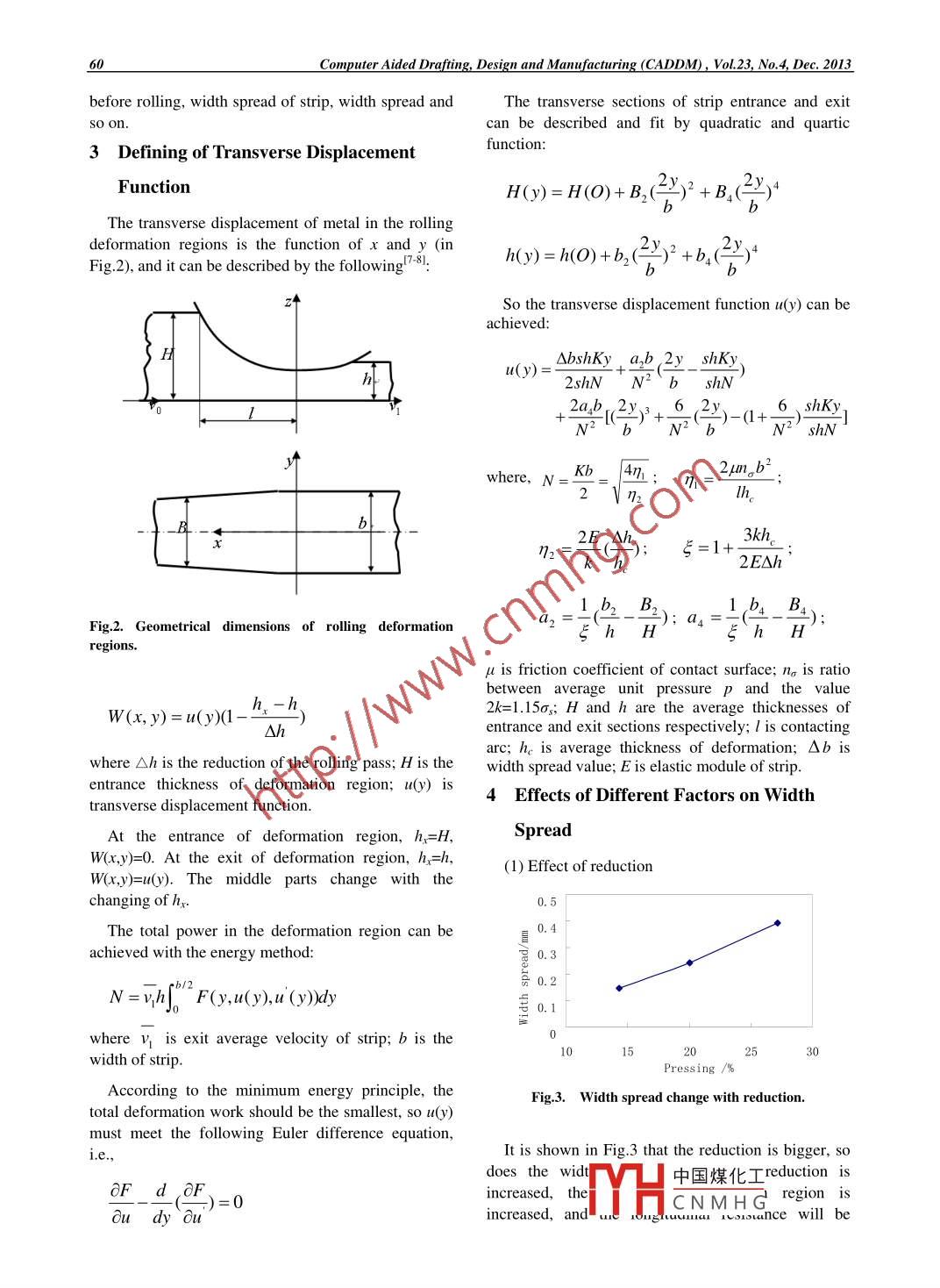圖學(xué)美Computer Aided Drafting, Design and ManufacturingCADDMVolume 23, Number 4, December 2013, Page 58GDGRAPHICSAnalysis on Width Spread of Cold Rolled StripYANG Guang-hui, DENG ChiSchool of Mechanical Engineering, University of Science and Technology Bejjing, Bejjing 100083, China.Abstract: Width spread is usually considered in hot rolling, nevertheless, it can be ignore in cold rolling. In order to control theCrown and flatness better simultaneously and realize the decoupling of crown and flatness, the transverse displacement function ofstrip is defined and deduced. The factors that affects the width spread are analyzing with the function. According to the unchangedprinciple of volume before and after rolling, the flatness model which considers the width spread is deduced. Through the model, thetransverse metal flowing of different stands and different thickness is analyzing, it is found that the width spread is biggest in coldrolling at the No.1 stand because of the maximum thickness and reduction and the minimum deformation resistance. It gives a goodfoundation for the decoupling of crown and flatness.Key words: width spread; decoupling; cold rolling; transverse metal flowing; flatness1 Introductionaccount in order to analyze the shape of strip .correctlyl-.])Shape control of strip include crown control and2 Proportion Crown of Differentflatness, and crown is the direct target of control,while it is a condition of realizing flatness target thatConditionscontrolling proportion crown equivalent between theneighboring stands. During controlling, it is2.1 Establishment of Flatness Modelimpossible to meet the target values of crown anproportion crown simultaneously, so there existsH+0Hcoupling relationship between crown and flatness, andit must be decoupled. When the shapes of rawmaterials and final products are both good, it mustabide by the principle of proportion crownequivalence, and that is:h+ OhhCn_ CHHOb + OB2Ob+ 0b2where CH and Ch are the entrance crown and exitcrown of strip respectively, and H and h are theentrance thickness and exit thickness of stripFig.1. Transverse section of strip before and after rolling.respectively.Actually,the principle of proportion crownSuppose take a longitudinal fiber from middle andequivalence does not consider the transverse metaledge parts of strip respectively as shown in Fig.1. Theflowing in the deformation area, when the strip iswidth, thickness and length of fiber in the middle partrolled, the deformations of width spread are differentbefore rolling are △b, H and L, and the width,and non-uniform in the different transverse regions,thickness and length of fiber in the edge part beforeand it directly affects the elongation change of strip,rolling are△b,中國(guó)煤化工orrespondingso the transverse metal flowing must be taken intowidth, thicknesYHCN M H G middle partProject Item: Supported by Beijing Higher Education Young Elite Teacher Project (No. YETP0369).Corresponding author: Y ANG Guang-hui, Male, Doctor, Associate Professor, E-mail: yanggh@ ustb. edu.cnYANG Guang-hui et al, Analyzing on Width Spread of Cold Rolled Strip59after rolling are△b+b), h and l, and the corresponding(Ob +△b)width, thickness and length of fiber in the edge par(Ob+Ob,)after rolling are△b+ b2, h +△h andl +△I. Accordingto the unchanged principle of volume before and afterDefine the proportion crown coefficient:rolling, it can be achieved:Nb.H .L= (Nb + Nb).h.l(1+△H.H、△Ob(H + AH).(L +△L)=(Ob + Ob2).(h +△h).(l +△l)hwhere△H and△h are transverse thickness deviationbefore and after rolling;△L and△l are fiber lengthDefine the flatness coefficient:deviation before and after rolling; Ob1 is width spreadof fiber in the edge part of strip after rolling; △b2 isε=1+width spread of fiber in the middle part of strip afterLrolling.The above two equations can be described:The flatness of strip can be described by thefollowing formula:Nb.H.L(Ob +△b).h△x10 =(2.k.ε-1)x10'Nb.(H + AH).(L +△L)(l+ NI)=(Ob +△b2).(h +△h)So it can be seen from above equation that the finalshape of strip is connected with the width spreadcoefficient h, the proportion crown coefficient k andSo the flatness of strip can be described by thethe flatness coefficient 8.2.2 Analysis on Proportion Crown(Qb +△b)1+△HH'In order to achieve a good shape of strip and make“x10s =5-.(1+)-1x10*the flatness△ll minimum, the proportion crowns of(△b + Ob2)different conditions are analyzed in Table.1, and it canbe shown that proportion crown should change withthe shape of strip before rolling so as to achieve goodDefine the width spread coefficient:shapes of strip.Table 1. Analyzing on Proportion Crown of Different ConditionsWidth spreadFlatness cofficient Shape before rollingProportion crowncoefficientHShmiddle bucklek<1AH Nc=1no buckle defect<號(hào)λ>10H、Shk2ledge buckleHhAH<△hAH、Ohk≥18>1sH. Sh2<1AH、Shk>1ε<1AH。Nε>1λ=1k=1AH_ Sh中國(guó)煤化工TYHCNM HG_Whether the final shape of strip or not, it isdetermined by many factors such as shape of strip60Computer Aided Drafing, Design and Manufacturing (CADDM), VoL.23. No.4, Dec. 2013before rolling, width spread of strip, width spread andThe transverse sections of strip entrance and exitso on.can be described and fit by quadratic and quarticfunction:3 Defining of Transverse DisplacementFunctionH(y)= H(O)+ B,bThe transverse displacement of metal in the rollingdeformation regions is the function of x and y (inFig.2), and it can be described by the following'-8:h()=h(O)+6b2(2)2 +b.(jy)4zSo the transverse displacement function u(y) can beachieved:?Hu(y)='AbshKy. a,b 2y_ shKy.2shNN2~ bshN2a,b r_ 6 _)shKyN2“bN2 bN2' shNwhere, N= Kb47.2μm。,b22 Vη22E Ah.ξ=1+-3kh.k" h。'2ENhFig.2. Geometrical dimensions of rolling deformationa2:hH'regions.μ is friction coefficient of contact surface; no is ratiobetween average unit pressure p and the value2k=1.15os; H and h are the average thicknesses ofW(x,y)