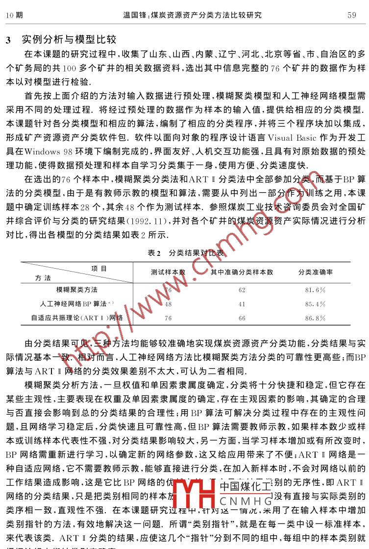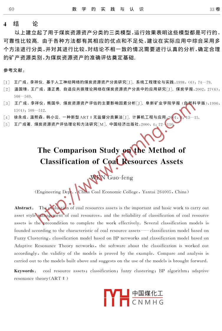 第33卷第10期數(shù)學的實踐與認識Vol. 33 No. 102003年10月MATHEMATICS IN PRACTICE AND THEORYOcto.,2003 .煤炭資源資產(chǎn)分類方法比較研究溫國鋒(中國煤炭經(jīng)濟學院管理科學與工程系,山東煙臺264005)摘要:煤炭資源資產(chǎn)評估是實行煤炭資源資產(chǎn)化管理的重要 基礎(chǔ)工作,而煤炭資源資產(chǎn)分類的可靠性是有效完成這一工作的前提條件.針對煤炭資源資產(chǎn)的特點,建立了多個分類模型一基 于模糊聚類的分類模型、基于BP網(wǎng)絡(luò)的分類模型及基于自適應(yīng)共振理論網(wǎng)絡(luò)的分類模型,編制了相應(yīng)的分類程序軟件包,實例運行效果證明了模型的有效性.文中還對所建模型進行了比較和分析,提出了具體應(yīng)用的建議.關(guān)鍵詞:煤炭資源資產(chǎn) ;分類;模糊聚類; BP算法;自適應(yīng)共振理論(ART I )0引言煤炭資源資產(chǎn)是在現(xiàn)有技術(shù)經(jīng)濟條件下煤炭資源中能被開發(fā)利用而處于社會經(jīng)濟運營中的部分,煤炭資源資產(chǎn)評估,是實行煤炭資源資產(chǎn)化管理、開采權(quán)流轉(zhuǎn)、合理計取資源稅及資源補償費、維護國家所有者權(quán)益的重要基礎(chǔ)工作.煤炭資源分類是煤炭資源評價的基本前提與主要內(nèi)容,煤炭資源資產(chǎn)分類的可靠性直接影響煤炭資源資產(chǎn)評估的準確性與可信度,因此,煤炭資源資產(chǎn)分類研究具有重要的意義.0.2638煤炭資源資產(chǎn)價值受煤層、地質(zhì)、采礦技術(shù)及社貢」 0.3792會經(jīng)濟等眾多因素的影響,對其進行分類是一個多件煤層穩(wěn)定性0.2092煤層傾角」0.4116因素、多層次的綜合評價分類問題。目前煤炭資源C煤炭儲量口0.1045資產(chǎn)分類的方法有多種,如模糊綜合分類法、灰色聚0.51820.3224斷層0.4703地類綜合分類法、基于人工神經(jīng)網(wǎng)絡(luò)BP算法的分類[1]. . 褶皺0.1985及基于自適應(yīng)共振理論網(wǎng)絡(luò)的煤炭資源資產(chǎn)分類模素|條火成巖慢入0.1689巖性」0.2253型[2],本文旨在對有關(guān)模型進行比較與分析,從而得.9.1121出各種模型的特點,以對煤炭資源資產(chǎn)評估工作起瓦斯0.4723涌水量0.3161到借鑒作用.發(fā)火期] 0.2116-[ 地斟可靠性] 0.16120.1941煤炭資源資產(chǎn)價值影響因素分析開拓方式0.3657機械化程度0.2105只有對影響煤炭資源資產(chǎn)價值的因素進行客觀|因]開采深度] 0.4238地分析,才能對其進行科學的分類和評估.通過具0.2875地區(qū)經(jīng)濟0.3561體分析,可把影響煤炭資源資產(chǎn)價值的因素中國煤化工-外運能力運距口0.15480. 2604地質(zhì)因素、技術(shù)因素、社會因素和經(jīng)濟因素MYHCNMHGC煤種比價J02287.并從眾多的因素之中篩選出十九個主要影響因素[3],見圖1.在此主要影響因素分析圖的基礎(chǔ)上即圖1礦產(chǎn)資源價值影響因素分析收稿8期29細據(jù)4基金項目:山東省省然科學基金資助項目[Q99G14]56數(shù)學的實踐與認識33卷可建立多種模型完成煤炭資源資產(chǎn)分類任務(wù).2煤炭資源資產(chǎn)分類模型與方法2.1基于模糊聚類的分類方法煤炭資源資產(chǎn)價值的影響因素評價指標是多因素多層次指標體系.所以,采用基于聚類的評判方法進行煤炭資源資產(chǎn)分類,這種方法是將綜合評判方法和聚類方法結(jié)合起來形成一種新的評判方法.設(shè)A={a, az, ... am}為待評對象集,m為所進行分類的礦井數(shù);B={b, b2, ... b,}為n等級所構(gòu)成的集合;C={Cn, C2, .. Cig,}為評價因素集,i=1,2..p, p為評價指標層次數(shù)目. q;為第i因素層的因素數(shù);其權(quán)重分配為{wI,wr, .. win,},i,q; 符號意義同上.對于任意單因素C,∈C,作出ai∈A屬于b.∈B的程度,可得到一個矩陣(不-定是方陣).2 r2”... r%(1)lr’r2...r_從末層逐層向前進行綜合評判,設(shè)單因素C,∈C的第i+1層子因素對應(yīng)于第i+1層的因素為{C+,C+1+1,... C:+1s+o}, l為因素C的第i+1層子因素的個數(shù),顯然2w+ikk=$= 1,可以得出對因素C;屬于的隸屬度矩陣為>w+er9(+12) .藝r7w+rf$+14)...w+1er9i+1)k=sh=;節(jié),w+1ri+1k)w+1rx2+1k)5。w;+1r%+1k)R) =(2)節(jié)i+1 h>.(i+ 1 k)> W;+1rmtW;+1W;+1rm2W;+1krmtk-:k-s最后得到綜合評判的結(jié)果為:「R{?' R{&) .... R{97R'0) =R{? R紐’ ... R2)(3)l RR)D(0 ;中國煤化工R{*) = max ((4)I≤k≤n0YHCNMHG則R{")所對應(yīng)的類別b%即為礦井l所升米時煤灰貧源資廣奕別.采用模糊聚類模型進行資產(chǎn)分類時,各因素權(quán)重的確定是尤為重要,本研究中,根據(jù)問題影響因素評價指標體系的特點,采用判斷矩陣分析法確定權(quán)重.判斷矩陣中的各元素采用專家調(diào)查法藝縵,經(jīng)過對特征向量歸一化等處理過程得出各因素權(quán)值(標于圖1中),十九個因素的單因素分類標準如表1所示.10期溫國鋒:煤炭資源資產(chǎn)分類方法比較研究57表1單因素的分 類標準表類別因素煤質(zhì)以灰分含量(% )為標準<1010~1515~ 2525~ 35> 35煤層傾角<1212~ 2535~ 45> 45煤炭儲量可供建井規(guī)模(萬噸/年)≥300120~24045~909~30瓦斯(m3/t)<55~1010~15.> 15瓦斯突出.發(fā)火期類別*1) .無原1類原N類地勘可靠性一f值*2)≥0.90.75~0. 90.6~0.750.45~0.6 <0. 45開拓方式平硐平、斜混斜井立、斜混立井開采深度< 300300~ 500500~ 800800~ 1000 : > 1000 .機械化程度f值"3)≥0. 90.9~0.70.7~0.50.5~0.3<0.3地區(qū)經(jīng)濟一以地區(qū) 發(fā)達程度分值(1| 8~106~84~62~41~2~ 10)進行分類運輸能力以外運能力的富裕系數(shù)>1.51.2~1.50.9~1.20.6~0.9