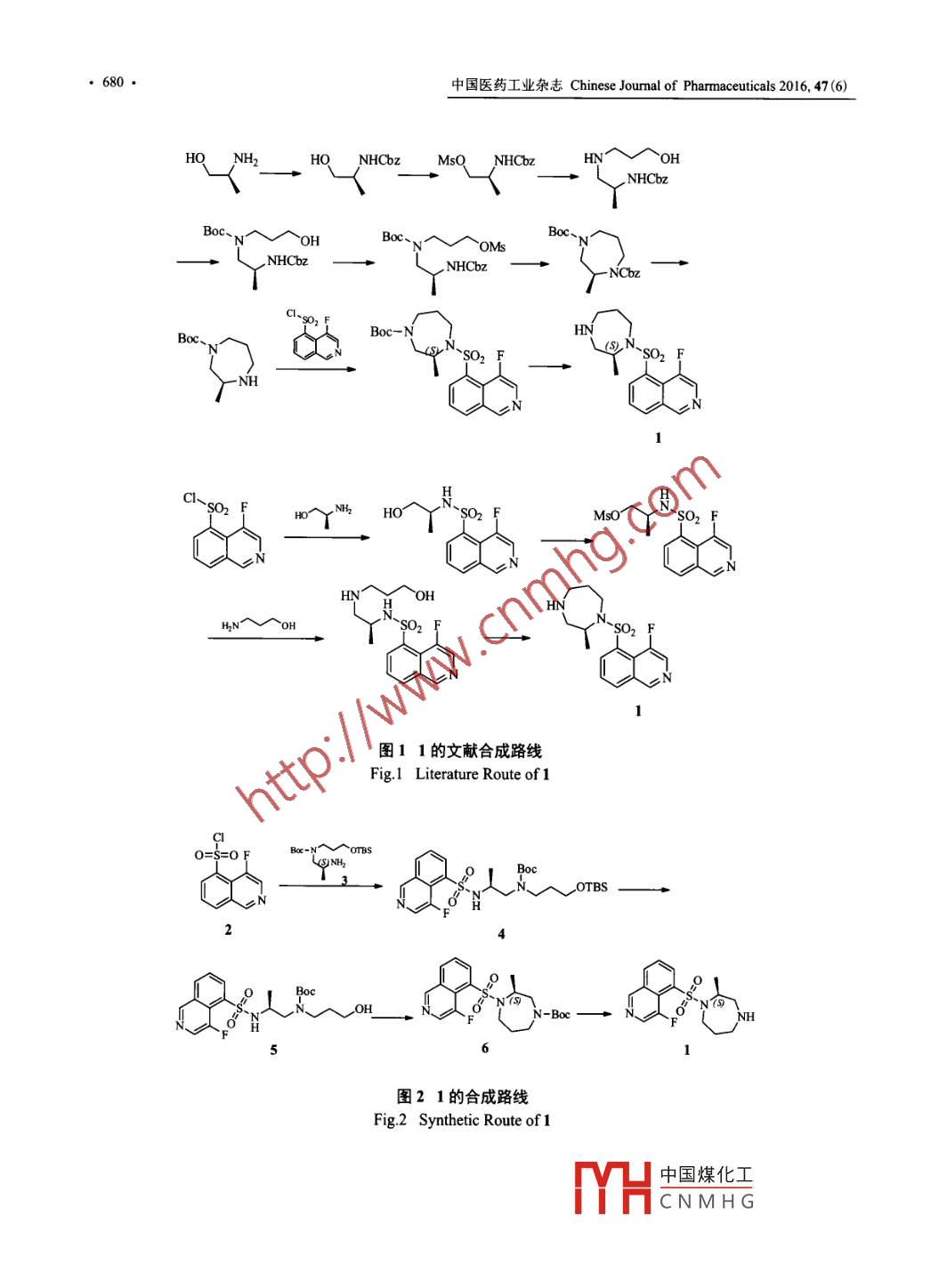 中國醫(yī)藥工業(yè)雜志 Chinese Journal of pharmaceuticals2016,47(6)Ripasud的新合成工藝王小華,李志杰,李志,張留(武昌理工學(xué)院生物多肽糖尿病藥物湖北省協(xié)同創(chuàng)新中心,湖北武漢430223)摘要:4-氟異喹啉-5-磺酰氯與(S)-2-氨基-N-(叔丁氧羰基)-N-(3-叔丁基二甲基硅烷氧基丙基)丙胺發(fā)生偶聯(lián)反應(yīng),經(jīng)TBAF脫去羥基保護(hù)后通過 Mitsunobu反應(yīng)自身環(huán)合,最后脫氨基保護(hù)得到青光眼治療藥物 ripasudil,總收率31.3%。關(guān)鍵詞: ripasudil;青光眼;合成中圖分類號:R988文獻(xiàn)標(biāo)志碼:A文章編號:1001-8255(201606-0679-03Dol:10.16522/ cnki. cjph2016.06.002A New Synthetic Process of RipasudilWANG Xiaohua, Li Zhijie LI Zhi, ZHANG Liu(Wuchang University of Technology, Synergy Innovation Center of Biological Peptide Antidiabetics of Hubei Province, Wuhan 430223)ABSTRACT: Ripasudil was synthesized from 4-fluoroisoquinoline-5-sulfonyl chloride by coupling reaction with(S)-2-amino-N-(tert-butoxycarbonyl)-N-(3-tert-butyldimethylsilyloxypropyl)propylamine, then subjected to hydroxydeprotection with TBAF and then Mitsunobu reaction, followed by Boc deprotection with an overall yield of about 31.3%Key Words: ripasudil; glaucoma; syntRipasudil(1),化學(xué)名為(S)-(4氟異丙胺(3)發(fā)生偶聯(lián)反應(yīng),經(jīng)TBAF脫去羥基保護(hù)后喹啉-5-基)磺?;?2-甲基-1,4-二氮環(huán)庚烷,通過 Mitsunobu反應(yīng)自身環(huán)合,最后脫氨基保護(hù)得2014年9月日本厚生勞動省批準(zhǔn)用于治療青光眼。到1(圖2)。與原有方法比,此法可在溫和的反應(yīng)本品是一種Rho-蛋白激酶2抑制劑2,單用或與條件下實現(xiàn)二氮環(huán)庚烷的合成,操作簡單,收率高。現(xiàn)有治療青光眼和眼高壓的藥物聯(lián)用,可降低原發(fā)實驗部分性開角型青光眼和眼高壓患者的眼內(nèi)壓的(S)-1-(4-氟異喹啉-5-亞磺酰胺基)-N-(叔丁1的合成方法主要有以下2條(圖1)14:①氧羰基)-N-(3-叔丁基二甲基甲硅烷基氧基丙基)-在拼接之前先合成7元氮雜環(huán),閉環(huán)方法多采用胺(4)NaH等強(qiáng)堿,放大生產(chǎn)時不易控制。②在氟異喹啉室溫將3(自制6,2.3g,6.72mmol)溶入環(huán)上逐級串聯(lián),步驟較長,總收率較低。二氯甲烷(15m)中,冷卻至-5~0℃,加入三乙本研究以上述文獻(xiàn)為基礎(chǔ),以如下路線制得胺(0.74g,73mmo)和4-二甲胺基吡啶(0.15g)1:用4氟異喹啉-5-磺酰氯(2)與(S)-2-氨基№-攪拌下緩慢加入2(1.5g,6.lmo),在-5~0℃(叔丁氧羰基)-N-(3-叔丁基二甲基硅烷氧基丙基)反應(yīng)45min后升至室溫反應(yīng)16h,反應(yīng)液中加入水(10ml),用二氯甲烷(8ml×3)萃取,有機(jī)相合并,收稿日期:2016-02經(jīng)無水硫酸鈉干燥后過濾,濾液濃縮,剩余物經(jīng)柱基金項目:湖北省教育廳201計劃(鄂教科函[2012]56號)作者簡介:王小華(1983-),男,高級研究員,從事制藥工程研色譜[洗脫劑:正己烷:乙酸乙酯(81)]純化,得油狀物4(197g,58.2%)。HNMRTel:027-81652972E-mail:msnhm123@gmail.com(400MHz,DMSO-d6)8:939(s,IH),8.74(d,J通信聯(lián)系人:張留(1960-),男,教授,從事藥物研究4.9 Hz, IH)Tel:027-81652958YH中國煤化工94(t,781,E-mail:uslzhang@163.com1H),3.59CNMHG=6.0 Hz, 2H)中國醫(yī)藥工業(yè)雜志 Chinese Joumal of pharmaceuticals2016,47(6)NHCbzNHCbzHNHCbzBoc、NHCbzNHCbzcbzBocsOzSO2圖11的文獻(xiàn)合成路線Fig. I Literature Route of 16·C!一圖21的合成路線Fig2 Synthetic Route of 1中國煤化工CNMHG中國醫(yī)藥工業(yè)雜志 Chinese Journal of pharmaceuticals2016,47(6)681·289~3.01(m,4H),1.66~177(m,2H),1.48(s,(7ml)中,用甲苯(12ml×2)提取,用20%氯化9H),1.08(d,J=6.6Hz,3H),0.91(s,9H),0.05(s,鈉溶液洗滌,經(jīng)無水硫酸鈉干燥后過濾,濾液減壓蒸除溶劑,得淡黃色無定形固體1(0.29g,78%)。(S)-1-(4-氟異喹啉-5-亞磺酰胺基)∽N-(叔丁HNMR(400MHz,DMSO-d)8:947(s,1H,Ar-H)氧羰基)-N-(3-羥丙基)丙胺(5)8.98(s,1H,Ar-H),8.51(d,J=7.9Hz,IH,Ar-H),室溫將4(1.6g,2.88mmo)溶于無水THF826(d,J=7.9Hz,1H,ArH),791(t,J=7.9Hz,IH,(12m)中,加入1mol/L氟化四丁銨(4.03ml,Ar-H),437~452(m,IH,CH,359~368(m,2H,4.03mmo),攪拌反應(yīng)22h,TLC顯示反應(yīng)完成后,CH2),346~349(m,IH,CH,3.18~3.28(m,2H,向反應(yīng)液中加入飽和氯化銨溶液(5m),用二氯甲CH2),2.99~309(m,IH,CH),1.93~2.08(m,2H,烷(6m×3)萃取,有機(jī)層合并,用飽和氯化銨溶CH2),116(d,J=64Hz,3H,CH3)。純度98%[HPLC液(8ml×3)洗滌,經(jīng)無水硫酸鈉干燥后過濾,濾歸一化法:色譜柱 Inertsil ODV-3ⅴ柱(4.6mmx液濃縮,剩余物經(jīng)柱色譜[洗脫劑:二氯甲烷∶甲150mm,5μm);流動相A:水,B:乙腈(0min,醇(30:1→25:1)]純化,得油狀物5(1.02g,A90;6min,A20;10min,A20);檢測波長80.5%)。HNMR(400MHz,DMSO-d)6:9.37(s,20nm;柱溫40℃;流速1.0mlm]。ee值999%IH),873(d,J4.9Hz,IH),8.5(d,J7.8Hz,2H),(HPLC法)。793(,J=78Hz,1H),3.57~368(m,1H),344(t,J=60Hz,2H,2.86~300(m,4H,1.64~1.75(m,參考文獻(xiàn):2H),145(s,9H),1.06(d,J=66Hz,3H)。[1]五味宣明,扇谷忠明,澀谷公幸,異喹啉衍生物或其鹽的(S)-4-[(4氟異喹啉5-基)磺?;鵠-3-甲基新制造方法:中國,103068818A[P].2013-04241,4-二氮環(huán)庚烷-1-羧酸叔丁酯(6)[2] Garnock-Jones KP Ripasudil: First global approval [J]2014,74(18):2211-2215氮?dú)獗Wo(hù)下將5(1g,2.26mmol)溶于無水[3] Tanihara H, Inoue T, Yamamoto T, et al. Intra-ocular pressure-THF(8ml)中,冷卻至-5~0℃,緩慢加入三苯膦lowering effects of a rho kinase inhibitor, ripasudil (K-115)(0.89g,3.39mmo)和DIAD(069g,1.37mmo),over 24 hours in primary open-angle glaucoma and ocular攪拌30min,室溫反應(yīng)8~9h,反應(yīng)液濃縮至干,ypertension: a randomized, open- label, crossover study [J]剩余物經(jīng)柱色譜[洗脫劑:正己烷:丙酮(3:1→A