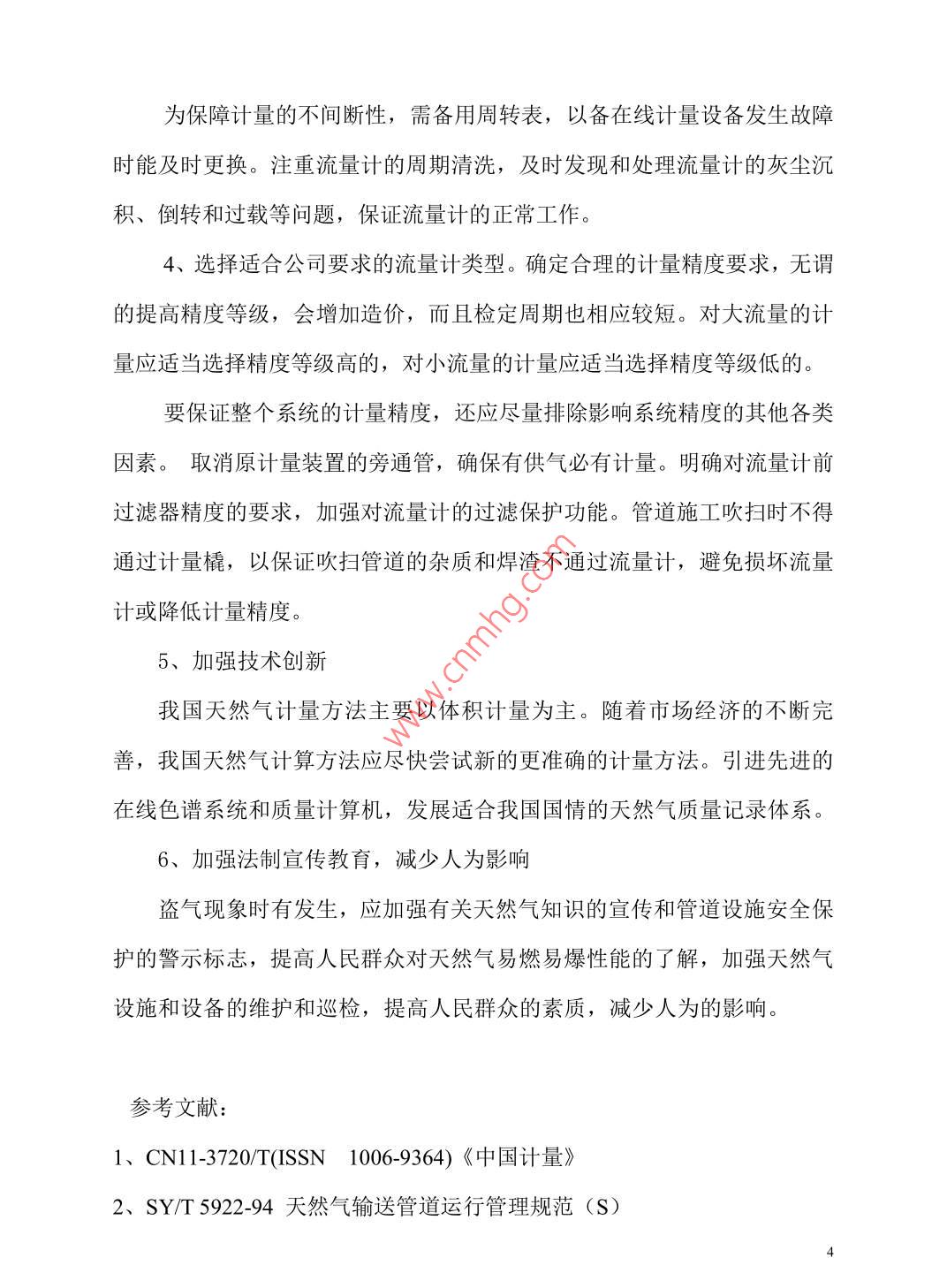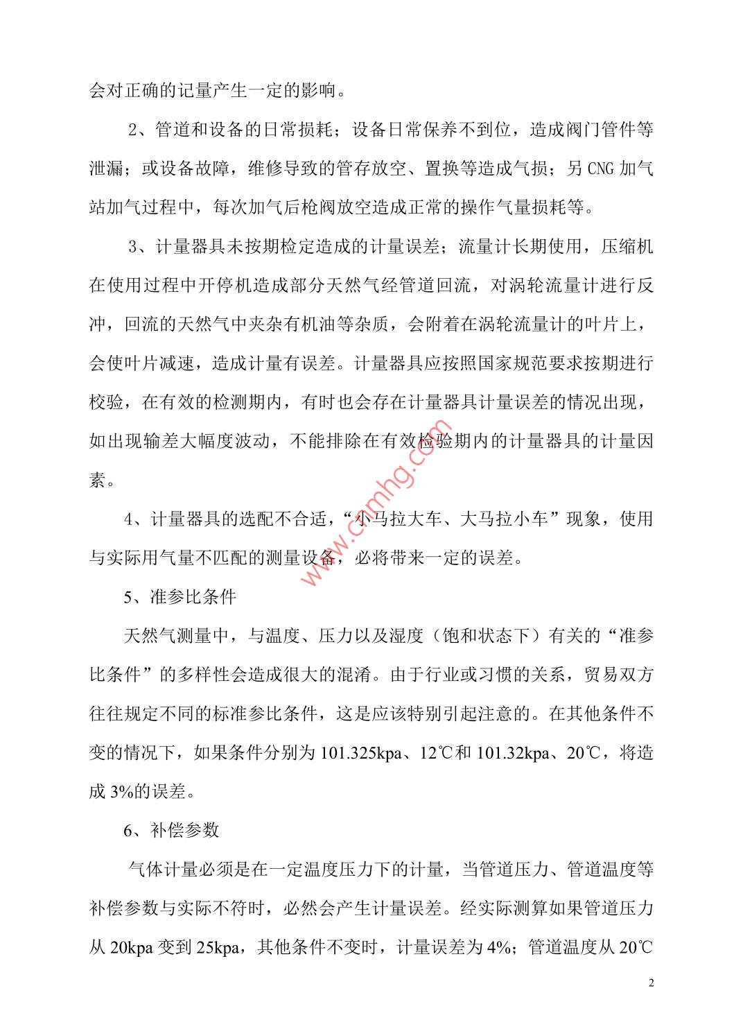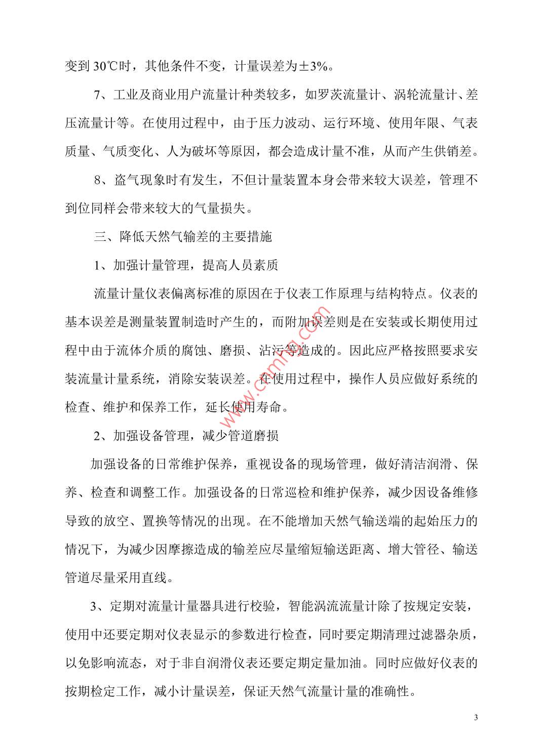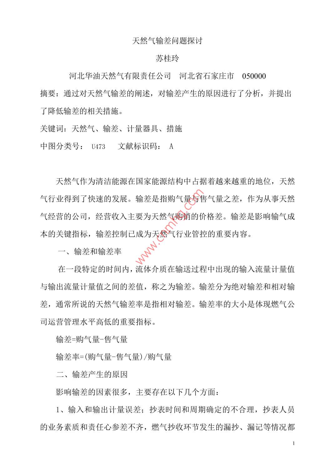 天然氣輸差問題探討蘇桂玲河北華油天然氣有限責任公司河北 省石家莊市050000摘要:通過對天然氣輸差的闡述,對輸差產(chǎn)生的原因進行了分析,并提出了降低輸差的相關措施。關鍵詞:天然氣、輸差、計量器具、措施中圖分類號: U473 文 獻標識碼: A天然氣作為清潔能源在國家能源結構中占據(jù)著越來越重的地位,天然氣行業(yè)得到了快速的發(fā)展。輸差是指購氣量與售氣量之差,作為從事天然氣經(jīng)營的公司,經(jīng)營收入主要為天然氣購銷的價格差。輸差是影響輸氣成本的關鍵指標,輸差控制已成為天然氣行業(yè)管控的重要內(nèi)容。一、 輸差和輸差率在一段特定的時間內(nèi),流體介質(zhì)在輸送過程中出現(xiàn)的輸入流量計量值與輸出流量計量值之間的差值,稱之為輸差。輸差分為絕對輸差和相對輸差,通常所說的天然氣輸差率是指相對輸差。輸差率的大小是體現(xiàn)燃氣公司運營管理水平高低的重要指標。輸差=購氣量-售氣量輸差率=(購氣量-售氣量) /購氣量輸差產(chǎn)生的原因影響輸差的因素很多,主要存在以下幾個方面:1、輸入和輸出計量誤差;抄表時間和周期確定的不合理,抄表人員的業(yè)務素質(zhì)和責任心參差不齊,燃氣抄收環(huán)節(jié)發(fā)生的漏抄、漏記等情況都會對正確的記量產(chǎn)生--定的影響。2、管道和設備的日常損耗;設備日常保養(yǎng)不到位,造成閥門管件等泄漏;或設備故障,維修導致的管存放空、置換等造成氣損;另CNG加氣站加氣過程中,每次加氣后槍閥放空造成正常的操作氣量損耗等。3、計量器具未按期檢定造成的計量誤差;流量計長期使用,壓縮機在使用過程中開停機造成部分天然氣經(jīng)管道回流,對渦輪流量計進行反沖,回流的天然氣中夾雜有機油等雜質(zhì),會附著在渦輪流量計的葉片,上,會使葉片減速,造成計量有誤差。計量器具應按照國家規(guī)范要求按期進行校驗,在有效的檢測期內(nèi),有時也會存在計量器具計量誤差的情況出現(xiàn),如出現(xiàn)輸差大幅度波動,不能排除在有效檢驗期內(nèi)的計量器具的計量因素。4、計量器具的選配不合適,“小馬拉大車、大馬拉小車”現(xiàn)象,使用與實際用氣量不匹配的測量設備,必將帶來一定的誤差。5、準參比條件天然氣測量中,與溫度、壓力以及濕度(飽和狀態(tài)下)有關的“準參比條件”的多樣性會造成很大的混淆。由于行業(yè)或習慣的關系,貿(mào)易雙方往往規(guī)定不同的標準參比條件,這是應該特別引起注意的。在其他條件不變的情況下,如果條件分別為101.325kpa、12C和101.32kpa、20°C, 將造成3%的誤差。6、補償參數(shù)氣體計量必須是在一定溫度壓力下的計量,當管道壓力、管道溫度等補償參數(shù)與實際不符時,必然會產(chǎn)生計量誤差。經(jīng)實際測算如果管道壓力從20kpa變到25kpa,其他條件不變時,計量誤差為4%;管道溫度從20°C2變到30C時,其他條件不變,計量誤差為土3%。7、工業(yè)及商業(yè)用戶流量計種類較多,如羅茨流量計、渦輪流量計、差壓流量計等。在使用過程中,由于壓力波動、運行環(huán)境、使用年限、氣表質(zhì)量、氣質(zhì)變化、人為破壞等原因,都會造成計量不準,從而產(chǎn)生供銷差。8、盜氣現(xiàn)象時有發(fā)生,不但計量裝置本身會帶來較大誤差,管理不到位同樣會帶來較大的氣量損失。三、降低天然氣輸差的主要措施1、加強計量管理,提高人員素質(zhì)流量計量儀表偏離標準的原因在于儀表工作原理與結構特點。儀表的基本誤差是測量裝置制造時產(chǎn)生的,而附加誤差則是在安裝或長期使用過程中由于流體介質(zhì)的腐蝕、磨損、沾污等造成的。因此應嚴格按照要求安裝流量計量系統(tǒng),消除安裝誤差。在使用過程中,操作人員應做好系統(tǒng)的檢查、維護和保養(yǎng)工作,延長使用壽命。2、加強設備管理,減少管道磨損.加強設備的日常維護保養(yǎng),重視設備的現(xiàn)場管理,做好清潔潤滑、保養(yǎng)、檢查和調(diào)整工作。加強設備的日常巡檢和維護保養(yǎng),減少因設備維修導致的放空、置換等情況的出現(xiàn)。在不能增加天然氣輸送端的起始壓力的情況下,為減少因摩擦造成的輸差應盡量縮短輸送距離、增大管徑、輸送管道盡量采用直線。3、定期對流量計量器具進行校驗,智能渦流流量計除了按規(guī)定安裝,使用中還要定期對儀表顯示的參數(shù)進行檢查,同時要定期清理過濾器雜質(zhì),以免影響流態(tài),對于非自潤滑儀表還要定期定量加油。同時應做好儀表的按期檢定工作,減小計量誤差,保證天然氣流量計量的準確性。3為保障計量的不間斷性,需備用周轉表,以備在線計量設備發(fā)生故障時能及時更換。注重流量計的周期清洗,及時發(fā)現(xiàn)和處理流量計的灰塵沉積、倒轉和過載等問題,保證流量計的正常工作。4、選擇適合公司要求的流量計類型。確定合理的計量精度要求,無謂的提高精度等級,會增加造價,而且檢定周期也相應較短。對大流量的計量應適當選擇精度等級高的,對小流量的計量應適當選擇精度等級低的。要保證整個系統(tǒng)的計量精度,還應盡量排除影響系統(tǒng)精度的其他各類因素。取消 原計量裝置的旁通管,確保有供氣必有計量。明確對流量計前過濾器精度的要求,加強對流量計的過濾保護功能。管道施工吹掃時不得通過計
