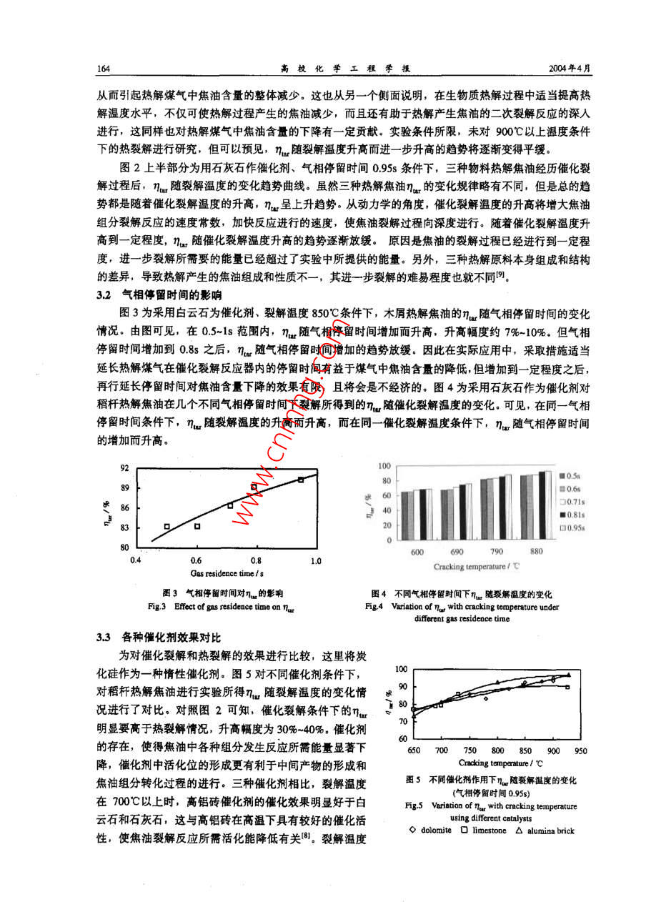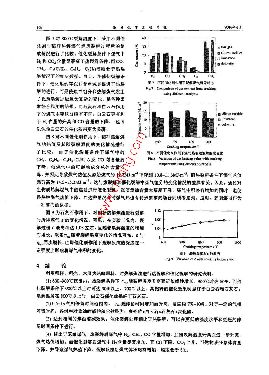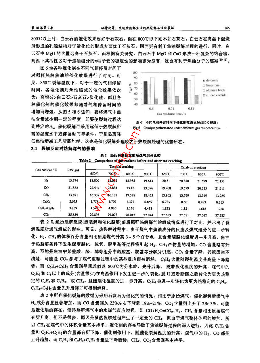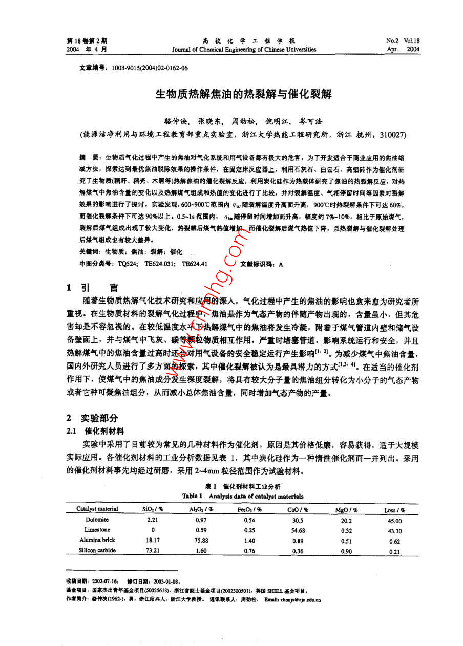 第18卷第2期高?;瘜W(xué)工程學(xué)報No.2 VolL,182004年4月Jourmal of Chemical Engineening of Chinese UniversitiesApr.2004文章編號: 1003-9015(2004)02-0162-06生物質(zhì)熱解焦油的熱裂解與催化裂解駱仲泱,張曉東,周勁松, 倪明江,岑可法(能源潔凈利用與環(huán)境工程教育部重點實驗室,浙江大學(xué)熱能工程研究所,浙江杭州,310027)摘要;生物質(zhì)氣化過程中產(chǎn)生的焦油對氣化系統(tǒng)和用氣設(shè)備都有極大的危害。為了開發(fā)適合于商業(yè)應(yīng)用的焦油縮減方法,探索達到最優(yōu)焦油脫除效果的操作條件,在固定床反應(yīng)器上,利用石灰石、白云石、高鋁磚作為催化劑研究了生物質(zhì)(稻稈、稍殼、木屑等)熱觶焦油的催化裂解反應(yīng),利用炭化硅作為熱載體研究了焦油的熱裂解反應(yīng),對熱解煤氣中焦油含量的變化以及熱解煤氣組成和熱值的變化進行了比較,并對裂解溫度、氣相停留時間等因素對裂解效果的影響進行了探討。實驗發(fā)現(xiàn), 60-90C范圍內(nèi)nw隨裂解溫度升高而升高,900時熱裂解條件下可達60%,而催化裂解條件下可達90%以上。0.5-18 范圍內(nèi),幾w隨停留時間增加而升高, 幅度約7%-10%。相比于原始煤氣,裂解后煤氣組成出現(xiàn)了較大變化,熱裂觶后煤氣熱值增加,而僧化裂解后煤氣熱值下降,且熱裂解與催化裂解處理后煤氣組成也有較大差異。關(guān)鍵詞:生物質(zhì):熊油:裂解:催化中圖分類號: TQS24; TE624.031; TB624.41文獻標(biāo)識碼: A1弓言隨著生物質(zhì)熱解氣化技術(shù)研究和應(yīng)用的深人,氣化過程中產(chǎn)生的焦油的影響也愈來愈為研究者所重視。在生物質(zhì)材料的裂解氣化過程中,焦油是作為氣態(tài)產(chǎn)物的伴隨產(chǎn)物出現(xiàn)的,含量雖小,但其危害卻是不容忽視的。在較低溫度水平下熱解煤氣中的焦油將發(fā)生冷凝,附著于煤氣管道內(nèi)壁和儲氣設(shè)備壁面上,并與煤氣中飛灰、碳等顆粒物質(zhì)相互作用,嚴(yán)重時堵塞管道,影響系統(tǒng)運行和安全,并且熱解煤氣中的焦油含過高時還會對用氣設(shè)備的安全穩(wěn)定運行產(chǎn)生影響1.21。為減少煤氣中焦油含量,國內(nèi)外研究人員進行了多方面的探索,其中催化裂解被認為是最具潛力的方式1.3. 41。在適當(dāng)?shù)拇呋瘎┳饔孟拢姑簹庵械慕褂统煞职l(fā)生深度裂解,將具有較大分子量的焦油組分轉(zhuǎn)化為小分子的氣態(tài)產(chǎn)物或者它種可凝焦油組分,從而減小總體焦油含量,同時增加氣態(tài)產(chǎn)物的產(chǎn)量。2實驗部分2.1催化劑材料實驗中采用了目前較為常見的幾種材料作為催化劑,原因是其價格低廉,容易獲得,適于大規(guī)模實際應(yīng)用。各催化劑材料的工業(yè)分析數(shù)據(jù)見表1, 其中炭化硅作為-種惰性催化劑而一-并列出。采用的催化劑材料事先均經(jīng)過研磨,采用2~4mm粒徑范圍作為試驗材料。表1催化劑材料工業(yè)分析Table 1 Analysis dats of catalyst materlalsCtalyst rmateriali021%AlO31%Fe031%Ca0/%MgO/%Loss1%Dolomite2.210.970.5420.245.00Limestone0.590.2554.680.3243.30Alumina brick18.175.881.4(0.890.62Silicon carbide73.211.600.760.360.900.21收稿日期,20207.161 修訂日期: 203-01-08.0苗金項目:國家杰出青年基金項目(50025618)浙江省院士基金項(2002300501),)莢國SHELL基金項目,作者簡介:駱神關(guān)(1962-), 男,斷江網(wǎng)必人。浙江大學(xué)教授,通訊聯(lián)系人: 圃勁松,Emal!: zouj@j.cdo.co第18卷第2期駱仲決等:生物質(zhì)熱解焦油的熱裂解與催化聚解1632.2裂解反應(yīng)器實驗采用的熱解煤氣來自生物質(zhì)熱解氣化反應(yīng)器,熱解物料包括稻桿、稻殼和木屑。實驗系統(tǒng)的整體布置i%以及煤氣和焦油的取樣分析方法在文獻[5]中有詳細表述。本文中所列數(shù)據(jù)皆為熱解溫度850C和物料滯留時間70s條件下的實驗結(jié)果)。焦油裂解反應(yīng)器采用固定床形式,催化劑填充于φ50mm的不銹鋼管內(nèi),反應(yīng)段長度0.5m,其具體結(jié)構(gòu)見圖1.裂解反應(yīng)器進、出口位置布置有溫度、壓力測點,以監(jiān)測裂解器內(nèi)的反應(yīng)情況。-14裂解器中心位置布置- -只熱電偶,并以其數(shù)據(jù)作為裂解圈1焦油裂解反應(yīng)器略圖溫度。在裂解器進口和出口均布置煤氣和焦油的取樣口,F(xiàn)lg.1 Schematic diagram of ar cracker以便對所得結(jié)果進行對比。煤氣樣采用GC分析其中H2、1. gasinlet 2. valve 3. monitar of temperature and pressureCO、CH、CO2、 02、 N2、CH、C2H、C2H、C2H6 等4. 8as dstibutor 5. resistance wire 6. calyst7. beat insulataor 8 gas outle 9. sampling point for gas組分的體積百分含量。焦油取樣采用冷態(tài)捕集方法,樣10. sampling pointfortar II. tempararure canrol insrument品采用重度分析法確定煤氣中的焦油含量。為監(jiān)測焦油12. eacticheater 13. befl 14. slag hoale裂解和煤氣重整對煤氣體積流量變化的影響,對裂解器前后的煤氣累積流量Qroror Qnu進行計量,并定義體積增長系數(shù)e=Qme/Qomee反應(yīng)器采用外部電加熱方式保持裂解反應(yīng)所需溫度水平。從氣化反應(yīng)器出口到裂解反應(yīng)器進口的煤氣管道均采用電加熱方式保溫,保證管道內(nèi)煤氣流的溫度在250C以上,以防止煤氣中部分焦油成分發(fā)生冷凝(.7]。2.3焦油轉(zhuǎn)化效率定義經(jīng)過催化裂解或熱裂解,煤氣中部分焦油將轉(zhuǎn)化為氣態(tài)產(chǎn)物和炭,而煤氣也將經(jīng)歷重整過程,導(dǎo)