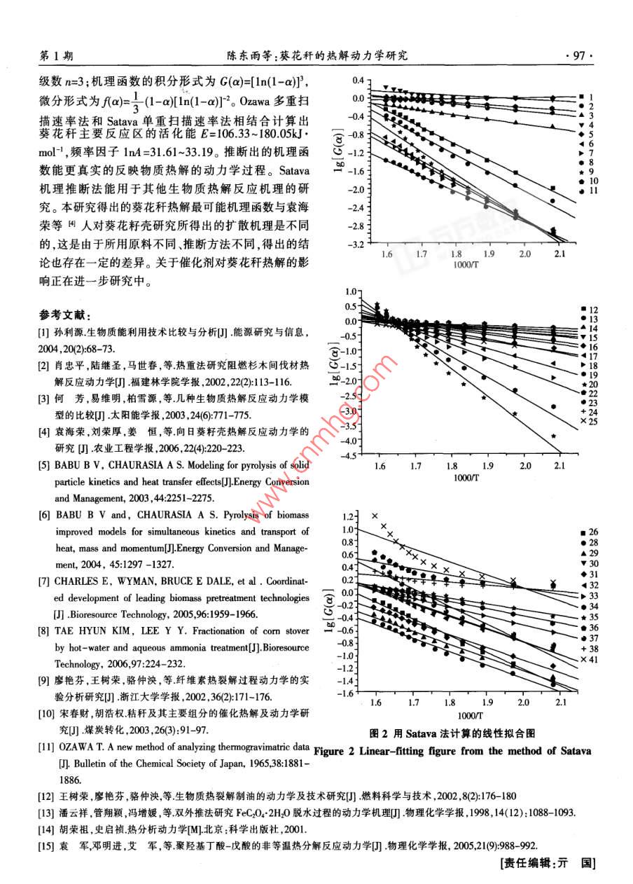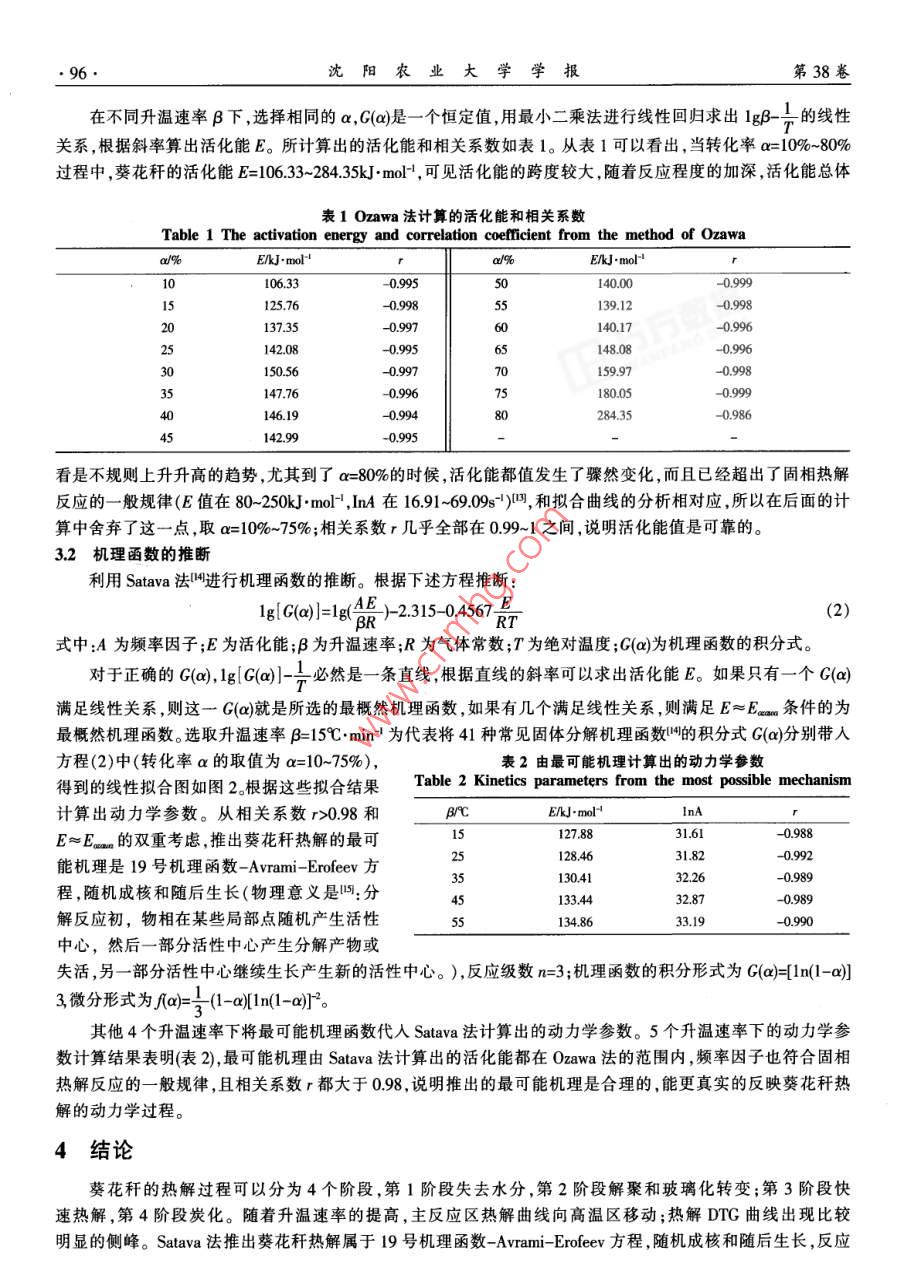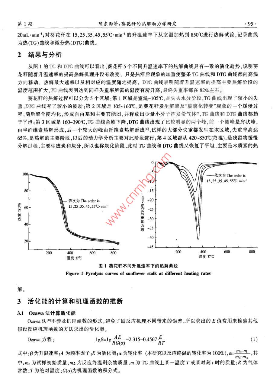 沈陽農(nóng)業(yè)大學(xué)學(xué)報,2007-02,38(1):94-97Journal of Shenyang Agricultural University, 2007-02, 38(1): 94-97葵花稈的熱解動力學(xué)研究陳東雨1,劉榮厚2(1.沈陽農(nóng)業(yè)大學(xué)工程學(xué)院,沈陽110161;2上海交通大學(xué)農(nóng)業(yè)與生物學(xué)院生物質(zhì)能工程研究中心,上海201101)摘要:為使葵花稈得到高效清潔的利用,為生物質(zhì)熱解裝置的正確設(shè)計提供理論依據(jù),采用熱重法在不同升溫速率下對葵花稈的熱解行為進(jìn)行了研究。結(jié)果表明:葵花稈的熱解可分為4個階段隨著升溫速率的提高,主反應(yīng)區(qū)熱重曲線和微分熱重曲線都向高溫方向移動熱解最大速率以及相對應(yīng)的溫度隨之提高;Oawa法計算葵花稈主熱解區(qū)間的活化能值集中在10633-180.05kmo范圍內(nèi); Satava機理函數(shù)推斷法得出葵花稈熱解的最可能機理屬于19號機理函數(shù)- Avrami- Erofeev方程,隨機成核和隨后生長,反應(yīng)級數(shù)n=3。關(guān)鍵詞:葵花稈;生物質(zhì);熱分析;熱解;動力學(xué)中圖分類號:S5655;Q41419文獻(xiàn)標(biāo)識碼:A文章編號:1000-1700(2007)01-0094-04The Kinetics of Sunflower Stalk PyrolysisCHEn Dong-yu, LIU Rong-hou(1. College of Engineering, Shenyang Agricultural University, Shenyang 110161, China; 2. Biomass Energy Engineering Research Centre. School ofAgriculture and Biology, Shanghai Jiao Tong University, Shanghai 201101, China)Abstract: To use the sunflower stalk effectively and cleanly and provide theory basis for the correct design of biomass pyrolysisdevice, pyrolysis kinetics of sunflower stalk was performed by thermogravimetric analysis(TGA)at different heating rates. The re-sults showed the pyrolysis process of sunflower stalk could be separated into four stages. With the heating rate increasing, theTG and DTG curves of the main pyrolysis area shift up the temperature scale the maximum pyrolysis rate and its correspondingtemperature increased too. The value areas of activation energy was 106.33-180.05 k]- calculated by the method of OzawaThe most possible mechanism function of sunflower stalk was Avrami-Erofeev equation, which is a random nucleation and latergrowth mechanism function, (n=3)Key words: sunflower stalk; biomass; thermolgravimetric analysis; pyrolysis; kinetics全球每年生物質(zhì)的產(chǎn)量非常豐富但是大多數(shù)都由于各種原因未得到有效利用。目前全世界仍有25億人口用生物質(zhì)煮飯、取暖和照明,但生物質(zhì)利用總量還不到其產(chǎn)量1%。因地制宜將生物質(zhì)資源轉(zhuǎn)化為高品質(zhì)能源,對緩解能源緊張、建立可持續(xù)的能源系統(tǒng)、促進(jìn)國民經(jīng)濟(jì)發(fā)展和環(huán)境保護(hù)具有重大意義。生物質(zhì)熱解是生物質(zhì)轉(zhuǎn)換技術(shù)中的重要方式之一,也是生物質(zhì)氣化或燃燒等轉(zhuǎn)化過程中的必經(jīng)步驟。為使生物質(zhì)得到有效而充分的利用,國內(nèi)外學(xué)者對其中的各類秸稈、果殼類、林業(yè)廢棄物等的熱解動力學(xué)方面進(jìn)行了大量的研究P,但對葵花稈的研究還很少,尤其利用 Satava法對生物質(zhì)熱解機理的推斷還未見相關(guān)報道。本研究對葵花稈在先進(jìn)的熱分析儀上進(jìn)行了熱解試驗,對試驗數(shù)據(jù)進(jìn)行了動力學(xué)參數(shù)的計算和機理的推斷,以期為葵花稈得到高效清潔的利用提供理論依據(jù),為生物質(zhì)熱解裝置的正確設(shè)計提供指導(dǎo)。1材料與方法11試驗材料所用原料為內(nèi)蒙古赤峰市翁牛特旗2005年種植的葵花摘除葵花籽后剩余的稈。為減少水分對熱解試驗的影響,對葵花稈進(jìn)行風(fēng)干、粉碎、過篩,然后在烘箱中以105℃恒溫保溫12h,備用;為減少傳熱傳質(zhì)在熱解過程中的影響,物料粒徑均小于06mm,每次用量都控制在3~35mg范圍內(nèi)。12試驗方法試驗所用儀器為美國 Perkin- Elmer公司生產(chǎn)的risl熱重分析儀。用999%的氮氣作保護(hù)氣,流量為收稿日期:200609-24基金項目:國家自然科學(xué)基金資助項目(50276039)作者簡介:陳東雨(1976-),女,沈陽農(nóng)業(yè)大學(xué)博士研究生,從事生物質(zhì)能工程研究。·通訊作者 Corresponding author:劉榮厚(1960-),男,上海交通大學(xué)教授,博士,從事可再生能源與環(huán)境工程研究第1期陳東雨等:葵花稈的熱解動力學(xué)研究9520 mL min3;對葵花稈在15,25,35,45,55℃·min4的升溫速率下從室溫加熱到850°℃進(jìn)行熱解試驗,記錄曲線為熱(TG)曲線和微分熱(DTG)曲線。2結(jié)果與分析從圖1的TG和DTG曲線可以看出,葵花稈5個不同升溫速率下的熱解曲線具有一致的演化趨勢,說明葵花稈隨著升溫速率的提高熱解機理并沒有改變,只是熱滯后現(xiàn)象的加重使整條TG曲線和DTG曲線都向高溫方向移動,熱解最大速率以及相對應(yīng)的溫度隨之提高。DTG曲線表明隨著升溫速率的提高主要熱解階段的溫度范圍擴大,TG曲線表明達(dá)到同樣失重率所需的溫度有所升高,最終失重率都在82%左右葵花稈的熱解過程可以分為5個區(qū)域:第1區(qū)域是室溫-105℃,是失去水分階段,TG曲線出現(xiàn)了較小的失重,DG曲線有了較小的波動;第2區(qū)域是105-160℃,是葵花稈發(fā)生解聚及“玻璃化轉(zhuǎn)變”現(xiàn)象的一個緩慢過程,隨后聚合度均化,形成自由基和主要官能團(tuán),并釋放出少量小分子揮發(fā)份氣體網(wǎng),TG曲線和DTG曲線都趨于平坦;第3區(qū)域是160~390℃,TG曲線急劇下降,DTG曲線出現(xiàn)了比較明顯的兩個峰,前一