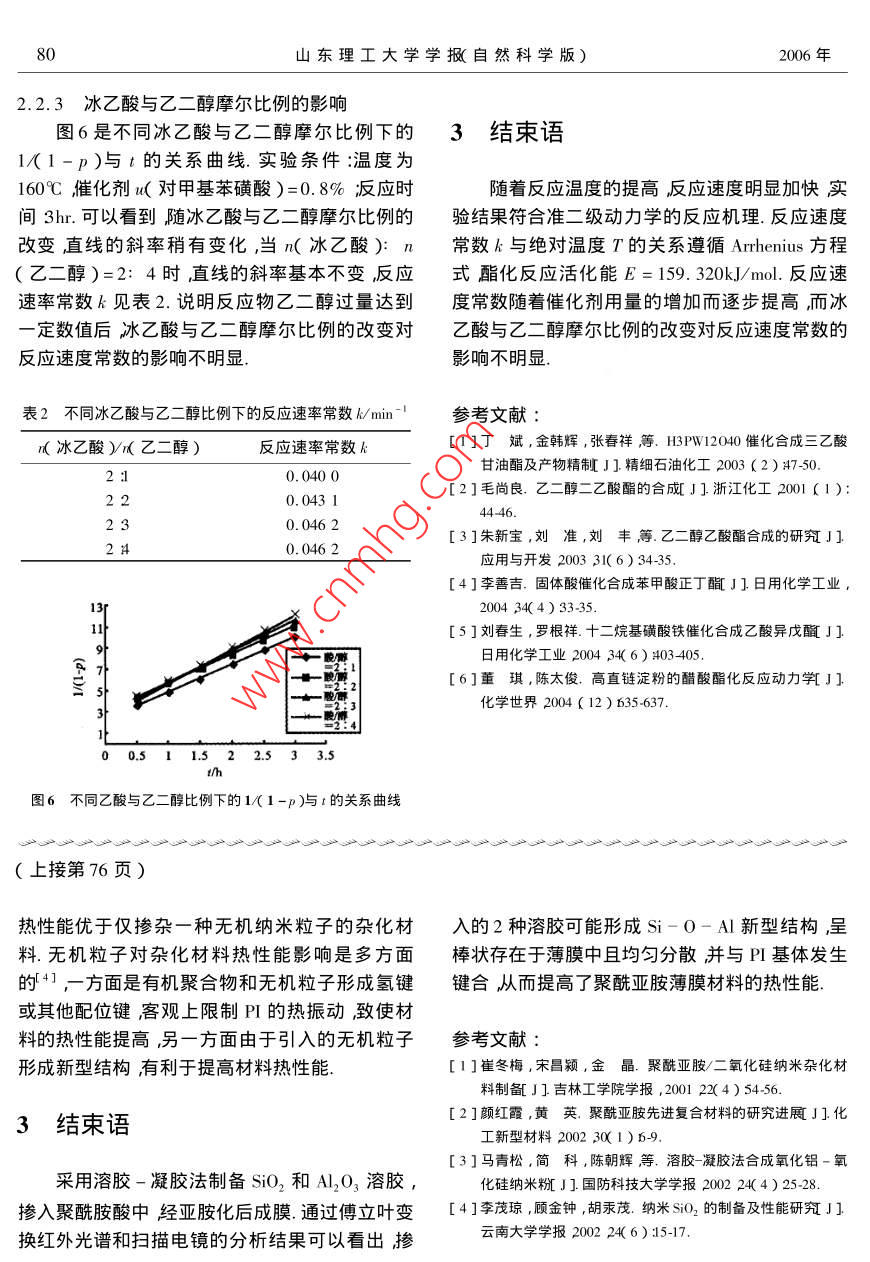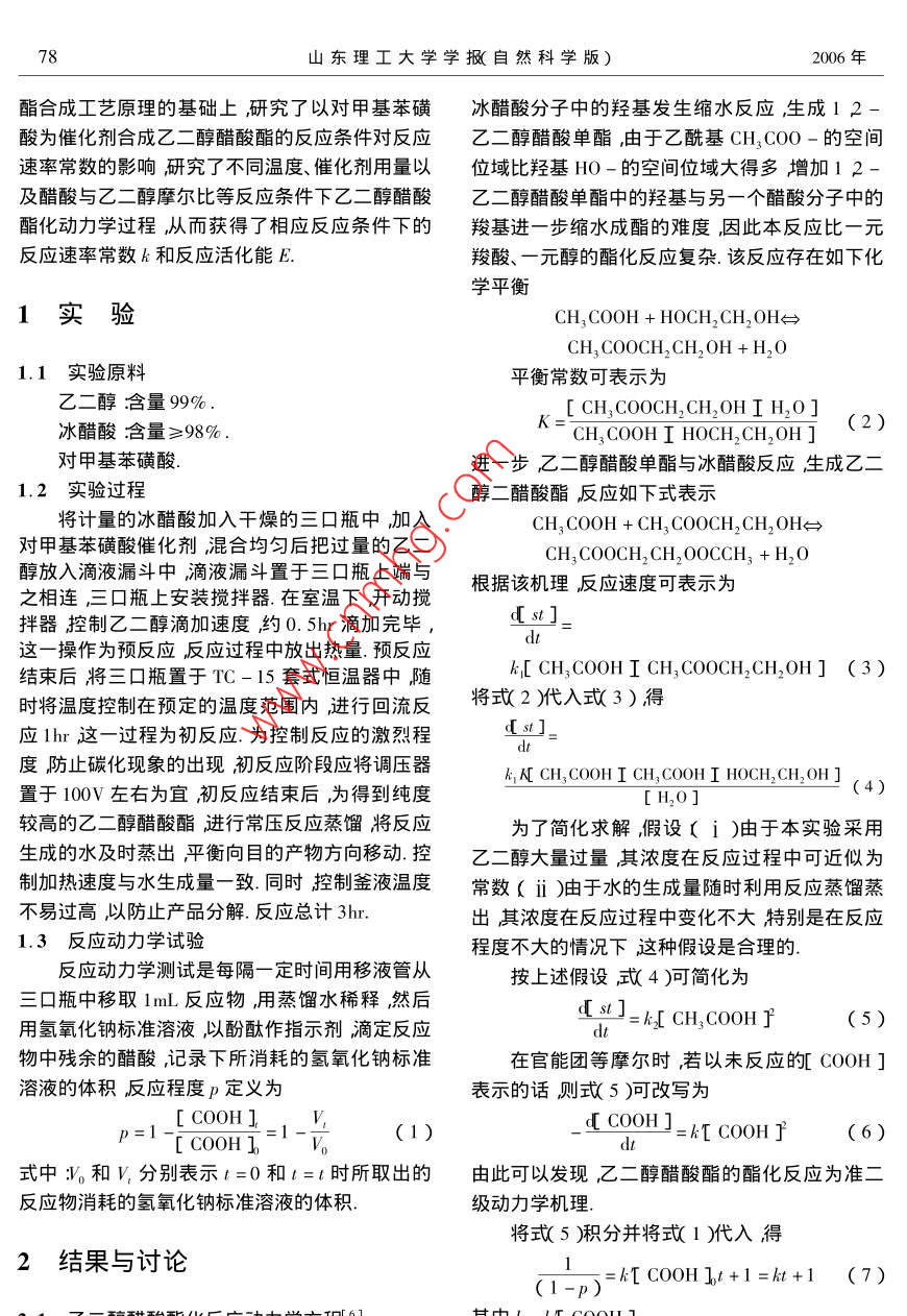 第20卷第4期山東理工大學(xué)學(xué)報(bào)自然科學(xué)版Vol 20 No 42006年7月Journal of Shandong University of Technolog Sci TechJul.2006文章編號(hào)672-6197(206)04-0077-04乙二醇醋酸酩化反應(yīng)動(dòng)力學(xué)研究李鳳云(嘉興學(xué)院生化實(shí)驗(yàn)中心,浙江嘉興314001)摘要:基于二級(jí)反應(yīng)動(dòng)力學(xué)機(jī)理研究了以乙二醇和冰乙酸為原料合成乙二醇醋酸酯的反應(yīng)動(dòng)力學(xué)通過反應(yīng)動(dòng)力學(xué)實(shí)驗(yàn)根據(jù)化學(xué)方程式利用計(jì)算機(jī)軟件程序?qū)?shí)驗(yàn)數(shù)據(jù)回歸擬合確定反應(yīng)動(dòng)力學(xué)參數(shù)建立了反應(yīng)動(dòng)力學(xué)模型討論了不同溫度、催化劑用量以及乙二醇與醋酸摩爾比等反應(yīng)條件對(duì)酯化反應(yīng)速率常數(shù)k的影響求得酯化反應(yīng)活化能E為159.32 kJ/mol.結(jié)果表明在實(shí)驗(yàn)條件下乙二醇與醋酸酯化反應(yīng)反應(yīng)級(jí)數(shù)為準(zhǔn)2級(jí).關(guān)鍵詞:乙二醇;醋酸酯;對(duì)甲基苯磺酸;動(dòng)力學(xué)中圖分類號(hào):TQ426.6文獻(xiàn)標(biāo)識(shí)碼:AKinetic studies on esterification of glycol and acetic acideng-yunBiochemistry Center Jiaxing College Jiaxing 3 14001 ChinaAbstract: The kinetic studies on esterification with glycol and acetic acid as starting materials to obtain ethylene glycol monoacetate was studied based on the proposed second order kinetic mechanismThrough experiments of kinetic esterification and according to the chemical equation with the computer software procedure and regression of the experimental data, the reaction dynamics parameters weredeter mined and the reaction dynamic model was set up. The influenceon the esterification rate con-stant k caused by various temperatures warious catalyzer consumption, the mol ratio of glycol and ace-tic acid ete was also discusThe activation E of the esterification was 159320.J/mol. The resultshowed that under the experimental conditions, the esterification reaction belonged to the second ordertyKey words: glycol ethylene glycol monoacetate P-toluene sulfonic acid kinetic乙二醇醋酸酯(EGA)是乙二醇一乙酸酯醇醋酸酯化及相關(guān)酯化反應(yīng)工藝研究得很EGMA)和乙二醇二乙酸酯(ECDA)的混合物,多2-51但關(guān)于乙二醇醋酸酯化反應(yīng)的動(dòng)力學(xué)文無色液體可代替醋酸甘油酯廣泛用于日用化妝獻(xiàn)報(bào)道很少.而動(dòng)力學(xué)研究是弄清反應(yīng)機(jī)理和設(shè)品中作香料調(diào)香和定香的溶劑在有機(jī)合成、計(jì)化學(xué)反應(yīng)器的基礎(chǔ)提供有用的信息和數(shù)據(jù)對(duì)醫(yī)藥及染料工業(yè)中也有很多用途.目前對(duì)乙二日用化學(xué)工業(yè)很有意義本文在分析乙二醇醋酸山東理工大學(xué)學(xué)撇自然科學(xué)版)2006年酯合成工藝原理的基礎(chǔ)上,研究了以對(duì)甲基苯磺冰醋酸分子中的羥基發(fā)生縮水反應(yīng)生成12酸為催化劑合成乙二醇醋酸酯的反應(yīng)條件對(duì)反應(yīng)乙二醇醋酸單酯由于乙酰基CH3COO-的空間速率常數(shù)的影響研究了不同溫度催化劑用量以位域比羥基HO-的空間位域大得多增加12及醋酸與乙二醇摩爾比等反應(yīng)條件下乙二醇醋酸乙二醇醋酸單酯中的羥基與另一個(gè)醋酸分子中的酯化動(dòng)力學(xué)過程從而獲得了相應(yīng)反應(yīng)條件下的羧基進(jìn)一步縮水成酯的難度因此本反應(yīng)比一元反應(yīng)速率常數(shù)k和反應(yīng)活化能E.羧酸、一元醇的酯化反應(yīng)復(fù)雜.該反應(yīng)存在如下化學(xué)平衡1實(shí)驗(yàn)CH3COOH+HOCH,CH2OH冷→CH, COOCH, CH,OH +H,O1.1實(shí)驗(yàn)原料平衡常數(shù)可表示為乙二醇含量99%L CH, COOCH, CH,OH I H,O]冰醋酸含量≥98%K= CH, COOH I HOCH, CH, OH] (2對(duì)甲基苯磺酸進(jìn)一步乙二醇醋酸單酯與冰醋酸反應(yīng)生成乙1.2實(shí)驗(yàn)過程醇二醋酸酯反應(yīng)如下式表示將計(jì)量的冰醋酸加入干燥的三口瓶中,加入CH3COOH+CH3 COOCH2CH2OH臺(tái)→對(duì)甲基苯磺酸催化劑混合均勻后把過量的乙二CH COOCH, CH, OOCCH3+H2O醇放入滴液漏斗中滴液漏斗置于三口瓶上端與根據(jù)該機(jī)理反應(yīng)速度可表示為之相連,三口瓶上安裝攪拌器在室溫下開動(dòng)攪拌器控制乙二醇滴加速度約0.5h滴加完畢d st這一操作為預(yù)反應(yīng)反應(yīng)過程中放出熱量.預(yù)反應(yīng)結(jié)束后將三口瓶置于TC-15套式恒溫器中隨k,[ CH, COOH I CH, COOCH, CH,OH] (3)時(shí)將溫度控制在預(yù)定的溫度范圍內(nèi)進(jìn)行回流反將式2)入式3)得應(yīng)1hr這一過程為初反應(yīng).為控制反應(yīng)的激烈程d st 1度防止碳化現(xiàn)象的出現(xiàn)初反應(yīng)階段應(yīng)將調(diào)壓器h A[ CH, COoh I CH, COOH I HOCH, CH, OH J置于100V左右為宜初反應(yīng)結(jié)束后為得到純度[H2O](4)較高的乙二醇醋酸酯進(jìn)行常壓反應(yīng)蒸餾將反應(yīng)為了簡(jiǎn)化求解假設(shè)〔i)由于本實(shí)驗(yàn)采用生成的水及時(shí)蒸出嚴(yán)衡向目的產(chǎn)物方向移動(dòng)控乙二醇大量過量其濃度在反應(yīng)過程中可近似為制加熱速度與水生成量一致同時(shí)控制蓋液溫度常數(shù)(i)由于水的生成量隨時(shí)利用反應(yīng)蒸餾蒸不易過高以防止產(chǎn)品分解.反應(yīng)總計(jì)3h出其濃度在反應(yīng)過程中變化不大特別是在反應(yīng)1.3反應(yīng)動(dòng)力學(xué)試驗(yàn)程度不大的情況下這種假設(shè)是合