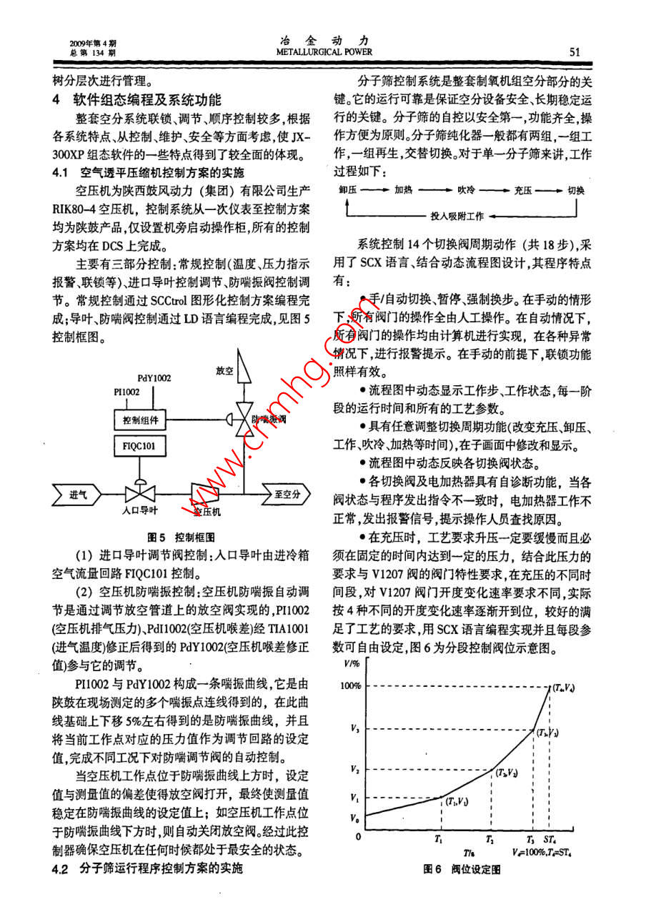 冶金動力134METALLURGICAL POWERJX-300 XP DCS控制系統(tǒng)在空分項目上的應(yīng)用吳強(馬鞍山鋼鐵股份有限公司自動化工程公司,安徽馬鞍山243000【摘要】介紹了江蘇永鋼2000mh制氧機控制系統(tǒng)的配置詳細(xì)描述了重點控制功能及X-300XPCS實現(xiàn),該系統(tǒng)取得了顯著的經(jīng)濟效益?!娟P(guān)鍵詞】制氧;控制系統(tǒng);』X-30XP;防喘振控制【中圖分類號】TB6【文獻標(biāo)識碼】B【文章編號】10067642094004904Application of JX-300XP DCS Control System in Air Separation ProjectwU Qian(Automation Engineering Co., Maashan Iron Steel Co., Lud, Maanshan, Anhui 243000, China)Abstract] The configuration of the control system of 20000 mm/h air separator ofJiangsu Yong Steel is present. The main control functions of the air separator and realizationof JX-300XP DCS are expounded in detail. This system has achieved significant economicbenefits[Key words] oxygen making: control system; JX-300XP; surge-proof control引言等均由DCS系統(tǒng)完成。DCS控制系統(tǒng)由于其“管理集中,危險分散”而3控制系統(tǒng)硬件構(gòu)成得到廣泛應(yīng)用。X-300 XP DCS系統(tǒng)是浙大中控公3.1JX-300 XP DCS系統(tǒng)整體網(wǎng)絡(luò)結(jié)構(gòu)司2004年推出的集散控制系統(tǒng)是當(dāng)今在國內(nèi)市場系統(tǒng)采用了信息管理網(wǎng)過程控制網(wǎng)控制站內(nèi)廣泛應(yīng)用的較先進的控制系統(tǒng)。近幾年來在空分(制部網(wǎng)絡(luò)三層通信網(wǎng)絡(luò)結(jié)構(gòu)。其中最上層為信息管理氧)行業(yè)應(yīng)用得到較好評價。網(wǎng)采用了符合TCPP協(xié)議的以太網(wǎng),用于工廠級JX-300XP系統(tǒng)具有完善的冗余功能,可以實信息傳送和管理現(xiàn)電源冗余網(wǎng)絡(luò)冗余、控制器冗余、IO卡冗余??厝鐖D2中間層為過程控制網(wǎng)(名稱為 CNet制站所有卡件均按智能化設(shè)計,均采用專用微處理Ⅱ),采用了雙高速冗余工業(yè)以太網(wǎng)傳輸各種實時器,在系統(tǒng)內(nèi)實現(xiàn)全數(shù)字化的數(shù)據(jù)傳輸和數(shù)據(jù)處理。信息系統(tǒng)實現(xiàn)了空分裝置所需的各種控制方案,保證了如圖3底層網(wǎng)絡(luò)為控制站內(nèi)部網(wǎng)絡(luò)(名稱為空分裝置的正常運行。BUS),采用主控制卡指揮令牌網(wǎng)存儲轉(zhuǎn)發(fā)通信協(xié)2空分裝置及其控制方式議是控制站各卡件之間進行信息交換的通道?,F(xiàn)場江蘇永鋼2萬m3制氧機組是杭氧產(chǎn)KDON-采集的數(shù)據(jù)通過信號線送至DCs的W模塊進行2100021000型空氣分離裝置控制系統(tǒng)采用浙大中AD轉(zhuǎn)換處理,再通過SBUS進人系統(tǒng)完成各種控控的JX-300XP系統(tǒng)。制??刂品绞揭訢CS集中控制為主,結(jié)合機旁控制32Dcs硬件配置及特性為輔完成了空氣透平壓縮機、空氣預(yù)冷、分子篩吸根據(jù)需要,系統(tǒng)共配置2個操作站、2個控制附膨脹機、板式換熱器及分餾塔、氬分餾、氧氣透平站、1個工程師站其DCS控制系統(tǒng)的組成框圖如圖壓縮機、氧氮氬貯存等過程的數(shù)據(jù)采集,閉環(huán)控制,4。順序控制邏輯聯(lián)鎖控制。工藝流程見圖1??刂葡到y(tǒng)CPU,網(wǎng)絡(luò)、電源均采用熱備雙冗余系統(tǒng)主要工藝參數(shù)的顯示趨勢記錄歷史事件配置,當(dāng)任一設(shè)置為冗余方式的工作卡件發(fā)生故障記錄、報警、調(diào)節(jié)打印制表及流程圖畫面動態(tài)顯示時,備用卡件即迅速自動切換,整個系統(tǒng)仍按原進程冶金動力20年第4METALLURGICAL POWER總第134污氮放空空氣氧壓縮系統(tǒng)預(yù)冷系統(tǒng)分餾塔系統(tǒng)空氣過濾系統(tǒng)氮壓縮系統(tǒng)空氣氬儲存分離系統(tǒng)空氣壓縮系統(tǒng)污氮純化系統(tǒng)污氮放空圖1空分裝置各個工藝系統(tǒng)工作,不影響整個系統(tǒng)的工作狀態(tài),工作備用卡件喪1系統(tǒng)規(guī)模表之間的運行狀態(tài)同步速度達1Mbp序號信號類型實際配置選用卡件備注14-20mA模擬量輸入操作站工程師站網(wǎng)卡網(wǎng)卡網(wǎng)卡網(wǎng)卡23454-20mA輸出數(shù)字量輸人數(shù)字量輸出合計SOnetⅡ33工程師站和操作站應(yīng)廠方要求,均采用西門子工控機,支持USB接口配有 SUPCON專用工業(yè)鍵盤及19"DELL液晶圖2 CNet‖網(wǎng)絡(luò)冗余結(jié)構(gòu)顯示器。操作系統(tǒng)采用 WINDOWS2000sP4配有主控制卡主控制卡雙 ScnetIl網(wǎng)卡。工程師站,配有 SUPCON的系統(tǒng)組態(tài)軟件,可進行系統(tǒng)組態(tài),控制回路程序(語言+圖形)編制流程圖制作,趨勢圖和報警組態(tài),報表制作|數(shù)梨特數(shù)*|o機蹇34JX-300 XP DCS系統(tǒng)組態(tài)特點X-300 XP DCS系統(tǒng)的組態(tài)工作是通過 SCKeySBUS-SI組態(tài)軟件來完成 SCKey組態(tài)軟件(含實時監(jiān)控軟10卡0件)是一個全面支持該系統(tǒng)各類控制方案的組態(tài)軟件平臺,是運用面向?qū)ο?O0P)技術(shù)和對象鏈接與圖3SBUS總線結(jié)構(gòu)示意嵌入(OLE2)技術(shù),基于中文 WINDOWS系列操作系操作站1操作站2工程師站統(tǒng)開發(fā)的32位應(yīng)用軟件界面友好(通過簡明的下拉菜單和彈出式對話框建立友好的人機對話界面),功能強大具有強大的在線幫助功能所有幫助均為中文組態(tài)方便簡單??亟M態(tài)軟件 SCKey集控制程序和監(jiān)控畫面的編制于一身,用戶可以根據(jù)自身特點選用常規(guī)控制方案及自定義方案,可選擇編程語言:SCX語言、SCC圖4DCS系統(tǒng)