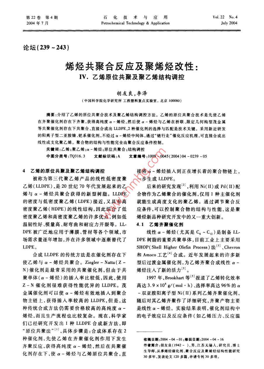烯烴共聚合反應(yīng)及聚烯烴改性:Ⅳ.乙烯原位共聚及聚乙烯結(jié)構(gòu)調(diào)控