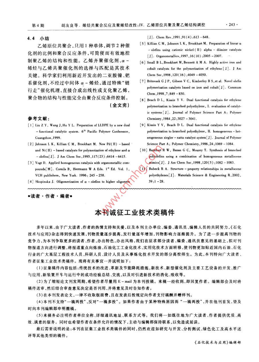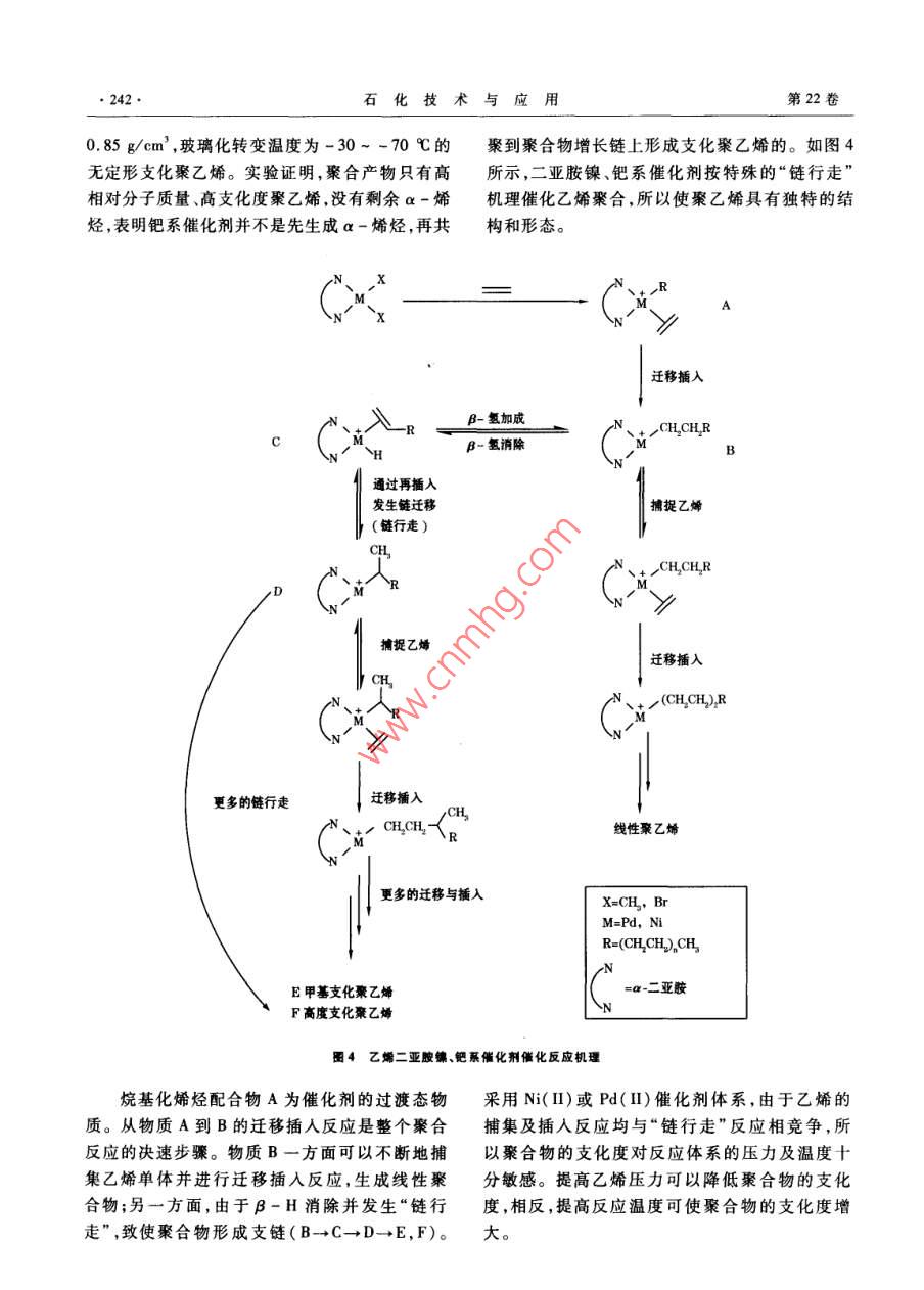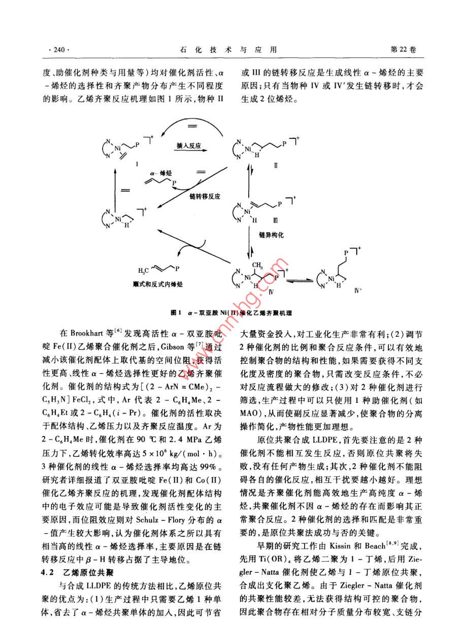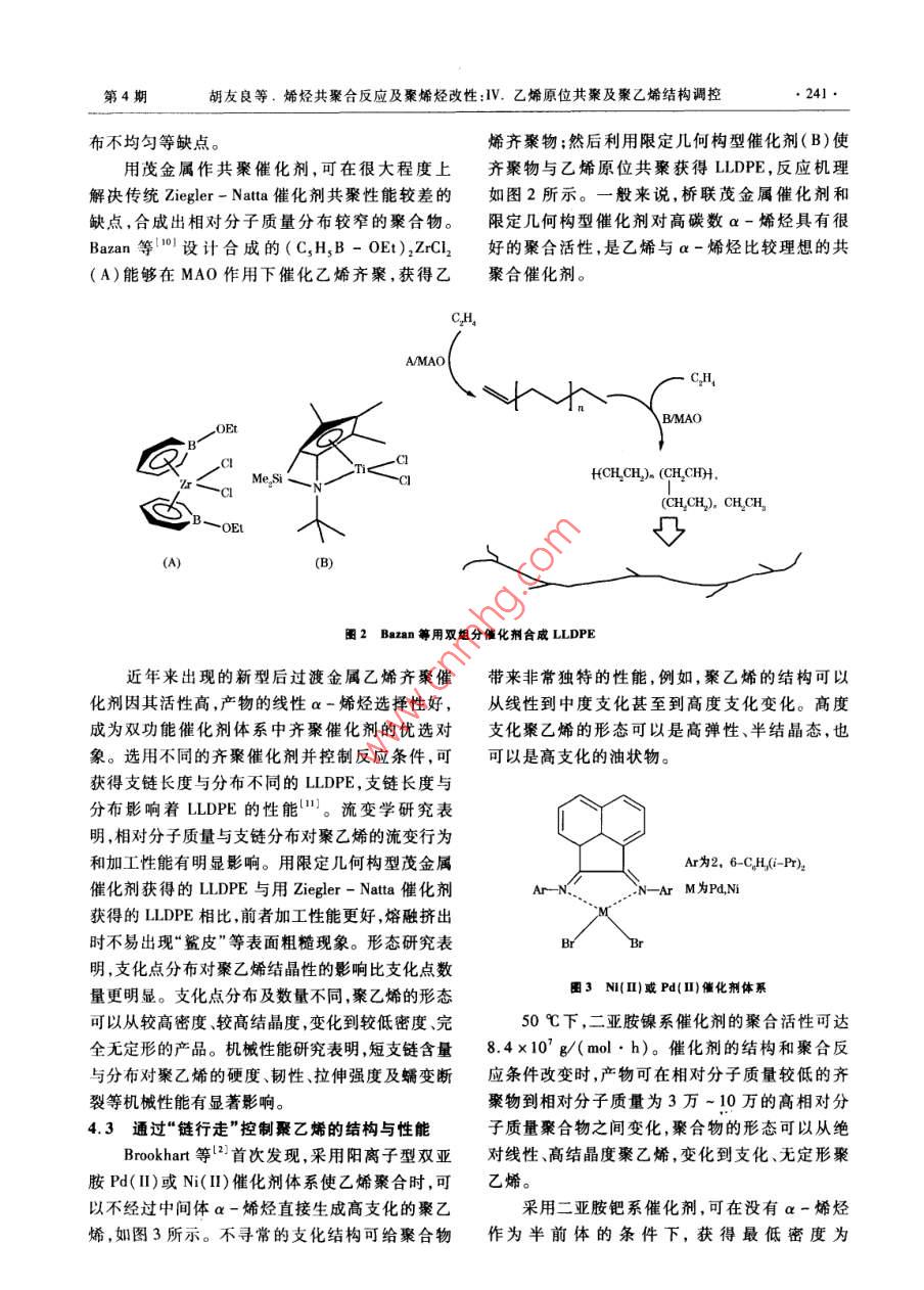 第22卷第4期石化技術(shù)與應(yīng)用Vol.22 No. 42004年7月Petrochemical Technology & ApplicationJuly 2004論壇(239~243)烯烴共聚合反應(yīng)及聚烯烴改性:IV.乙烯原位共聚及聚乙烯結(jié)構(gòu)調(diào)控胡友良,李澤(中國科學(xué)院化學(xué)研究所工程塑料重點實驗室,北京100080)摘要:介紹了乙烯的原位共聚合技術(shù)及聚乙烯結(jié)構(gòu)調(diào)控方法。乙烯的原位共聚合技術(shù)是先使乙烯在齊聚催化劑存在下齊聚,獲得高純度a-烯烴,然后使a-烯烴與乙烯在橋聯(lián)、限定幾何構(gòu)型茂金屬等共聚催化劑存在下共聚合,直接合成出LLDPE,2種催化劑的選擇與匹配是技術(shù)關(guān)鍵。采用新近研發(fā)的陽離子型二亞胺鎳、鈀系催化劑,不經(jīng)過a-烯烴中間體,通過“鏈行走”催化反應(yīng)機理.可直接合成出線性或支化聚乙烯。聚合物的結(jié)構(gòu)與性能完全由聚合反應(yīng)條件控制。關(guān)鍵詞:乙烯;聚乙烯;a-烯烴;原位共聚合;結(jié)構(gòu)調(diào)控中圄分類號:TQ316. 3文獻標(biāo)識碼:A文章編號:1009 - 0045( 2004)04 - 0239 -054乙烯的原位共聚及聚乙烯結(jié)構(gòu)調(diào)控接將a-烯烴插人到正在增長著的聚合物鏈上,被稱為第三代聚乙烯產(chǎn)品的線性低密度聚一步生成LLDPE。乙烯(LLDPE),是20世紀(jì)70年代發(fā)展起來的乙后來的研究發(fā)現(xiàn)(21 ,利用Ni( I)或Pd(II)配.烯與a-烯烴共聚合獲得的新型樹脂。LLDPE合物作為乙烯聚合的催化劑,僅用1種主催化劑的密度與低密度聚乙烯(LDPE)接近,又具有高就能生成高度支化的聚乙烯。通過調(diào)節(jié)聚合反密度聚乙烯( HDPE)的線性結(jié)構(gòu),因此綜合了低應(yīng)條件,可以控制聚合物的結(jié)構(gòu)與性能,這是聚密度聚乙烯和高密度聚乙烯的許多優(yōu)點,例如低烯烴新品種研究開發(fā)中的又一重大創(chuàng)新。溫韌性好、模量高、耐彎曲和耐應(yīng)力開裂等。LL-4.1 乙烯齊聚催化劑DPE被廣泛地應(yīng)用于薄膜、管材等各個領(lǐng)域,市線性a-烯烴(尤其是C。~C2)是制備LL-場需求量逐年增加,并在許多領(lǐng)域中逐漸替代了DPE樹脂的重要共聚單體,目前工業(yè)上主要采用LDPE。SHOP( Shell Higher Olefin Process) 法[3]、Chevron合成LLDPE的傳統(tǒng)方法是在催化劑存在下和Amoco工藝(合成。近年發(fā)展起來的許多新使乙烯與a-烯烴共聚合。Ziegler - Natta(Z-型后過渡金屬催化劑,為乙烯齊聚合成線性a-N)催化劑是最常采用的共聚催化劑,但由于共烯烴注入了新的活力”1。聚單體(a-烯烴)的插人率比較低,因此,使用1997年, Brookhart等(5]報道了乙烯轉(zhuǎn)化效率Z-N催化劑很難獲得性能優(yōu)異的LLDPE。茂高達3.9x10* g/(mol. h)、選擇率高達96%的a金屬催化劑可以使ax-烯烴有效地插人到聚合-雙亞胺陽離子型Ni(I)系列乙烯齊聚催化劑,物主鏈上,獲得插人率較高的LLDPE,但是,這.隨后對其乙烯齊聚作了詳細研究,齊聚產(chǎn)物主要種傳統(tǒng)合成方法仍需要價格較高的高純度a-是線性a-烯烴。實驗結(jié)果表明,催化劑結(jié)構(gòu)中烯烴,而且生產(chǎn)流程也比較復(fù)雜?,F(xiàn)在,科學(xué)家的電子效應(yīng)以及反應(yīng)條件(如乙烯壓力、反應(yīng)溫們已經(jīng)研究開發(fā)出1種LLDPE合成新方法,即“原位共聚法”川,具體步驟是:合成體系存在2種催化劑,先使乙烯在齊聚催化劑作用下發(fā)生收稿日期:004 -04 -01;修回日期:2004-04-16齊聚反應(yīng),獲得高純度a-烯烴,然后在共聚催作者簡介:胡友良(1942- ),男,江蘇無錫人,研究員,博士化劑存在下,使a-烯烴與乙烯原位共聚合,直生導(dǎo)師,從事烯烴催化劑、聚合反應(yīng)及聚烯烴結(jié)構(gòu)性能研f究30多年,發(fā)表論文120多篇,申請專利30多項。.240●石化技術(shù)與應(yīng)用第22卷度、助催化劑種類與用量等)均對催化劑活性、a .或II的鏈轉(zhuǎn)移反應(yīng)是生成線性a-烯烴的主要-烯烴的選擇性和齊聚產(chǎn)物分布產(chǎn)生不同程度原因;只有當(dāng)物種IV或IV'發(fā)生鏈轉(zhuǎn)移時,才會的影響。乙烯齊聚反應(yīng)機理如圖1所示,物種II生成2位烯烴。.7插入反應(yīng)_|I鏈轉(zhuǎn)移反應(yīng)pT*鏈異構(gòu)化|卜p7*順式和反式內(nèi)婦烴IV圈1 a- 雙亞胺Ni( I)催化乙烯齊聚機理在Brookhart等[°發(fā)現(xiàn)高活性a-雙亞胺吡大量資金投人,對工業(yè)化生產(chǎn)非常有利;(2)調(diào)節(jié)啶Fe(II)乙烯聚合催化劑之后, Gibson等[7通過2種催化劑的比例和聚合反應(yīng)條件,可以有效地減小該催化劑配體上取代基的空間位阻,獲得活控制聚合物的結(jié)構(gòu)和性能,如果需要獲得不同支性更高、線性a-烯烴選擇性更好的乙烯齊聚催化度及密度的聚合物,只需改變反應(yīng)條件,不必化劑。催化劑的結(jié)構(gòu)式為[(2 - ArN = CMe)2 -對反應(yīng)流程做大的修改;(3)對2種催化劑進行C,H,N]FeCl2,式中,Ar代表2 - C.H.Me、2 -篩選,生產(chǎn)過程中可以只使用1種助催化劑(如C.HEt或2-C。H,(i- Pr)。催化劑的活性取決MAO) ,從而使副反應(yīng)顯著減少,使聚合物的分離于配體結(jié)構(gòu)、乙烯壓力以及齊聚反應(yīng)溫度。Ar為操作簡化,產(chǎn)物性能更加理想。2-CH.Me時,催化劑在90 C和2.4 MPa乙烯原位共聚合成LLDPE,首先要注意的是2種壓力下,乙烯轉(zhuǎn)化效率高達5x10° kg/(mol . h)。催化劑不能相互發(fā)生反應(yīng),否則原位共聚將失3種催化劑的線性a-烯烴選擇率均高達99%。敗,沒有任何產(chǎn)物生成;