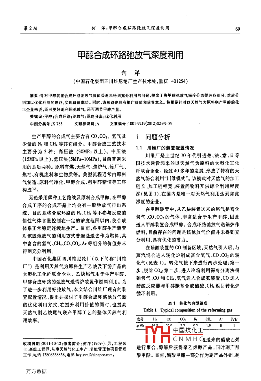 第2期何洋:甲醇合成環(huán)路弛放氣深度利用甲醇合成環(huán)路弛放氣深度利用何洋(中國石化集團(tuán)四川維尼綸廠生產(chǎn)技術(shù)處,重慶401254)摘要:針對甲醇裝置合成環(huán)路弛放氣價(jià)值普遍未得到充分利用的問題提出了將甲醇弛放氣深冷分離提純各組分然后分別加以優(yōu)化利用的思路,實(shí)現(xiàn)價(jià)值翻倍。同時,該思路也具有推廣價(jià)值和借鑒意義。特別是針對以天然氣為原料聯(lián)產(chǎn)甲醇的化工企業(yè)來說,既可更好地利用弛放氣,還可調(diào)節(jié)甲醇產(chǎn)量關(guān)鍵詞:甲醇;合成環(huán)路;弛放氣;深冷分離;優(yōu)化利用中圖分類號:X783文獻(xiàn)標(biāo)識碼A文章編號:1001-92192012)026905生產(chǎn)甲醉的合成氣主要含有COCO2氫氣及1問題分析少量的N2和CH4等其它組分。甲醇合成工藝技術(shù)主要分為3種:高壓法(30MPa以上)、中壓法1.1川維廠的裝置配置情況(15MPa以上)低壓法(5MPa~10MPa),目前普遍采川維廠是上世紀(jì)70年代引進(jìn)德、法、意、日等用的是后兩種。原料有煤、天然氣、焦?fàn)t氣煉廠氣、國技術(shù)建設(shè)起來的以天然氣為原料的大型化工化焦油、有機(jī)廢料和生物質(zhì)等。典型流程通常由原料纖聯(lián)合企業(yè)。經(jīng)過40多年的發(fā)展形成了特有的天氣刮造原料氣凈化甲醇合成、粗甲醇精餾等工序然氣綜合利用川維模式"。該模式對天然氣的加工構(gòu)成時。鏈長、加工鏈幅寬、裝置間物料互供綜合利用程度無論采用哪種工藝路線及原料合成甲醇在甲醇深(見圖1),在國內(nèi)是唯一對天然氣利用達(dá)到如此合成工序的合成環(huán)路上均會有一股弛放氣排出系深度的企業(yè)。統(tǒng),目的是將合成環(huán)路的N2、CH等不參與反應(yīng)的在甲醇裝置中,從乙炔裝置送來的尾氣是富含惰性氣體含量控制在一定的濃度范圍以內(nèi)使合成氫氣、c0、CO2的氣體非常適合于生產(chǎn)甲醇因此體系正常穩(wěn)定連續(xù)地生產(chǎn)。目前,各甲醇生產(chǎn)裝置送入甲醇裝置合成甲醇。合成環(huán)路弛放氣送鍋爐作對該股弛放氣的利用方式普遍是送去作為燃料,其燃料,目前存在的問題是該弛放氣價(jià)值并未得到充中富含的氫氣、CH4、CO、CO2、Ar等組分的價(jià)值并未分利用具有優(yōu)化的潛力。得到充分利用。在醋酸裝置的CO制備區(qū)域,天然氣引入后,與中國石化集團(tuán)四川維尼輪廠(以下簡稱“川維蒸汽混合進(jìn)入轉(zhuǎn)化爐制成富含氫氣002的轉(zhuǎn)廠")是利用天然氣為原料生產(chǎn)乙炔及下游產(chǎn)品的化氣(見表1)。轉(zhuǎn)化氣接下來進(jìn)行兩步處理:第大型化工化纖聯(lián)合企業(yè),乙炔尾氣用于生產(chǎn)甲醇,步,脫除CO2;第二步,進(jìn)入冷箱利用深冷分離法得甲醇合成環(huán)路的弛放氣送鍋爐裝置作燃料利用。為到氫氣、CO和CH,氫氣送入合成氨裝置,CO送入了進(jìn)一步利用好弛放氣,本文結(jié)合川維廠現(xiàn)有的裝醋酸反應(yīng)器與甲醇羰基合成醋酸,CH返回轉(zhuǎn)化爐置配置情況,提出并探討了甲醇合成環(huán)路弛放氣新循環(huán)利用的優(yōu)化利用方式,在提升利用價(jià)值的同時,也提高表1轉(zhuǎn)化氣典型組成天然氣制乙炔尾氣聯(lián)產(chǎn)甲醇工藝的整體天然氣利Table 1 Typical composition of the reforming gas用效率。成分H2C0CO2N2CHAr其它%90中國煤化工CNMH送來的醋酸乙烯收稿日期:20110-12;作者簡介:何洋(1969),男,工程碩士高級工程師,從事天然氣化工生產(chǎn),節(jié)能管理和項(xiàng)目管理進(jìn)行聚合、醇解后獲得聚乙烯醇產(chǎn)品,同時副產(chǎn)醋工作,電話13808338858,電郵hey.swnI@stnopec.com酸甲酯。目前,醋酸甲酯一部分作為副產(chǎn)品外銷,剩70天然氣化工2012年第37卷醋酸酷酸裝置醋酸酯裝置弛氣VAE裝置去釵甲醇裝置甲醛裝置醋酸乙烯尾中醇天乙炔裝置階酸乙烯裝置酯酸乙烯小聚乙烯醇裝置乙炔氧氣聚乙烯空氣空分裝置合成氨裝置維綸裝置圖1川維廠裝置流程框圖及物料互供圖Fig1 Flow diagram of mutual provision of materials between equipments in Sichuan Vinylon Works余部分在分解塔內(nèi)分解再次得到醋酸和甲醇并返N2、Ar等不參與反應(yīng)的惰性氣體會在環(huán)路中不斷富循環(huán)使用。醋酸甲酯也具有進(jìn)一步優(yōu)化利用的潛集。因些,約10000m}h弛放氣從合成環(huán)路中抽取力。出來(見表2)以維持系統(tǒng)平衡。取出的弛放氣首先以上川維廠的裝置配置情況,為甲醇裝置合成通過膜分離單元分離為富氫氣和富碳?xì)?(見表3)環(huán)路弛放氣深入優(yōu)化利用提供了條件。兩股。其中,富氫氣返回系統(tǒng),另一股約47000mh12甲醇合成環(huán)路弛放氣問題富碳?xì)?1進(jìn)一步分成兩股,富碳?xì)?送至燃料氣總川維廠新建30萬a醋酸乙烯項(xiàng)目于2011年管帶走部分惰性氣體剩余富碳?xì)馑虯TR轉(zhuǎn)化爐7月建成投運(yùn)后,停運(yùn)了原來的兩套尾氣甲醇裝置,加入適當(dāng)氧氣進(jìn)行部分氧化使其中的CH轉(zhuǎn)化成所有尾氣均送新建的77萬ta大甲醇裝置作原料合成氣再次返回系統(tǒng)利用。(見圖2)。表2甲醇裝置弛放氣典型組成富碳?xì)?去燃料氣總苦Table 2 Typical composition of the purge gas of methanol島碳?xì)鈒轉(zhuǎn)化妒組分H2CoCO2N2CH4Ar其它φ/%6223821391125808含成環(huán)路敢氣轉(zhuǎn)化氣表3弛放氣膜分離的富碳?xì)獾湫徒M成中國煤化
