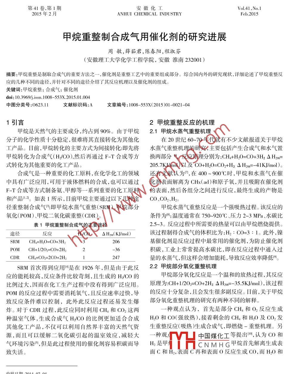 第41卷,第1期安徽化工Vol 41. No. 12015年2月ANHUI CHEMICAL INDUSTRYFeb.2015甲烷重整制合成氣用催化劑的研究進(jìn)展周敏,薛茹君,陳春陽(yáng),程淑芬(安徽理工大學(xué)化學(xué)工程學(xué)院,安徽淮南232001l摘要:甲烷重整是制取合成氣的重要方法之一,催化劑是重整工藝中的重要組成部分。綜合國(guó)內(nèi)外的研究現(xiàn)狀,詳細(xì)論述了甲烷重整反應(yīng)的幾種不同的途徑,并針對(duì)不同的途徑介紹了其反應(yīng)機(jī)理以及催化劑的組成。關(guān)鍵詞:甲烷重整;合成氣;催化劑doi:10.3969isn.1008-553X.201501.004中圖分類(lèi)號(hào):0623.11文獻(xiàn)標(biāo)識(shí)碼:A文章編號(hào):1008-553X(2015)01-0021-041引言2甲烷重整反應(yīng)的機(jī)理甲烷是天然氣的主要成分,約占到90%。由于甲烷2.1甲烷水蒸氣重整機(jī)理分子的化學(xué)性質(zhì)十分穩(wěn)定,很難將其直接轉(zhuǎn)化為其他化在20世紀(jì)60~70年代就有不少文獻(xiàn)報(bào)道關(guān)于甲烷工產(chǎn)品。目前,甲烷轉(zhuǎn)化的主要方式為間接轉(zhuǎn)化:即先將水蒸氣重整機(jī)理的研究,主要包括產(chǎn)生合成氣和水氣置甲烷轉(zhuǎn)化為合成氣(HCO),然后再通過(guò)F-T合成等方換兩部分,反應(yīng)原理分別為:CH4+HO=CO+3H2△H2e=式轉(zhuǎn)化為其他重要的化工產(chǎn)品。2057KJ/mol)以及CO+H2O=CO2+H3△H2=-41KJ/mol)。合成氣是一種重要的化工原料,在化學(xué)化工的領(lǐng)域還有文獻(xiàn)認(rèn)為,在400~900℃時(shí),甲烷和水蒸氣在催中具有廣泛應(yīng)用,可用于液體燃料的合成,也可以通過(guò)化劑表面解離為CHx(ad)和原子氧,并且吸附在催化劑F-T合成等方式制備氨、甲醇等一系列重要的化工原料的表面,然后各組分之間進(jìn)行反應(yīng),最終生成的產(chǎn)物是和產(chǎn)品。如表1所示,目前甲烷主要通過(guò)以下幾種途CO、CO2、H2徑重整制合成氣:即甲烷水蒸氣重整(SRM)、甲烷部分甲烷水蒸氣重整反應(yīng)是一個(gè)強(qiáng)吸熱過(guò)程。該反應(yīng)的氧化(POM)、甲烷二氧化碳重整(CDR)。條件為:溫度通常在750~920℃、壓力2~3MPa、水碳比表1甲烷重整制合成氣的主要途徑2.5~3。反應(yīng)過(guò)程中所需要的熱量可以由甲烷燃燒提供。途徑反應(yīng)HCO△Hx( KJ/mol)該過(guò)程制得合成氣的體積比為:H2:CO=3:1。此外,鎳SRM CH4+H,0=CO+3H2206基催化劑是反應(yīng)過(guò)程中最常用的催化劑,為防止催化劑積碳,工業(yè)上常常提高水碳比,即在反應(yīng)過(guò)程中通人過(guò)CDR CH+CO2=2C0+2H%量的水蒸氣,但這樣會(huì)增加能耗,導(dǎo)致反應(yīng)效率降低門(mén)。SRM首次得到應(yīng)用是在1926年,但是由于此反22甲烷部分氧化重整機(jī)理應(yīng)的能耗較高,反應(yīng)條件比較苛刻,且生成的HCO的甲烷部分氧化反應(yīng)是一個(gè)溫和的放熱過(guò)程,其反應(yīng)比例過(guò)大,因而在化工生產(chǎn)過(guò)程中沒(méi)有得到廣泛應(yīng)用。原理為CH+1/2O=CO+2H2△H2=-35.5KJ/mo),該過(guò)程POM的反應(yīng)過(guò)程中需要消耗氧氣,且反應(yīng)速率過(guò)快,導(dǎo)的反應(yīng)十分復(fù)雜,且會(huì)發(fā)生很多副反應(yīng)。目前,關(guān)于甲烷致反應(yīng)條件難以控制,此外此反應(yīng)過(guò)程還易發(fā)生爆部分氧化重整機(jī)理的研究有兩種不同的解釋炸。對(duì)于CDR過(guò)程,此反應(yīng)同時(shí)利用CH4和CO2這兩種觀點(diǎn)認(rèn)為,首先是部分CH4和O2反應(yīng)生成種溫室氣體,生成合成氣H/CO的比例更加適合合成H和CO(強(qiáng)放熱),接著剩余的CH4和HO及CO2發(fā)其他化工產(chǎn)品,不僅可以利用自然界豐富的天然氣資生重整反應(yīng)(吸熱)生成合成氣,即燃燒-重整機(jī)理。另源而且可以緩解二氧化碳引起的溫室效應(yīng),減輕大一種觀V凵中國(guó)煤化工等提出,認(rèn)為CO和氣環(huán)境污染,但是此過(guò)程使用的催化劑容易積碳而導(dǎo)H2是甲CNMHG甲烷首先解離生成表致失活。面C和H,表面C再和表面O反應(yīng)生成CO,而H2O和收稿日期:2014-07-04作者簡(jiǎn)介:周敏(1991-),女,在讀碩士研究生,研究方向:工業(yè)催化,18155461404,18155461404@163c總第193期2015年第1期(第41卷安徽化工CO2則是CO和H2深度氧化的產(chǎn)物,即直接氧化機(jī)理。以及不易積碳的特性。但是在實(shí)際使用中考慮到貴金屬2.3甲烷二氧化碳重整機(jī)理的成本較高,人們往往選擇價(jià)廉的非貴金屬∞2(Fe、Co甲烷二氧化碳重整反應(yīng)原理為:CH+CO2=2CO+2H2Ni等)催化劑。此外雙金屬組分Ni-Cu、Ni-Rh、Ni-Pt(△Hx=247KJ/mo),CO2+H2=CO+H2O(△H2=4096 K J/mol) Pt-Au、Pt-Sn、P1-Co、Ni-Co、Ni-Fe、Ni-Cu等催化劑也表大量的硏究證明,該過(guò)程不是直接發(fā)生的,其反應(yīng)機(jī)理現(xiàn)了較好的催化活性和穩(wěn)定性至今沒(méi)達(dá)到統(tǒng)一,一直是科學(xué)研究關(guān)注的焦點(diǎn)叫。近年來(lái),許多研究者們對(duì)鎳基催化劑進(jìn)行了廣泛而種觀點(diǎn)認(rèn)為,CH4與CO2的重整可以看成甲烷深入的研究,發(fā)現(xiàn)鎳基催化劑不僅具有與貴金屬催化劑分子先逐步脫去H原子再與催化劑活性中心結(jié)合形成相當(dāng)?shù)幕钚?而且其價(jià)格便宜,具有很好的應(yīng)用前景,在新的活性基團(tuán),同時(shí)釋放出H2,新的活性基團(tuán)再奪取工業(yè)上得到廣泛的應(yīng)用。 Tokunaga等人將第Ⅷ族非貴CO2中的O原子形成2個(gè)CO分子,同時(shí),CH4與CO2的金屬Fe、Co、N負(fù