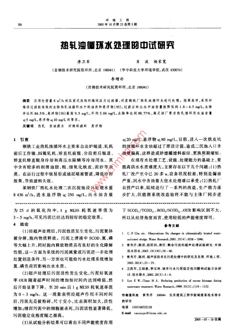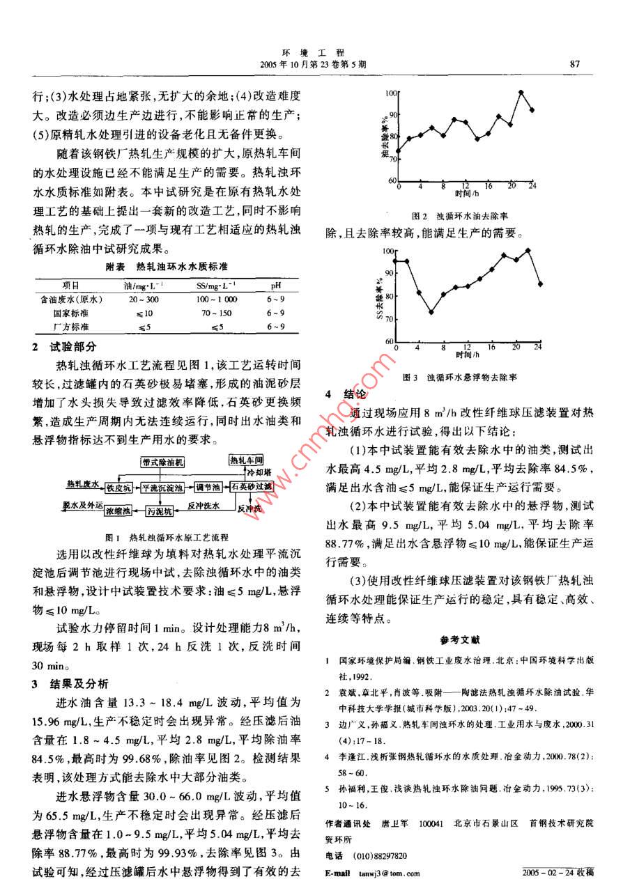環(huán)境工程2005年10月第23卷第5期熱軋迎循環(huán)水逃理的中試研唐衛(wèi)軍肖波楊家寬(首鋼技術(shù)研究院資環(huán)所,北京100041)(華中科技大學(xué)環(huán)境學(xué)院,武漢430074)李增樸(首鋼技術(shù)研究院資環(huán)所,北京100041)摘要應(yīng)用處理量8m3/h的壓緊式改性纖維球壓力過濾器,對某鋼鐵廠熱軋濁循環(huán)水進行處理。結(jié)果表明,釆用纖維球過濾能有效的去除熱軋濁循環(huán)水中的油類和懸浮物(SS),過濾后的出水中油含量能降低到1.8~45mg/L,去除率達到84,5%,懸浮物(S最高9.5mg/I,平均5.04mg/L,去除率達到88.77%,滿足該廠要求熱軋循環(huán)用水油含量≤5mg/L,懸浮物≤10mgL的要求關(guān)螻詞熱軋含油痰水纖維球濾料懸浮物1引言≤20mg/L、懸浮物≤80mg/L,目前,進入一次鐵皮坑鋼鐵工業(yè)熱軋濁循環(huán)水主要來自出爐輥道、乳軋機的濁循環(huán)水含油超過了原設(shè)計值,造成二沉池入口含前后工作輥、四輥軋機、矯直機前輥、分段剪后輥道、油量偏高,這樣造成砂濾罐濾料板結(jié)、更換周期縮短。矯直機矯直輥身冷卻和高壓水除鱗等冷卻用水。其在現(xiàn)有水處理工藝、設(shè)施、處理能力的基礎(chǔ)上,要中含有較多的潤滑油脂,粗、細氧化鐵皮,泥砂等雜提高供水水質(zhì)難度大,主要存在以下幾個問題:(1)熱質(zhì)。在運行過程中極易形成油泥堵塞管道降低冷卻軋廠投產(chǎn)至今已20多a,設(shè)備狀況較差,特別是漏油效果,導(dǎo)致濾料失效。嚴重,回水中含油量大使水處理難以承受;(2)熱軋廠某鋼鐵廠熱軋水處理二次沉淀池設(shè)計處理水量自投產(chǎn)以來,陸續(xù)進行了一系列的改造,生產(chǎn)能力逐8436m3/h,進水懸浮物≤250mg/L,出水油含量步擴大,但能源系統(tǒng)改造始終不能與主體廠同步進為25d的氧化溝中, I g MLSS耗氧速率值為下scoD,/ TCODcr、BOD2 SCODG、OUR影響區(qū)別不大3~5mg/h,可見污泥已經(jīng)達到較好的穩(wěn)定效果。所以從經(jīng)濟角度而言,使用較低的聲能密度即可。4結(jié)論考文獻(1)經(jīng)超聲處理后,污泥性質(zhì)發(fā)生變化,污泥絮體1 C P Chu etc. Observations On changes in ultrasonically treated waste-被分解,胞內(nèi)物質(zhì)釋放。污泥上清液中SCOD、氮、磷activaled Sludge. Water Research, 2001. 35(4): 1038-1046等大幅上升,同時胞內(nèi)釋放物質(zhì)具有良好的生化降解2曹秀芹陳增歐陽利唐臣剩余污泥的超聲處理試驗研究中國性能,這一方面為系統(tǒng)的污泥減量或污泥進一步處理給水排水,2003.19(130):58處置創(chuàng)造條件,另一方面也可能給污水處理系統(tǒng)增加3曹秀芹,陳f超聲波技術(shù)在污泥處理中的研究及發(fā)展環(huán)境L程氮、磷負荷而影響出水水質(zhì)。200220(4):23-4王凱軍,王曉惠,李寶林城市污水污泥穩(wěn)定性問題和試驗方法探(2)超聲處理后污泥活性發(fā)生變化,污泥好氧速討給水排水,2002.28(5):5~8率OUR隨著超聲時間的增加短時間內(nèi)達到峰值,然5 LOwe w., Chase h a. Reducing production of excess biomass during后開始顯著下降。至20min后 i g miss耗氧速率值wastewater treatment. Water Research, 1999. 33(5): 1119-1132為0~3mg/h。這…現(xiàn)象表明經(jīng)超聲作用不同時間作者通訊處卿秀芹1004北京建筑工程學(xué)院城建系給水排水后,污泥先是被粉碎,尺寸變小,比表面積加大,活性教研室增加;繼而污泥中的細胞被殺死,污泥活性顯著降低,電話(006822污泥穩(wěn)定化程度隨之提高。E-mail caoxiuqin@ bicea. edu.en從試驗分析結(jié)果可以看出不同聲能密度作用2005-03-10收稱環(huán)境工程2005年10月第23卷第5期行;(3)水處理占地緊張,無擴大的余地;(4)改造難度大。改造必須邊生產(chǎn)邊進行,不能影響正常的生產(chǎn)(5)原精軋水處理引進的設(shè)備老化且無備件更換。隨著該鋼鐵廠熱軋生產(chǎn)規(guī)模的擴大,原熱軋車間的水處理設(shè)施已經(jīng)不能滿足生產(chǎn)的需要。熱軋濁環(huán)水水質(zhì)標準如附表。本中試研究是在原有熱軋水處理工藝的基礎(chǔ)上提出一套新的改造工藝,同時不影響圖2濁循環(huán)水油去除率熱軋的生產(chǎn),完成了一項與現(xiàn)有工藝相適應(yīng)的熱軋濁除,且去除率較高,能滿足生產(chǎn)的需要循環(huán)水除油中試研究成果附表熱軋濁環(huán)水水質(zhì)標準項日油/ng1-smg;L含油廢水(原水)20100~1000國家標準70-150廠方標準2試驗部分熱軋濁循環(huán)水工藝流程見圖1,該工藝運轉(zhuǎn)時間較長,過濾罐內(nèi)的石英砂極易堵塞,形成的油泥砂層圖3濁循環(huán)水懸浮物去除率增加了水頭損失導(dǎo)致過濾效率降低,石英砂更換頻4結(jié)論繁,造成生產(chǎn)周期內(nèi)無法連續(xù)運行,同時出水油類和通過現(xiàn)場應(yīng)用8m3/h改性纖維球壓濾裝置對熱懸浮物指標達不到生產(chǎn)用水的要求。軋濁循環(huán)水進行試驗,得出以下結(jié)論:(1)本中試裝置能有效去除水中的油類,測試出〔帶式除油機熱軋車間水最高4.5mg/L,平均2.8mg/L,平均去除率84.5%,-鐵皮抗平流沉淀池“調(diào)節(jié)油英砂過鴻滿足出水含油≤5mg/L,能保證生產(chǎn)運行需要。愿水及外還漲縮泡[抗反沖選水反沖洗(2)本中試裝置能有效去除水中的懸浮物,測試出水最高9.5mg/L,平均5.04mg/L,平均去除率圖1熱軋濁循環(huán)水原工藝流程選用以改性纖維球為填料對熱軋水處理平流沉8877%,滿足出水含懸浮物≤10mg/L,能保證生產(chǎn)運淀池后調(