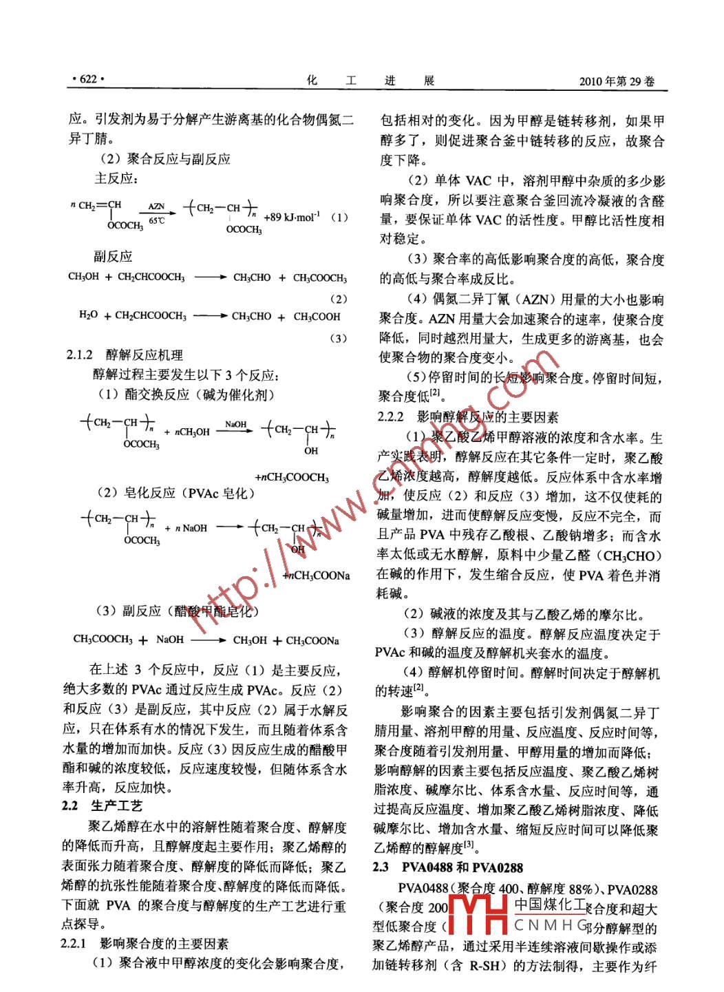 化工進(jìn)展2010年第29卷增刊CHEMICAL INDUSTRY AND ENGINEERING PROGRESS●621●乙酸乙烯與聚乙烯醇生產(chǎn)的新技術(shù)研究及應(yīng)用李群生,鄒高興,駱土夫,陳文,張滿霞(北京化工大學(xué)化學(xué)工程學(xué)院,北京100029)摘要:介紹了110 m3乙酸乙烯合成流化床反應(yīng)器的結(jié)構(gòu)和特點(diǎn),探討了聚乙烯醇醇解過程中聚合度和醇解度的影響因素以及低聚合度、低醇解度PVA產(chǎn)品0488和0288的生產(chǎn)方法,接著介紹了高效導(dǎo)向篩板塔、新型高效填料塔及金屬絲網(wǎng)除霧器等新型塔器分離技術(shù)在PVA行業(yè)中的成功應(yīng)用,達(dá)到了節(jié)能減排、提高經(jīng)濟(jì)效益的目的.關(guān)鍵詞:聚乙烯醇;流化床反應(yīng)器;分離新技術(shù);節(jié)能減排聚乙烯醇(PVA)是一種典型的水溶性結(jié)晶高分子聚合物,具有優(yōu)良的力學(xué)性能和表面活性,在工業(yè)中廣泛應(yīng)用。特別是其具有的水溶性和優(yōu)良的成膜性,是其它聚 合物難以相比的。聚乙烯醇的性質(zhì)與其聚合度和醇解度密切相關(guān),而性質(zhì)決定了其應(yīng)用領(lǐng)域。常規(guī)聚乙烯醇品種由于在耐熱、耐水、耐蠕變性等方面存在缺點(diǎn),影響了其應(yīng)用范圍。流化床合成反應(yīng)器是化工工藝過程中普遍采用的一種生產(chǎn)裝置,尤其是在乙炔法生產(chǎn)乙酸乙烯的工藝中,流化床床合成反應(yīng)器更是必不可少且非常重要的生產(chǎn)裝置。流化床反應(yīng)器的外型尺寸、結(jié)構(gòu)布置、催化劑的內(nèi)存量、分配板阻力降的高低和氣體分布的均勻程度等,決定著催化劑的沸騰流化圖1 110 m3流化床反應(yīng)器狀態(tài),以致于影響化學(xué)反應(yīng)的穩(wěn)定性、安全性和經(jīng)1-下錐體; 2-預(yù)分配器: 3- -多層氣體分布板: 4- 催化劑床層:5一項(xiàng)部擴(kuò)大體PVA生產(chǎn)屬于化工過程,主要涉及化工反應(yīng)過程與化工分離過程。自20世紀(jì)六七十年代以來,化板中,最下部?jī)蓪用繉佣疾捎貌煌讖?、不同開孔工分離技術(shù)的研究十分活躍,針對(duì)精餾和吸收過程,率的氣體分布板,在催化劑床層中填充有催化劑,人們開發(fā)了多種塔板和填料,其中以高效導(dǎo)向篩板頂部擴(kuò)大體為中空大腔體。其中部?jī)?nèi)徑為(7500土與新型填料為主。在20世紀(jì)80年代和90年代初,500) mm,底口內(nèi)徑為(4620士300) mm,上口內(nèi)發(fā)達(dá)國(guó)家紛紛將這些已開發(fā)成功的高、新技術(shù)應(yīng)用徑為(3568士250) mm。該流化床反應(yīng)器的催化劑于工業(yè)生產(chǎn)中,降低了成本,提高了產(chǎn)品質(zhì)量和競(jìng)內(nèi)存量可達(dá)110m', 具有內(nèi)存大、空速高、分布板爭(zhēng)力。目前,我國(guó)PVA行業(yè)也認(rèn)識(shí)到了這一-點(diǎn), 十阻力小、氣體分布均勻、流化狀態(tài)好、反應(yīng)質(zhì)量高、分注意采用新技術(shù),進(jìn)行技術(shù)改造,以達(dá)到擴(kuò)產(chǎn)、催化劑消耗少、振動(dòng)小等優(yōu)點(diǎn)"。節(jié)能、增效。提高企業(yè)技術(shù)水平和競(jìng)爭(zhēng)力的目的。2低聚合度、低醇解度聚乙烯醇產(chǎn)品1 110m3合成流化床反應(yīng)器(見圖1)PVA0488、PVA0288該流化床合成反應(yīng)器,自底部氣體入口至頂部出口,依次為下錐體、多層氣體分布板、催化劑床2.1生產(chǎn)原中國(guó)煤化工層和頂部擴(kuò)大體,其特征是在下錐體中,設(shè)置由上、2.1.1聚合THCNMHG下部?jī)芍诲F形體以底面對(duì)接的分配器,預(yù)分配器的(1)乙烯醇(VAC)的聚合萬法:引發(fā)劑引發(fā)上、下錐體頂點(diǎn)處開設(shè)氣流通孔,在多層氣體分布聚合, 即用引發(fā)劑產(chǎn)生游離基引發(fā)VAC單體聚合反●622化工進(jìn)展2010年第29卷應(yīng)。引發(fā)劑為易于分解產(chǎn)生游離基的化合物偶氮二包括相對(duì)的變化。因?yàn)榧状际擎溵D(zhuǎn)移劑,如果甲異丁腈。醇多了,則促進(jìn)聚合釜中鏈轉(zhuǎn)移的反應(yīng),故聚合(2)聚合反應(yīng)與副反應(yīng)度下降。主反應(yīng):(2)單體VAC中,溶劑甲醇中雜質(zhì)的多少影響聚合度,所以要注意聚合釜回流冷凝液的含醛nCH2=CH_ AN、 +cH-cH十0COCH3 65C”+89kJ.mo:' (1)量,要保證單體VAC的活性度。甲醇比活性度相0C0CH3對(duì)穩(wěn)定。副反應(yīng)(3)聚合率的高低影響聚合度的高低,聚合度CH2OH + CH2CHCOOCH3CHzCHO + CH2C0OCH3的高低與聚合率成反比。(2)(4)偶氮二異丁氰(AZN)用量的大小也影響H2O + CH2CHCOOCH3一十CHzCHO + CHzCOOH聚合度。AZN用量大會(huì)加速聚合的速率,使聚合度(3)降低,同時(shí)越烈用量大,生成更多的游離基,也會(huì)2.1.2醇解 反應(yīng)機(jī)理使聚合物的聚合度變小。醇解過程主要發(fā)生以下3個(gè)反應(yīng):(5)停留時(shí)間的長(zhǎng)短影響聚合度。停留時(shí)間短,(1)酯交換反應(yīng)(堿為催化劑)聚合度低[2。tah-qt +.CHOH . NOHL +an-qaH+,2.2.2影響醇 解反應(yīng)的主要因素OCOCHy(1)聚乙酸乙烯甲醇溶液的濃度和含水率。生H產(chǎn)實(shí)踐表明,醇解反應(yīng)在其它條件- -定時(shí), 聚乙酸+nCHzCOOCH3乙烯濃度越高,醇解度越低。反應(yīng)體系中含水率增(2)皂化反應(yīng)(PVAc皂化)加,使反應(yīng)(2)和反應(yīng)(3)增加,這不僅使耗的fah -CH++nNaOH一→+aH-cH十堿量增加,進(jìn)而使醇解反應(yīng)變慢,反應(yīng)不完全,而且產(chǎn)品PVA中殘存乙酸根、乙酸鈉增