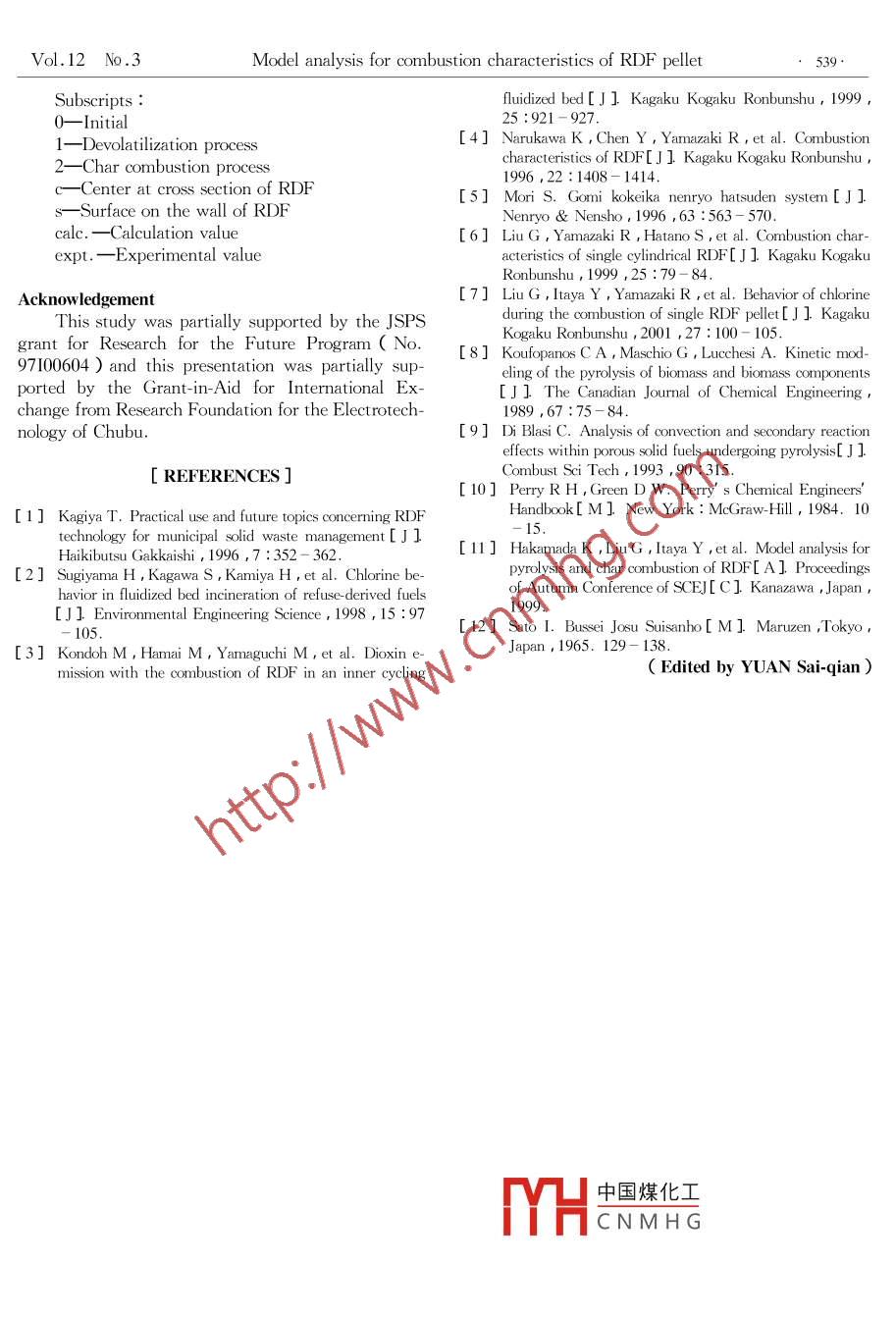 Vol.12 No. 3Trans. Nonferrous Met. Soc. ChinaJun.2002[ Article ID] 1003 - 6326( 2002 )03 - 0534 -06Model analysis for combustion characteristics of RDF pelletLIU Gui- qing' , H. Hakamada? , Y. Itaya' , S. Hatano' , s. Mori'( 1. Department of Chemical Engineering , Nagoya University , Japan ;2. Chemical & Environmental Engineering Department , Kawasaki Heavy Industries , Ltd. , Japan)[ Abstract ] Fundamental studies of the combustion characteristics and the de HCl behavior of a single refuse derived fuel( RDF ) pellet were carried out to explain the de-HCl phenomena of RDF during fluidized bed combustion and to providedata for the development of high efficiency power generation technology using RDF previously. For further interpretingthe devolatilization and the char combustion processes of RDF quantitatively , an unsteady combustion model for singleRDF pellet , involving reaction rates , heat transfer and oxygen diffusion in the RDF pellet , was developed. Comparisonsof simulation results with experimental data for mass loss of the RDF samples made from municipal solid waste ,woodchips and poly propylene when they were heated at 10K/ min or put into the furnace under 1 073 K show the verifiabilityof the model. Using this model ,the distributions of the temperature and the reaction ratio along the radius of RDF pelletduring the devolatilization process and the char combustion process were presented , and discussion about the inference ofheating rate on the combustion characteristics were performed.[ Key words ] refuse -derived fuel ; combustion characteristics ; de HCl ; modeling analysis[ CLC number ] X 705[ Document code ]A1 INTRODUCTIONflue gas and the release of dioxins is quite low aswelf2,3 Tests of RDF in fluidized bed combustionWith the development of industrialization and( FBC ) boiler have given unexpected high de _HCI effi-urbanization , proper treatment and recycling utilza-ciency( 60% ~ 85% ), resulting in very low concen-tion of wastes have become important tasks of our so-trations of HCl( below 10- 4 ) at the inlet of bag-ciety. The recycling approaches of solid wastes can behouse even under high furnace temperature ( 830~classified as material-recycle and energy-recovery. Al-850 C 2.4.5,1 , while the HCI removal efficiency inthough many wastes such as wood , paper and naturala stoker-type incinerator for MSW with lime injectionfiber can be recycled as material to reduce the con-was as low as4%~ 25 % , resulting in very high con-sumption of virgin materials , since the original mate-centration of HCl in the flue gas between5.51X 106rials of plastics , synthetic rubber and synthetic fibers~7.47X 10- 6come from petroleum ,thermal recycling of theseIn our previous studies,the combustion charac-wastes can not only treat the wastes effectively but al-teristics and the de-HCl effect of a single RDF pelletso reduce the consumption of petroleum used as fuel.have been investigated through a series of experiments .So the thermal recycling of wastes bcome an attrac-carried out in an electric furnace 6,71. Through thesetive approach for waste treatment and energy recov-fundamental studies ,it has been known that , 1 ) theery. Among the thermal treatment technologies ,usemass loss of RDF was mainly due to devolatilizationof refuse-derived fuel( RDF ) as starting materials forand the temperature gradient in the RDF pelletcombustion and gasification processes presents severalstrongly depended on the heating rate and the oxygenadvantages over direct use of municipal or other solidconcentration in the ambient gasos ;2 ) calcium com-wastes. RDF is generally produced by selecting thepounds added to RDF can capture more amount of Clcombustible fraction of municipal solid waste( MSW )released from the RDF under quick heating conditionby mechanical sorting and processing. This results inthan under the slow heating condition , and oxygena relatively constant composition and good transporta-concentration of the feed gas had a strong inference ontion and storage possibilities ,since putrescible compo-the capture of CI by the ash. The higher the oxygennents are eliminated with lime addition. Therefore ,concentration was , the lower the capture fraction ofRDF can be produced dispersively then transported toCl wa57].a large-scale treatment facility to accomplish efficientinformation on com-energy recovery and minimization of pollutior[1l. Es-bustic中國煤化工ICl mechanism duringpecially , some recent investigations have shown thatcomb:MYHCNMHGely,inthisstudy,ande-HCl behavior of the calcium compound in the RDFunsteady combustion model,involving reaction rate ,during the combustion of RDF in fluidized bed can ef-heat transfer and oxygen diffusion in RDF pellet , isfectively control the corrosion problem caused by thedeveloped. Using this model ,the distributions ofφ [Reeived.萬京數(shù)據(jù)- 10- 16 ;[ Accepted date ]2002 - 01 -24Vol.12 No .3Model analysis for combustion characteristics of RDF pellet535.temperature and reaction ratio along the radius ofReaction rate of char combustion ( based onRDF pellet during the devolatilization process and theGrain Model):char combustion process are predicted , and discus-E2R( xr), T(r ))= A2exp(sions about the inference of heating rate on the com-RT( rbustion characteristics are performed.C"(rX1-x{r)P/3 (8)2 MODEL3EXPERIMENT AND DETERMINATION OFPHYSICAL PROPERTIES AND MODEL PA-The samples used in this study are of shape inRAMETERScylinder with diameter between 1.5~2.0 cm andlength between 3.0~ 6.0 cm. According to the re-3.1Combustion experimentsults obtained in the previous study , the combustionAn electric heating reactor was used for combus-process of RDF consists of two sequential processes :tion experiments on single RDF pellets. The experi-the devoltilization process and the char combustionmental system was fully described previously61, soprocess. So in the combustion model two-step reac-only the essential features were given herein. The re-tion