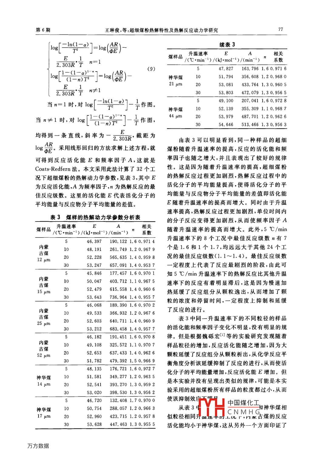 第46卷第6期鍋爐技術(shù)Vol 46, No 62015年11月BOILER TECHNOLOGYNov.,2015超細(xì)煤粉熱解特性及熱解反應(yīng)動(dòng)力學(xué)研究王琳俊,馬陽,劉加勛,姜秀民(上海交通大學(xué)機(jī)械與動(dòng)力工程學(xué)院,上海200240)摘要:采用TGDC分析方法對(duì)內(nèi)蒙古煤和神華煤兩種煤種各4個(gè)不同粒徑的超細(xì)煤粉分別在5℃/min10℃/min、20℃/min和30℃/min的升溫速率下進(jìn)行熱解實(shí)驗(yàn)并采集數(shù)據(jù)分析,研究了不同煤種超細(xì)煤粉熱解過程中煤粉粒徑、升溫速率煤種中組分對(duì)熱解過程的影響。最后根據(jù) Coats-Redfern法建立了動(dòng)力學(xué)模型并計(jì)算出了相關(guān)系數(shù)。結(jié)果表明:超細(xì)煤粉的熱解過程可以分為干燥脫氣、半焦形成和熟化成焦(二次脫氣)3個(gè)失重階段。關(guān)鍵詞:超細(xì)煤粉;熱解;熱重分析;SDT;動(dòng)力學(xué)參數(shù); Coats-Redfern法中圖分類號(hào):TQ530.2文獻(xiàn)標(biāo)識(shí)碼:B文章編號(hào):1672-4763(2015)06-0073-060前言各4種粒徑,樣品重量約10mg,熱重實(shí)驗(yàn)載氣為流量100mL/min的高純度氮?dú)?用來保護(hù)爐內(nèi)根據(jù)國家能源局發(fā)布的數(shù)據(jù)顯示,2012年我的惰性反應(yīng)氣氛,并及時(shí)帶離煤熱解產(chǎn)生的揮發(fā)國已成為世界第一能源生產(chǎn)和消費(fèi)大國,我國的性產(chǎn)物以減少可能的二次反應(yīng)對(duì)樣品的瞬時(shí)重能源結(jié)構(gòu)中又以煤炭為主要形式。根據(jù)中國量數(shù)據(jù)的影響。實(shí)驗(yàn)中采用5℃/min、10℃2012年統(tǒng)計(jì)年鑒,2012年我國煤炭消耗量達(dá)到min、20℃/min30℃/min的升溫速率進(jìn)行熱298169萬噸,其中火電行業(yè)消耗達(dá)185548萬噸解,起始溫度為室溫,終止溫度為1000℃,同時(shí)占62.23%。大量煤炭消耗對(duì)資源、環(huán)境都帶來集TG和DSC數(shù)據(jù)了巨大壓力。超細(xì)煤粉作為一項(xiàng)新型潔凈煤技實(shí)驗(yàn)工況如表1所示。術(shù),對(duì)提高燃煤效率、改善燃燒特性和減少污染物排放有著巨大研究意義。煤的熱解作為煤燃表1熱解實(shí)驗(yàn)工況列表燒過程中的一個(gè)重要的初始過程,對(duì)煤粉著火有升溫速率/(℃·min-1)平均粒徑/μm極大的影響,也影響到燃燒的穩(wěn)定性及后期的燃內(nèi)盡問題1。由于煤的自身化學(xué)成分、物理結(jié)構(gòu)較蒙復(fù)雜,因此影響煤熱解的因素繁多,如粒徑21525升溫速率(3、溫度3、停留時(shí)間、煤的顯微組分、氣氛等。本文采用了內(nèi)蒙古煤和神華煤244442種不同煤種各4種粒徑的超細(xì)煤粉,利用TGDSC分析對(duì)不同升溫速率、不同粒徑下2種煤的1444熱解動(dòng)力學(xué)特性進(jìn)行了系統(tǒng)的研究。本實(shí)驗(yàn)采用空氣于燥基超細(xì)煤粉進(jìn)行實(shí)驗(yàn)和分析,使得實(shí)實(shí)驗(yàn)樣品的工業(yè)分析和元素分析如表2所驗(yàn)更接近工業(yè)應(yīng)用情況。示。元素分析采用 Vario elli型元素分析儀1實(shí)驗(yàn)介紹(德國 Elementar公司)進(jìn)行分析,氧元素由差減法獲得。工業(yè)分析采用 LECO MAC500(美國)本文實(shí)驗(yàn)中采用神華煤、內(nèi)蒙古煤2種煤種進(jìn)行分析。中國煤化工CNMHG收稿日期:2015-01-20作者簡介:王琳俊(1989-),男,碩士研究生,主要從事超細(xì)煤粉的熱解和燃燒過程中NOx等污染物的減排工作。74鍋爐技術(shù)第46卷表2內(nèi)蒙古煤和神華煤的工業(yè)分析與元素分析工業(yè)分析/%元素分析/%w(Md) w(vd) w(A,d) w(FC.d) w(Cad) w(h,d) w(Od) w(Nad) w(S,d)神華煤(SH)11.5024.2210.7053.5863.133.629.940.70內(nèi)蒙古煤(NMG)14.7235.6910.6438.9554.824.3914.580.630.22實(shí)驗(yàn)采用儀器為由美國TA公司生產(chǎn)的型我們選取平均粒徑為14pm的神華煤在號(hào)為SDTQ600同步熱分析儀,測溫范圍為室溫5℃/min、10℃/min、20℃/min和30℃/min的1400℃,測溫準(zhǔn)確度為±0.001℃,天平靈敏升溫速率下的4個(gè)工況進(jìn)行對(duì)比分析,得到SH14度為01gg,DSC靈敏度為1W,量熱準(zhǔn)確度的TG以及DTG曲線如圖1及圖2所示。由圖為士2%。1000℃以下允許最大升溫速率可知:第一階段最大失重速率發(fā)生在80℃左右,該80℃/min,1000℃~1400℃允許最大升溫速階段以自由水的大量蒸發(fā)脫出為開始跡象,后續(xù)率為20℃/min,800℃以上不能進(jìn)行恒溫實(shí)驗(yàn)。伴隨其他氣體的不斷析出,使得試樣失重。第二在做實(shí)驗(yàn)之前,使用藍(lán)寶石作為參考材料,進(jìn)行階段最大失重速率發(fā)生在450℃左右。第三階段同步熱分析系統(tǒng)溫度校正,同時(shí)也要對(duì)熱天平的失重不明顯,失重最大速率發(fā)生在700℃左右,說靈敏度進(jìn)行校正。同步熱分析( TG-DSC)將熱重明二次脫氣過程氣體析出量較少。分析TGA與差示掃描量熱DSC結(jié)合為一體,在對(duì)比4個(gè)工況的失重速率曲線我們發(fā)現(xiàn)隨同一次測量中利用同一樣品可同步得到熱重與著升溫速率的增加,一方面熱解失重速率的峰值差熱信息,據(jù)某一熱效應(yīng)是否對(duì)應(yīng)質(zhì)量變化,有增大,煤粉熱解過程更加劇烈。另一方面上述3助于判別該熱效應(yīng)所對(duì)應(yīng)的物化過程個(gè)階段的最大失重速率峰值所對(duì)應(yīng)的溫度向高2實(shí)驗(yàn)結(jié)果與分析溫度區(qū)域偏移,最大失重速率所對(duì)應(yīng)的溫度增加,例如,升溫速率為30℃/min的工況比升