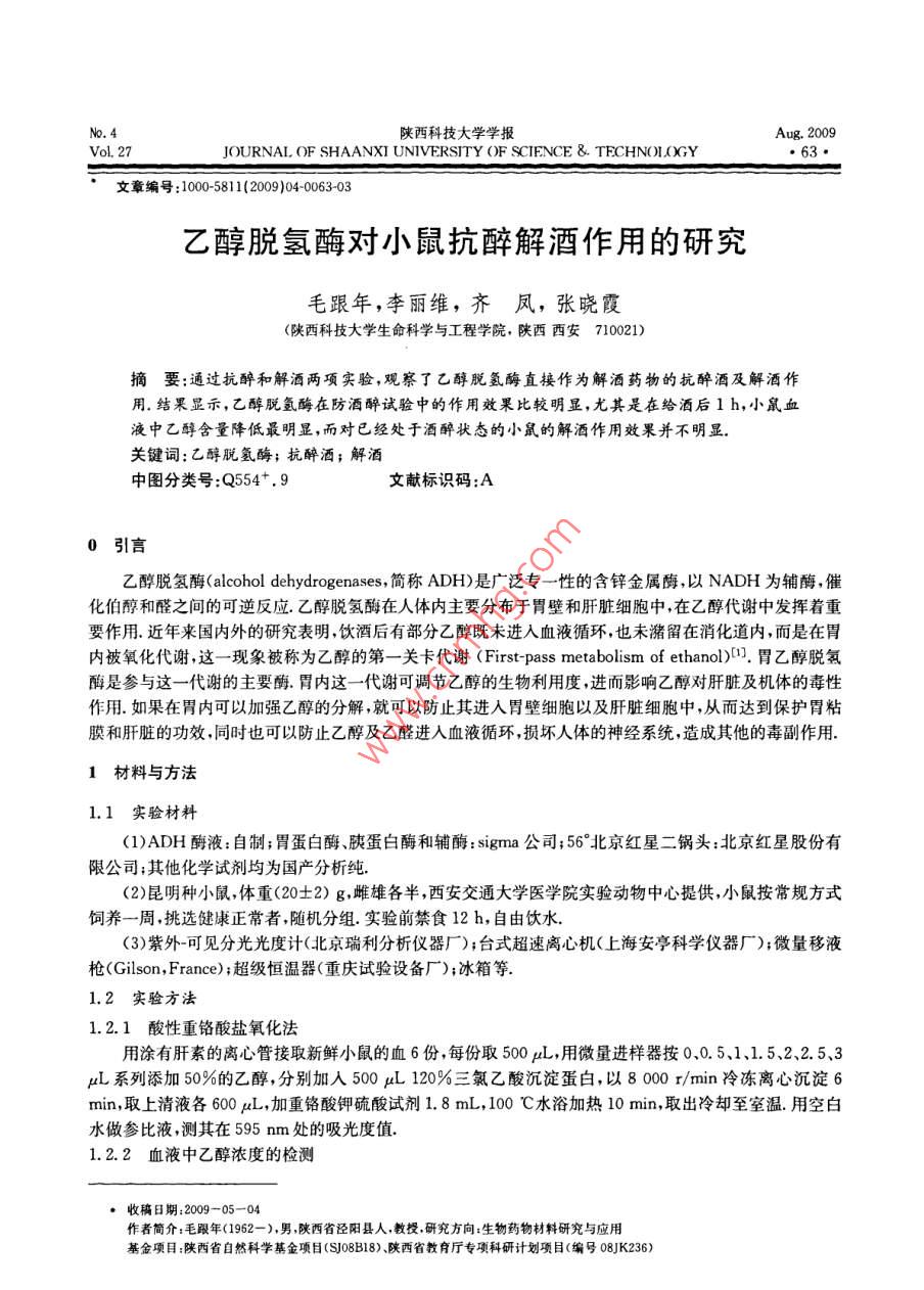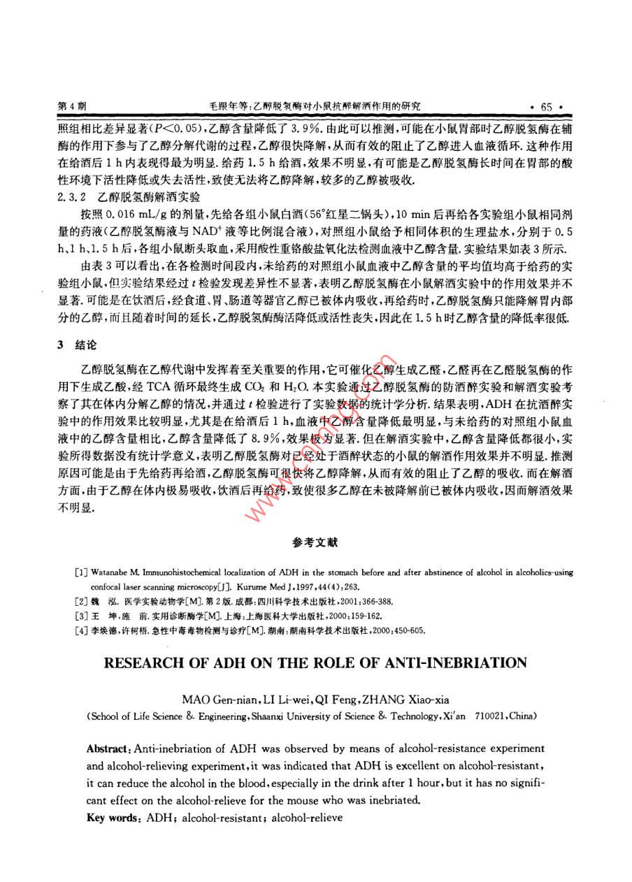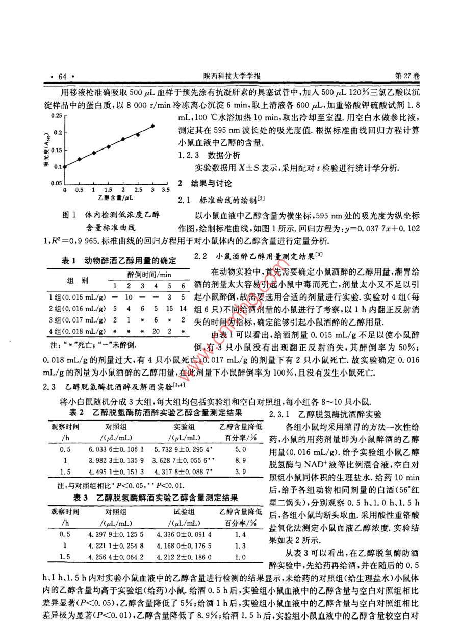 陜西科技大學(xué)學(xué)報(bào)Aug.2009Vo.27JOURNAL OF SHAANXI UNIVERSITY OF SCIENCE & TECHNOLOGY文章編號:1000-5811(2009)04006303乙醇脫氫酶對小鼠抗醉解酒作用的研究毛跟年,李麗維,齊鳳,張曉霞陜西科技大學(xué)生命科學(xué)與工程學(xué)院,陜西西安710021)摘要:通過抗醉和解酒兩項(xiàng)實(shí)驗(yàn),觀察了乙醇脫氬酶直接作為解酒藥物的抗醉酒及解酒作用.結(jié)果顯示,乙醇脫氬酶在防酒醉試驗(yàn)中的作用效果比較明顯,尤其是在給酒后1h,小鼠血液中乙醇含量降低最明顯,而對已經(jīng)處于酒醉狀態(tài)的小鼠的解酒作用效果并不明顯關(guān)鍵詞:乙醇脫氫酶;抗醉酒;解酒中圖分類號:Q554+,9文獻(xiàn)標(biāo)識碼:A0引言乙醇脫氫酶( alcohol dehydrogenases,簡稱ADH)是廣泛專一性的含鋅金屬酶,以NADH為輔酶,化伯醇和醛之間的可逆反應(yīng).乙醇脫氫酶在人體內(nèi)主要分布于胃壁和肝臟細(xì)胞中,在乙醇代謝中發(fā)揮著重要作用.近年來國內(nèi)外的研究表明飲酒后有部分乙醇既未進(jìn)入血液循環(huán),也未潴留在消化道內(nèi),而是在胃內(nèi)被氧化代謝,這一現(xiàn)象被稱為乙醇的第一關(guān)卡代謝( First-pass metabolism of ethanol).胃乙醇脫氡酶是參與這一代謝的主要酶.胃內(nèi)這一代謝可調(diào)節(jié)乙醇的生物利用度,進(jìn)而影響乙醇對肝臟及機(jī)體的毒性作用.如果在胃內(nèi)可以加強(qiáng)乙醇的分解,就可以防止其進(jìn)入胃壁細(xì)胞以及肝臟細(xì)胞中,從而達(dá)到保護(hù)胃粘膜和肝臟的功效,同時(shí)也可以防止乙醇及乙醛進(jìn)入血液循環(huán),損壞人體的神經(jīng)系統(tǒng),造成其他的毒副作用1材料與方法1.1實(shí)驗(yàn)材料(1)ADH酶液:自制;胃蛋白酶、胰蛋白酶和輔酶: sigma公司;56°北京紅星二鍋頭:北京紅星股份有限公司;其他化學(xué)試劑均為國產(chǎn)分析純(2)昆明種小鼠體重(20±2)g,雌雄各半,西安交通大學(xué)醫(yī)學(xué)院實(shí)驗(yàn)動物中心提供,小鼠按常規(guī)方式飼養(yǎng)一周挑選健康正常者隨機(jī)分組.實(shí)驗(yàn)前禁食12h,自由飲水(3)紫外可見分光光度計(jì)(北京瑞利分析儀器廠);臺式超速離心機(jī)(上海安亭科學(xué)儀器廠);微量移液槍( Gilson, france);超級恒溫器(重慶試驗(yàn)設(shè)備廠);冰箱等.1.2實(shí)驗(yàn)方法1.2.1酸性重鉻酸鹽氧化法用涂有肝素的離心管接取新鮮小鼠的血6份每份取500L,用微量進(jìn)樣器按0、0.5、1、1.5、2、2.5、3L系列添加50%的乙醇,分別加入500L120%三氯乙酸沉淀蛋白,以800r/min冷凍離心沉淀6min,取上清液各600μL,加重鉻酸鉀硫酸試劑1.8mL,100℃水浴加熱10min,取出冷卻至室溫.用空白水做參比液,測其在595nm處的吸光度值1.2.2血液中乙醇濃度的檢測收稿日期:2009-05-04作者簡介:毛跟年(1962-),男陜西省涇陽縣人,教投研究方向:生物藥物材料研究與應(yīng)用基金項(xiàng)目:陜西省自然科學(xué)基金項(xiàng)目(SJ08B18)、陜西省教育廳專項(xiàng)科研計(jì)劃項(xiàng)目(編號08JK236)陜西科技大學(xué)學(xué)報(bào)第27卷用移液槍準(zhǔn)確吸取500L血樣于預(yù)先涂有抗凝肝素的具塞試管中,加入500山L120%三氯乙酸以沉淀樣品中的蛋白質(zhì),以8000/min冷凍離心沉淀6min,取上清液各600L,加重鉻酸鉀硫酸試劑1.8mL,100℃水浴加熱10min,取出冷卻至室溫.用空白水做參比液,測定其在595mm波長處的吸光度值根據(jù)標(biāo)準(zhǔn)曲線回歸方程計(jì)算小鼠血液中乙醇的含量1.2.3數(shù)據(jù)分析實(shí)驗(yàn)數(shù)據(jù)用X±S表示,采用配對t檢驗(yàn)進(jìn)行統(tǒng)計(jì)學(xué)分析2結(jié)果與討論乙醇含量/AL2.1標(biāo)準(zhǔn)曲線的繪制2圖1體內(nèi)檢測低濃度乙醇以小鼠血液中乙醇含量為橫坐標(biāo),595nm處的吸光度為縱坐標(biāo)含量標(biāo)準(zhǔn)曲線作圖,繪制標(biāo)準(zhǔn)曲線,如圖1所示回歸方程為:y=0.0377x+0.1021,R2=0,9965.標(biāo)準(zhǔn)曲線的回歸方程用于對小鼠體內(nèi)的乙醇含量進(jìn)行定量分析表1動物醉酒乙醇用量的確定22小鼠酒醉乙醇用量測定結(jié)果1醉倒時(shí)間/min在動物實(shí)驗(yàn)中,首先需要確定小鼠酒醉的乙醇用量,灌胃給組別123456酒的劑量太大容易引起小鼠中毒而死亡,劑量太小又不足以引1組(0.015mL/g)-1035起小鼠醉倒,故需要選用合適的劑量進(jìn)行實(shí)驗(yàn).實(shí)驗(yàn)對4組(每2組.016mLg)54651514組6只)不同給酒劑量的小鼠進(jìn)行了考察,以1h內(nèi)翻正反射消3組(0.017mL/g)21失的時(shí)間為指標(biāo),確定能夠引起小鼠酒醉的乙醇用量4組(0.018mL/g)由表1可以看出,給酒劑量0.015mL/g不足以使小鼠醉注:“*”死亡;“一”未醉倒倒,有3只小鼠沒有出現(xiàn)翻正反射消失,其醉倒率為50%0.018mL/g的劑量過大,有4只小鼠死亡;0.017mL/g的劑量下有2只小鼠死亡故實(shí)驗(yàn)確定0.016mL/g的劑量為小鼠酒醉的乙醇用量,在此劑量下小鼠醉倒率為100%且沒有發(fā)生小鼠死亡2.3乙醇脫氫酶抗酒醉及解酒實(shí)驗(yàn)4將小白鼠隨機(jī)分成3大組,每大組均包括實(shí)驗(yàn)組和空白對照組,每小組各8~10只小鼠表2乙醇脫氫酶防酒醉實(shí)驗(yàn)乙醇含量測定結(jié)果2.3.1乙醇脫氫酶抗酒醉實(shí)驗(yàn)觀察時(shí)間對照組實(shí)驗(yàn)組乙醇含量降低各組小鼠均采用灌胃的方法一次性給h/(l/ml)/l/m1)百分率/%藥,小鼠的用藥劑量即為小鼠醉酒的乙醇0.56.08360.106157329±0.29545.0用量(0.016mL/g)給予實(shí)驗(y