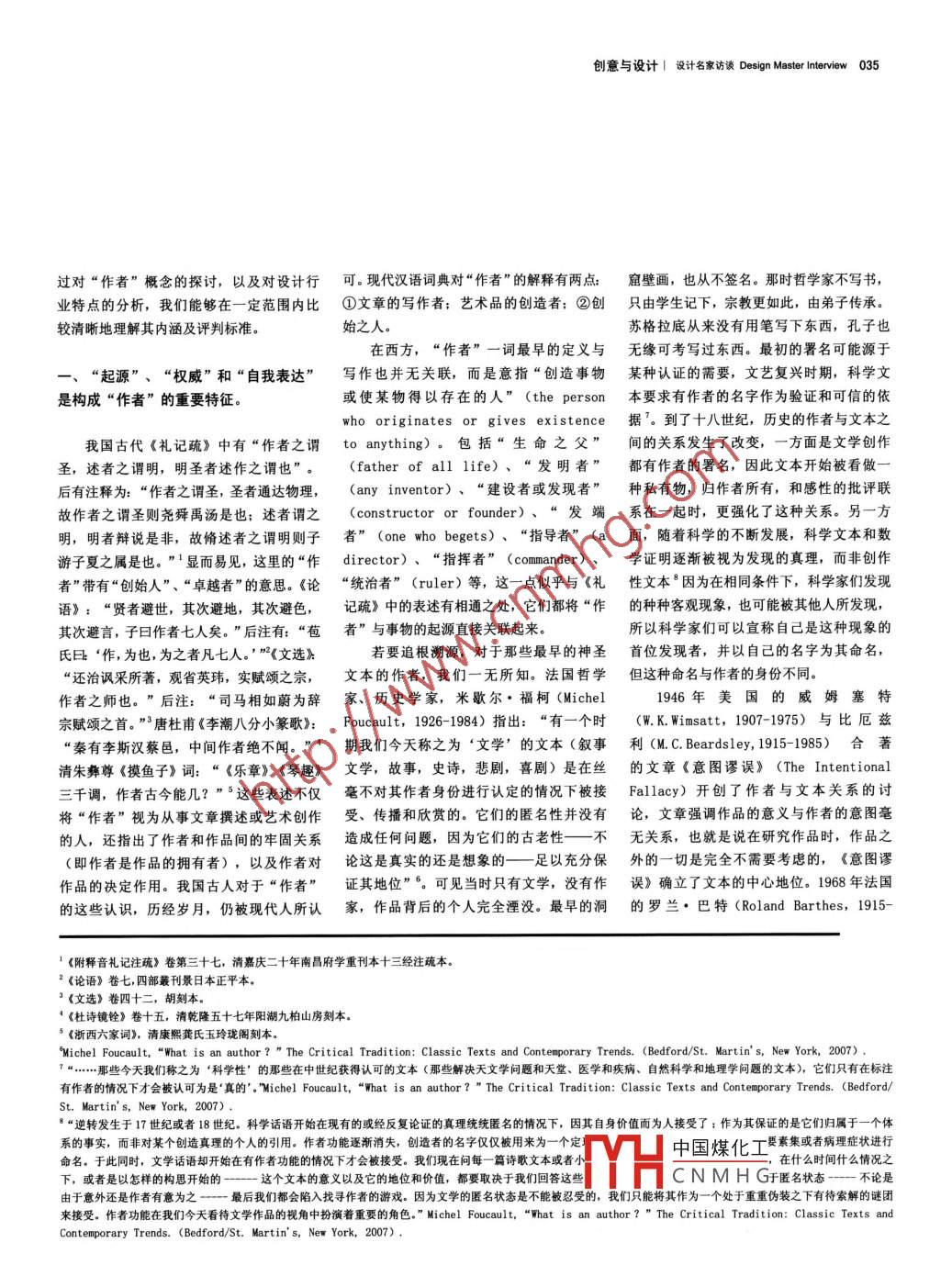 034■ 創(chuàng)意與設(shè)計總第三十一期I 2014.02設(shè)計師:設(shè)計的作者文/楊艷芳(南京師范大學(xué)美術(shù)學(xué)院)Designer- The Author of Design摘要冒設(shè)計師對自身的認(rèn)識和評判,直接影響著作品的面貌。設(shè)計界通過對“作者"概念的引入,使設(shè)計脫離了只是解決問題、或只是服務(wù)于商業(yè)和政治的層面,作為“ 作者”的設(shè)計師具備強烈的自我意識,認(rèn)為設(shè)計具有更純粹更高尚的目標(biāo)。設(shè)計領(lǐng)域內(nèi)的“作者”理論構(gòu)建在設(shè)計實踐的基礎(chǔ)上,是一種反思過程和擴展設(shè)計方法的手段,帶有設(shè)計的專業(yè)性和規(guī)定性,它充實著設(shè)計理念,服務(wù)于設(shè)計實踐,而設(shè)計實踐的發(fā)展也證實了“作者”理論的推動作用。Designer, who understanding and evaluation himself can impact the style of his work directly.Design breaks away from solve problems or service to business and political through the introduction of theconcept of "author'". As "author", designer has a strong self-awareness, think more pure and more noble goalsto design. The "author" theory in the field of design builds on the basis of the design practice, and is a way ofreflection and extension to design process and methods. With the professional and prescriptive of design, itenriches the design concept, in the service of design practice, and the development of design also proved therole of "author" theory.關(guān)鍵詞:設(shè)計師: 作者:起源:權(quán)威:自我表達(dá)Key words: Designer; Author; Origin; Authority; Self- expressionDOI編碼: 10. 3969/J. ISSN. 1674-4187. 2014. 02.005在關(guān)注設(shè)計發(fā)展、反思設(shè)計師職責(zé)的將“作者”概念引入設(shè)計領(lǐng)域的背后,源和方法,因此,思考“作者”這一概念過程中,“作者”(author) 一詞逐漸被涉 及許多有關(guān)設(shè)計起源和方法的理念,這如何合理地服務(wù)于設(shè)計、 如何充實了設(shè)計引入設(shè)計范疇,一系列圍繞 “作者”的理些理念直接影響設(shè)計師的思考,最終決定觀念, 可謂- -項有 益的探索。論探尋也因此而展開。在西方,對“作者”作品的形式。因此,在對設(shè)計領(lǐng)域的“作者”米歇爾●洛克(Michael Rock') 在他概念的探討由來已久(最早的討論大約出概念 展開全面審視和說明之前,首先應(yīng)該1996 年他發(fā)表的文章“The Designer as現(xiàn)在1910年前后),時至今日,它依然是拋開 “作者”一詞的常規(guī)定義,關(guān)注具體Author” 這個觀點,對設(shè)計師的作者身份西方設(shè)計界津津樂道的話題。與此不同的的設(shè)計實例和相關(guān)的可行性理論, 同時反進(jìn)行了評論, 成為當(dāng)時爭論的導(dǎo)火索。盡是,國內(nèi)卻鮮少見到對這類問題的關(guān)注,思 “設(shè)計”的行業(yè)特點。我們對設(shè)計的認(rèn)管這 個頗具爭議的觀點尚未主導(dǎo)設(shè)計師的或許中西文化的差異造成對某些概念的理識往往停留在那些具有視覺沖擊力的圖形、職業(yè)和經(jīng)濟模式, 但已涉及我們對未來設(shè)解出現(xiàn)誤差和偏離是主要原因。然而這種產(chǎn) 品或建筑上,所思考的問題也往往局限計的想像 和討論2。為什么將設(shè)計師視為“作理解誤差經(jīng)過日積月累,終將成為設(shè)計實于如何將創(chuàng)意運用于設(shè)計。我們往往重視者” ?怎樣的設(shè)計師能夠被稱為“作者”?踐和理論研究的障礙,所以,逐步弄清西信息的傳達(dá), 卻忽略了信息的起源,而“作他們又 是如何完成這種自我超越的?要對方的設(shè)計語匯和觀念是不可回避的問題。者”概念的引入恰好探討了有關(guān)的設(shè)計起這些問題做出確切的回答并非易事,但通作者簡介:楊艷芳,南京師范大學(xué)美術(shù)學(xué)院博土研究生,研究方向:設(shè)計藝術(shù)史論。中國煤化工Michael Rock 橫跨學(xué)術(shù)研究和設(shè)計實踐兩大領(lǐng)域,20 世紀(jì)80年代和90年代初,先后就學(xué)于羅德島藝術(shù)事設(shè)計批評。其著作影響深遠(yuǎn)。1996 年他發(fā)表的文章“The Designer as Author",圍繞著“設(shè)計師”和“作者”兩個概念,提t(yī)CN MH G他的觀點至今仍為批評界爭論不休。文章中Rock提出“呼吁平面設(shè)計師成為作者究竟意味著什么? (What does it really mean to call for a graphic designer to be an author?)”的疑問,Rock的經(jīng)歷對設(shè)計理論影響深遠(yuǎn),這篇文章在針對“作者”的眾多討論中具備相當(dāng)?shù)膹V度和深度。Helen Armstrong, “Introduction-- Revisiting the Avant -Garde", Graphic Design Theory. (New York: Princeton Architectural Press, 2009) P9 - 15..