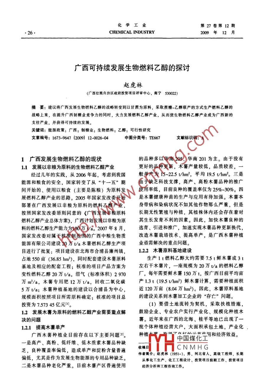 第27卷第12期CHEMICAL INDUSTRY2009年12月廣西可持續(xù)發(fā)展生物燃料乙醇的探討趙虎林(廣西壯族自治區(qū)政府投資項目評審中心,南寧53002)摘要:建議將廣西發(fā)展生物燃料乙醇的戰(zhàn)略轉(zhuǎn)變到以甘蔗為原料,采取蔗糖乙醇聯(lián)產(chǎn)的方式生產(chǎn)燃料乙醇的略上來,在提升廣西制糖業(yè)竟?fàn)幜Φ耐瑫r,大力發(fā)展燃料乙醇產(chǎn)業(yè),從而使生物燃料乙醇產(chǎn)業(yè)成為廣西新的支柱產(chǎn)業(yè),并獲得可持續(xù)的發(fā)展關(guān)鍵詞:能源政策;廣西;制糖業(yè);生物燃料;乙醇;可行性研究文章編號:1673-9647(2009)12-002604中圖分類號:TE667文獻(xiàn)標(biāo)識碼:A1廣西發(fā)展生物燃料乙醇的現(xiàn)狀的品種多以華南205、華南201為主。由于沒有1.1發(fā)展以非糧為原料的生物燃料乙醇產(chǎn)業(yè)更好的品種更新,木薯產(chǎn)量較低,品質(zhì)較差經(jīng)過幾年的實踐,從2006年起,考慮到我國般單產(chǎn)為15-225t/hm2,平均195thm2。三是能源和糧食的安全,國家轉(zhuǎn)變了從“十一五”期由于缺乏科技支撐,高產(chǎn)、高粉木薯品種的推廣間開始的、使用以糧食(主要是陳糧)為原料發(fā)使用率低,目前良種的覆蓋率僅為25%-30%。四展燃料乙醇產(chǎn)業(yè)的思路。2005年國家發(fā)改委開始是木薯健康種苗的生產(chǎn)與應(yīng)用有待加強。木薯本部署在廣西發(fā)展以非糧為原料的燃料乙醇產(chǎn)業(yè),身帶病和染病狀況不如其他作物那么嚴(yán)重,但是按照國家發(fā)改委原則同意的《廣西發(fā)展非糧原料長期無性繁殖與種植,其植株體內(nèi)還會存在著對燃料乙醇產(chǎn)業(yè)總體方案》,廣西計劃發(fā)展以非糧為原其生長發(fā)育不利的因素。因此,加快木薯良種的料的燃料乙醇生產(chǎn)能力為100萬ta。2007年8月,選育、引進(jìn)和推廣,加速實現(xiàn)木薯品種更新?lián)Q代國家發(fā)改委對屬于核準(zhǔn)制范圍的廣西中糧生物質(zhì)改造木薯栽培技術(shù)、提高單產(chǎn),是廣西木薯種植能源有限公司建設(shè)20萬t/a木薯燃料乙醇生產(chǎn)項業(yè)亟需解決的重點問題。目進(jìn)行了批復(fù):項目建設(shè)在北海市合浦縣廉州鎮(zhèn)122木薯原料基地建設(shè)占地550畝(3685hm2),同時配套建設(shè)木薯原料生產(chǎn)1t燃料乙醇大約需要75t鮮木薯或3t基地及相應(yīng)的配套工程;核準(zhǔn)的項目產(chǎn)品方案為左右干木薯片,一座規(guī)模為20萬∽a的燃料乙醇變性燃料乙醇20萬ta,沼氣(標(biāo)準(zhǔn)體積)2970廠,每年需要鮮木薯150萬t,按廣西目前平均畝萬m/a,木薯專用肥12萬ta,回收二氧化碳產(chǎn)13t(19.5thm2)鮮木薯計算,需要種植面積5萬va;木薯種植基地的建設(shè)以合浦縣為中心,近120萬畝(804萬hm2)。因此,木薯原料基地規(guī)模面積按照項目所需原料確定;核準(zhǔn)的項目總的建設(shè)關(guān)系到木薯加工企業(yè)的“存亡”問題。投資為757345億元。(1)要借土地流轉(zhuǎn)為契機,采取扶植措施12發(fā)展木薯為原料的燃料乙醇產(chǎn)業(yè)需要重點解鼓勵企業(yè)、專業(yè)農(nóng)戶實行產(chǎn)業(yè)化、規(guī)?;N植木決的問題薯。近年來在廣西的北海、桂平等地已出現(xiàn)了一121提高木薯單產(chǎn)批個體種植經(jīng)營大戶,大面積承包土地,產(chǎn)業(yè)化廣西木薯種植業(yè)目前存在以下主要問題2。種植中花“用和經(jīng)濟(jì)效益。是高產(chǎn)、高粉、低纖維、低木質(zhì)素木薯品種缺收稿日乏,良種覆蓋率偏低,造成單產(chǎn)和淀粉含量普遍CNMHG偏低,尤其是作為發(fā)展生物能源的專用品種缺乏作者簡介:趙虎林(1951-),男,河北省人,高級T程師,長期從事化工生產(chǎn)、化工工程設(shè)計、投資項目前期工作、投資項二是木薯品種老化嚴(yán)重。目前木薯產(chǎn)區(qū)普遍使用經(jīng)濟(jì)分析和工程咨詢工作第12期趙虎林:廣西可持續(xù)發(fā)展生物燃料乙醇的探討27(2)推廣和創(chuàng)建新的生產(chǎn)經(jīng)營組織形式、提料乙醇產(chǎn)業(yè)不致造成對制糖業(yè)的影響和沖擊(如高生產(chǎn)經(jīng)營的組織化程度,形成“公司+農(nóng)村合作果種植木薯的經(jīng)濟(jì)效益超過種植糖料蔗時,蔗農(nóng)組織+專業(yè)農(nóng)戶”的木薯原料生產(chǎn)、營銷、加工體將由種植糖料蔗轉(zhuǎn)而種植木薯),實現(xiàn)國家、農(nóng)民系。在原料基地內(nèi)還要不斷完善和充實木薯技術(shù)(特別是已經(jīng)歷了長期發(fā)展的蔗農(nóng))和消費者(包服務(wù)和技術(shù)推廣網(wǎng)絡(luò)的建設(shè),完善現(xiàn)有的市、縣、括食糖的消費者和燃料的消費者)的共羸,是這鄉(xiāng)技術(shù)服務(wù)與推廣體系,使之符合擴(kuò)大生產(chǎn)的需一時期廣西制糖業(yè)面臨、且需要解決的問題要。要配置必要的人力、設(shè)備和設(shè)施,使種植專巴西的經(jīng)驗可供借鑒。據(jù)有關(guān)材料介紹,業(yè)戶真正成為木薯新品種、新技術(shù)推廣的帶頭人208-209年制糖期,巴西糖廠用于生產(chǎn)乙醇的和領(lǐng)路人。甘蔗比例,已從上一制糖期的56%上升為57%。(3)扶持和推廣種植基地和木薯的下游加工也就是說,目前在巴西已有超過一半的甘蔗不是企業(yè)組成利益的共同體,風(fēng)險共擔(dān)的有機體。按用來生產(chǎn)蔗糖而是用于生產(chǎn)燃料乙醇。巴西目前照與木薯下游加工企業(yè)形成配