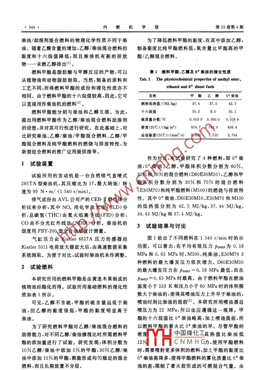 第23卷(2005)第4期Transactions of CSICEVol.23(2005)No.4文章編號(hào):1000-0909(2005)040343-0523-054乙醇/柴油/甲酯混合燃料的燃燒與排放特性何邦全1,王建昕2(1.天津大學(xué)內(nèi)燃機(jī)燃燒學(xué)國(guó)家重點(diǎn)實(shí)驗(yàn)室,天津300072;2.清華大學(xué)汽車(chē)安全與節(jié)能?chē)?guó)家重點(diǎn)實(shí)驗(yàn)室,北京100084)摘要:對(duì)燃料甲酯作為乙醇/柴油混合燃料助溶劑的可行性進(jìn)行了研究,并對(duì)比了柴油機(jī)分別使用柴油、乙醇/柴油/甲酯混合燃料、乙醇/甲酯混合燃料和純甲酯燃料時(shí)的燃燒與排放特性。結(jié)果表明,燃料甲酯可用作乙醇/柴油的助溶劑。與原機(jī)相比,含氧燃料可以大幅度降低柴油機(jī)在中高負(fù)荷時(shí)的煙度,其中E30M0燃料的煙度最小。但當(dāng)使用含有乙醇的混合燃料時(shí),著火延遲,THC排放增加,且在中高負(fù)荷時(shí)的壓力升高率大,NO2排放較高。關(guān)鍵詞:柴油機(jī);燃料;燃燒;排放中圖分類(lèi)號(hào):TK421.2文獻(xiàn)標(biāo)志碼:AStudy on Combustion and Emission Characteristics of a DieseEngine Fuelled with Ethanol/Diesel/Methyl Ester BlendsHE Bang-quan, WANG Jian-xin(1. State Key Laboratory of Engines, Tianjin University, Tianjin 300072, China; 2. State KeyLaboratory of Automotive Safety and Energy, Tsinghua University, Beijing 100084, China)Abstract: The feasibility of methyl ester as an additive for the ethanol-diesel blends was investigated, and thecomparisons in combustion and emission characteristics of a diesel engine fuelled with diesel, ethanol/ dieselmethyl ester, ethanol/methyl ester and pure methyl ester were made respectively. The results showed thatmethyl ester could be used as an additive for ethanol/diesel blends, and oxygenated fuels could significantlyreduce the exhaust smoke at the medium and high loads compared to that of diesel operation. blend containing 30% volume of ethanol and 70%volume of methyl ester gave the lowest smoke emission. Howeverignition delay and total hydrocarbon (THC)emissions would be increased along with high value of pressurerise rate and NO, at medium and high loads with the use of ethanol/ diesel blends.Keywords: Diesel engine; Fuel; Combustion: Emissions機(jī)上使用。最實(shí)用的方法是將乙醇摻人到柴油中,形成乙醇/柴油混合燃料,但乙醇是極性分子,用生物質(zhì)含氧燃料部分替代柴油不僅可以緩使得乙醇柴油混合燃料的穩(wěn)定性受柴油中碳?xì)浣獠裼偷墓┣竺?而且能減少柴油機(jī)的有害排化合物的構(gòu)成、含水量、比重、溫度和添加劑量的放物。目前研究最多的生物質(zhì)含氧燃料是乙醇和影響。燃料甲酯(也稱(chēng)生物柴油)。為此需要體用助溶劑以提高乙醇/柴油混合乙醇的十六烷值較低,難以直接在普通柴油燃料的中國(guó)煤化工入,使得乙醇/CNMHG收稿日期:20040430;修訂日期:2004-08-02基金項(xiàng)目:天津大學(xué)青年教師基金資助項(xiàng)目(W50301作者簡(jiǎn)介:何邦全(1964-),男,博士,副教授,主要研究方向?yàn)閮?nèi)燃機(jī)燃燒過(guò)程和代用燃料344·內(nèi)燃機(jī)學(xué)報(bào)第23卷第4期柴油/助溶劑混合燃料的物理化學(xué)性質(zhì)不同于柴為了降低燃料甲酯的黏度,在其中添加乙醇,油。隨著乙醇含量的增加,乙醇/柴油混合燃料的制備黏度比純甲酯燃料低,氧含量比甲酯高的甲黏度和十六烷值降低,而且柴油機(jī)有新的排放酯/乙醇混合燃料物—未燃乙醇排出口燃料甲酯是脂肪酸與甲醇反應(yīng)的產(chǎn)物,可以表1燃料甲酯、乙醇及0柴油的理化性質(zhì)從植物油和動(dòng)物脂肪制取。當(dāng)然,制備的原料和Tab.1 The physicochemical properties of methyl ester,工藝不同,所得燃料甲酯的成份和理化性質(zhì)亦不ethanol and o" diesel fuels相同。由于燃料甲酯的十六烷值較高,因此,它可名稱(chēng)甲酯乙醇0#柴油以直接用作柴油機(jī)的燃料21燃料低熱值/(MJ/kg)42.5燃料甲酯能分別與柴油和乙醇互溶。為此十六烷值8.050.1提出用燃料甲酯作為乙醇/柴油混合燃料助溶劑硫質(zhì)量分?jǐn)?shù)/%0.00390.00000.0169的設(shè)想,并對(duì)其可行性進(jìn)行研究。在此基礎(chǔ)上,對(duì)密度(20c)/(kg/m3)879.7794.0836.6比研究柴油、乙醇/柴油/甲酯混合燃料、乙醇/甲運(yùn)動(dòng)黏度(20℃)(mm2/)6.9321.5103.744酯混合燃料及純甲酯燃料的燃燒與排放特性,為新型組合燃料的推廣應(yīng)用提供指導(dǎo)。作為對(duì)比,本試驗(yàn)研究了4種燃料,即0#柴1試驗(yàn)裝置油,0#柴油、乙醇、甲酯體積分?jǐn)?shù)分別為60%試驗(yàn)所用的發(fā)動(dòng)機(jī)是一臺(tái)自然吸氣直噴式30%和10%的混合燃料(D60E30M10),乙醇和甲295TA型柴油機(jī),其壓縮比為17,最大轉(zhuǎn)矩/轉(zhuǎn)酯體積分?jǐn)?shù)分別為30%和70%的混合燃料速為99N·m/(1540r/min)(E0M70)和純甲酯燃料(M100)的燃燒與排放特排氣成份由AVL公司產(chǎn)的CEBⅡ型氣體分性。其中0·柴油、D60E30M10、E30M70和M100析儀來(lái)分析,其中NO2用化學(xué)發(fā)光法(CLD)分的低熱值分別為42.5MJ/kg、37.44MJ/kg、析,總碳?xì)?THC)由氫火焰離子法(FID)分析,34.43M/kg和37.4M/kgCO由不分光紅外線(xiàn)法(NDR)分析。柴油機(jī)的3試驗(yàn)結(jié)果與討論煙度用FBY-200型全自動(dòng)煙度計(jì)測(cè)量。氣缸壓力由 Kistler6617A壓力傳感器經(jīng)圖1給出了不同燃料在1540r/min時(shí)的示Kistler501l電荷放大器放大后,由高速數(shù)據(jù)采集功圖??梢钥闯?在平均有效壓力paP為0.18系統(tǒng)測(cè)取。為便于對(duì)比,試驗(y