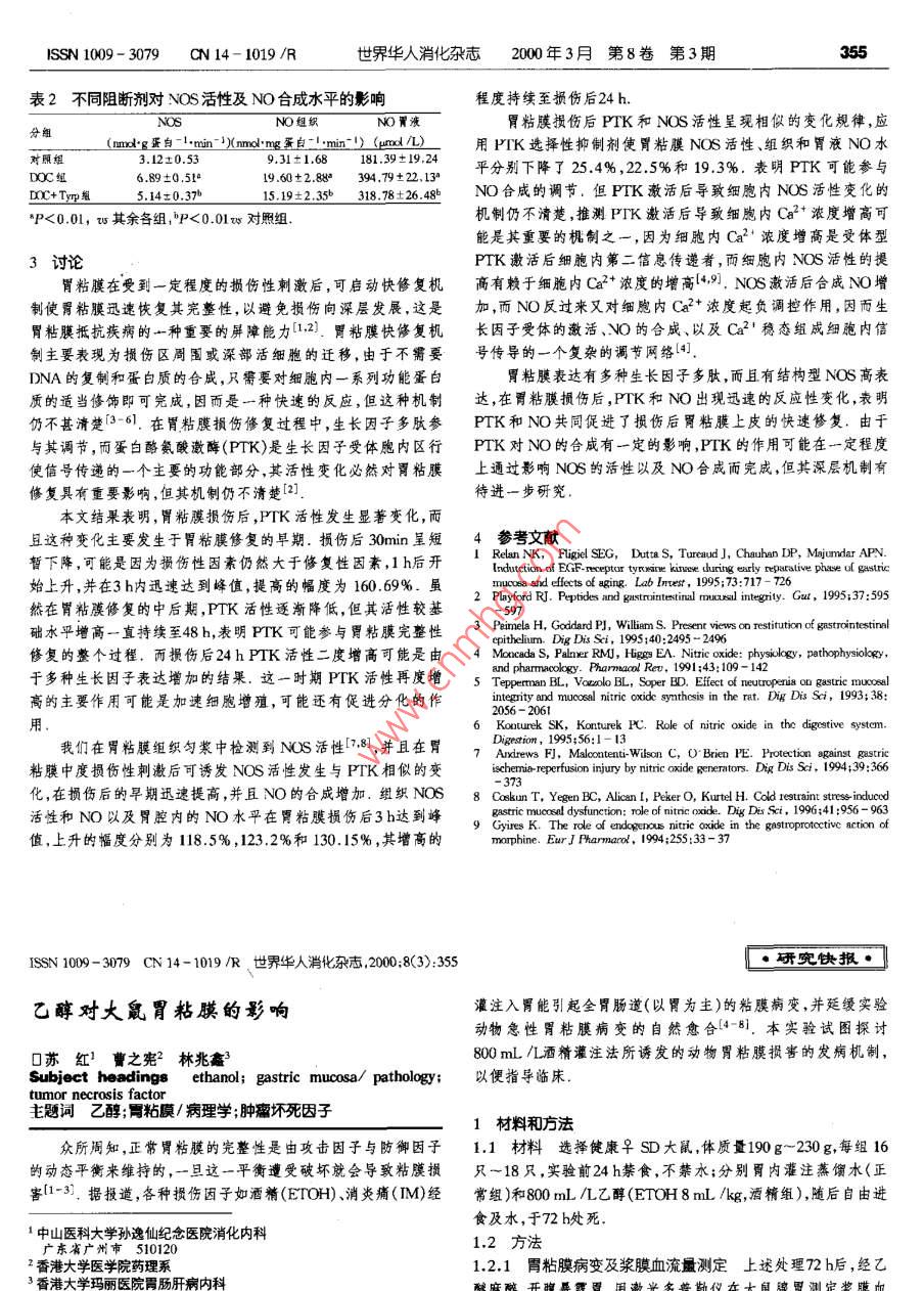SSN1009-3079C14-1019世界華人消化雜志2000年3月第8卷第3期355表2不同阻斷劑對NOS活性及NO合成水平的影響程度持續(xù)至損傷后24h.NO組織NO胃液胃粘膜損傷后PTK和NOS活性呈現(xiàn)相似的變化規(guī)律,應(yīng)分組g白mmdg蛋min)(nmol mg蛋白min)(ud)用PTK選擇性抑制劑使胃粘膜NOS活性、組織和胃液NO水對照組3.12±0.53 DOC9.31±1.68181.39±19.24平分別下降了25.4%,22.5%和19.3%.表明PK可能參與6.89±0.51.60±2.88394.79±22、13mc+typy5.140.3715.19±2.35318.78±26.486.8n合成的調(diào)節(jié)但PTK激活后導(dǎo)致細(xì)胞內(nèi)NOS活性變化的P<0.01,其余各組,P<0.01v對照組機(jī)制仍不清楚,推測PTK激活后導(dǎo)致細(xì)胞內(nèi)Ca2+濃度增高可能是其重要的機(jī)制之一,因為細(xì)胞內(nèi)Ca2+濃度增高是受體型3討論PT激活后細(xì)胞內(nèi)第二信息傳遞者,而細(xì)胞內(nèi)NOS活性的提胃粘膜在受到一定程度的損傷性刺激后,可啟動快修復(fù)機(jī)高有賴于細(xì)胞內(nèi)Ca2+濃度的增高,9NOS激活后合成NO增制使胃粘膜迅速恢復(fù)其完整性,以避免損傷向深層發(fā)展,這是加,而NO反過來又對細(xì)胞內(nèi)a+濃度起負(fù)調(diào)控作用因而生胃粘膜抵抗疾病的一種重要的屏障能力1,21胃粘膜快修復(fù)機(jī)長因子受體的激活、NO的合成、以及Ca2穩(wěn)態(tài)組成細(xì)胞內(nèi)信制主要表現(xiàn)為損傷區(qū)周圍或深部活細(xì)胞的遷移,由于不需要號傳導(dǎo)的一個復(fù)雜的調(diào)節(jié)網(wǎng)絡(luò)4DNA的復(fù)制和蛋白質(zhì)的合成,只需要對細(xì)胞內(nèi)一系列功能蛋白胃粘膜表達(dá)有多種生長因子多肽,而且有結(jié)構(gòu)型NOS高表質(zhì)的適當(dāng)修飾即可完成,因而是一種快速的反應(yīng),但這種機(jī)制達(dá),在胃粘膜損傷后,PTK和NO出現(xiàn)迅速的反應(yīng)性變化,表明仍不甚清楚3-61.在胃粘膜損傷修復(fù)過程中,生長因子多肽參PTK和NO共同促進(jìn)了損傷后胃粘膜上皮的快速修復(fù)由于與其調(diào)節(jié),而蛋白氨酸激酶(PTK)是生長因子受體胞內(nèi)區(qū)行PTK對NO的合成有一定的影響,PTK的作用可能在一定程度使信號傳遞的一個主要的功能部分,其活性變化必然對胃粘膜上通過影響NOS的活性以及NO合成而完成,但其深層機(jī)制有修復(fù)具有重要影響,但其機(jī)制仍不清楚[2待進(jìn)一步研究本文結(jié)果表明,胃粘膜損傷后,PTK活性發(fā)生顯著變化,而且這種變化主要發(fā)生于胃粘膜修復(fù)的早期.損傷后30min呈短4參考文獻(xiàn)暫下降,可能是因為損傷性因素仍然大于修復(fù)性因素,1h后開1 Relan NK, Fligiel SEG, Dutta Tureaud, Chauhan DP, Majumdar APN始上升,并在3h內(nèi)迅速達(dá)到峰值,提高的幅度為160.69%. muoroard and effects of aging. Lab Imesr 1995; 73: 717-726 2 Playford RJ. Peptides and gastruintestinal mucsil integrity. Gut, 1995:37: 595然在胃粘膜修復(fù)的中后期,PTK活性逐漸降低,但其活性較基礎(chǔ)水平增高一直持續(xù)至48h,表明PTK可能參與胃粘膜完整性 3 Peimela H, Goddard P], William S. Present views on restitution of gastrointestinal epithelium. Dig Dis Sci, 1995:40: 2495-2496修復(fù)的整個過程,而損傷后24hPTK活性二度增高可能是由 4 Moncada S, Palmer RMJ, Higgs EA. Nitric oxide: physiology, pathophysiology, and pharmacology. Pharmacol Rev, 1991: 43: 109-142于多種生長因子表達(dá)增加的結(jié)果,這一時期PK活性再度增5 Tepperman, voroolo Effect of neutropenia on gastric mucosal ty and e rat. Dig Dis Sci, 1993;38:2056用 Konturek SK, Konturek PC. Role of nitric oxide in the digestive system我們在胃粘膜組織勻漿中檢測到NOS活性7,8,并且在胃7e ison O'Brien PE Protection against gstrice粘膜中度損傷性刺激后可發(fā)NOS活性發(fā)生與PTK相似的變 ischemia-reperfusion injury by nitric oxide generators. Dig Dis Sci, 1994:39: 366化,在損傷后的早期迅速提高,并且NO的合成增加.組織NOS8 Caskun, Yegen BC, Alican Peker Kurtel. Cold restraint stress inducod活性和NO以及胃腔內(nèi)的NO水平在胃粘膜損傷后3h達(dá)到峰 ide Sci64:956-963值,上升的幅度分別為118.5%,123.2%和130.15%,其增高的 morphine The rde of endo3 phine. Eur Pharmarod, 1994; 255: 33-37IN10009Cn14-1019/R世界華人消化雜志2008(3):355研究快報乙醇對大鼠胃粘膜的影響灌注入胃能引起全胃腸道(以胃為主)的粘膜病變,并延緩實驗動物急性胃粘膜病變的自然愈合(4-81.本實驗試圖探討0蘇紅曹之憲林兆鑫800mL/L酒精灌注法所誘發(fā)的動物胃粘膜損害的發(fā)病機(jī)制, Subject headings ethanol; gastric mucosa/ pathology以便指導(dǎo)臨床 tumor necrosis factor主題詞乙醇;胃粘膜/病理學(xué);腫瘤壞死因子1材料和方法眾所周知,正常胃粘膜的完整性是由攻擊因子與防御因子1.1材料選擇健康早SD大鼠,體質(zhì)量190g~230g,每組16的動態(tài)平衡來維持的,一旦這一平衡遭受破壞就會導(dǎo)致粘膜損只~18只,實驗前24h禁食不禁水;分別胃內(nèi)灌注蒸餾水正害1-3.據(jù)報道,各種損傷因子如酒精(ETOH)、消炎痛(M)經(jīng)常組)和800mL/L乙醇(ETOH8mL/kg,酒精組),隨后自由進(jìn)1中山醫(yī)科大學(xué)孫逸仙紀(jì)念醫(yī)院消化內(nèi)科食及水,于72h處死廣東省廣州市5101201.2方法香港大學(xué)醫(yī)學(xué)院藥理系1.2.1胃粘膜病變及漿膜血流量測定上述處理72h后,經(jīng)乙3香港大學(xué)瑪麗醫(yī)院胃腸肝病內(nèi)科開隆露置用光齊普儀在古置測定獎膜血356issn1009-3079cn14-1019/r世界華人消化雜志2000年3月第8卷第3期損傷面積(mm2),然后分別計算