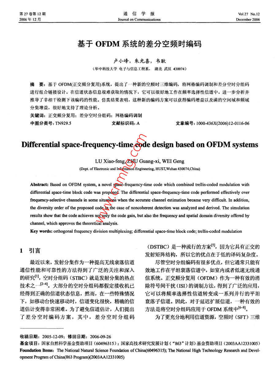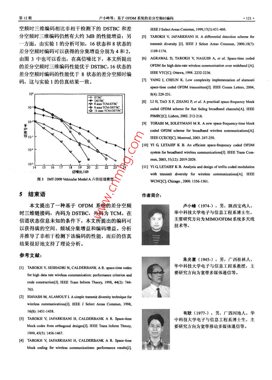 第27卷第12期通信學報Vol 27 No 122006年12月Joumal on CommunicationsDecember 2006基于OFDM系統(tǒng)的差分空頻時編碼盧小峰,朱光喜,韋耿(華中科技大學電子與信息工程系,湖北武漢430074)摘要:基于OFDM(正交頻分復用)系統(tǒng),提出了一種新的空頻時三維編碼,將網(wǎng)格編碼調(diào)制和差分空時分組碼進行組合鏈接設計。在信道狀態(tài)信息很難獲取的情況下,它可以很好地工作在頻率選擇性信道中,進一步分析并推導了非相干檢測下該編碼的性能。仿真結(jié)果表明,這種新的編碼方案可以獲得編碼增益以及滿的空間域和頻域分集增益,很好地支持了理論分析。關鍵詞:正交頻分復用:差分空時分組碼;網(wǎng)格編碼調(diào)制中圖分類號:TN9295文獻標識碼:A文章編號:1000436X(2006)12-01160Differential space-frequency time code design based on ofdm systemsLU Xiao-feng, ZHU Guang-xi, WEI GengDept of Electronic and Information Engineering, HUST, Wuhan 430074, China)Abstract: Based on OFDM system, a novel space-frequency-time code which combined trellis-coded modulation withdifferential space-time block code was proposed. The differential space-frequency-time code performed effectively overfrequency-selective channels in some situations when the accurate channel estimation became very difficult. In addition,the diversity order of the proposed code in the case of noncoherent detection was analyzed and derived. The simulationresults show that the code achieves not only the code gain, but also the frequency and spatial domain diversity offered bychannel, which approves the theoretical analysisKey words: orthogonal frequency division multiplexing; differential space-time block code; trellis-coded modulation1引言( DSTBC)是一種流行的方案,因為它具有正交的發(fā)射矩陣結(jié)構(gòu),所以它的優(yōu)點在于低的譯碼復雜度。最近以來,發(fā)射分集作為一種提高無線衰落信道盡管空時分組編碼有很多優(yōu)點,但它通常只能有通信性能和可靠性的方法得到了廣泛的關注和深入效地工作在平坦衰落信道中,如室內(nèi)或者低速無線通的研究叮,空時分組碼(STBC)就是發(fā)射分集的熱點信系統(tǒng)。正交頻分復用(OFDM)作為一種有效的消技術(shù)之24。大部分的空時分組碼都假定接收機已除符號間干擾(ISI)的調(diào)制方法,得到了廣泛的應用,經(jīng)得到正確的信道狀態(tài)信息,然而,在一些特殊情況它可以將頻率選擇性信道轉(zhuǎn)變成一系列并行的平坦下,如移動臺快速移動時,信道變化很快,精確的信衰落子信道。因此,對于延遲擴展信道,一種有效的道估計變得非常困難。為了避免信道估計,人們提出方法是將空時分組碼應用于OFDM系統(tǒng)中別了差分空時編碼方案,其中,差分空時分組碼為了更充分地利用信道資源,空頻時(SFT)三維收稿日期:2005-12-09;修回日期:20060926基金項目:國家自然科學基金資助項目(60496315);國家高技術(shù)研究發(fā)展計劃(“863”計劃)基金資助項目(2003AA2331005)Foundation Items: The National Natural Science Foundation of China(60496315); The National High Technology Research and Devel-opment Program of China(863 Program)(2003AA12331005)第12期小峰等:基于OFDM系統(tǒng)的差分空頻時編碼碼獲得空間域和頻域的分集增益文獻提出了其中,F()-L,。=,一1編碼通過在OFDM系統(tǒng)的空間域、吋間域和頻率域編種基于OFDM系統(tǒng)的鏈接碼方案,內(nèi)碼是空時分組去掉循環(huán)前綴,經(jīng)過DFT變換,接收端頻域符碼,外碼是TCM碼,而且,通過理論分析和實驗仿真號矢量可以表示為指出在相同的頻譜效率、網(wǎng)格復雜度和星座圖下,空r= HX+W時分組碼和TCM的鏈接碼性能優(yōu)于空時格形碼。本文進一步研究并分析了TCM和差分空時分組其中,W=Fw,H=dag(0),…,H(N-1)},碼在OFDM系統(tǒng)中的鏈接應用,提出了相應的差分空H()=∑hOe,k=0,…,N-1頻時三維編碼方案以獲取空間和頻域的分集增益,并且對其在高信噪比下非相干檢測的性能做了理論分析定義和實驗仿真,結(jié)果表明,新的編碼方案可以在沒有信道FL(K)=L,e狀態(tài)信息的情況下很好地工作在頻率選擇性信道中。本文主要包括以下幾個部分:第2節(jié)回顧了通=[A(O),(),…,(-常的OFDM系統(tǒng)并描述了基于OFDM系統(tǒng)上的差可得分空頻時鏈接碼方案;第3節(jié)通過分析成對差錯概H(A)=hF(A),=0,…N(4)率(PEP),推導了高信噪比下非相干檢測的分集增22基于OFDM系統(tǒng)的空頻時三維編碼方案益和編碼增益;第4節(jié)為仿真結(jié)果和分析;第5節(jié)基于N子載波OFDM的差分空頻時三維編碼為本文結(jié)束語。標識說明:「x1表示大于或等于x的最小整數(shù);( DSTBC),外碼為網(wǎng)格編碼調(diào)制(TcMdiag,…}表示對角矩陣;()’、()、()分別表示共軛、轉(zhuǎn)置、 Hermitian轉(zhuǎn)置。住處比特輸入創(chuàng)OFDM調(diào)制TCM2系統(tǒng)模型和編碼設計交織器DFDM調(diào)制假定OFDM系統(tǒng)中有M個發(fā)射天線,N個接收天線,子載波數(shù)為N21OFDM系統(tǒng)模型言息比特輸出頻率選擇性信道通常可以建模為一個L抽頭的圖1基于OFDM系統(tǒng)的空頻時三維編碼方案FR( finite impulse response)濾波器,接收端的信號可以表示為在本文中,差分空時分組碼編碼采用兩天線的Alamouti方案,網(wǎng)格編碼調(diào)制采用PSK調(diào)制y(=∑hO)x(-D)+w(令TCM編碼器輸出的第i個編碼塊為其中,h()是第1個抽頭所對應的復值信道衰落系C()C2(i,0)C1(i1)C2(i,1)…C1(iN-1)C2(iN-1)數(shù);x(是發(fā)送信號;w(1為復加性高斯白噪聲,并經(jīng)交